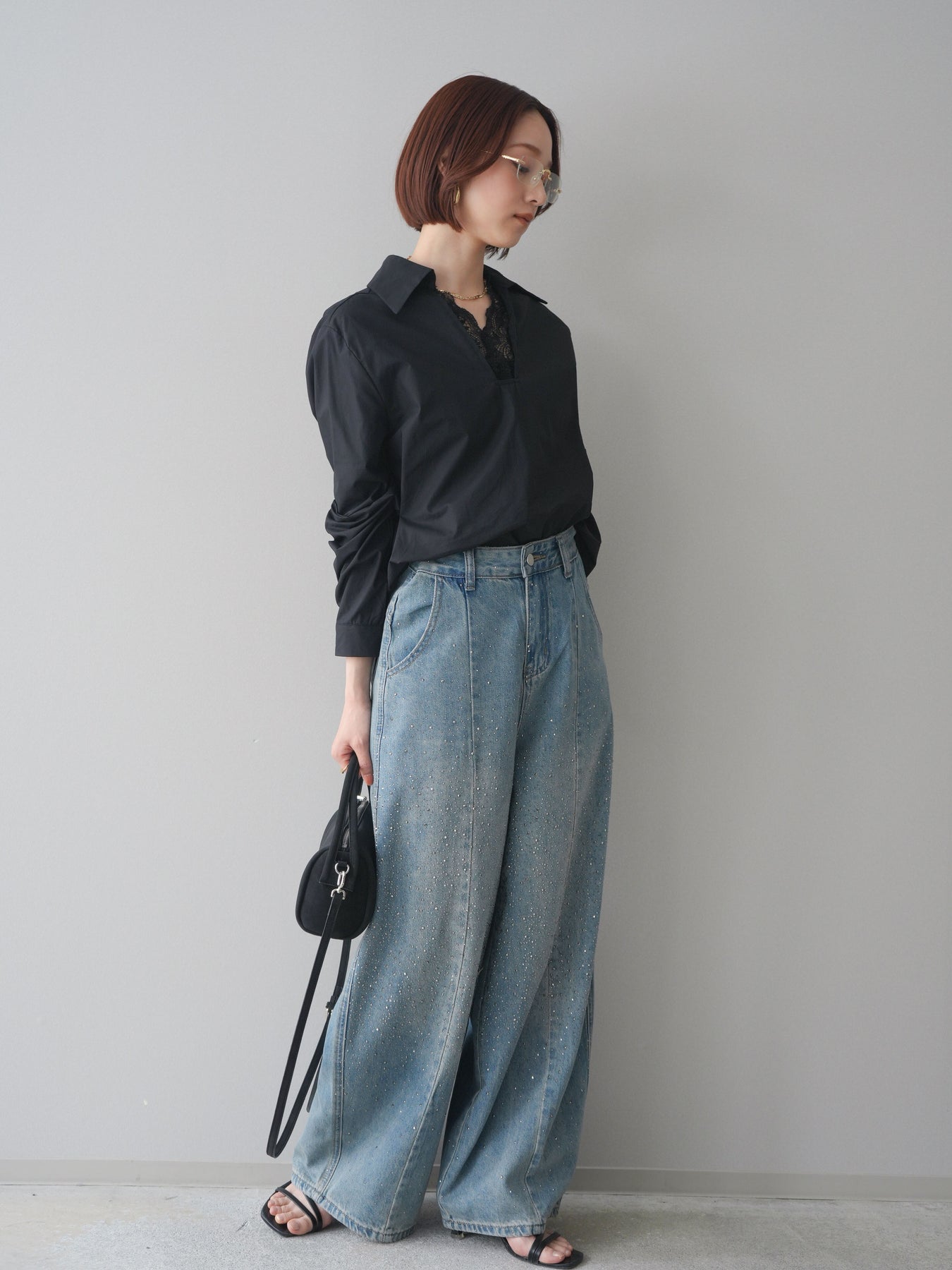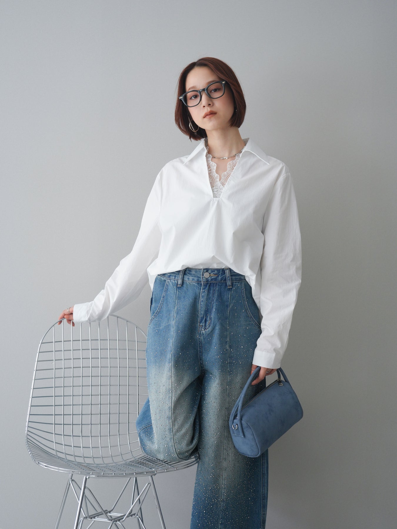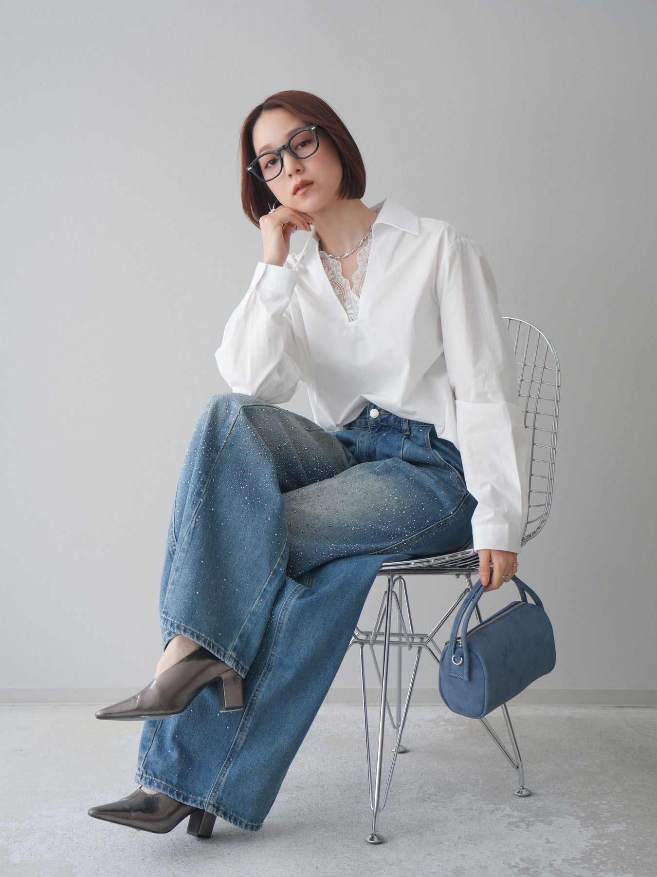 [SET]レースネックスキッパーブラウス+フロントビジューカーブデニムパンツ(2set)