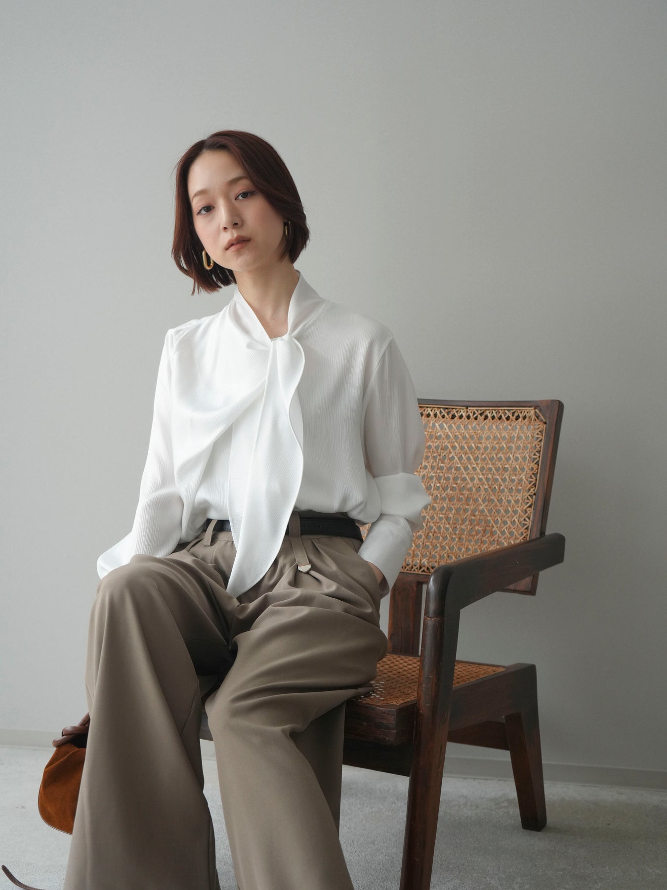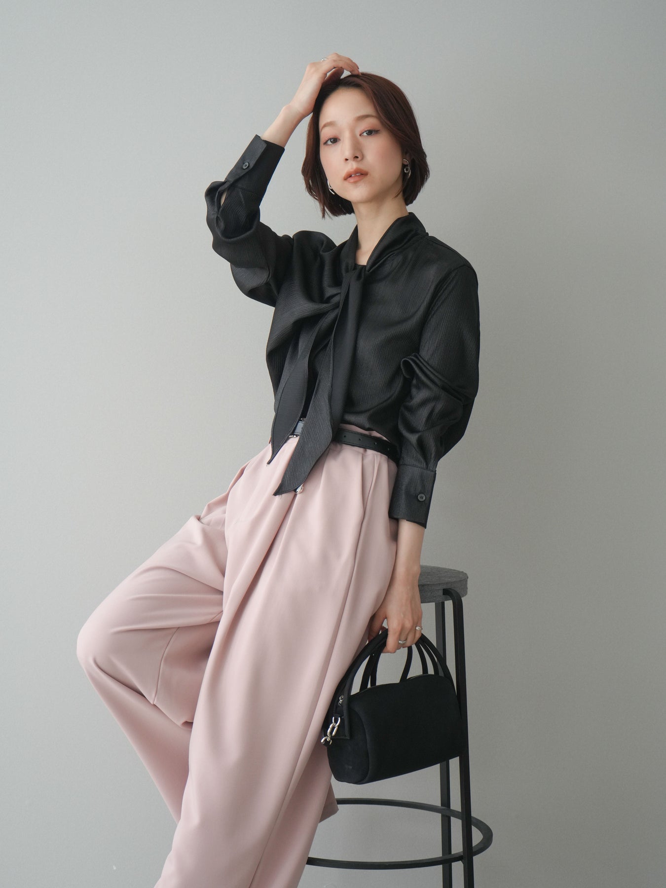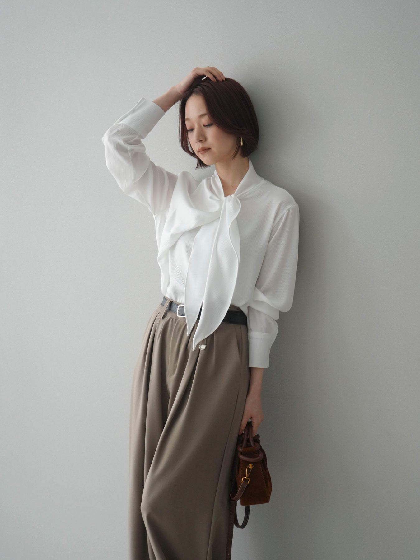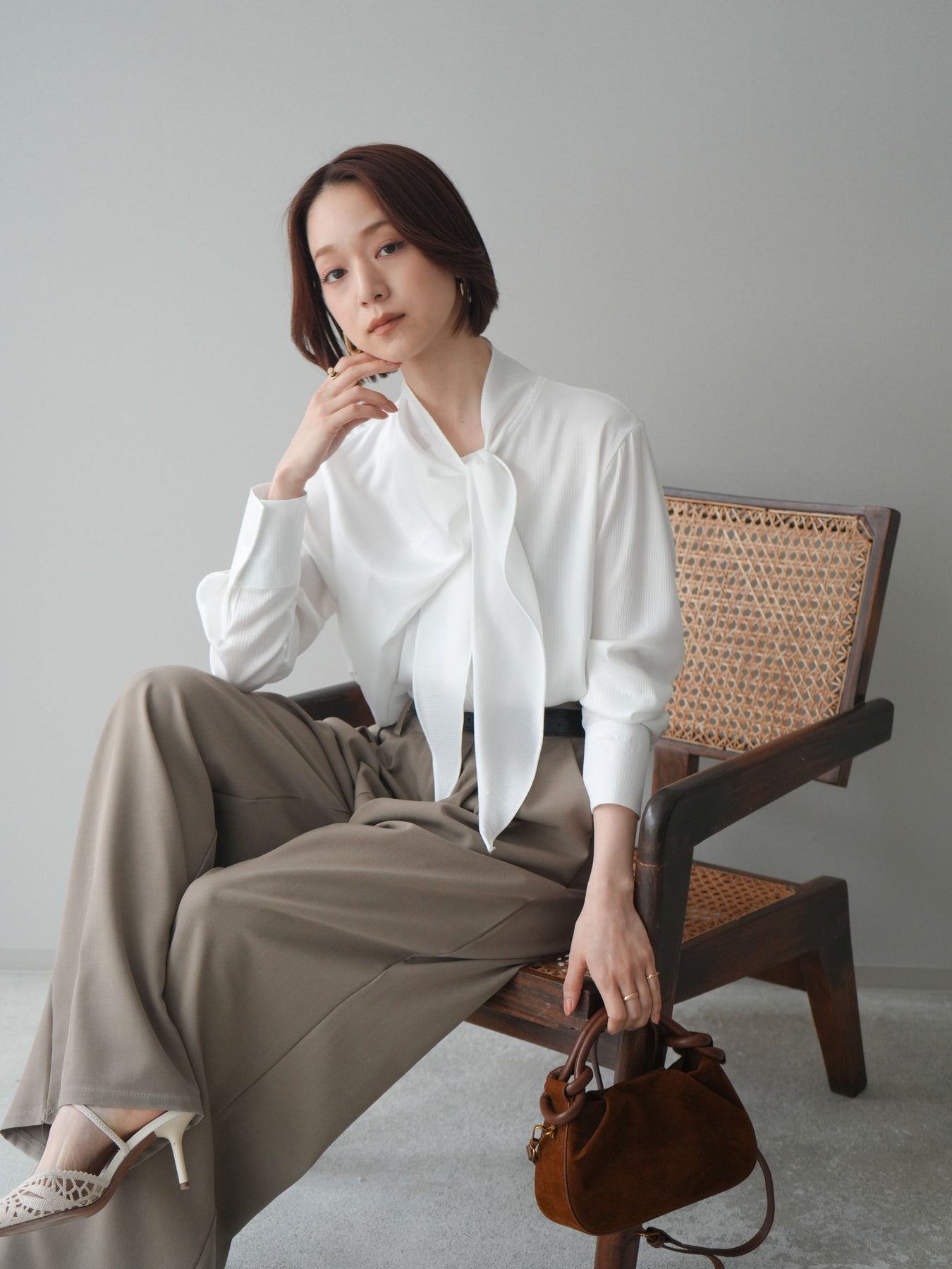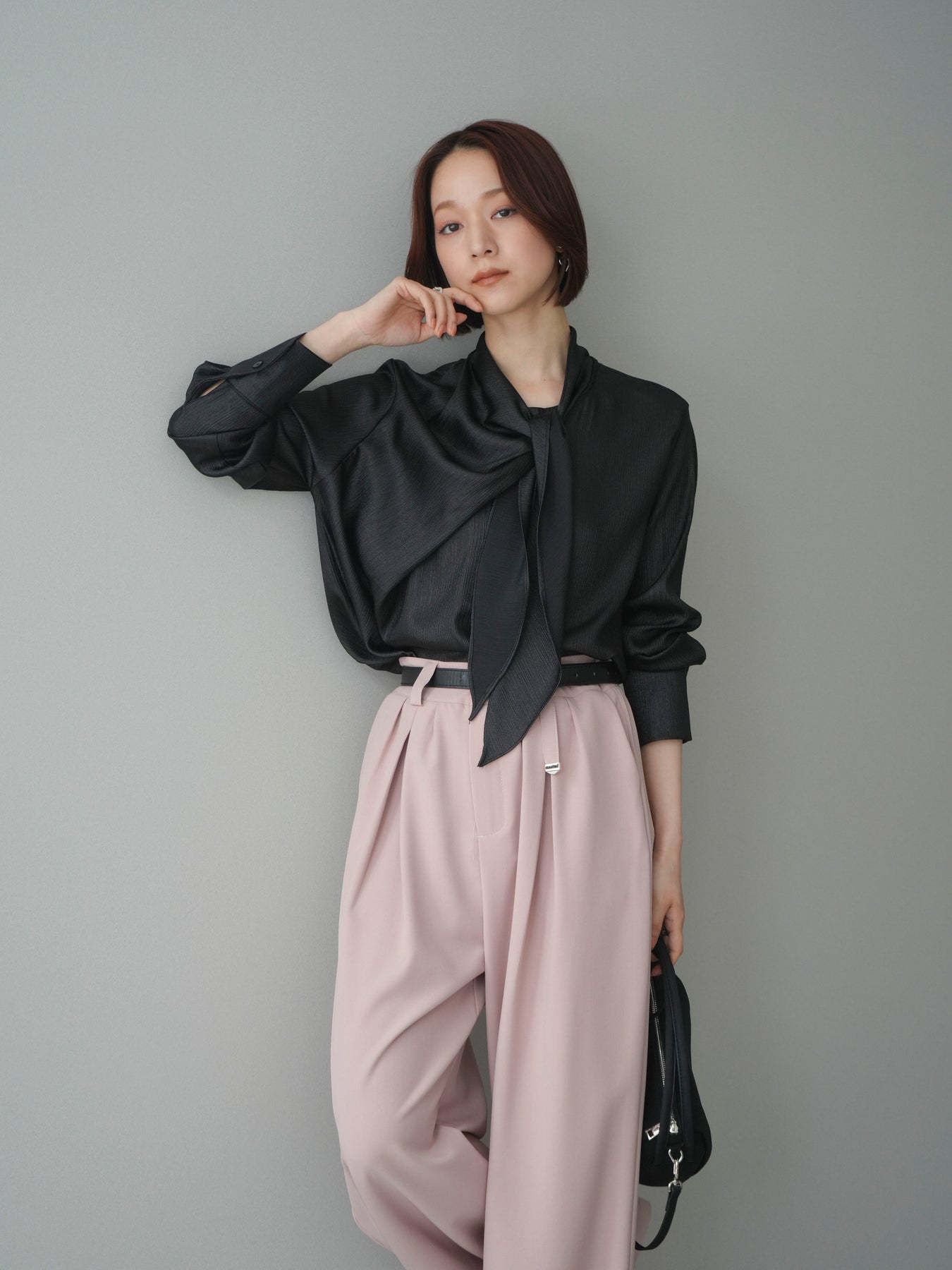 繊細な楊柳素材にほのかな光沢感をプラスしたシャイニーブラウス。動くたびに表情が変わる軽やかな風合いが、上品で洗練された印象を演出します。首元のタイデザインがアクセントになり、結び方次第で雰囲気のアレンジも可能。ゆとりのあるシルエットでボトムスを選ばず、きれいめからモードなスタイリングまで幅広く活躍する一枚です。 ※ボトムス、キャミソール(インナー)以外の商品は一律でインナーは付属していません