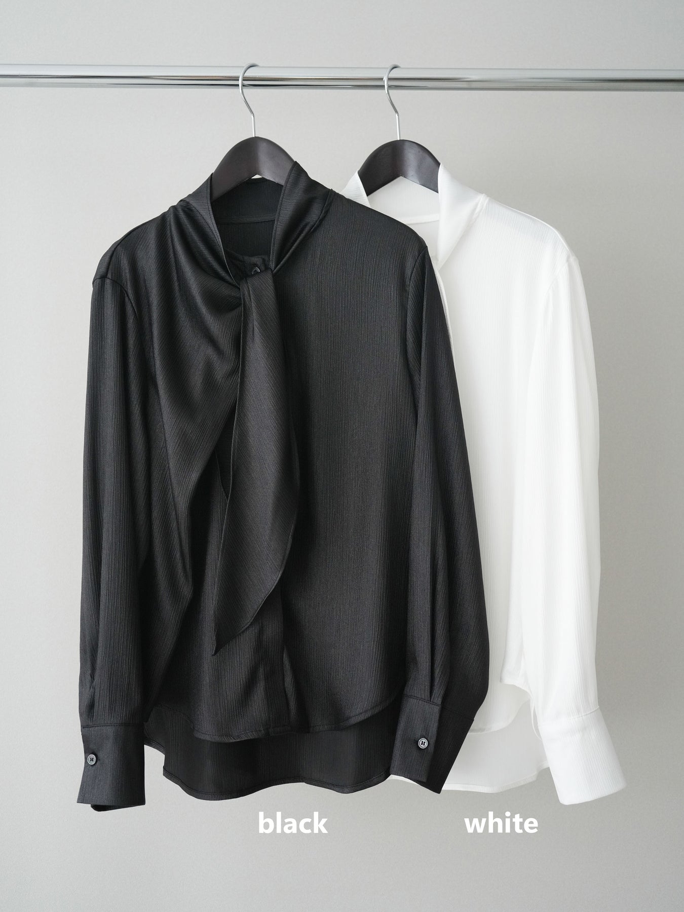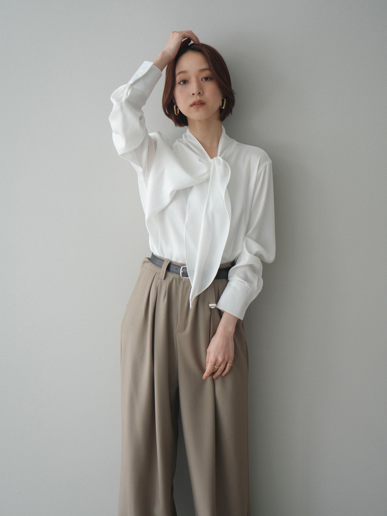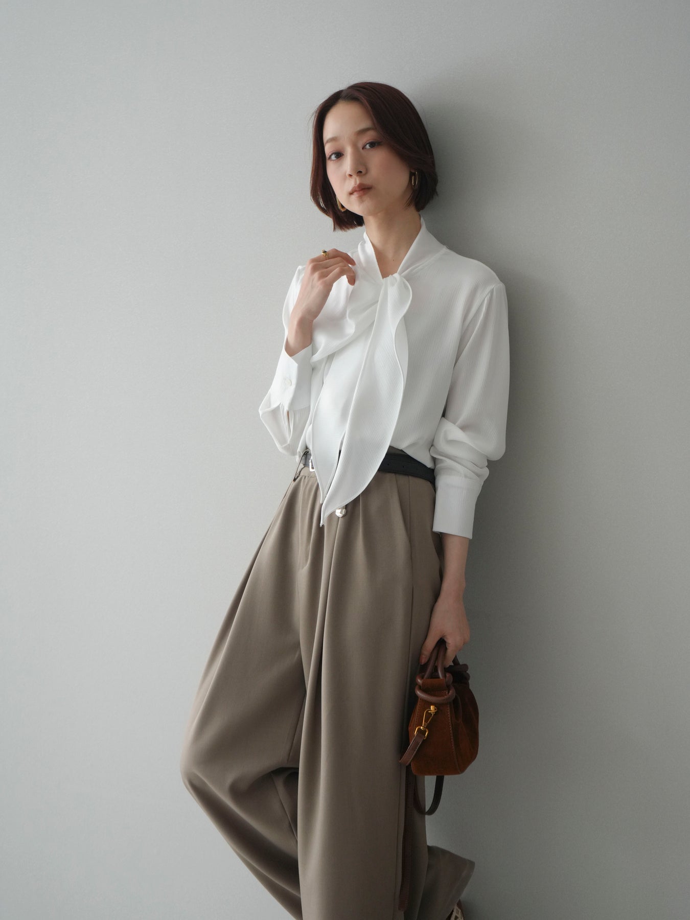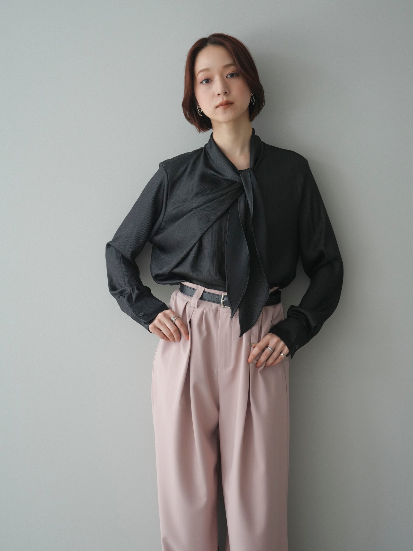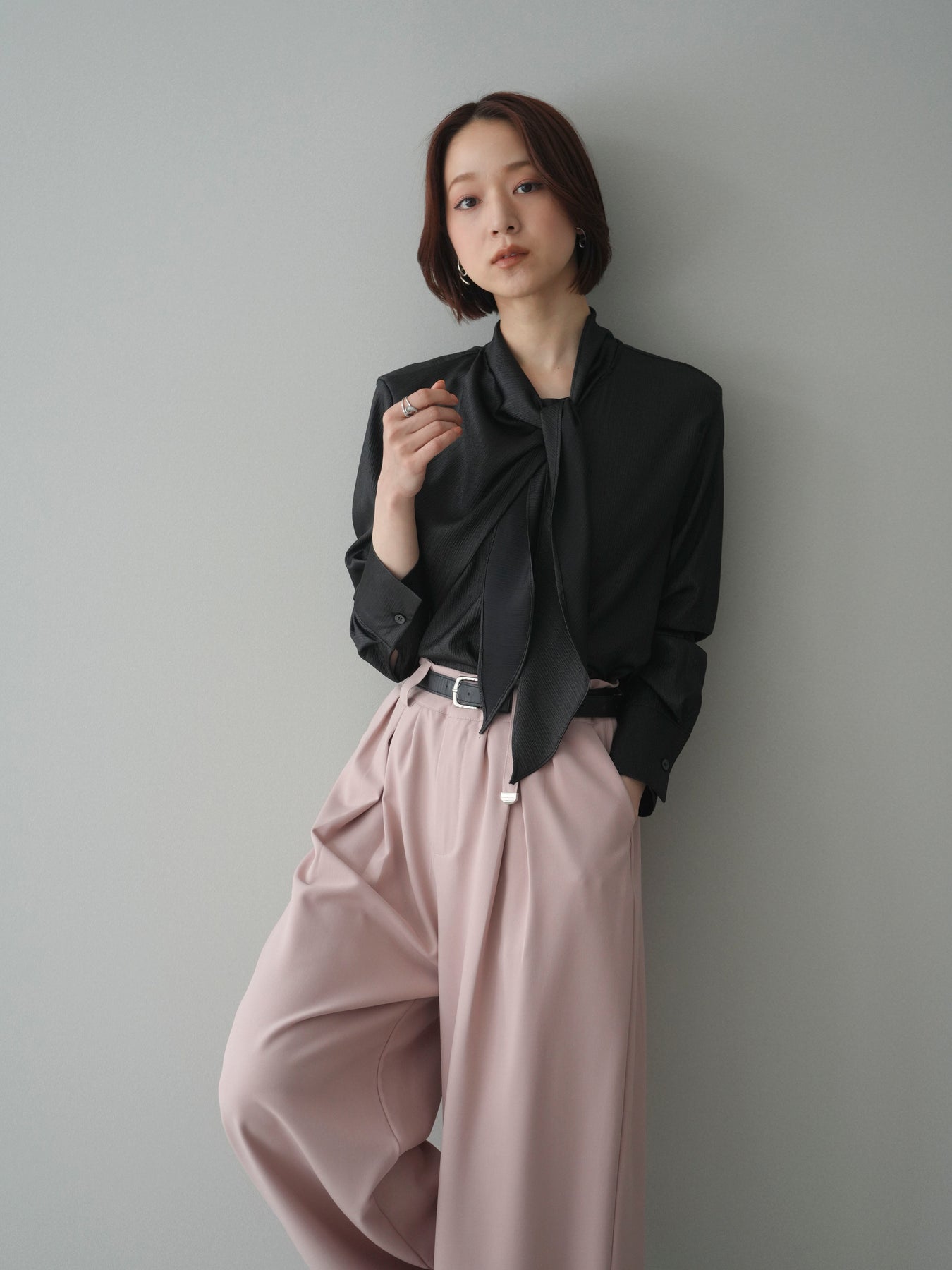 繊細な楊柳素材にほのかな光沢感をプラスしたシャイニーブラウス。動くたびに表情が変わる軽やかな風合いが、上品で洗練された印象を演出します。首元のタイデザインがアクセントになり、結び方次第で雰囲気のアレンジも可能。ゆとりのあるシルエットでボトムスを選ばず、きれいめからモードなスタイリングまで幅広く活躍する一枚です。 ※ボトムス、キャミソール(インナー)以外の商品は一律でインナーは付属していません