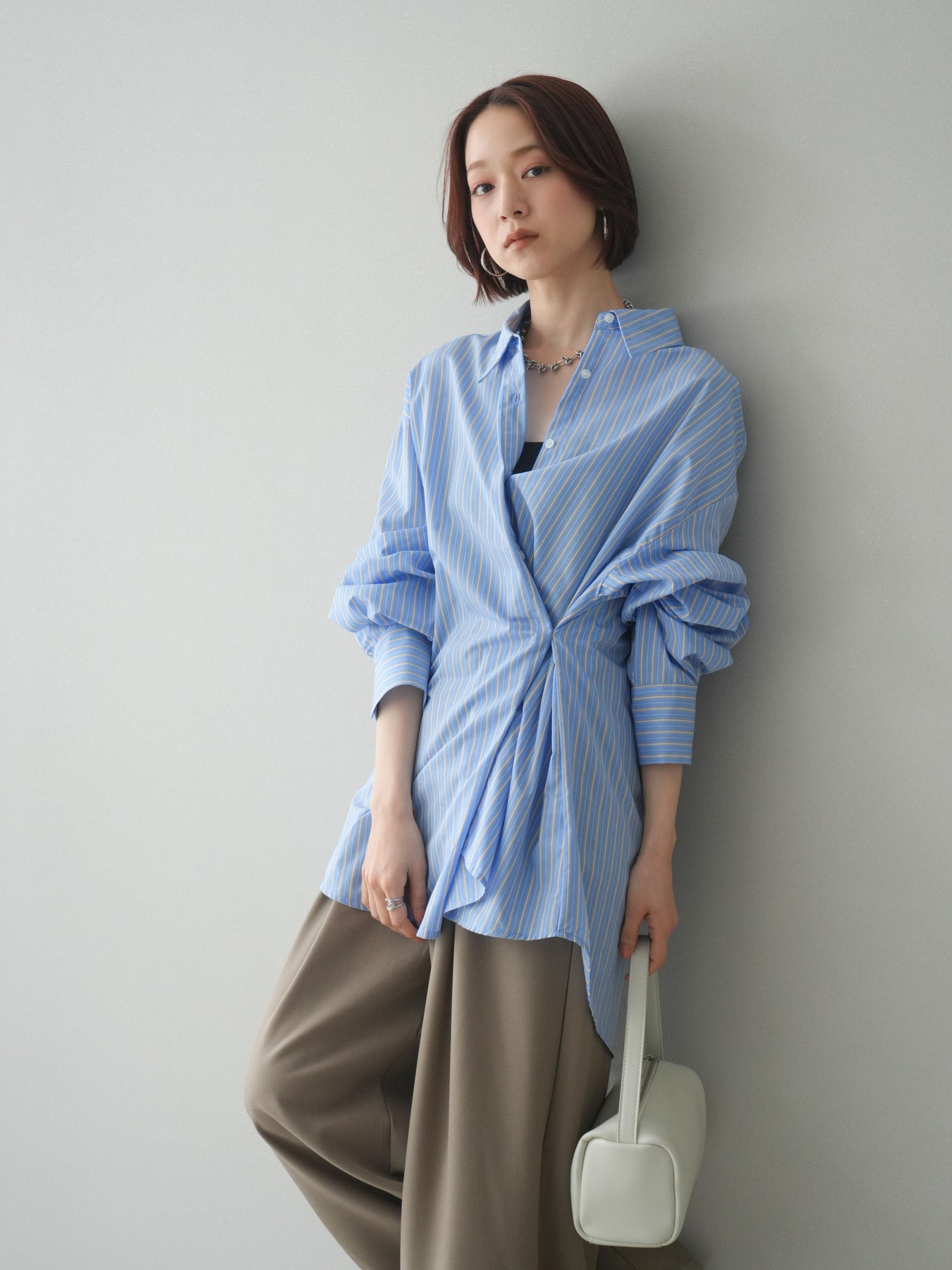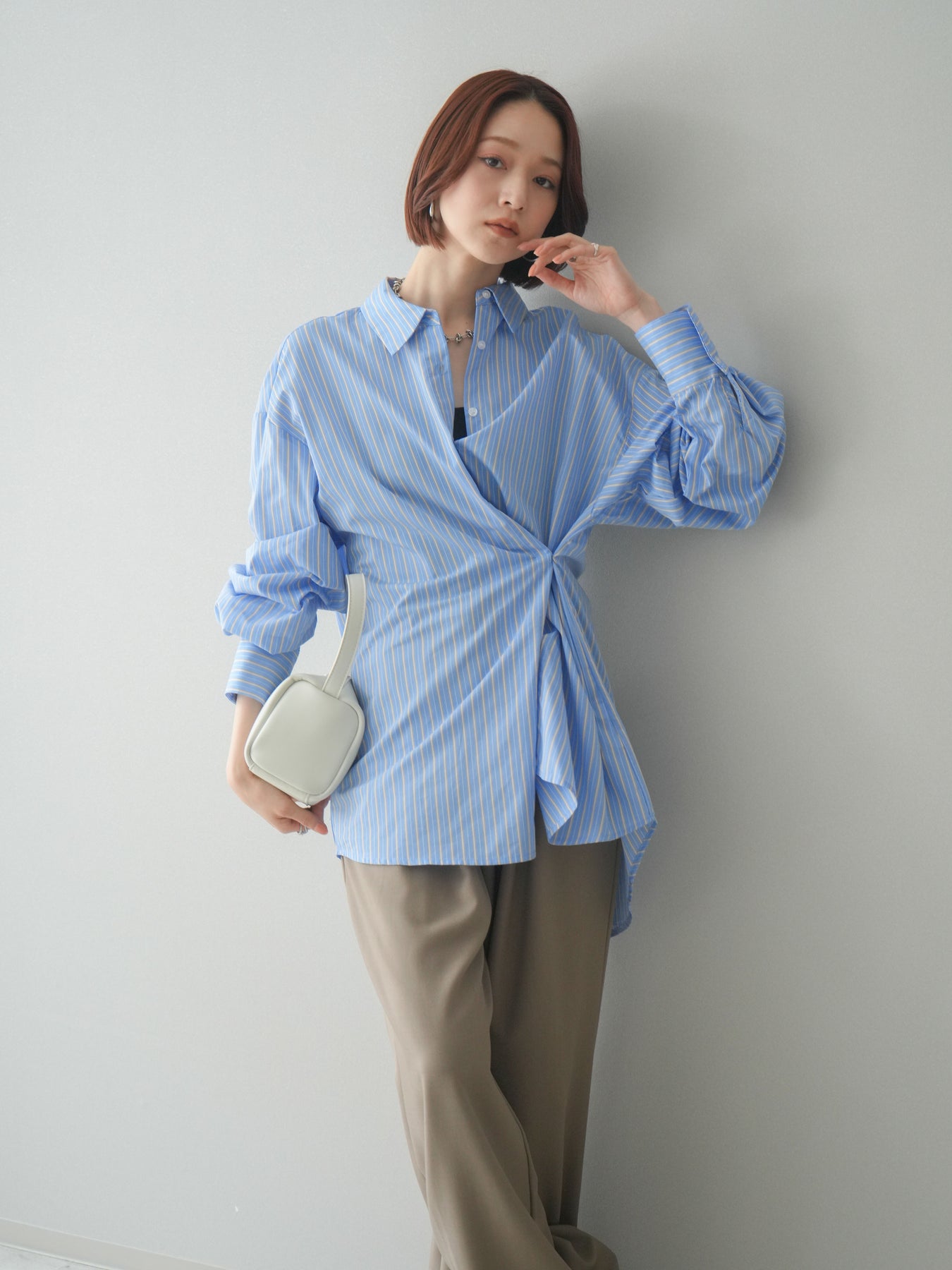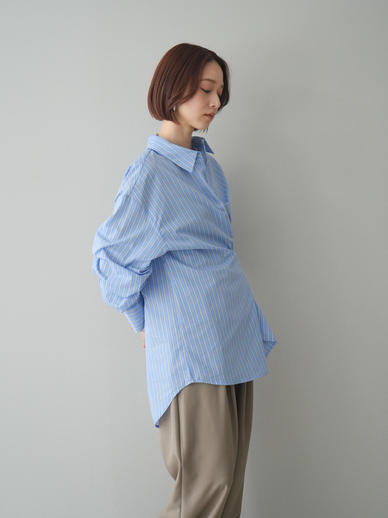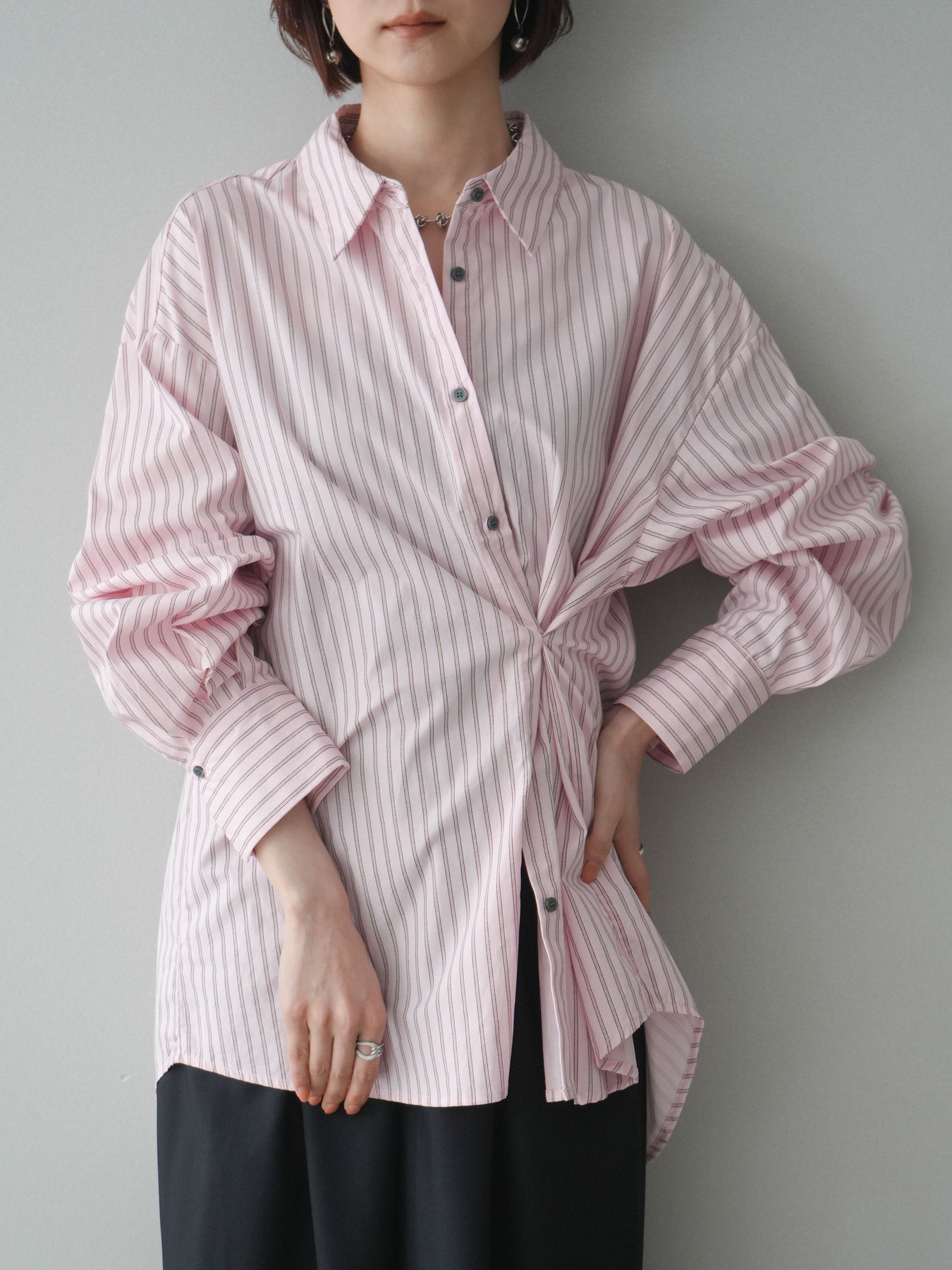 程よくハリのある素材感で仕立てた、ストライプ柄のルーズシャツ。ゆとりのあるシルエットが抜け感を演出し、さらっと羽織るだけでこなれた印象に仕上がります。前後2way仕様で、ベーシックなシャツとしてはもちろん、ボタンをアレンジしてラップ風に着こなすなど表情の変化を楽しめる一枚。ヒップにかかる長めの着丈で、パンツスタイルにもバランスよく合わせていただけます。 ※ボトムス、キャミソール(インナー)以外の商品は一律でインナーは付属していません