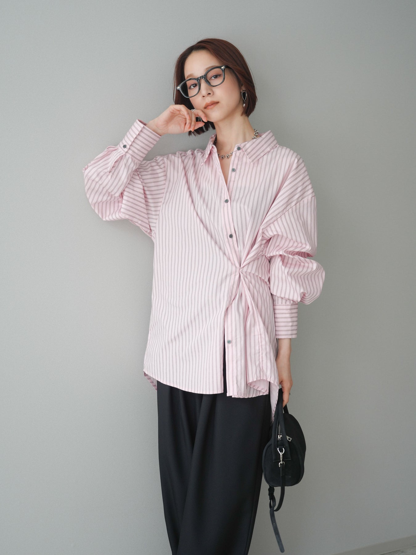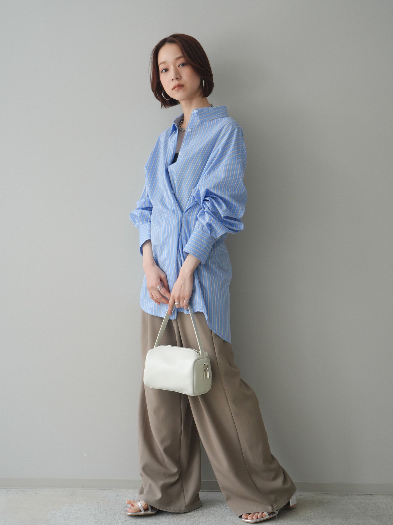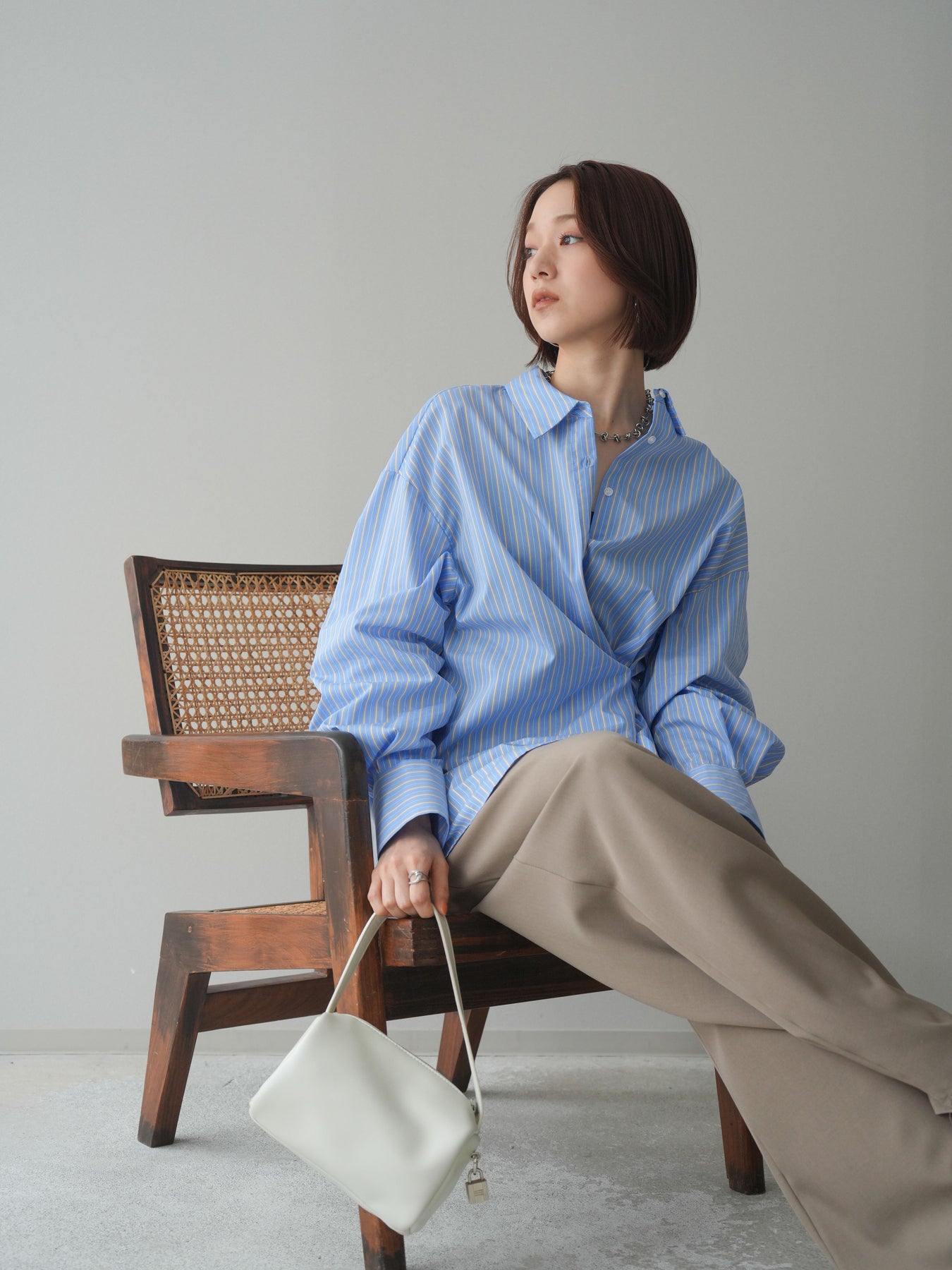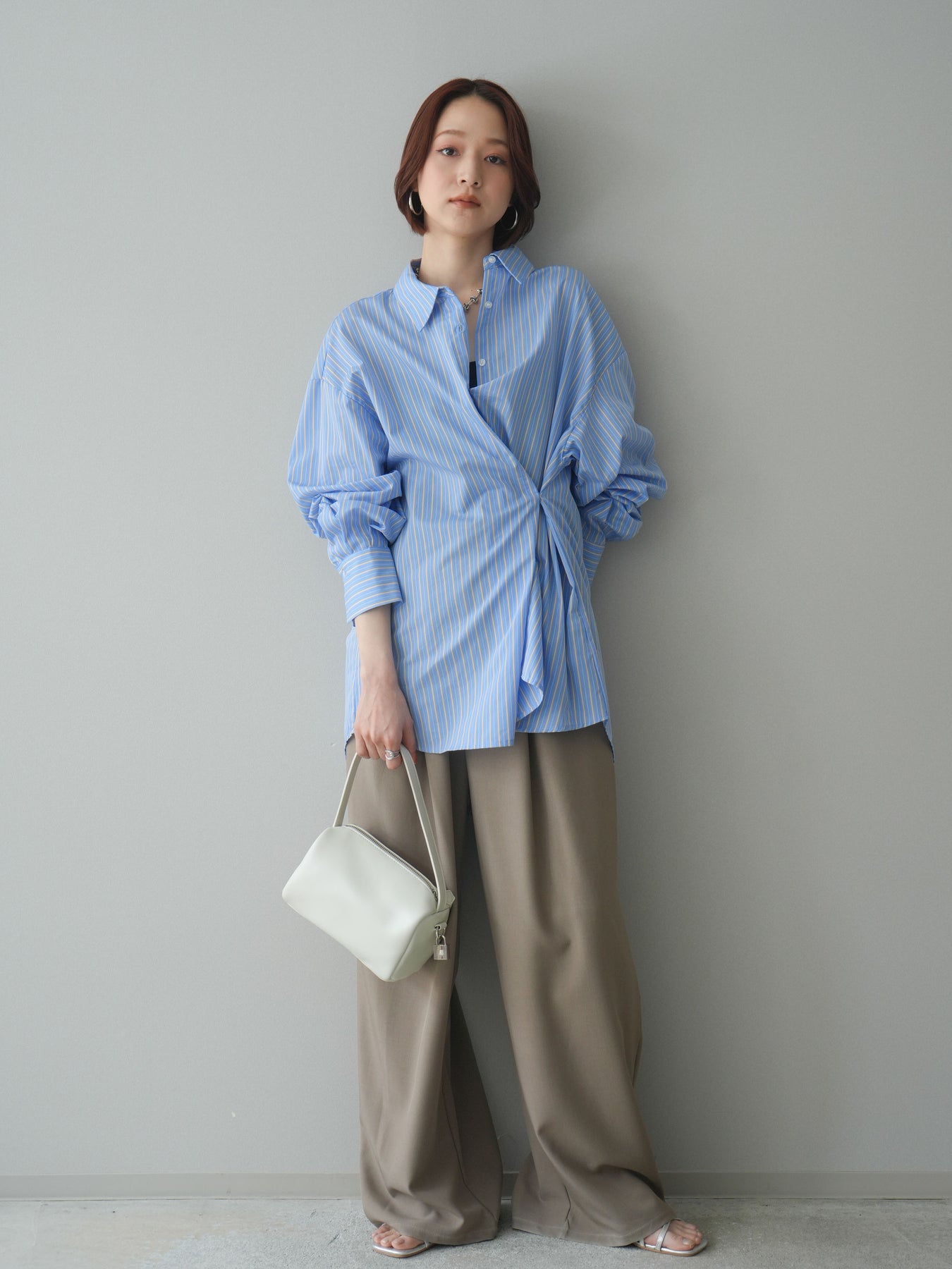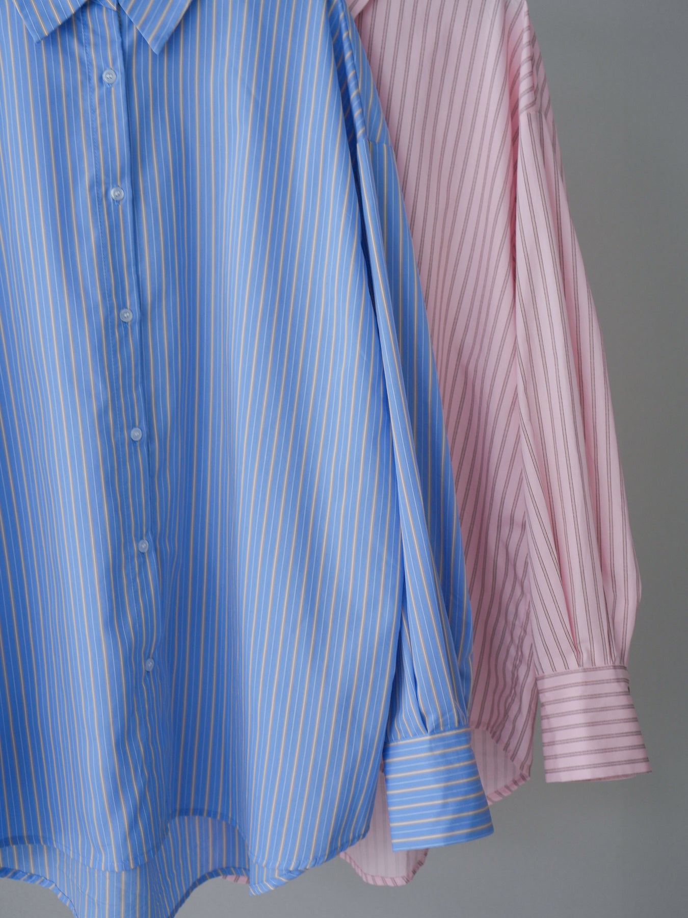 程よくハリのある素材感で仕立てた、ストライプ柄のルーズシャツ。ゆとりのあるシルエットが抜け感を演出し、さらっと羽織るだけでこなれた印象に仕上がります。前後2way仕様で、ベーシックなシャツとしてはもちろん、ボタンをアレンジしてラップ風に着こなすなど表情の変化を楽しめる一枚。ヒップにかかる長めの着丈で、パンツスタイルにもバランスよく合わせていただけます。 ※ボトムス、キャミソール(インナー)以外の商品は一律でインナーは付属していません