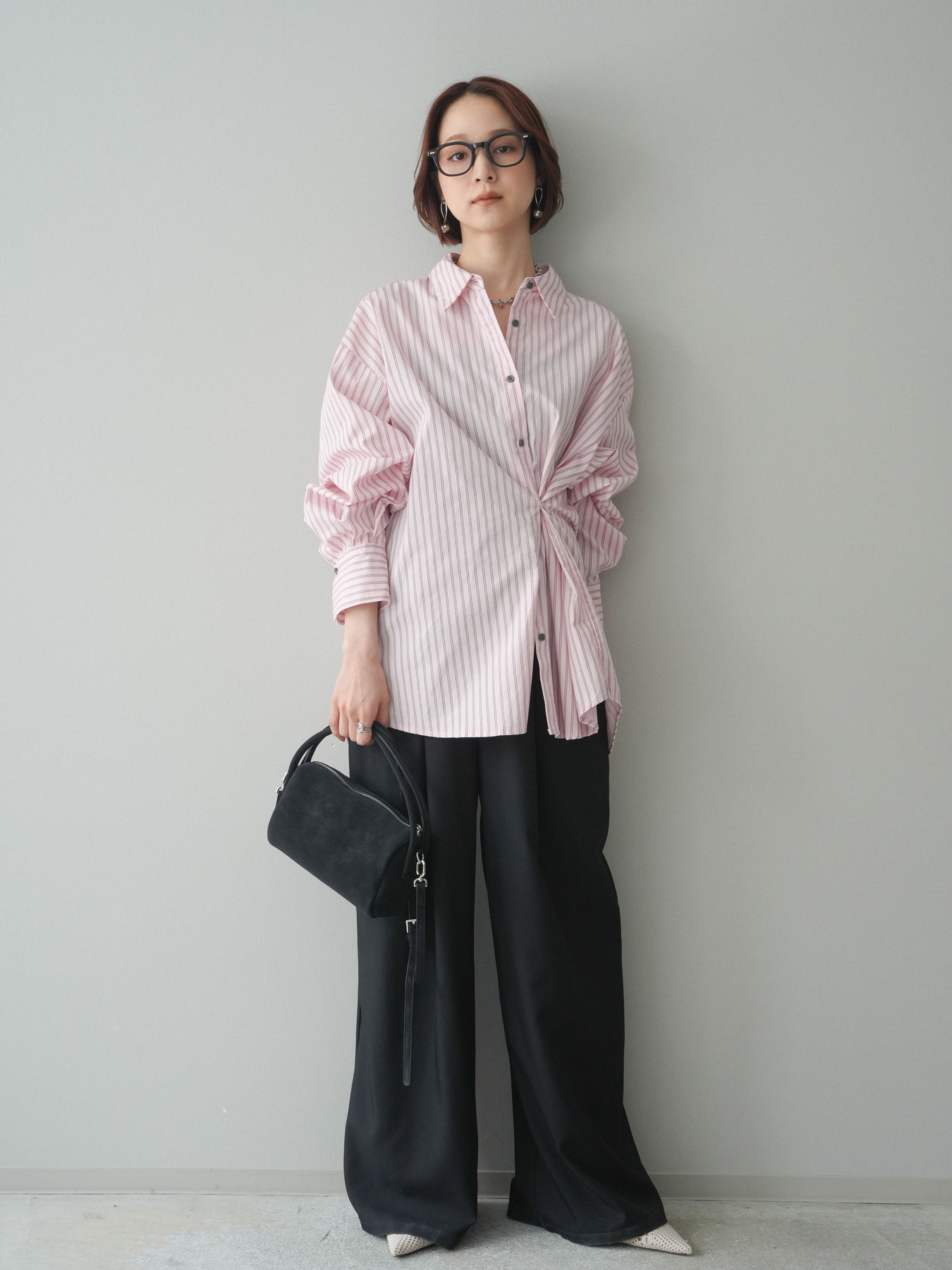 [SET]2wayルーズストライプシャツ+ベルト付キーホルダーモチーフワイドパンツ(2set)