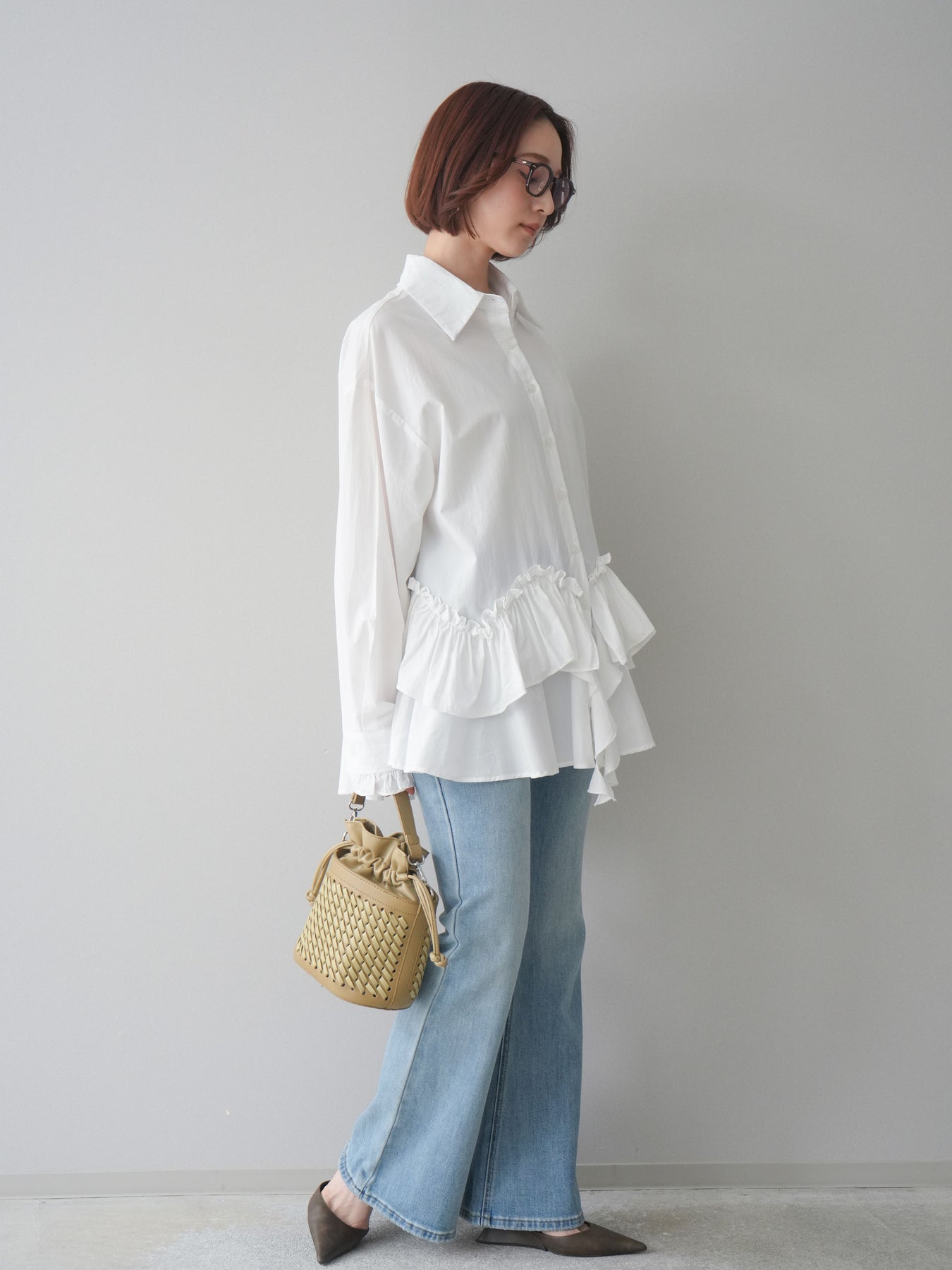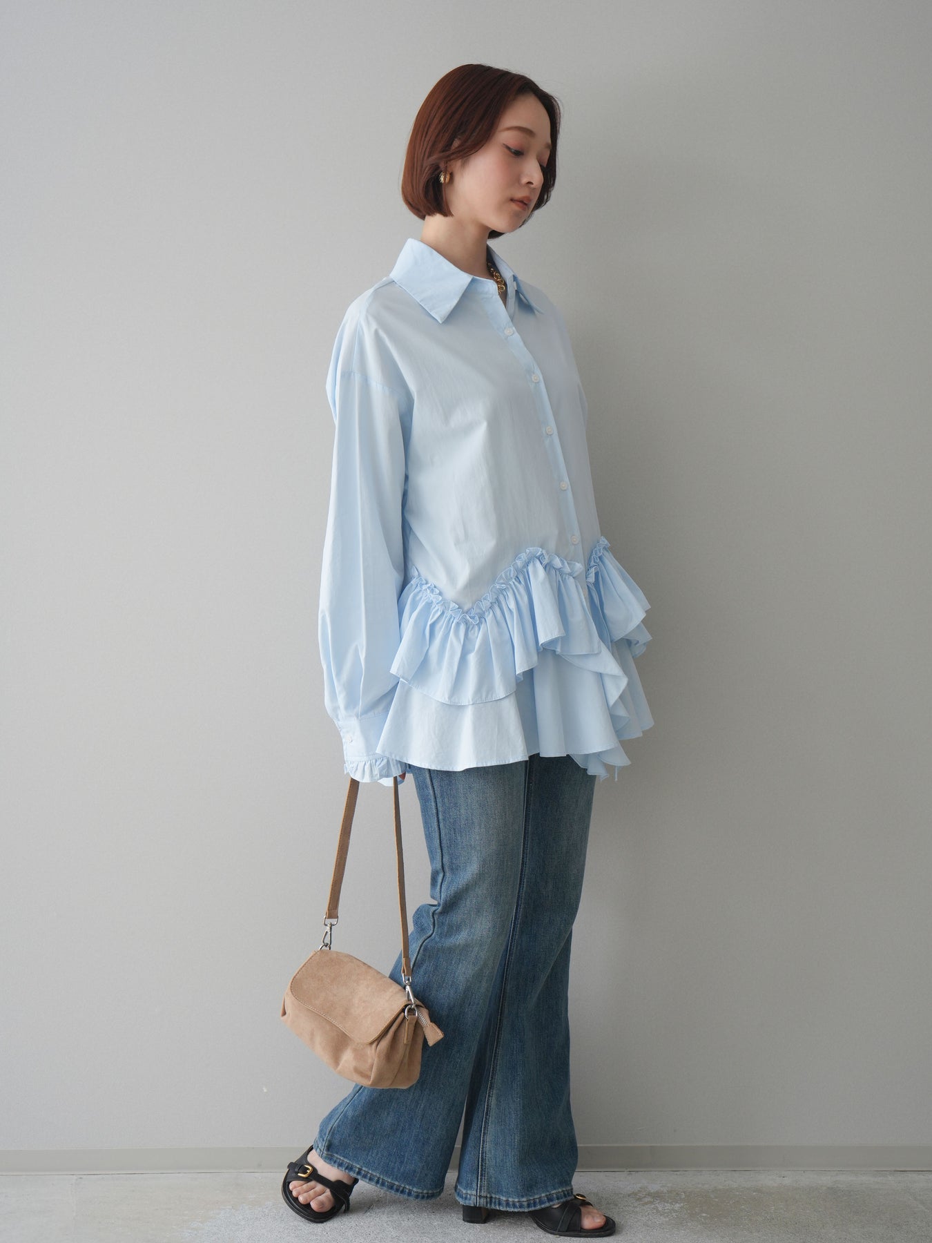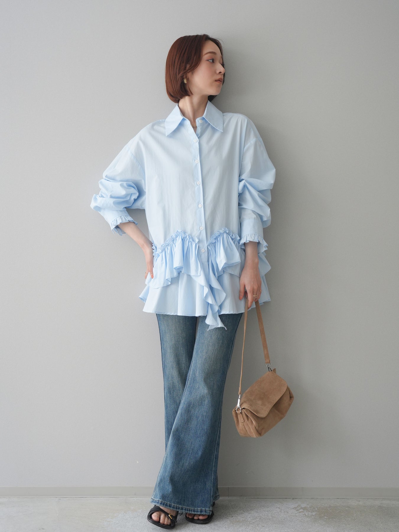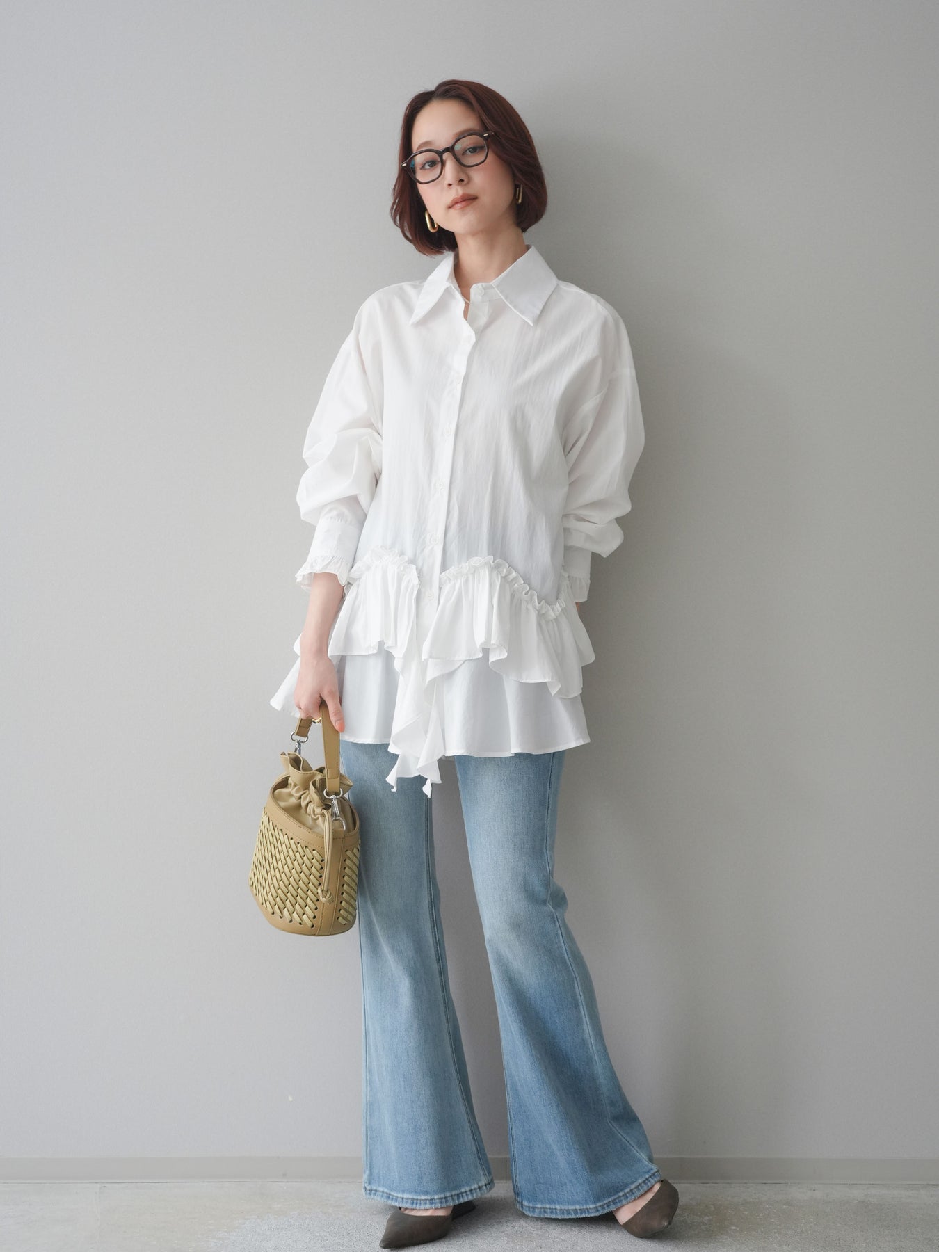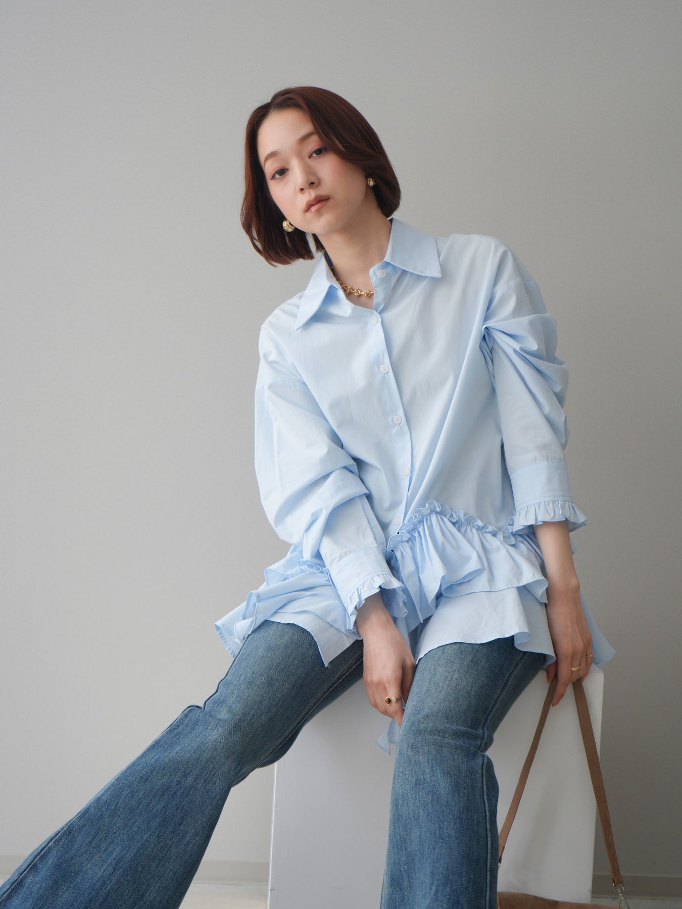 [SET]ラッフルデザインティアードブラウス+ハイウエストフレアデニムパンツ(2set)