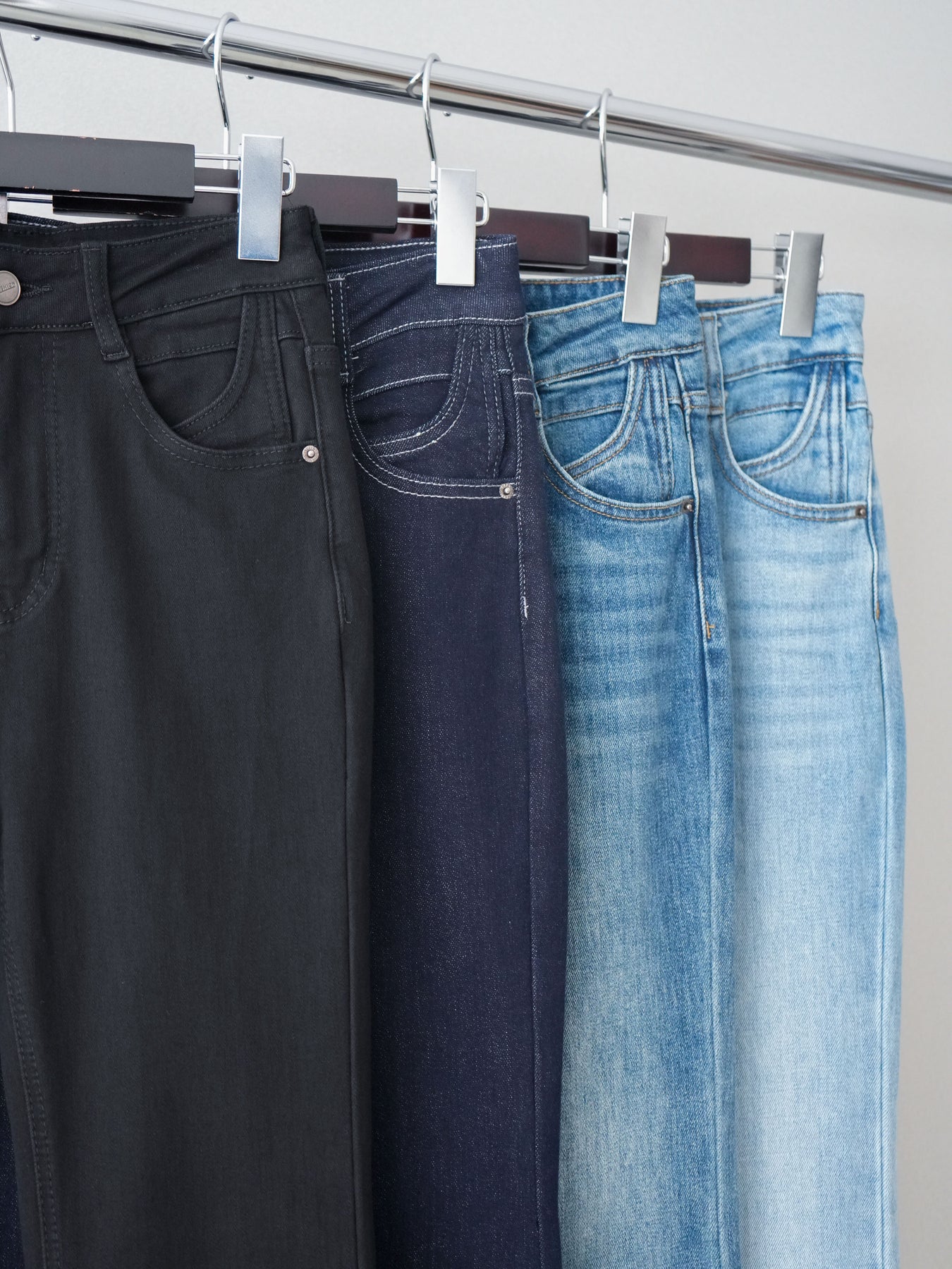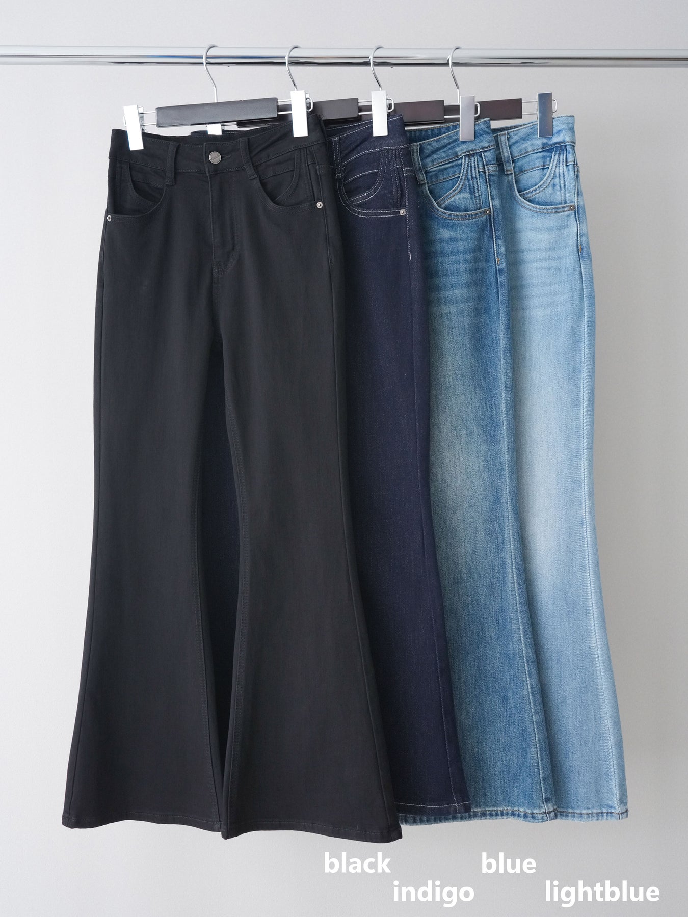 脚長効果を引き出すハイウエストフレアデニムパンツ。ウエスト位置を高めに設定し、膝下から広がるフレアシルエットが縦ラインを強調してすっきりとした印象に仕上げます。程よくフィットする腰まわりとベーシックな5ポケットデザインで、トップスを選ばず着回しやすい一枚。コンパクトなトップスはもちろん、オーバーサイズアイテムとのバランスもおすすめです。