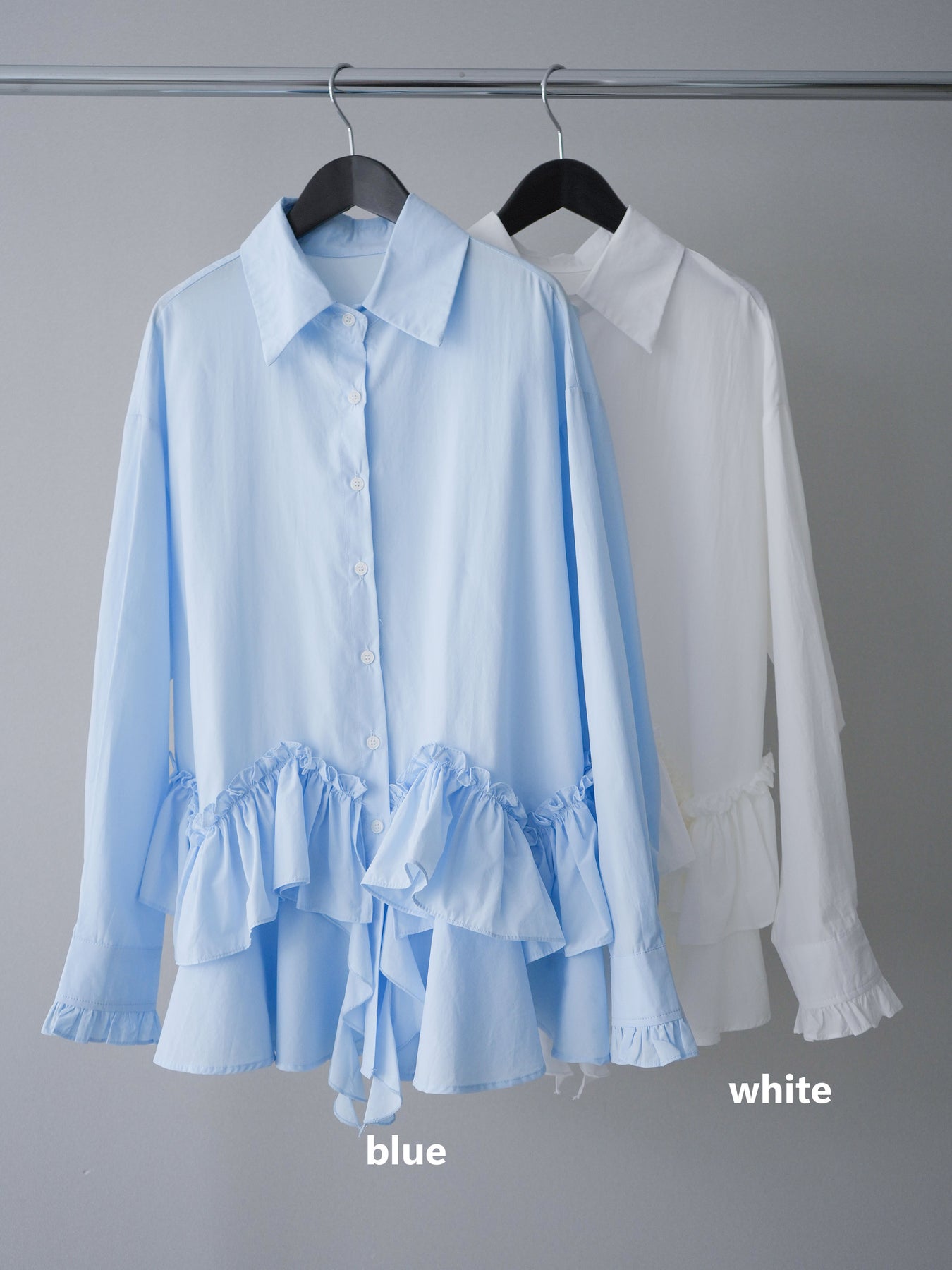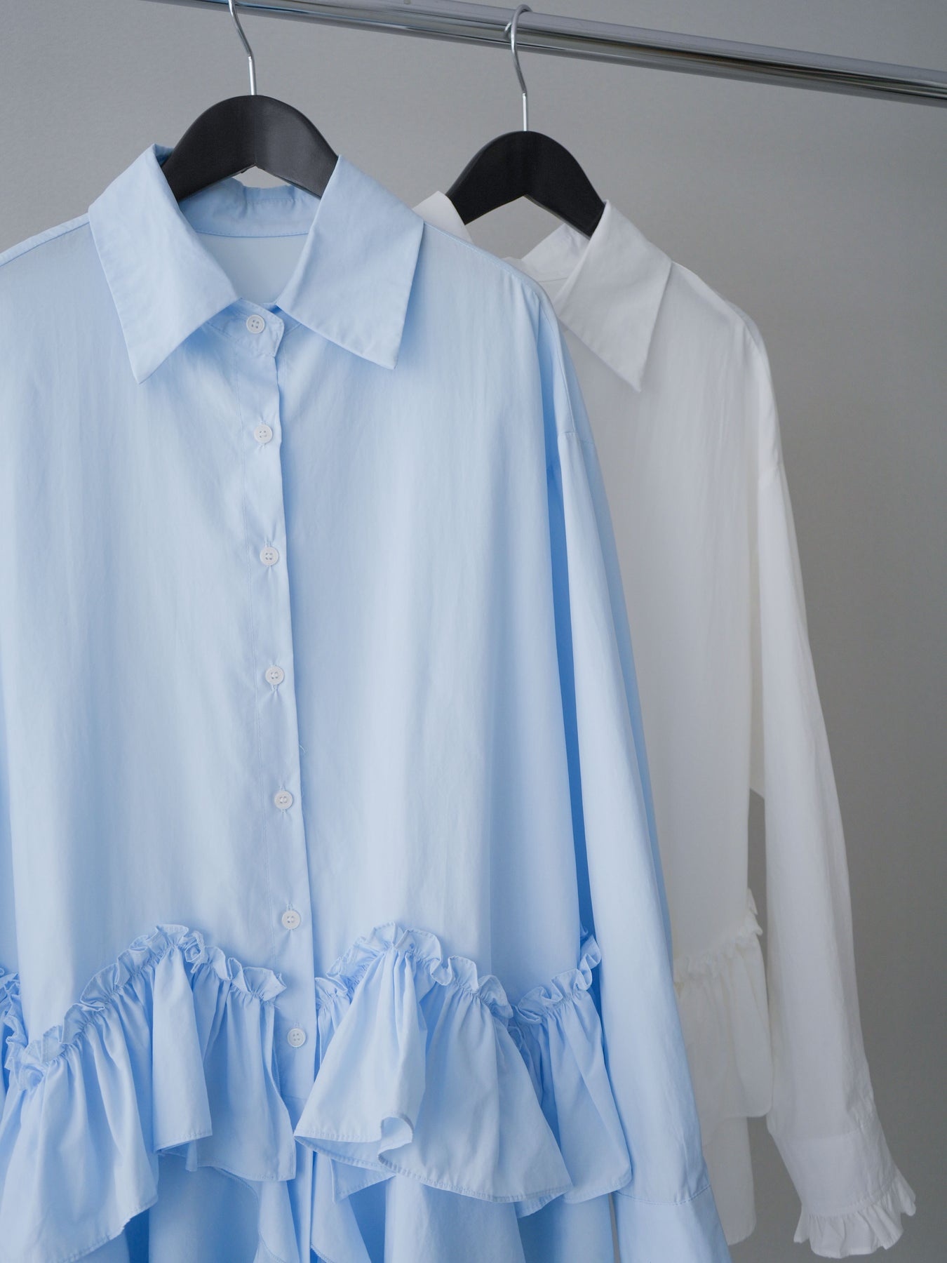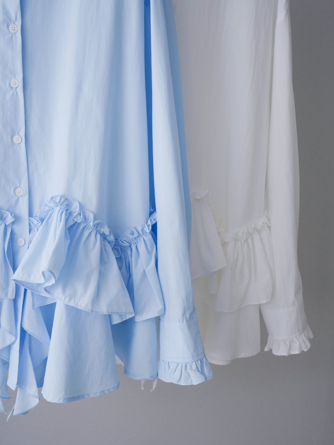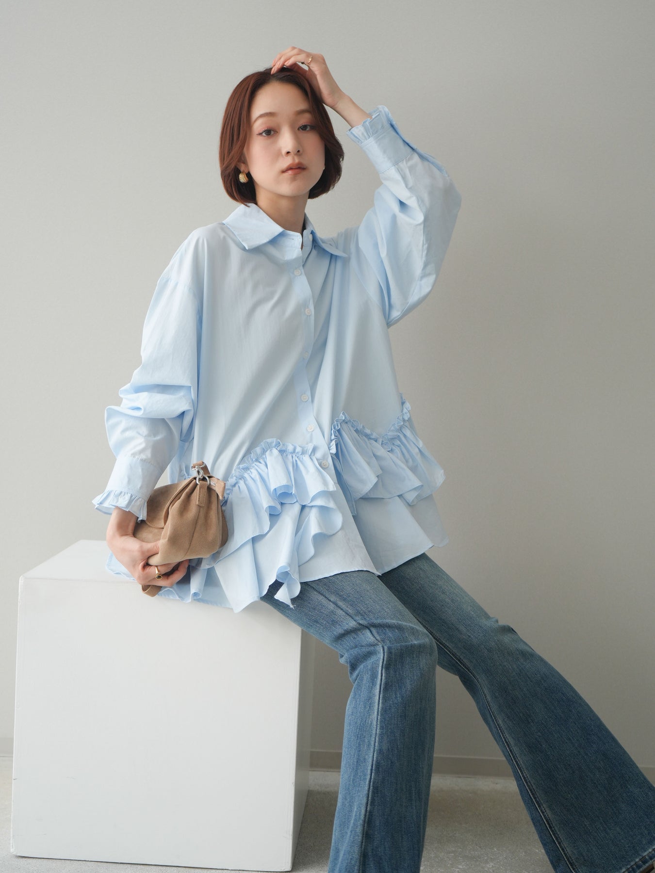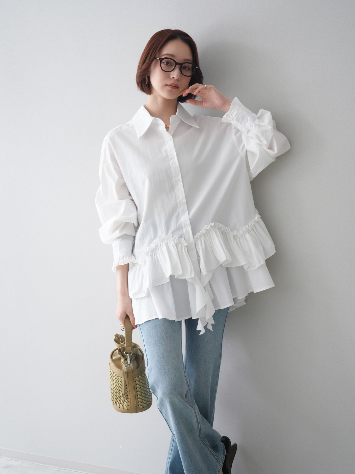 立体的に重なるフリルデザインが目を惹くティアードブラウス。裾にかけて広がるシルエットが動きのある表情を生み、シンプルなボトムスと合わせるだけで華やかなスタイリングが完成します。ヒップにかかる丈感でバランスが取りやすく、フロントボタン仕様で羽織りとしても着用可能。甘さの中にモード感も漂う、主役級の一枚です。 ※ボトムス、キャミソール(インナー)以外の商品は一律でインナーは付属していません