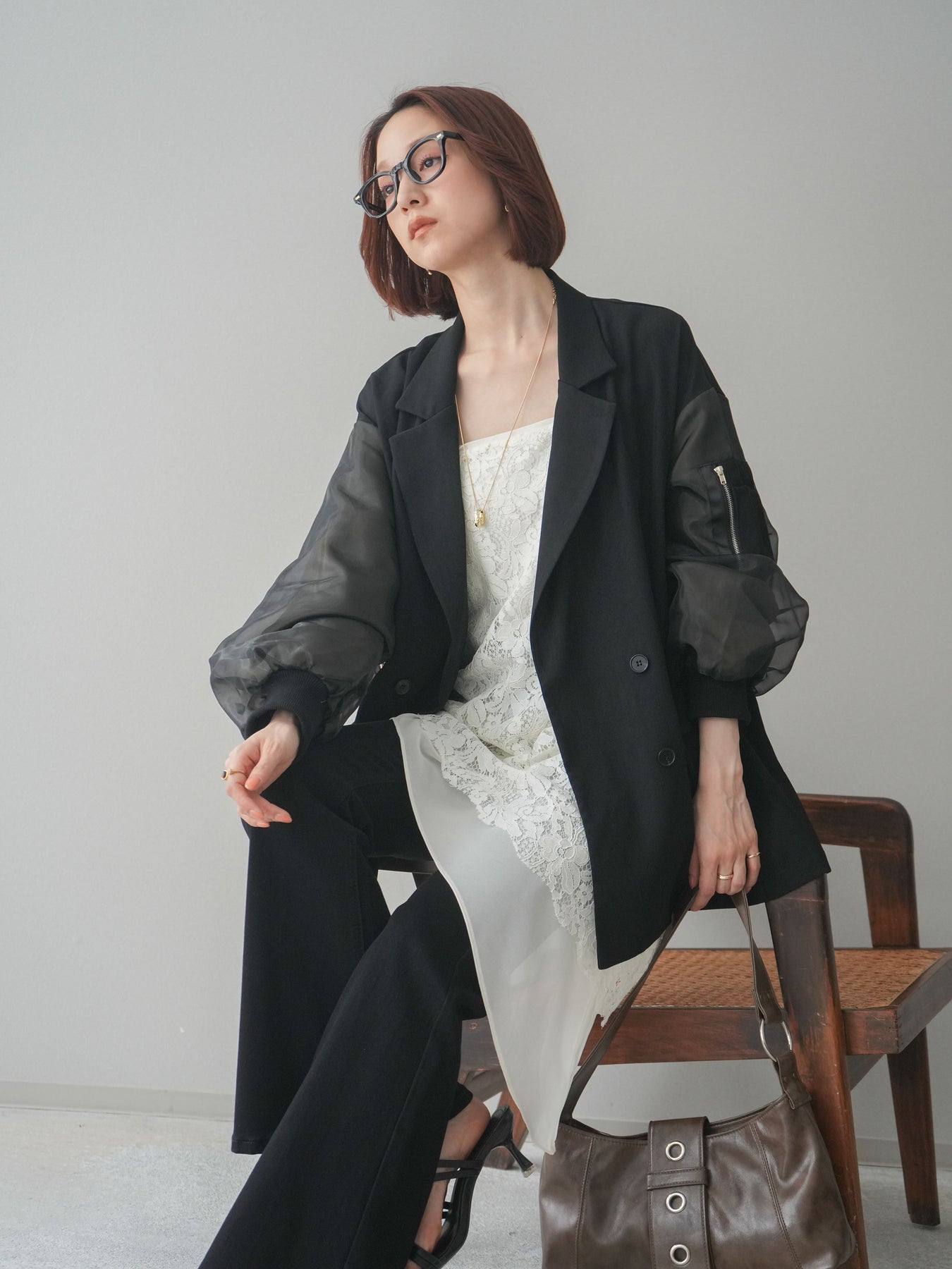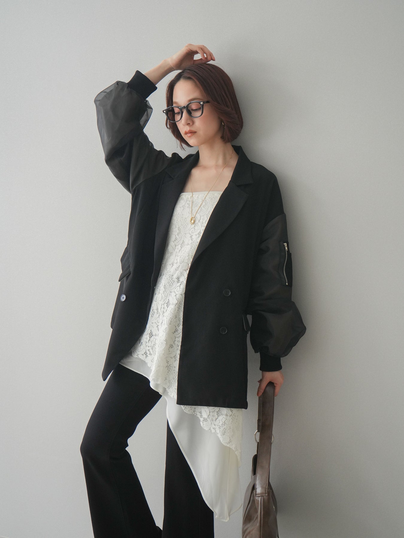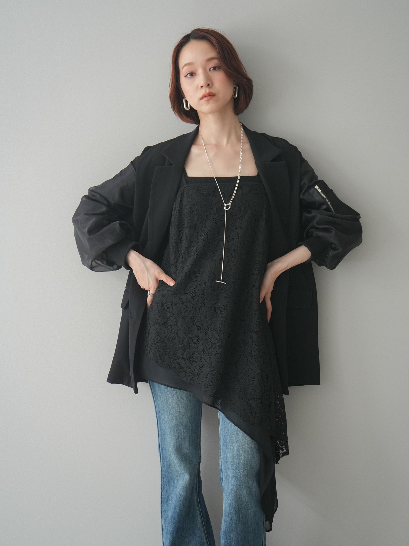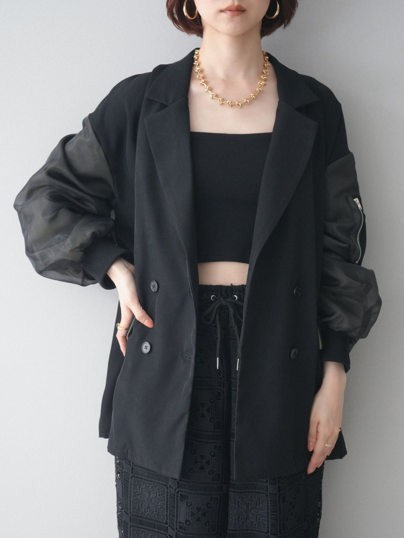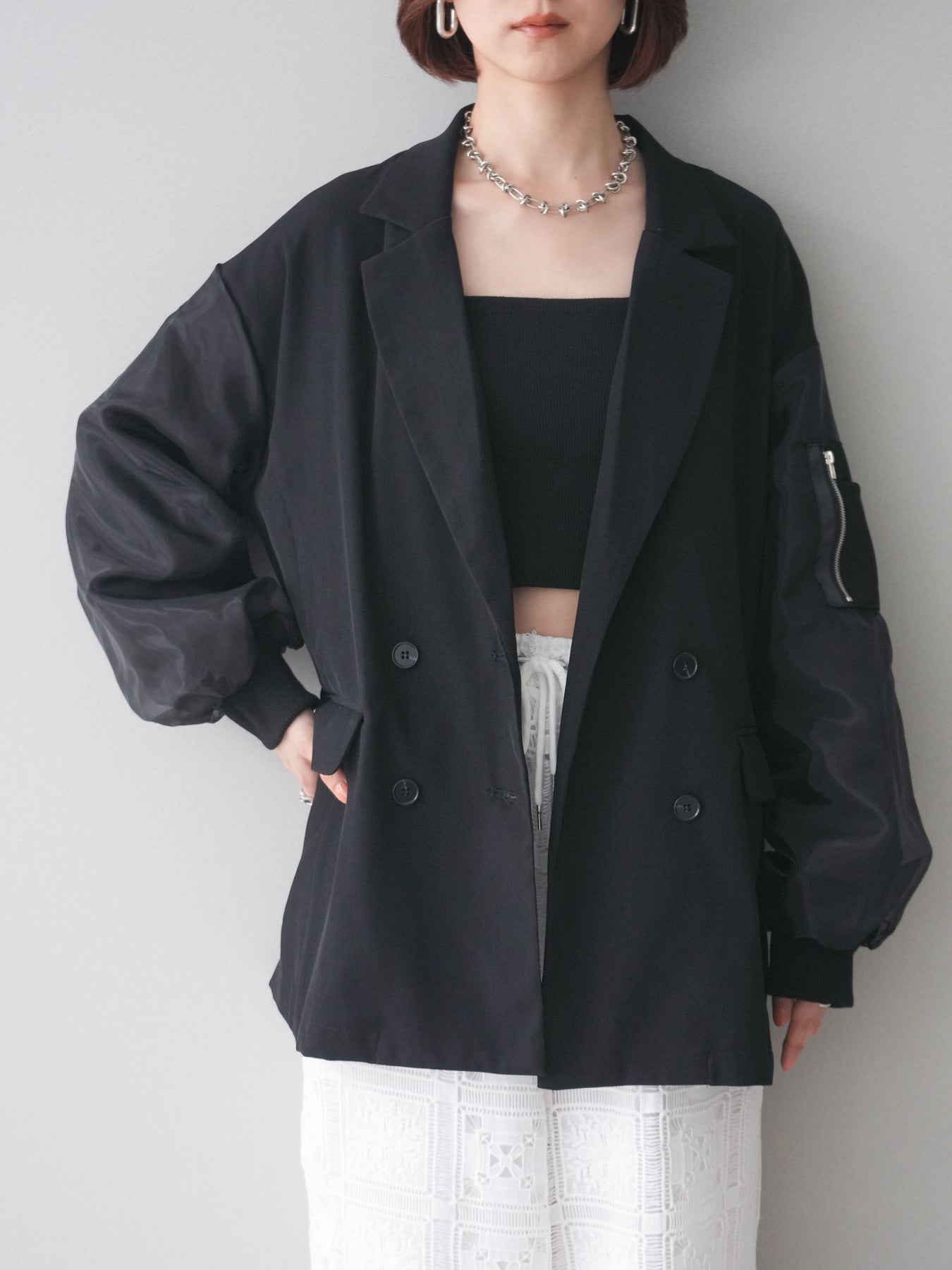 テーラードジャケットにMA-1ディテールを掛け合わせた、モードな印象のデザインジャケット。ダブルボタンのきちんと感に、スリーブの異素材切替やジップポケットがアクセントを添え、スタイリングにエッジを効かせます。程よくゆとりのあるシルエットで、ワンピースやスラックスはもちろん、デニム合わせもバランスよく決まる一着。羽織るだけでコーディネートを引き締めてくれます。 ※ボトムス、キャミソール(インナー)以外の商品は一律でインナーは付属していません