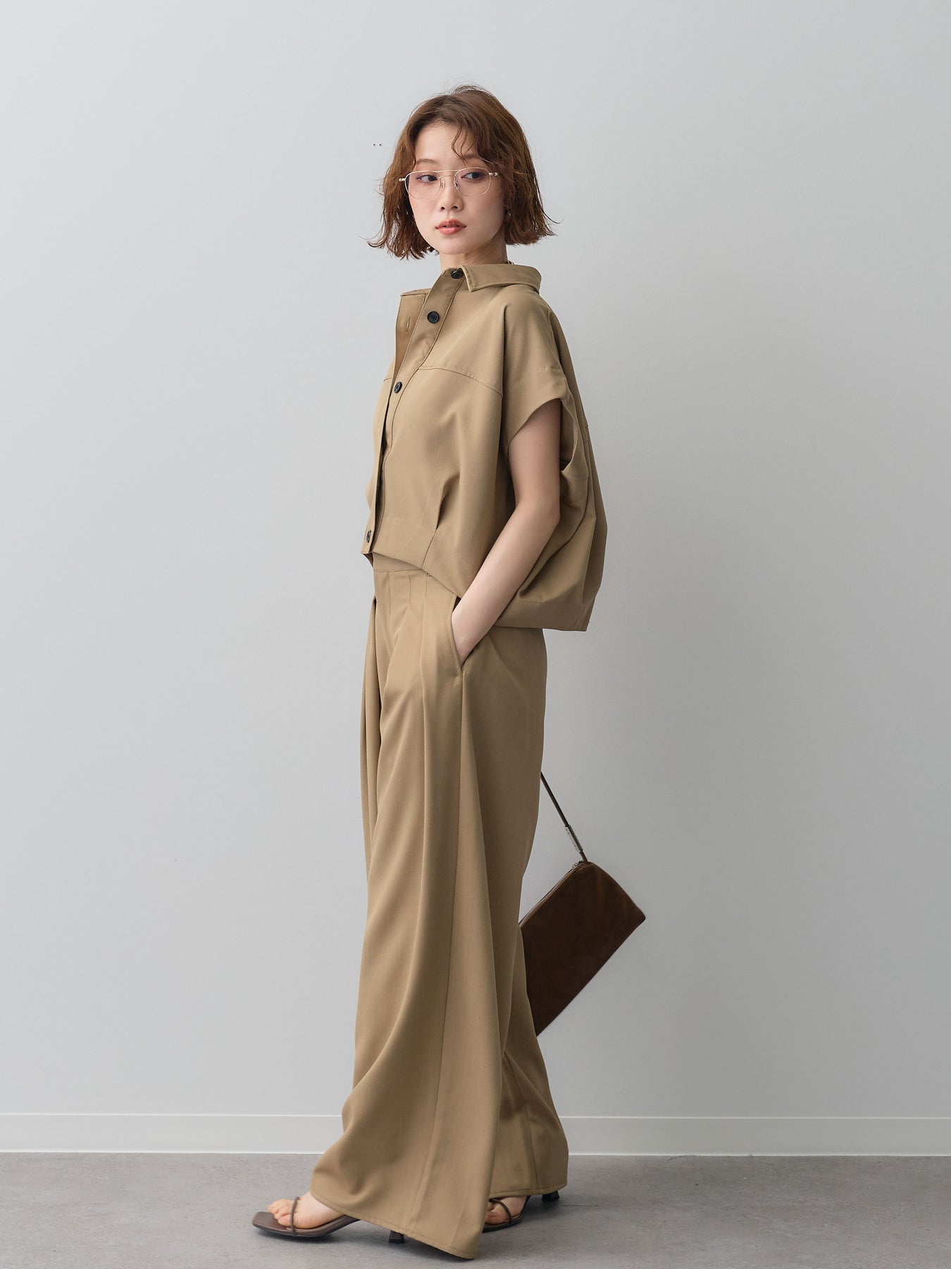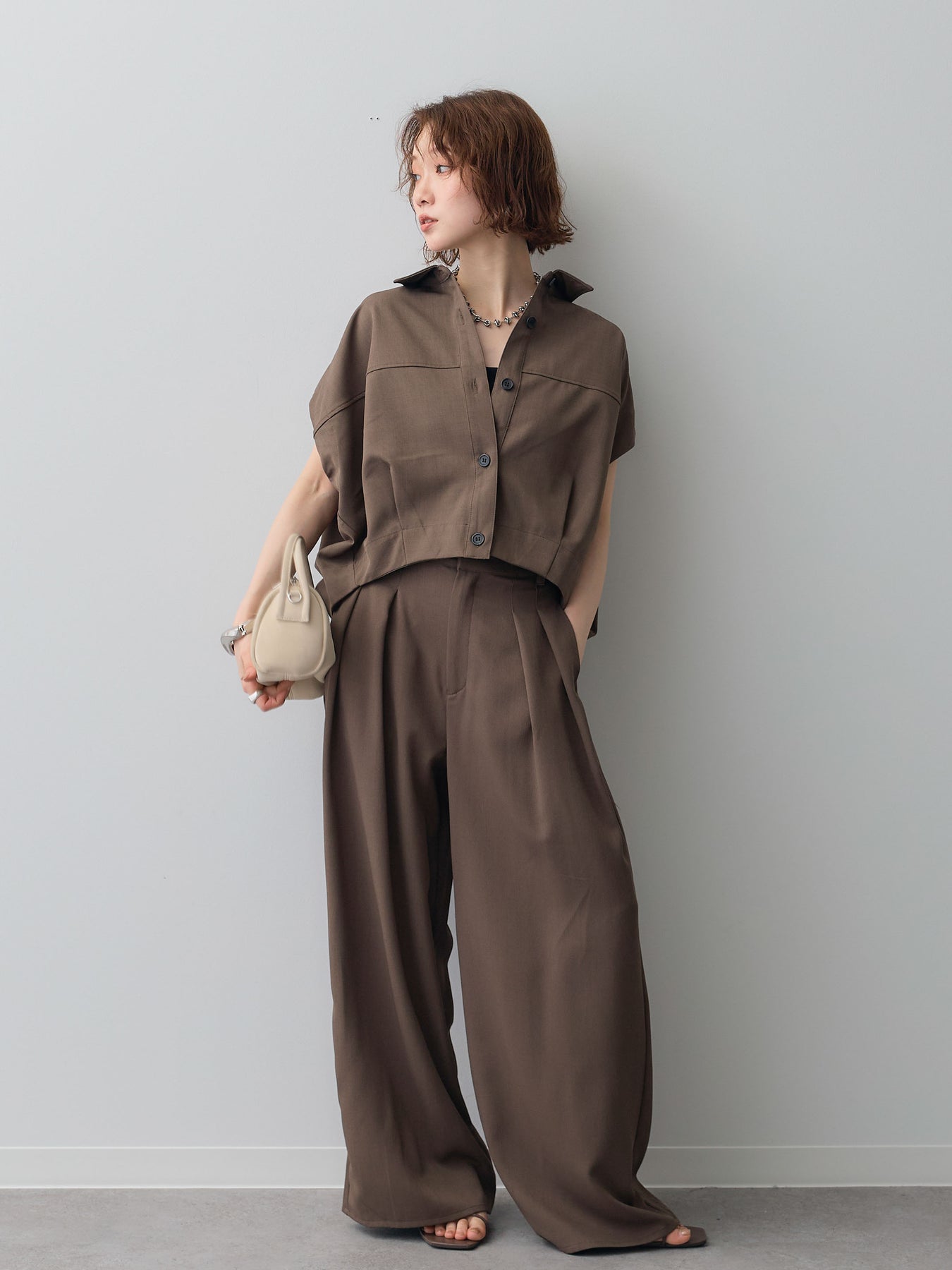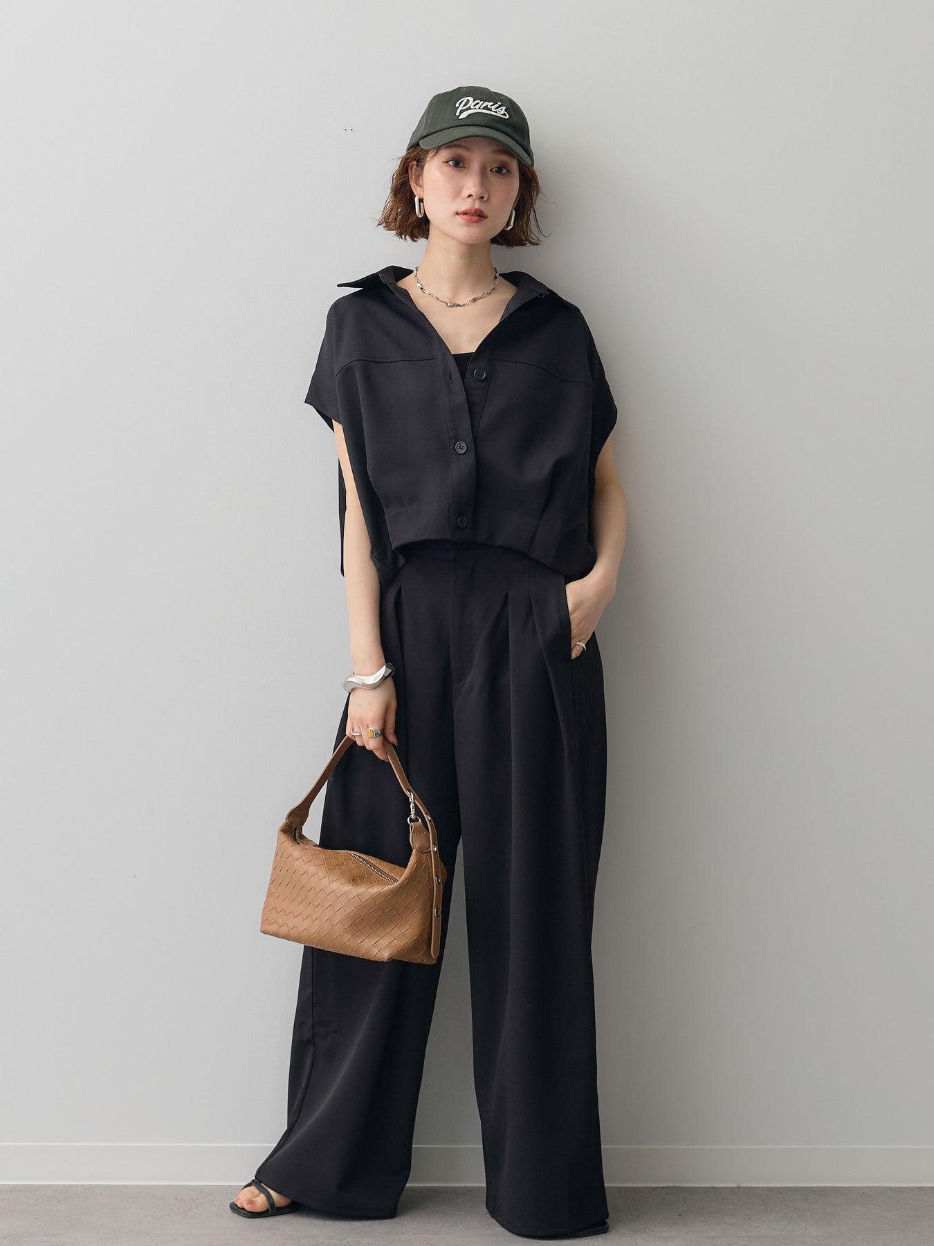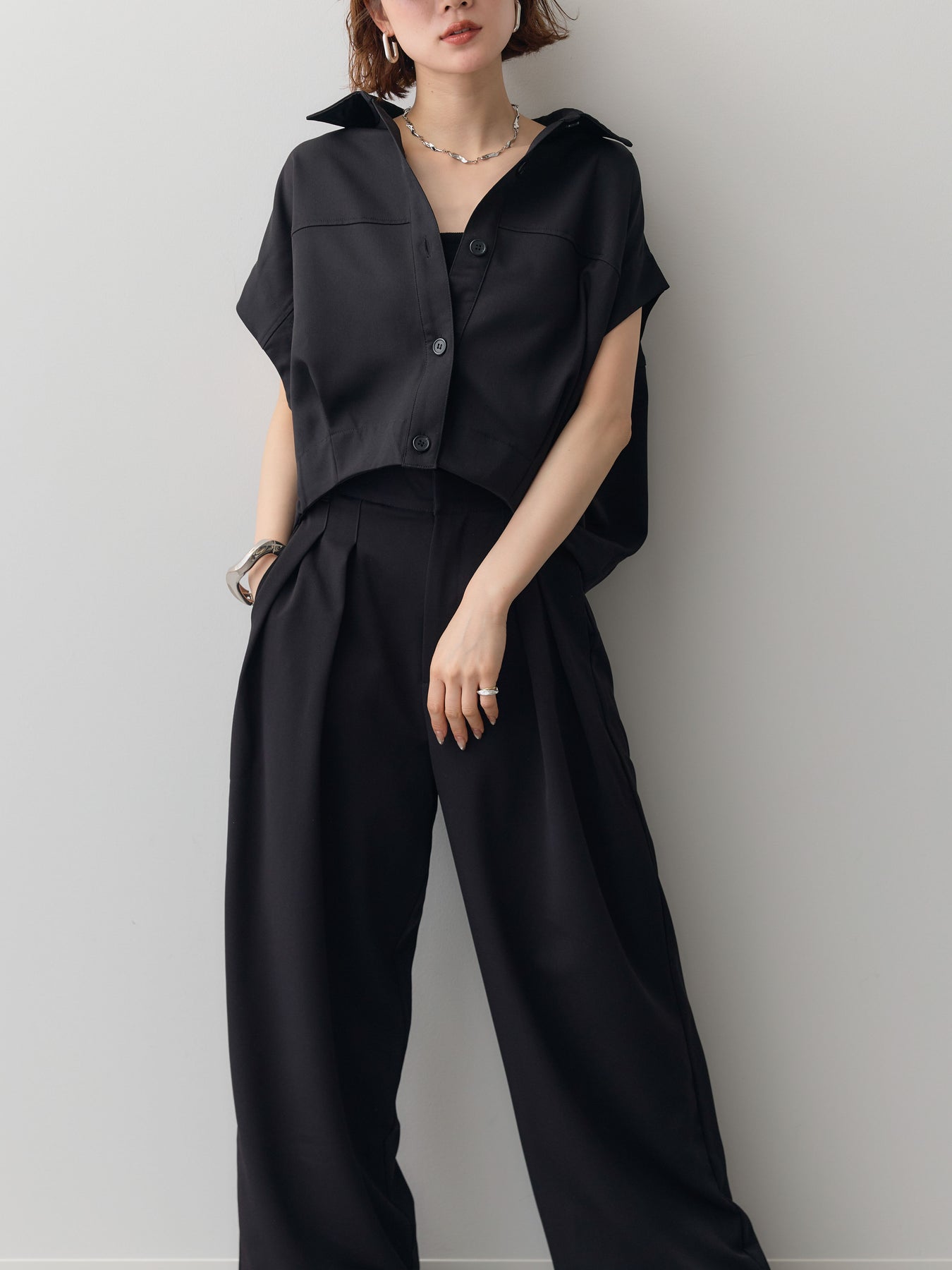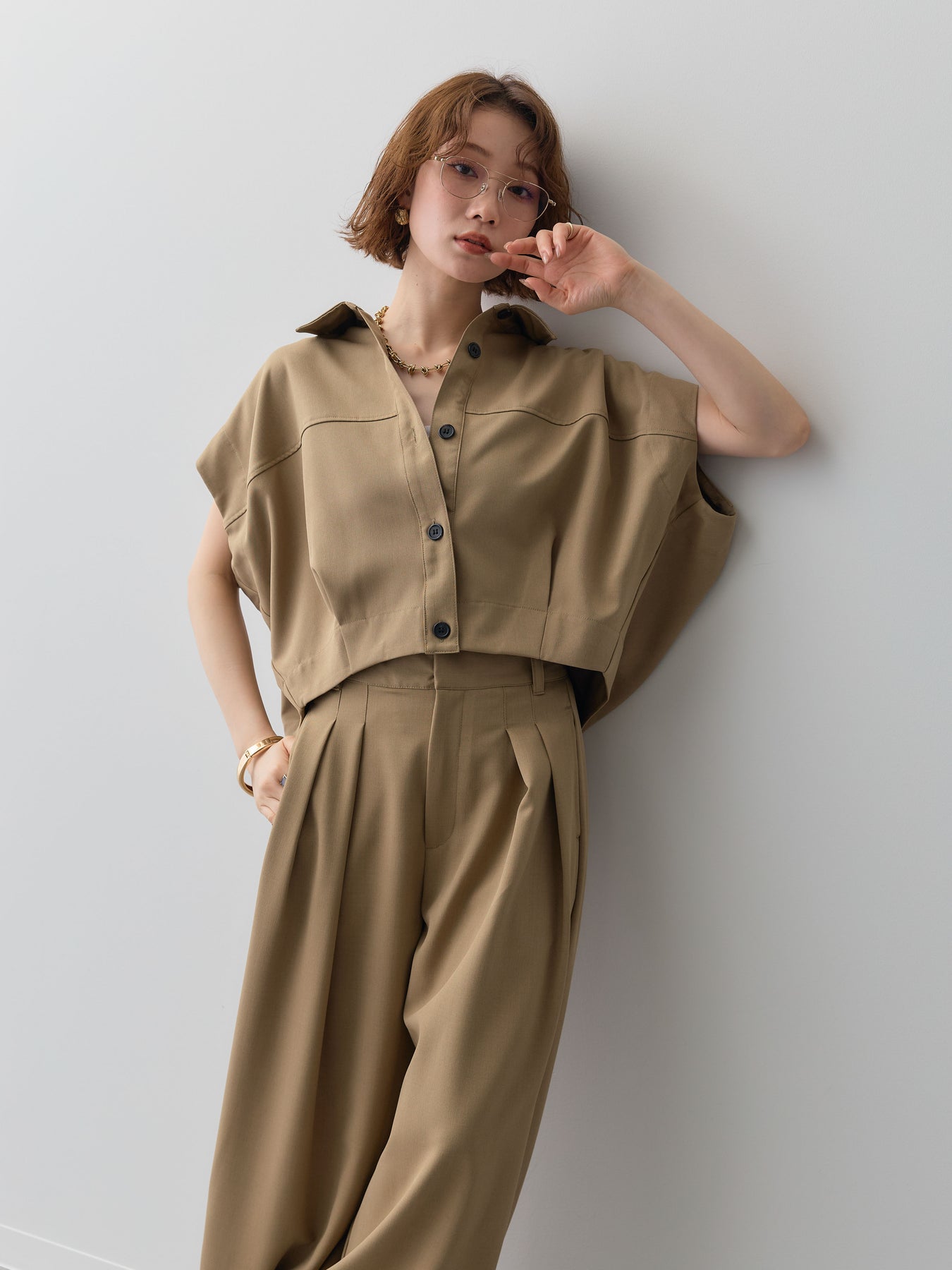 【套裝】縐綢燈籠無袖襯衫 + 縐綢闊腿褲(兩件套)