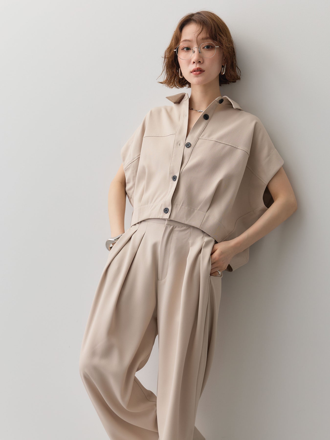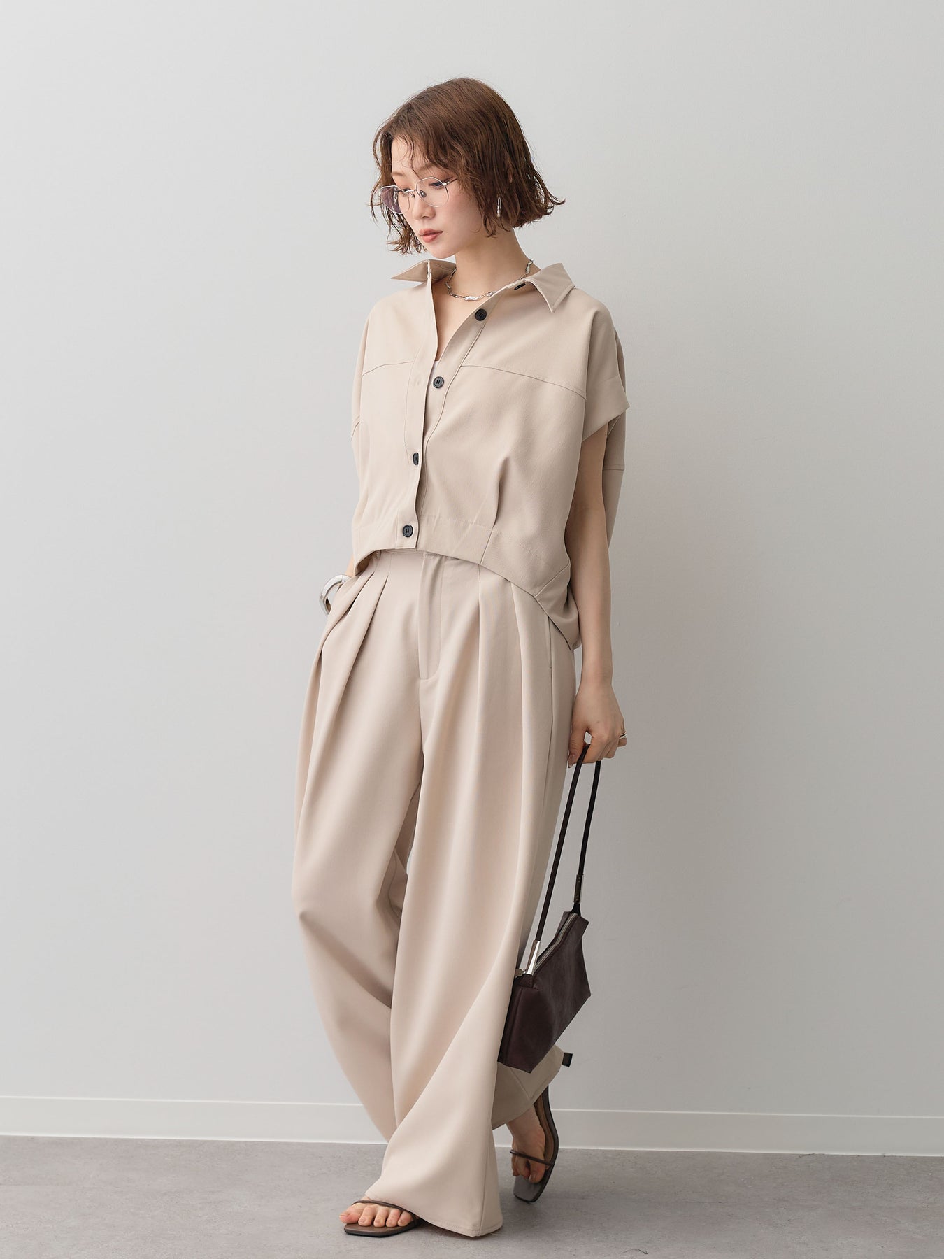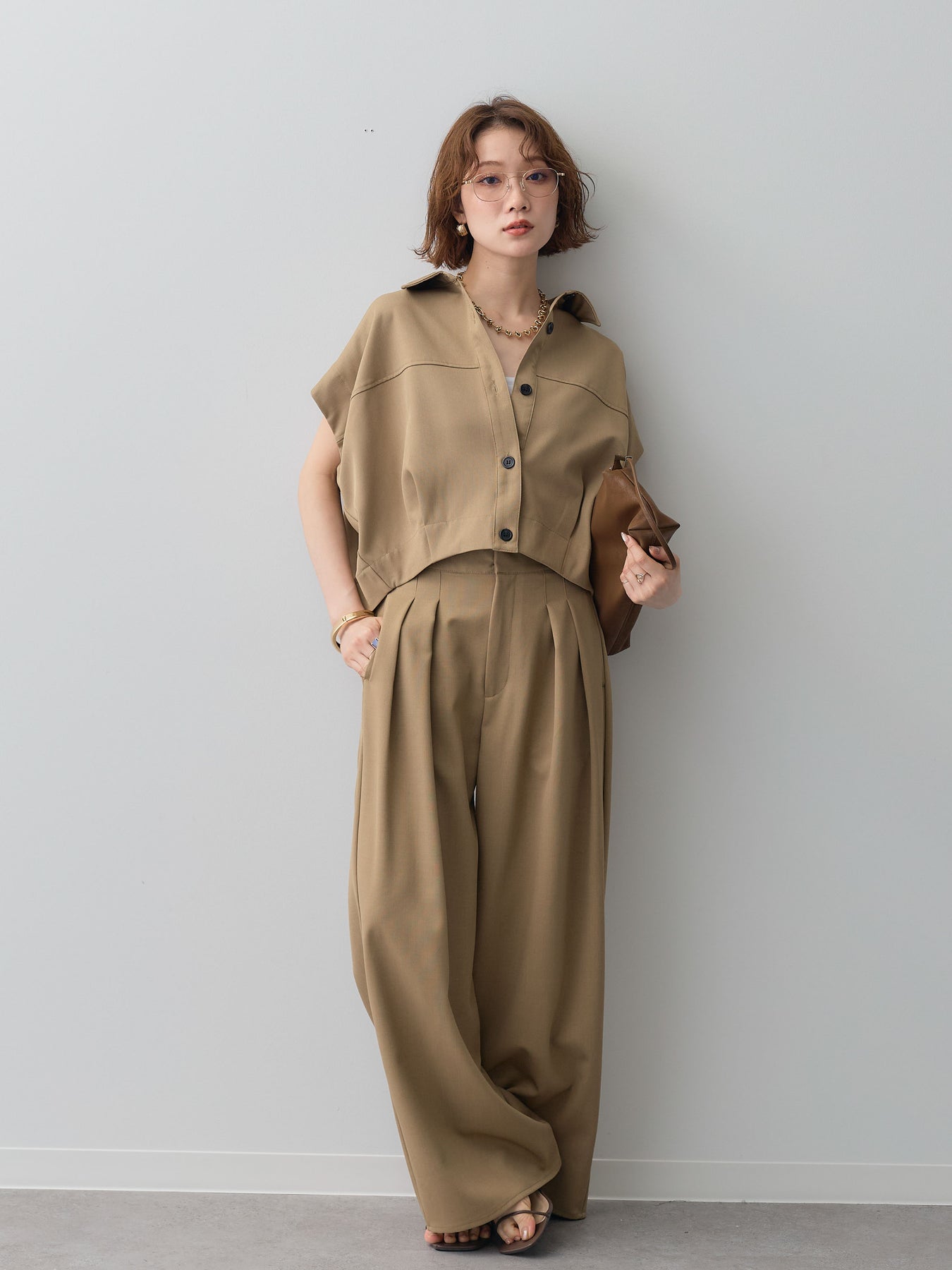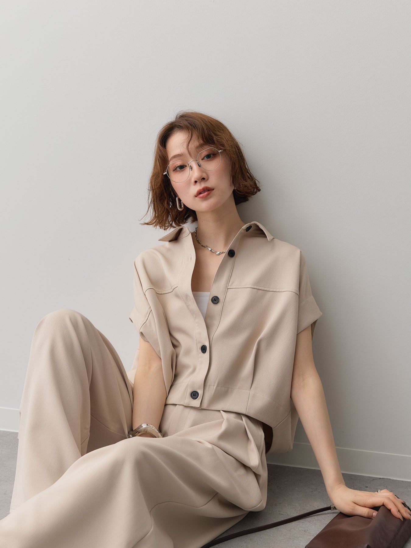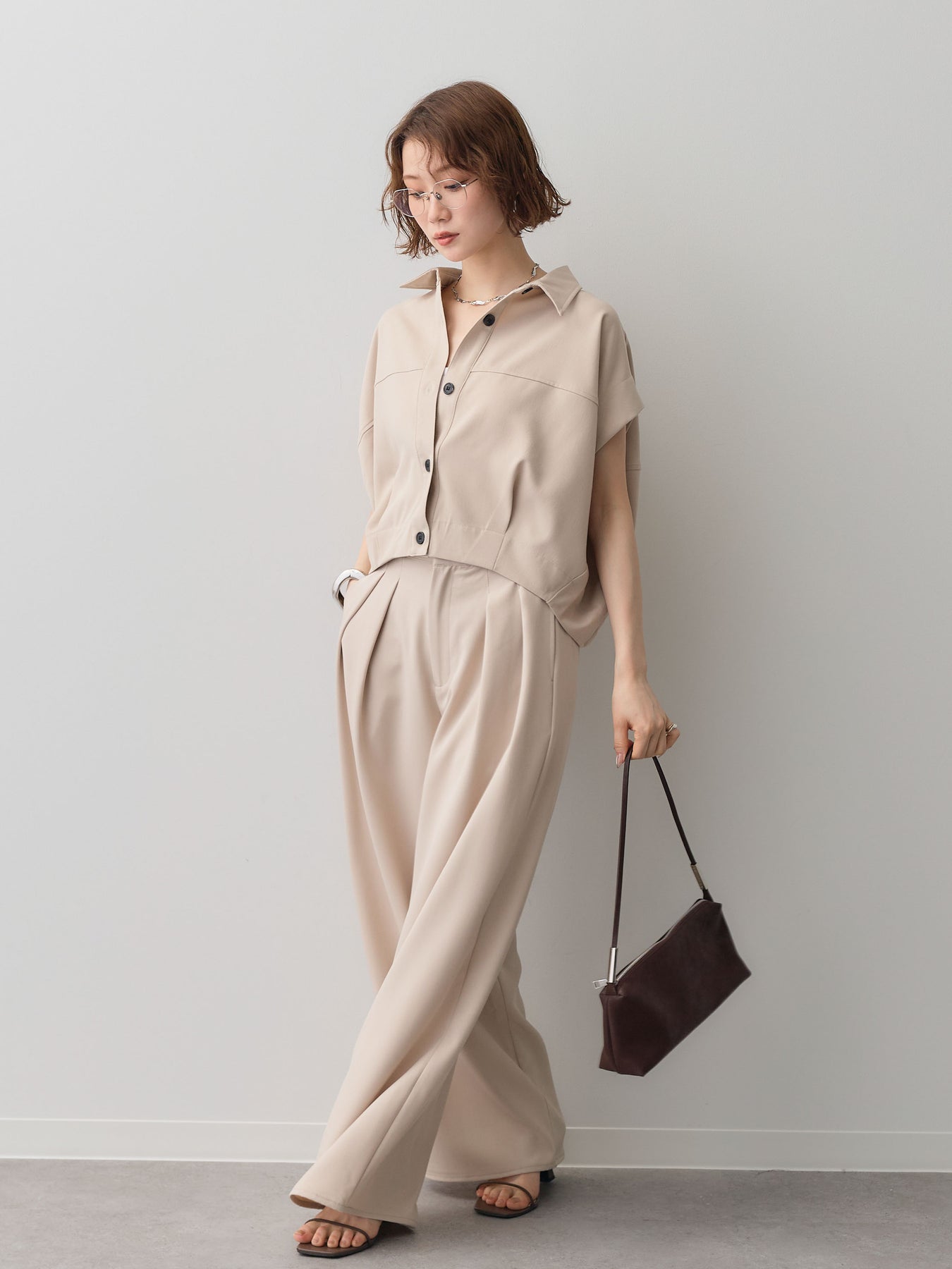 【套裝】縐綢燈籠無袖襯衫 + 縐綢闊腿褲(兩件套)