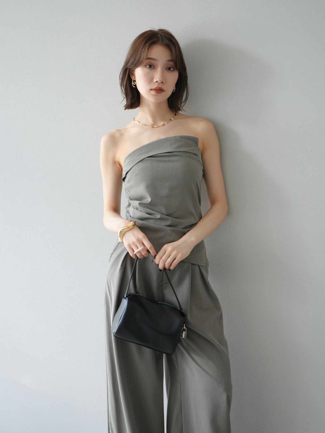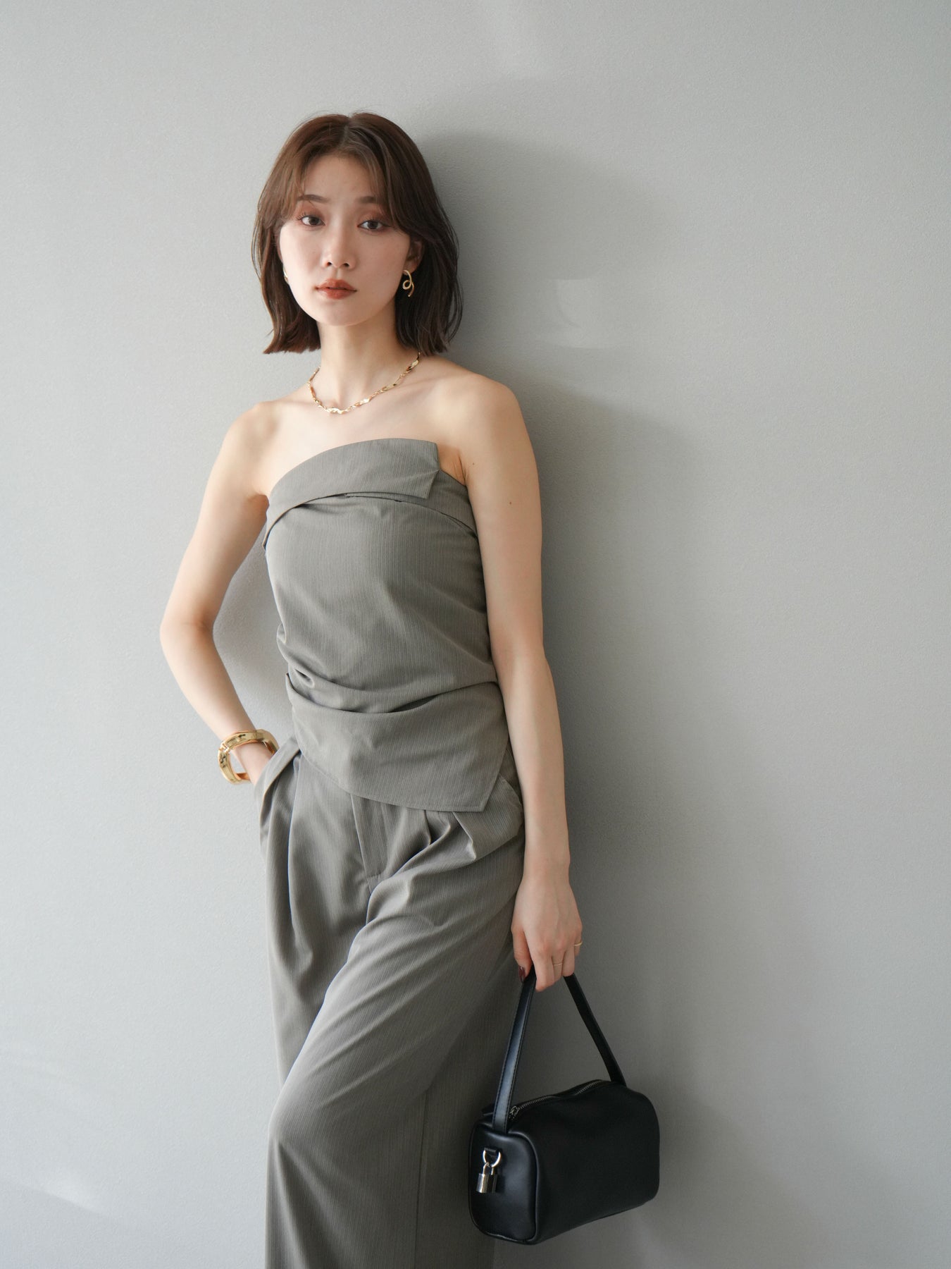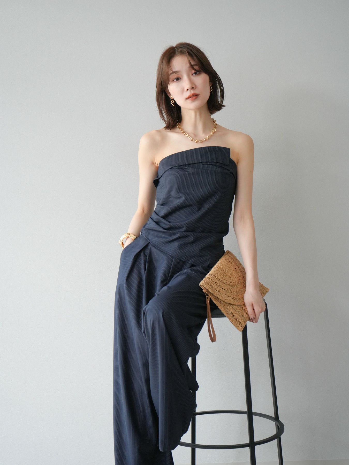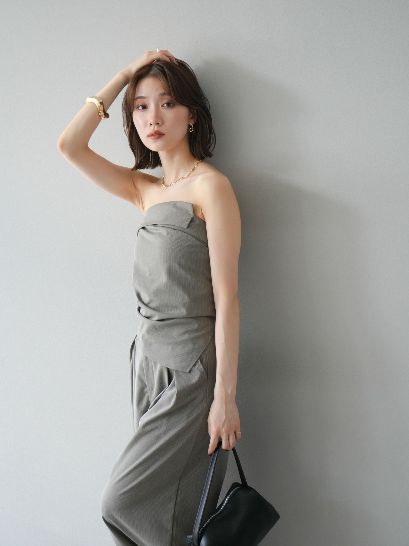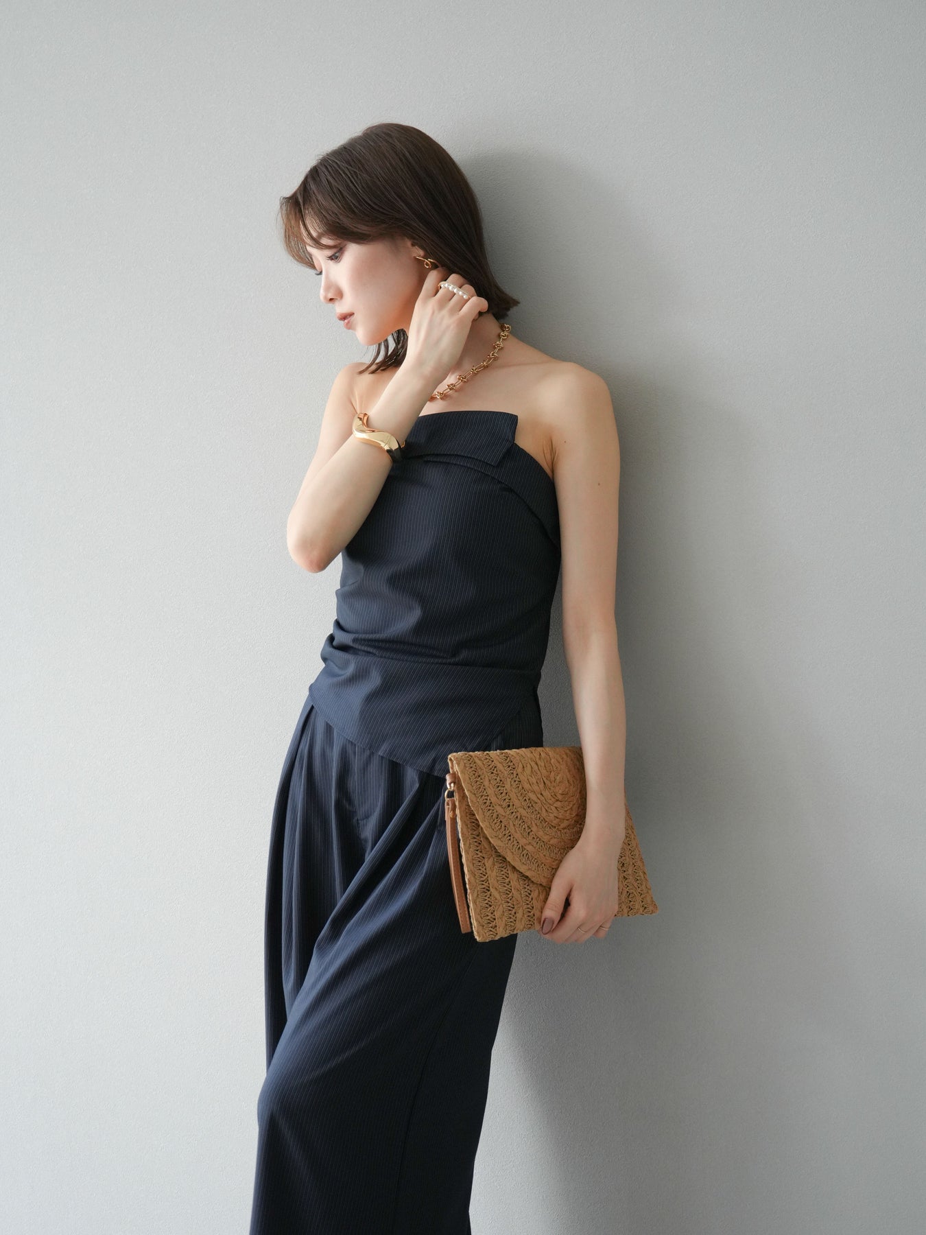 吊帶上衣和細條紋寬褲的套裝,給人一種時尚的感覺。 上衣採用不對稱設計,帶有對角線褶皺,增添了現代感。 它創造了一種貼合身體線條的輪廓,同時使胸部和腰部看起來乾淨利落。 褲子款式寬大,前面有褶襉,設計百搭,既可以作為套裝的一部分穿,也可以單獨穿著。 光滑且富有彈性的布料穿著極為舒適。這款精緻的套裝將與您的夏季成人服裝完美搭配。 ※除下裝、吊帶背心(內衣)以外的商品均不含內衣。