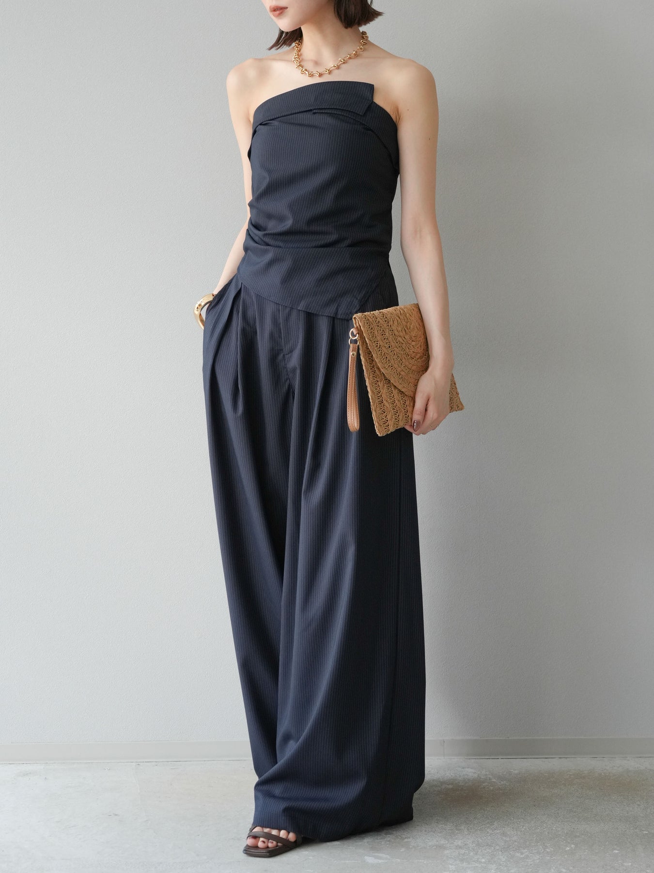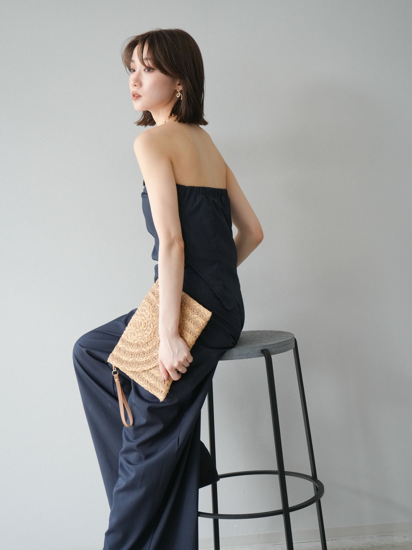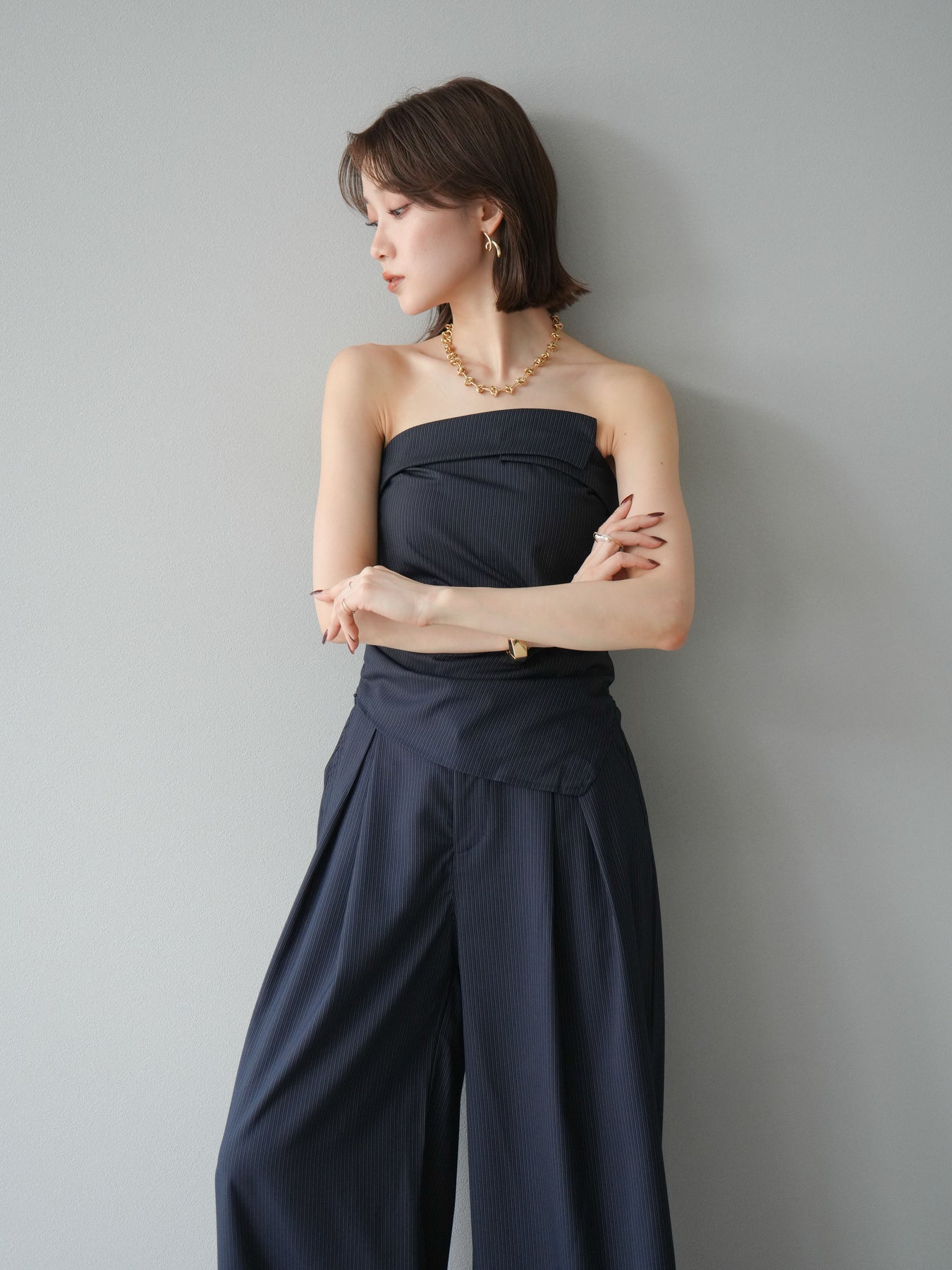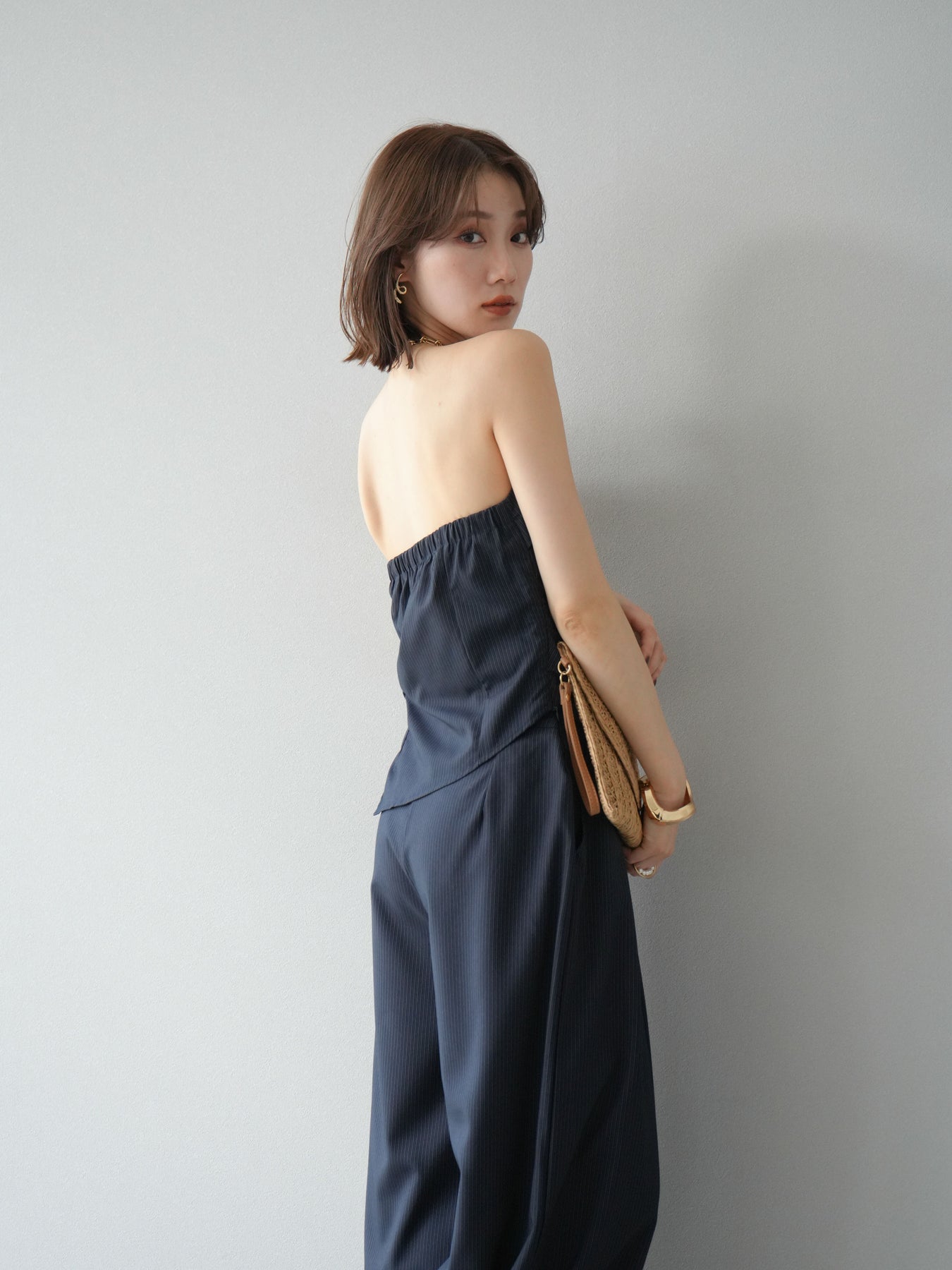 吊帶上衣和細條紋寬褲的套裝,給人一種時尚的感覺。 上衣採用不對稱設計,帶有對角線褶皺,增添了現代感。 它創造了一種貼合身體線條的輪廓,同時使胸部和腰部看起來乾淨利落。 褲子款式寬大,前面有褶襉,設計百搭,既可以作為套裝的一部分穿,也可以單獨穿著。 光滑且富有彈性的布料穿著極為舒適。這款精緻的套裝將與您的夏季成人服裝完美搭配。 ※除下裝、吊帶背心(內衣)以外的商品均不含內衣。
