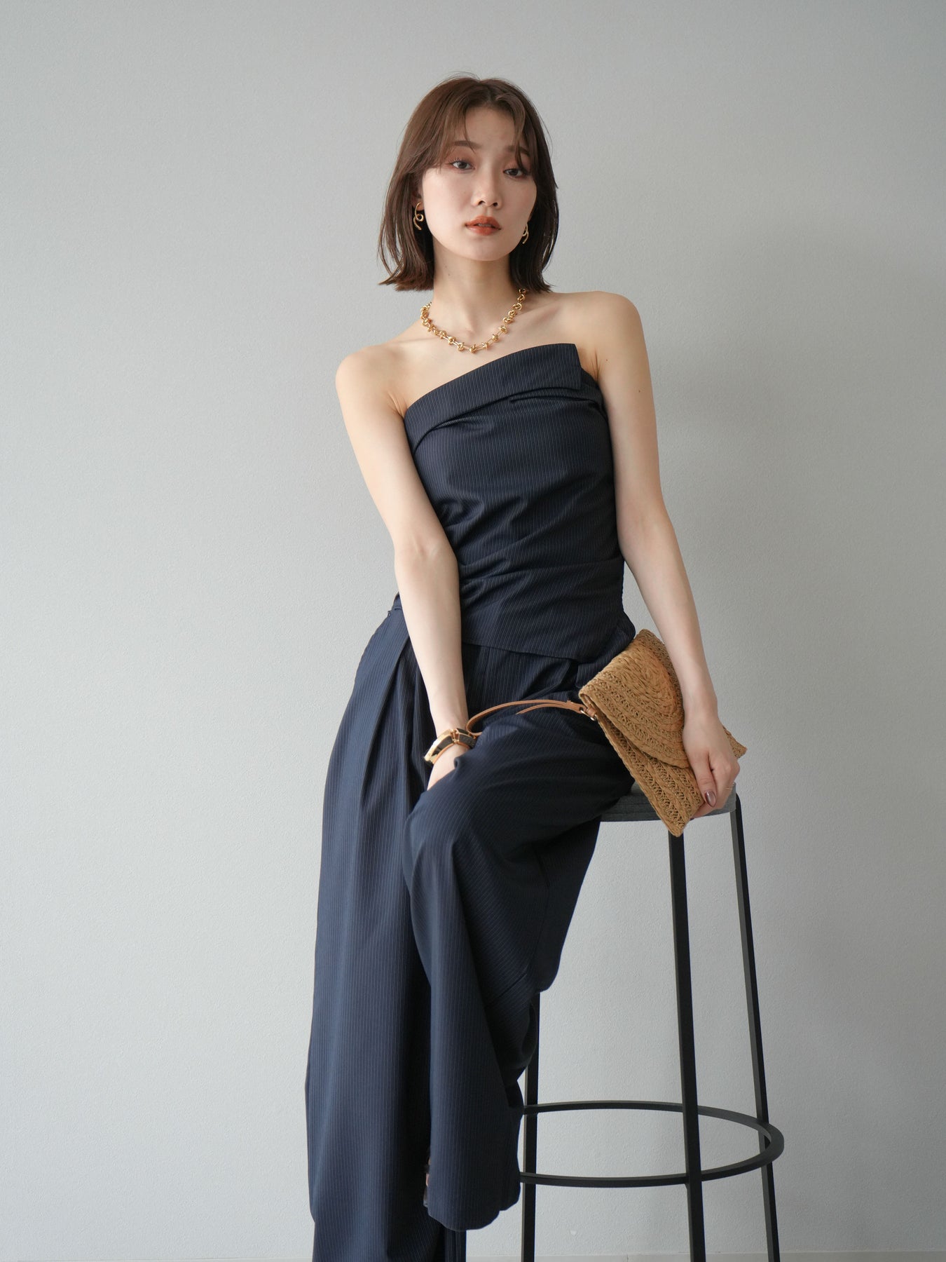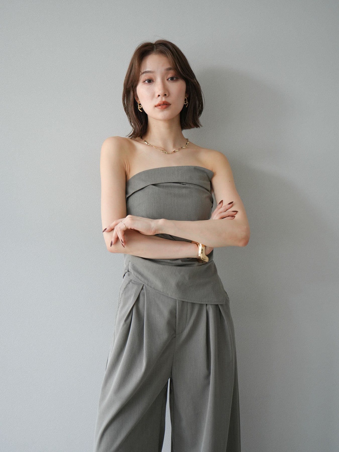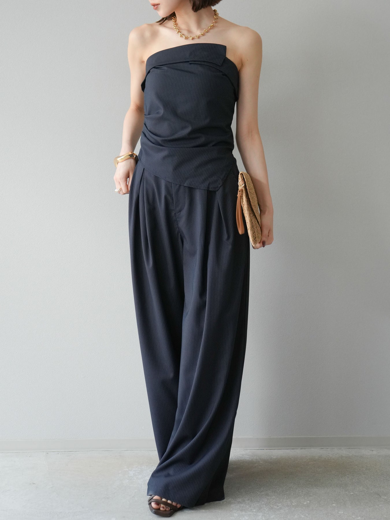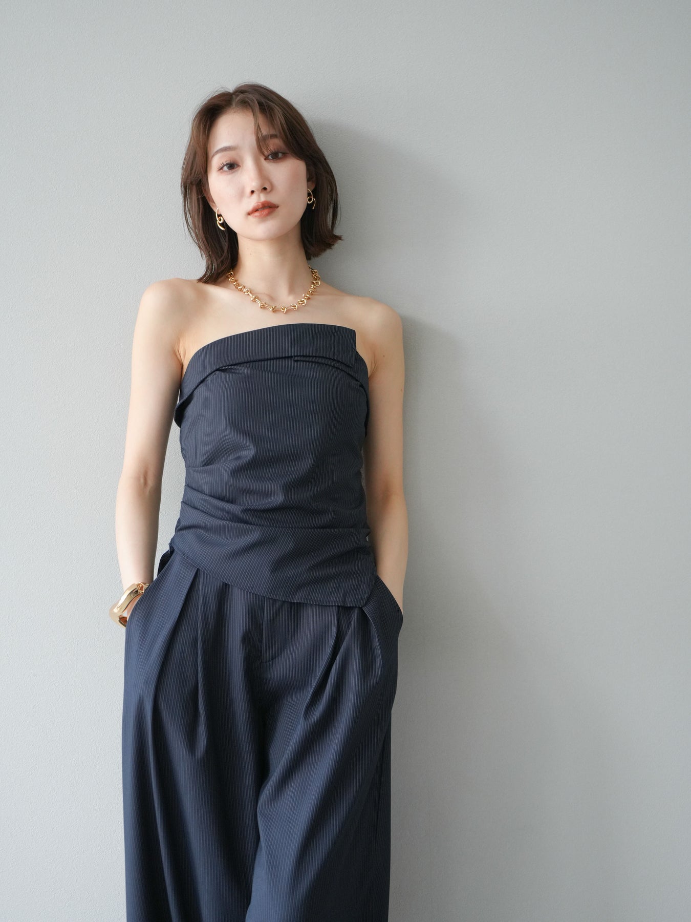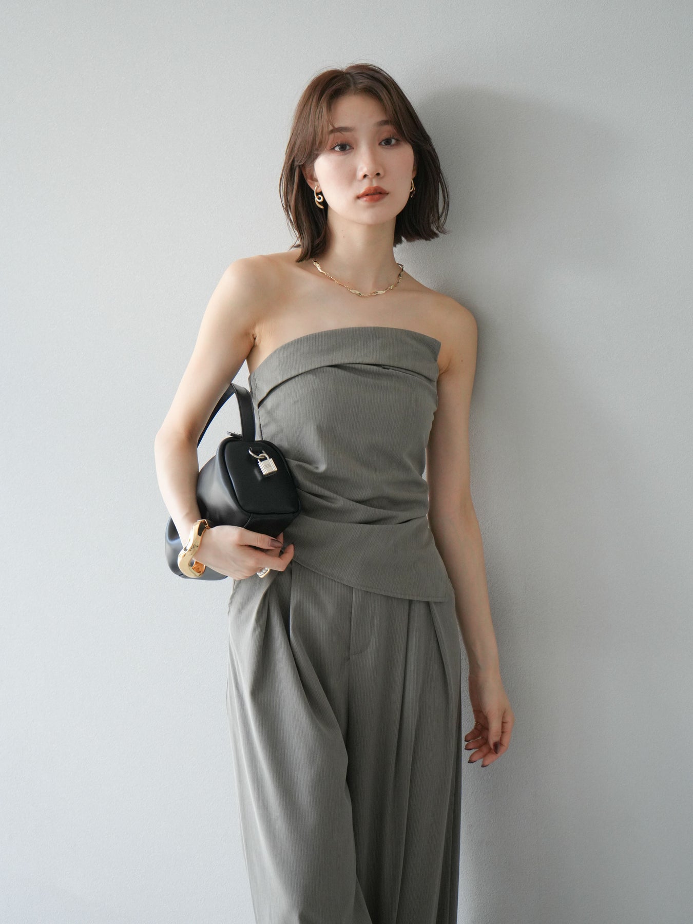 吊帶上衣和細條紋寬褲的套裝,給人一種時尚的感覺。 上衣採用不對稱設計,帶有對角線褶皺,增添了現代感。 它創造了一種貼合身體線條的輪廓,同時使胸部和腰部看起來乾淨利落。 褲子款式寬大,前面有褶襉,設計百搭,既可以作為套裝的一部分穿,也可以單獨穿著。 光滑且富有彈性的布料穿著極為舒適。這款精緻的套裝將與您的夏季成人服裝完美搭配。 ※除下裝、吊帶背心(內衣)以外的商品均不含內衣。