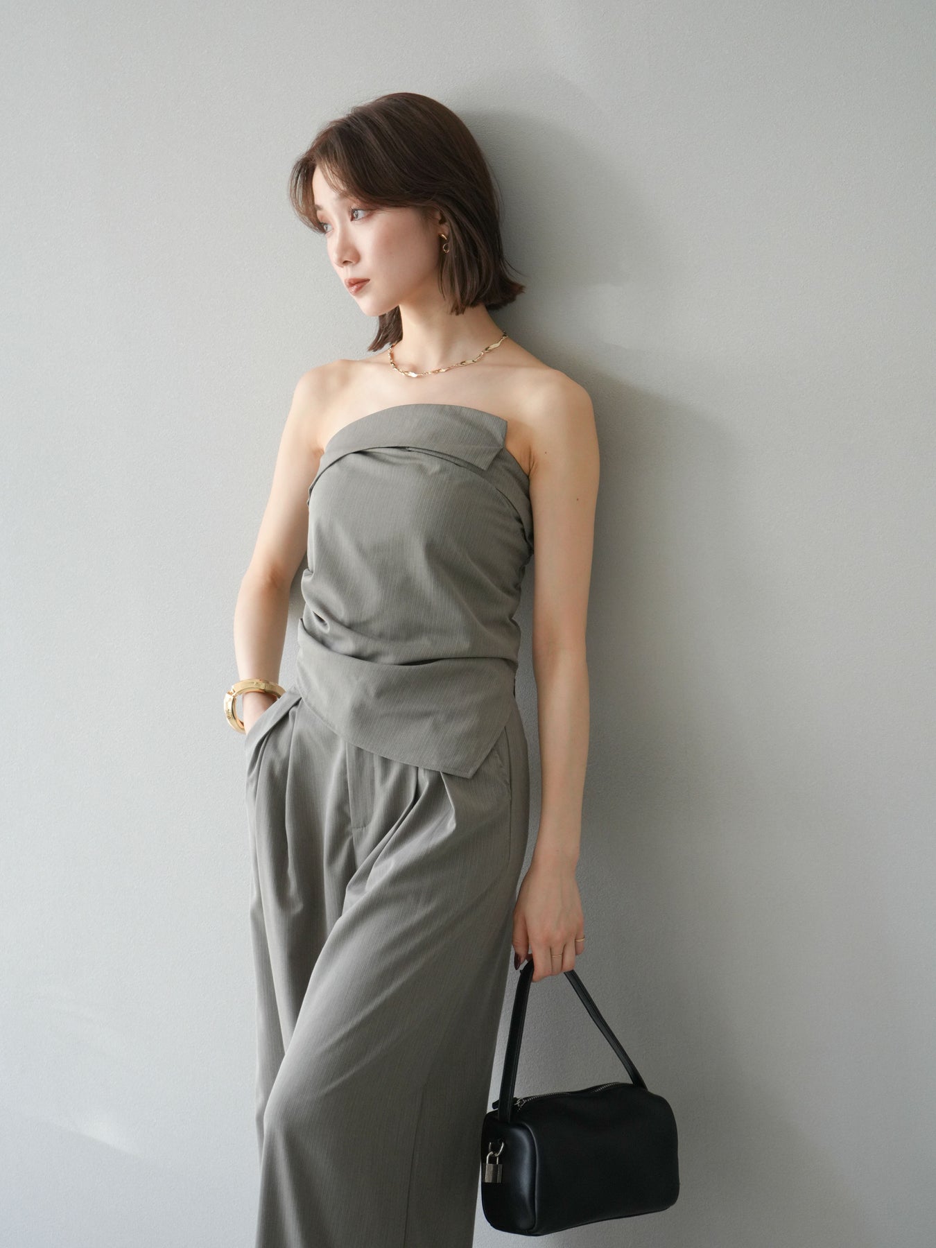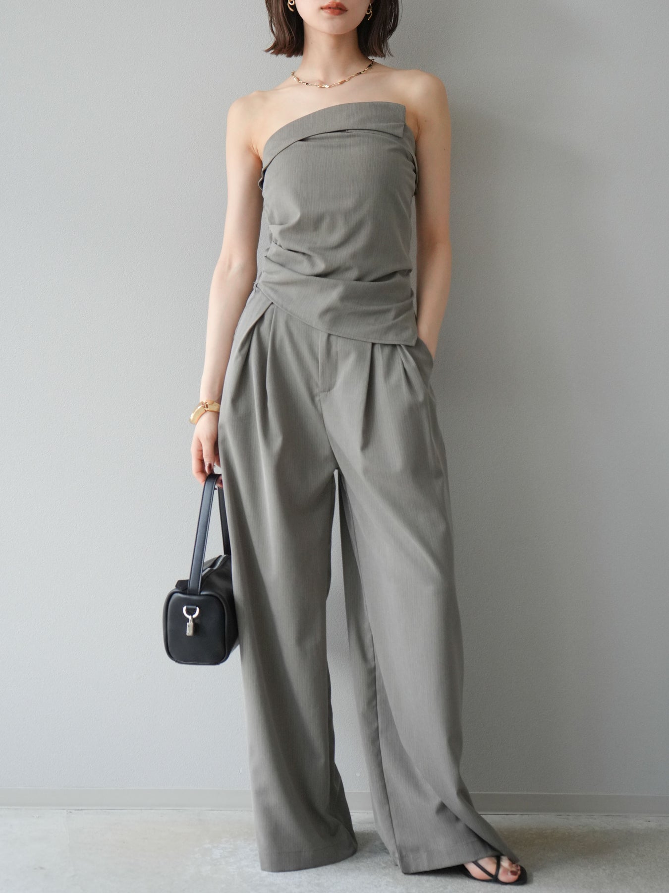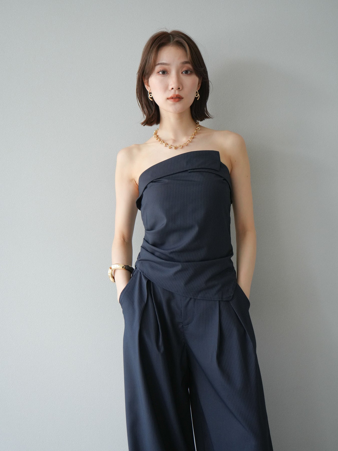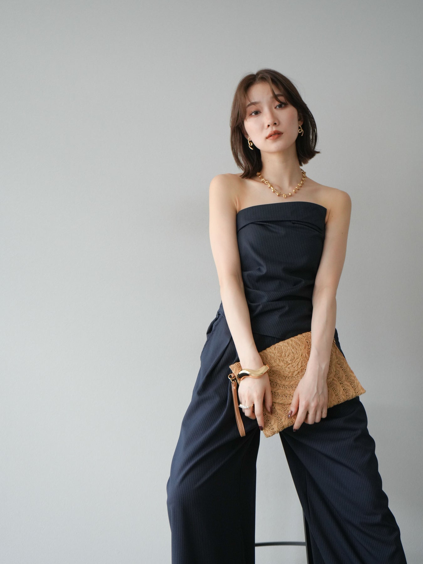 吊帶上衣和細條紋寬褲的套裝,給人一種時尚的感覺。 上衣採用不對稱設計,帶有對角線褶皺,增添了現代感。 它創造了一種貼合身體線條的輪廓,同時使胸部和腰部看起來乾淨利落。 褲子款式寬大,前面有褶襉,設計百搭,既可以作為套裝的一部分穿,也可以單獨穿著。 光滑且富有彈性的布料穿著極為舒適。這款精緻的套裝將與您的夏季成人服裝完美搭配。 ※除下裝、吊帶背心(內衣)以外的商品均不含內衣。