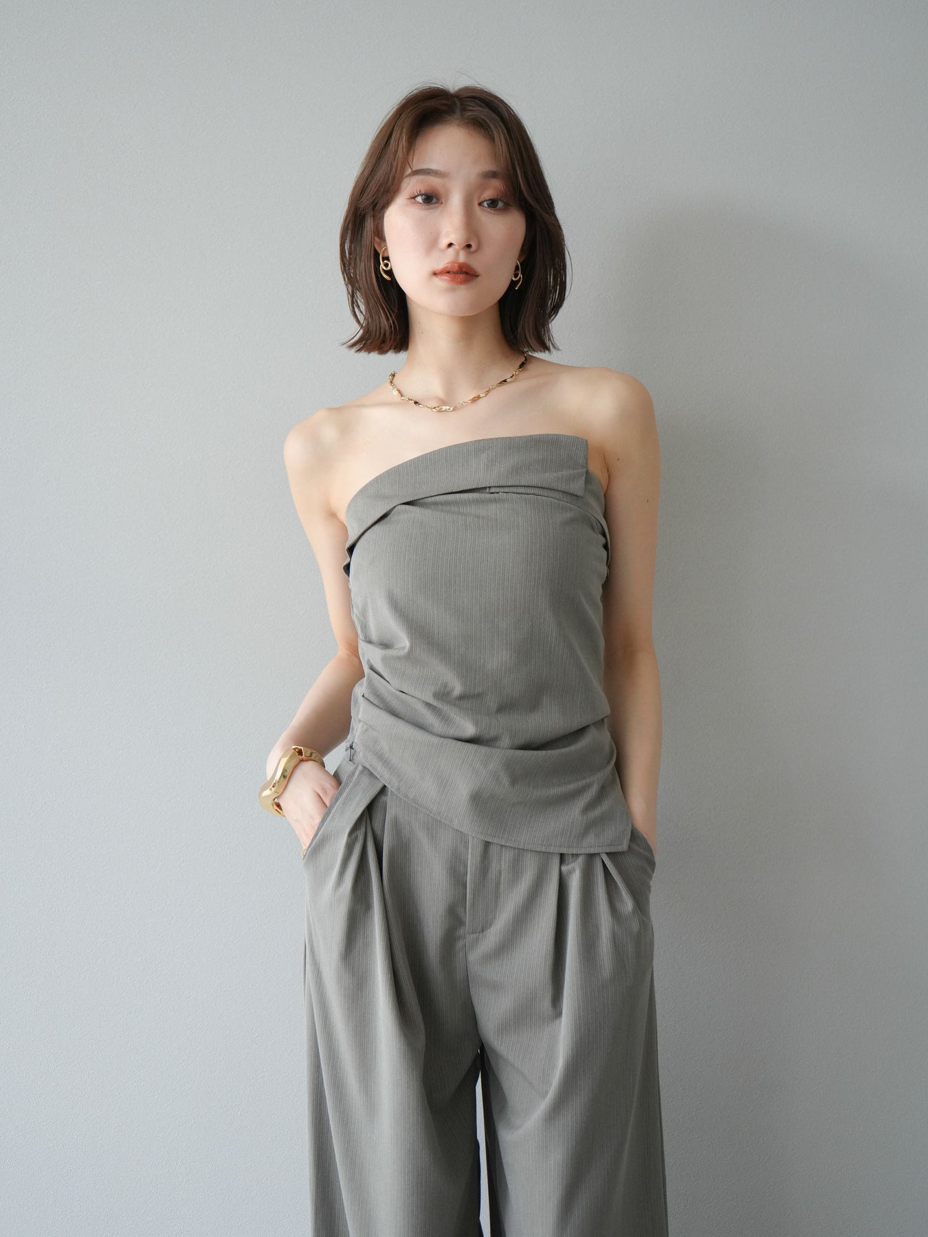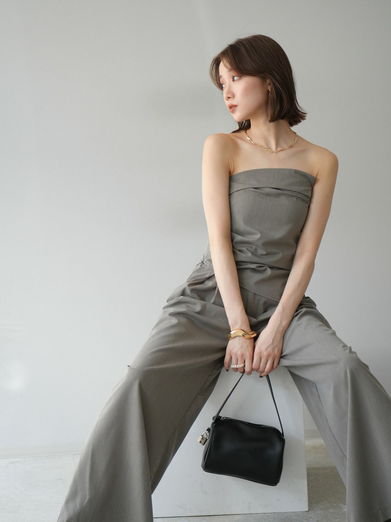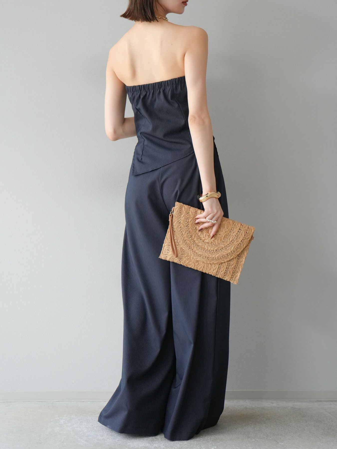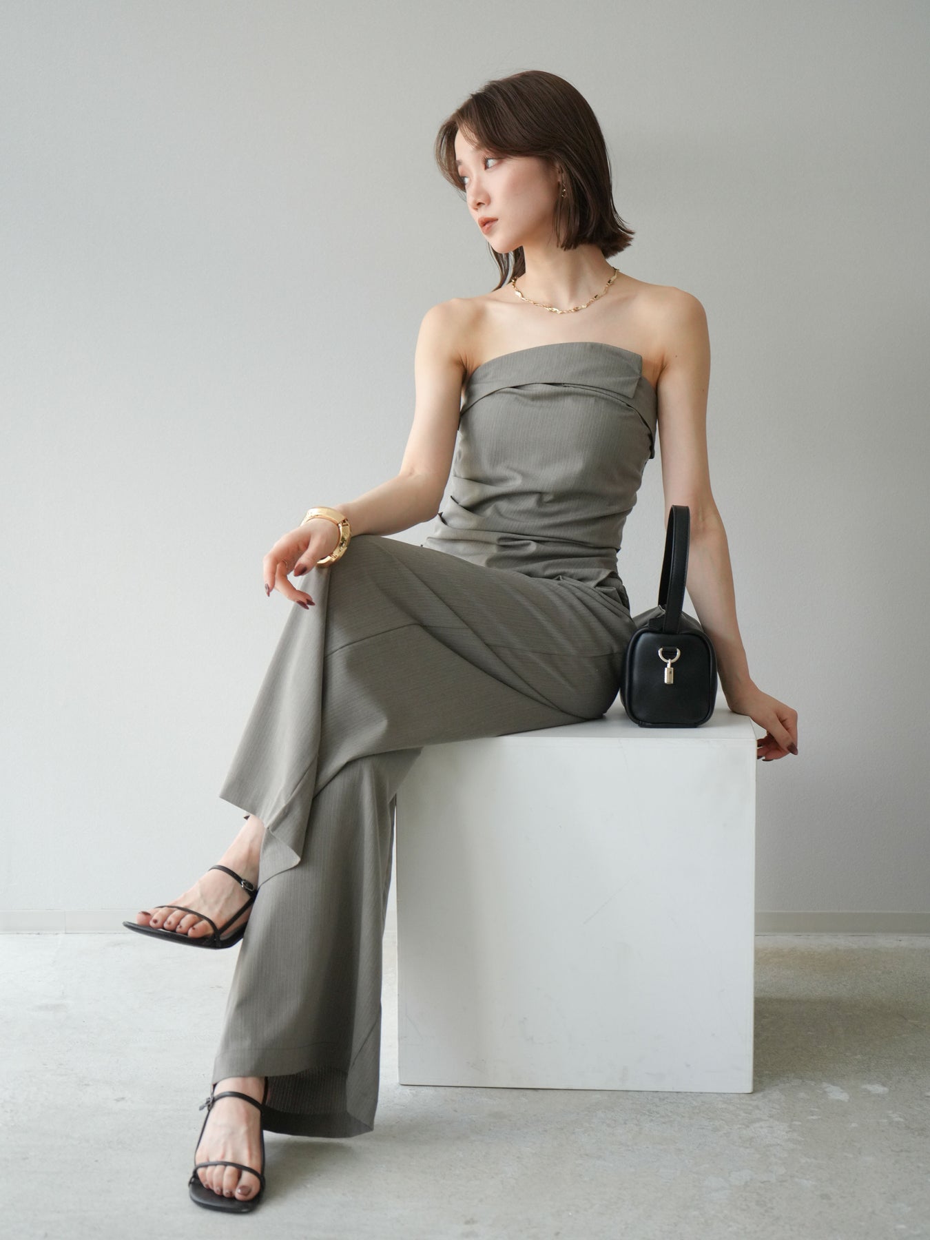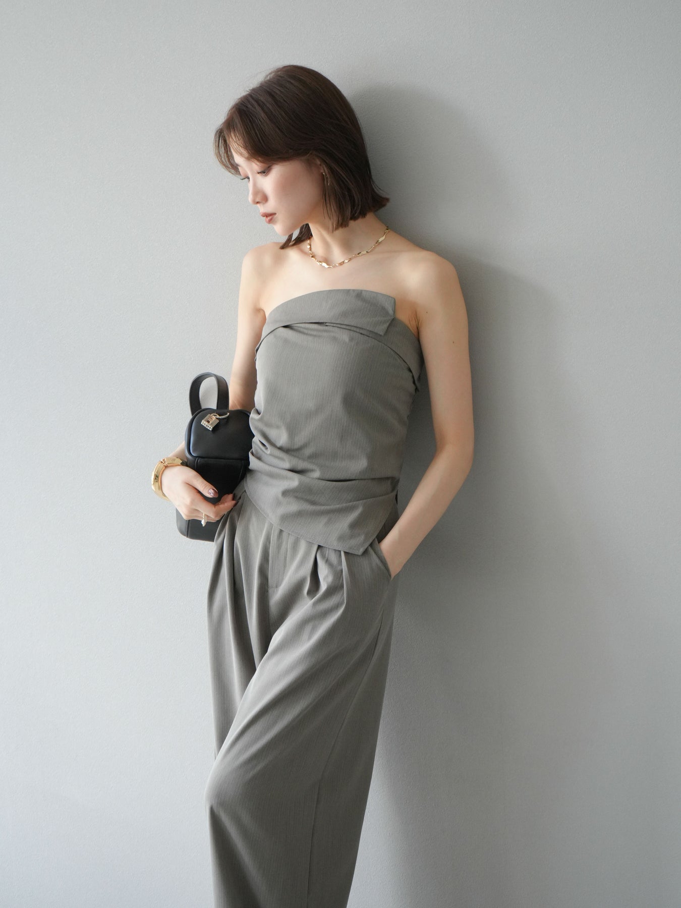 吊帶上衣和細條紋寬褲的套裝,給人一種時尚的感覺。 上衣採用不對稱設計,帶有對角線褶皺,增添了現代感。 它創造了一種貼合身體線條的輪廓,同時使胸部和腰部看起來乾淨利落。 褲子款式寬大,前面有褶襉,設計百搭,既可以作為套裝的一部分穿,也可以單獨穿著。 光滑且富有彈性的布料穿著極為舒適。這款精緻的套裝將與您的夏季成人服裝完美搭配。 ※除下裝、吊帶背心(內衣)以外的商品均不含內衣。