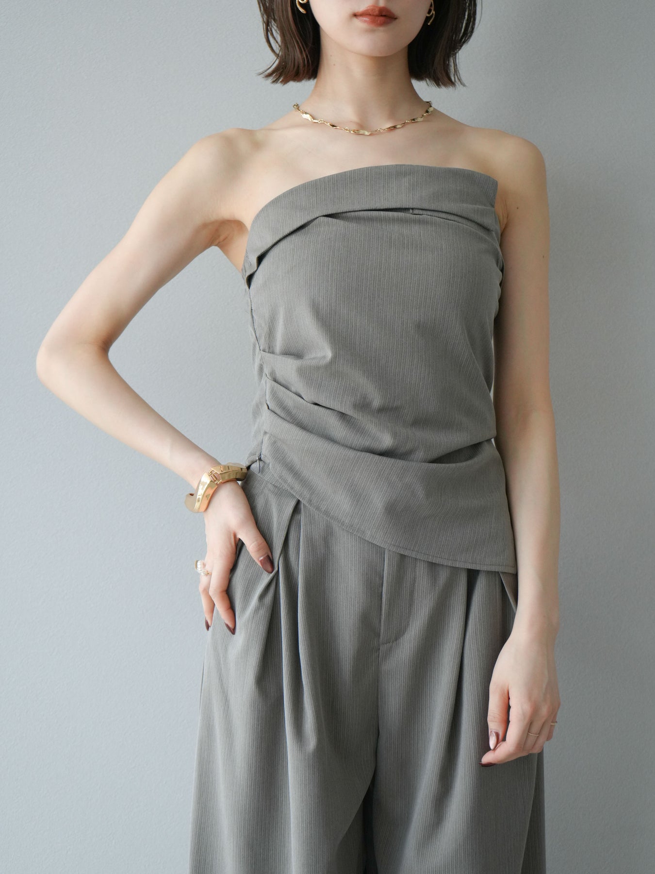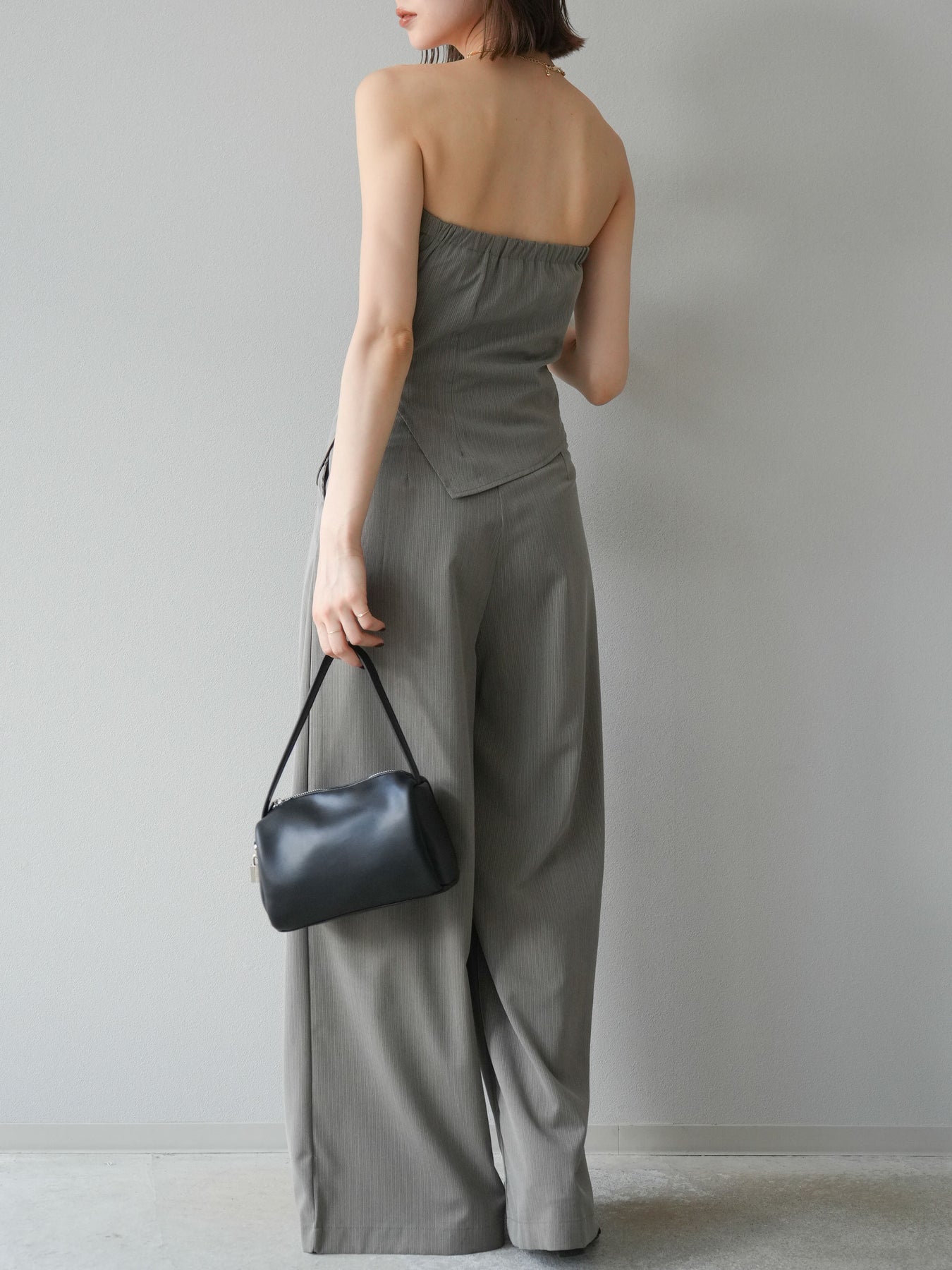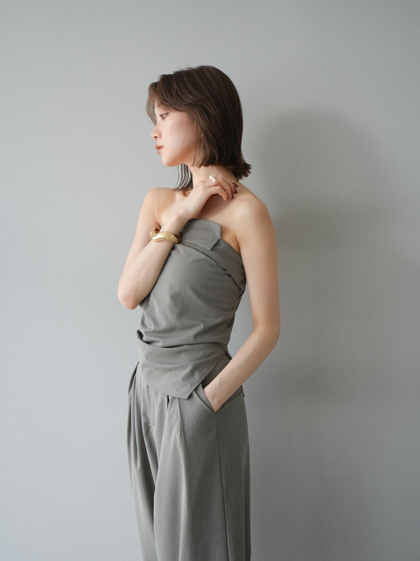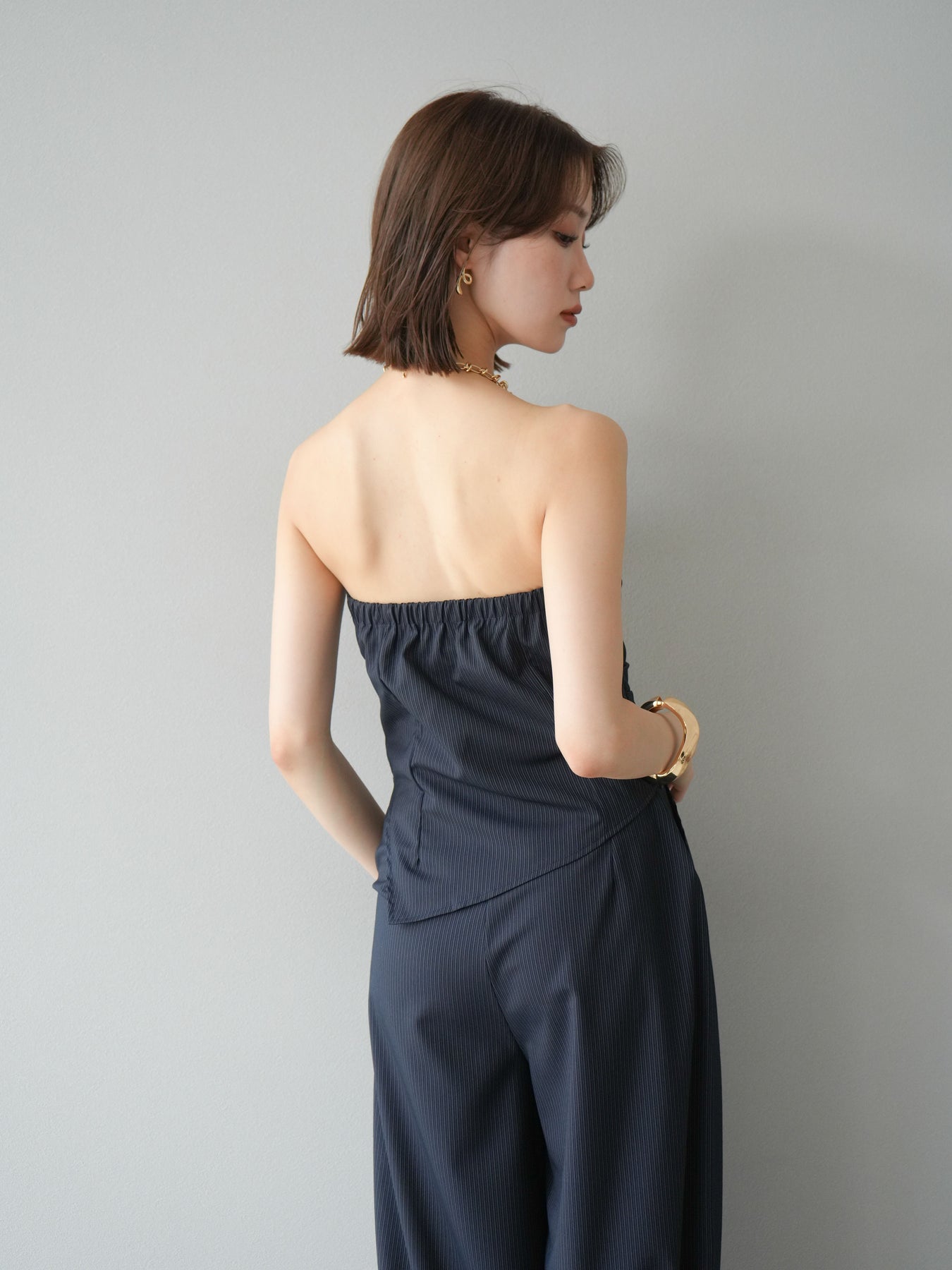吊帶上衣和細條紋寬褲的套裝,給人一種時尚的感覺。 上衣採用不對稱設計,帶有對角線褶皺,增添了現代感。 它創造了一種貼合身體線條的輪廓,同時使胸部和腰部看起來乾淨利落。 褲子款式寬大,前面有褶襉,設計百搭,既可以作為套裝的一部分穿,也可以單獨穿著。 光滑且富有彈性的布料穿著極為舒適。這款精緻的套裝將與您的夏季成人服裝完美搭配。 ※除下裝、吊帶背心(內衣)以外的商品均不含內衣。