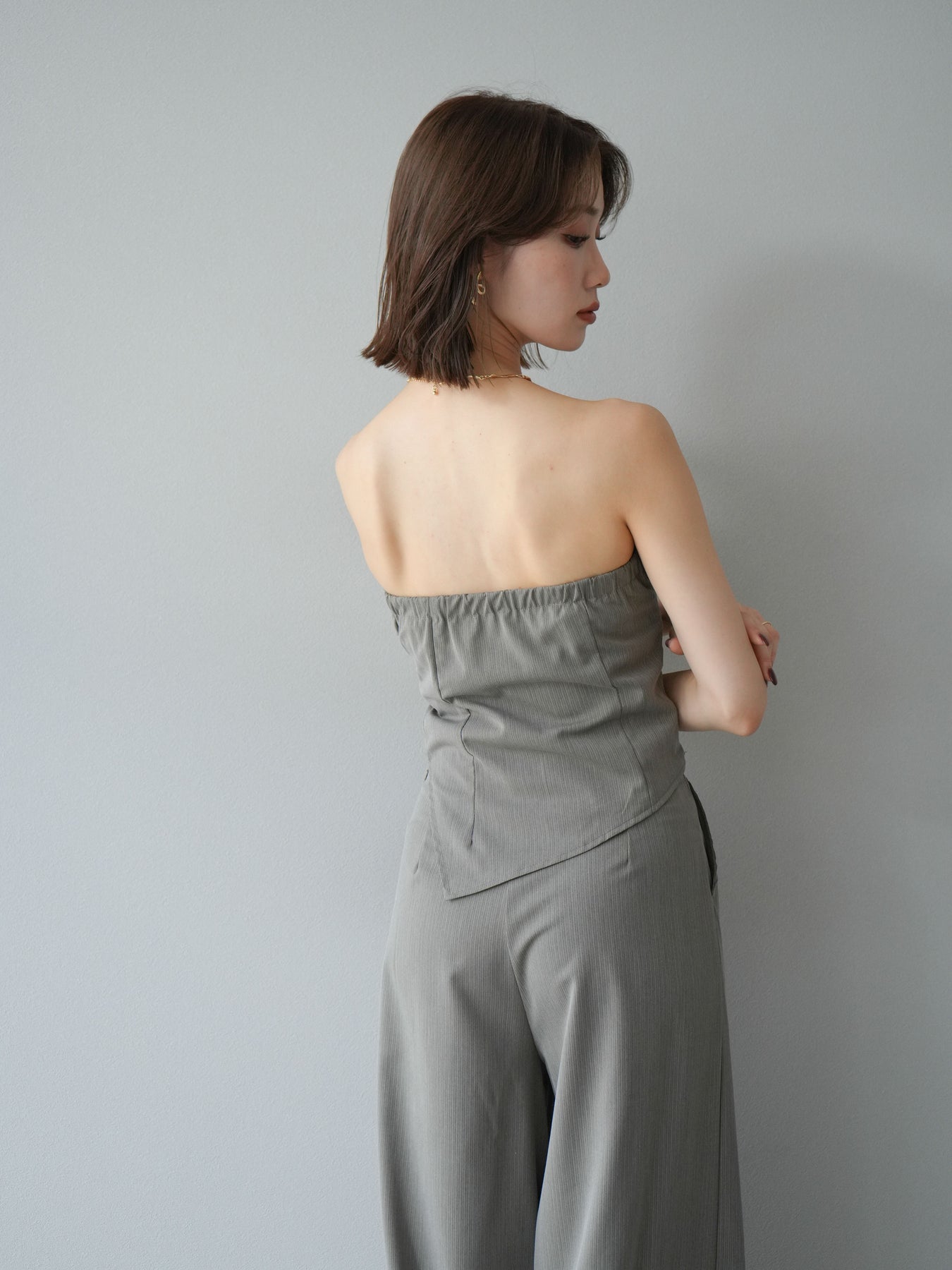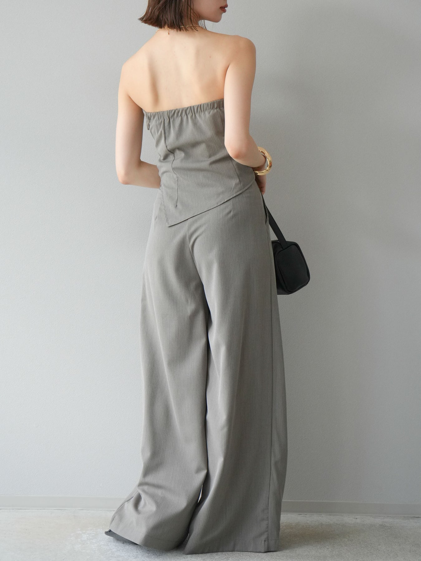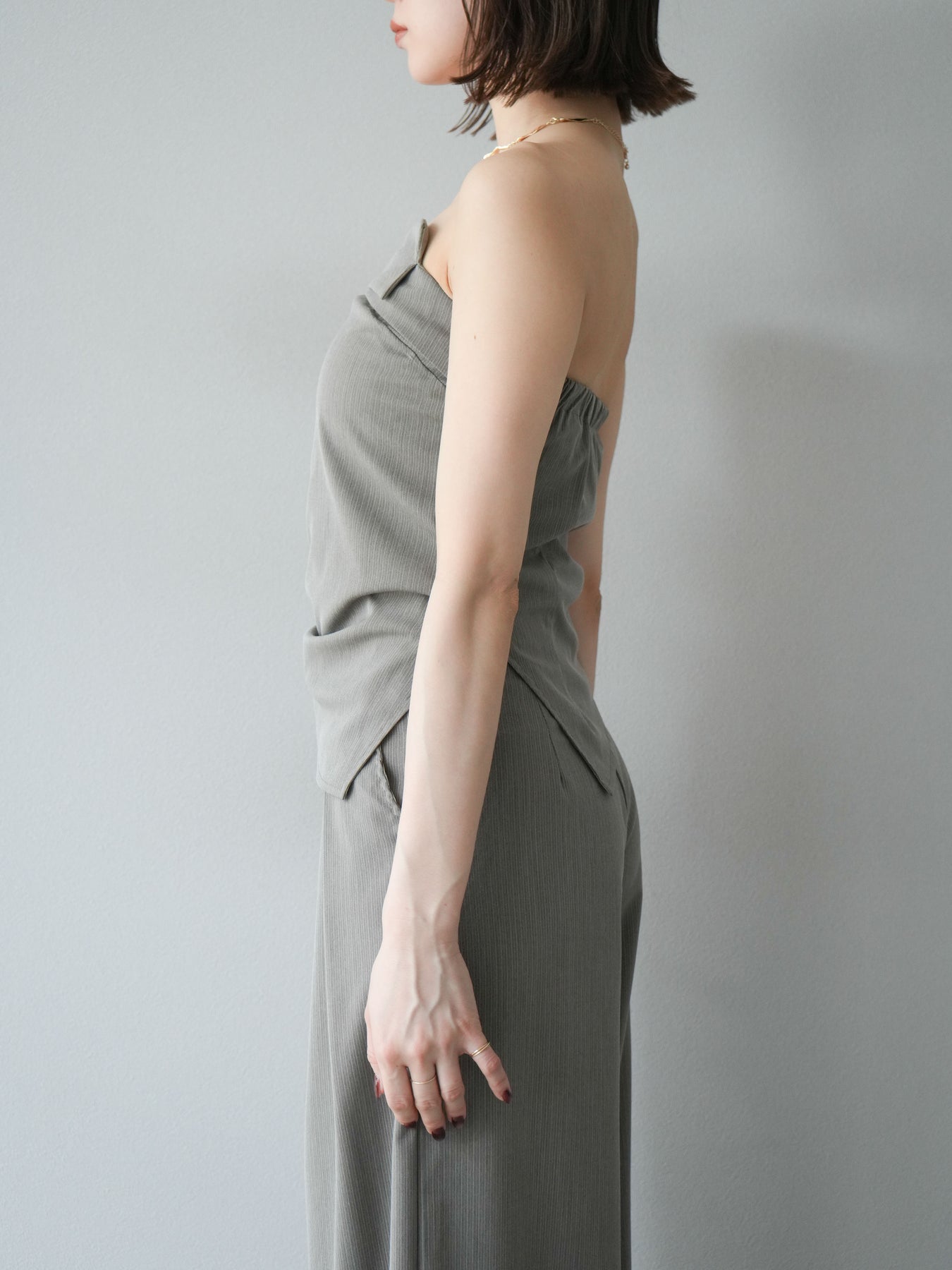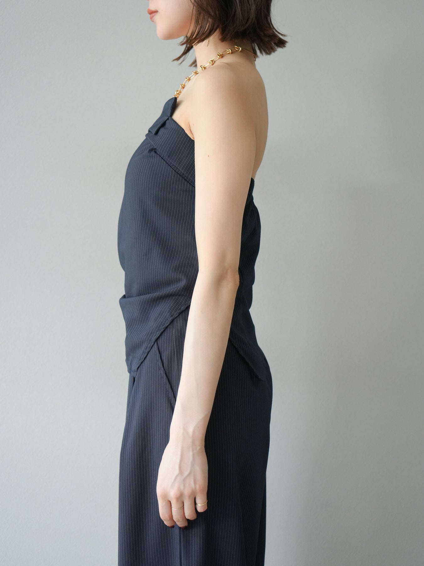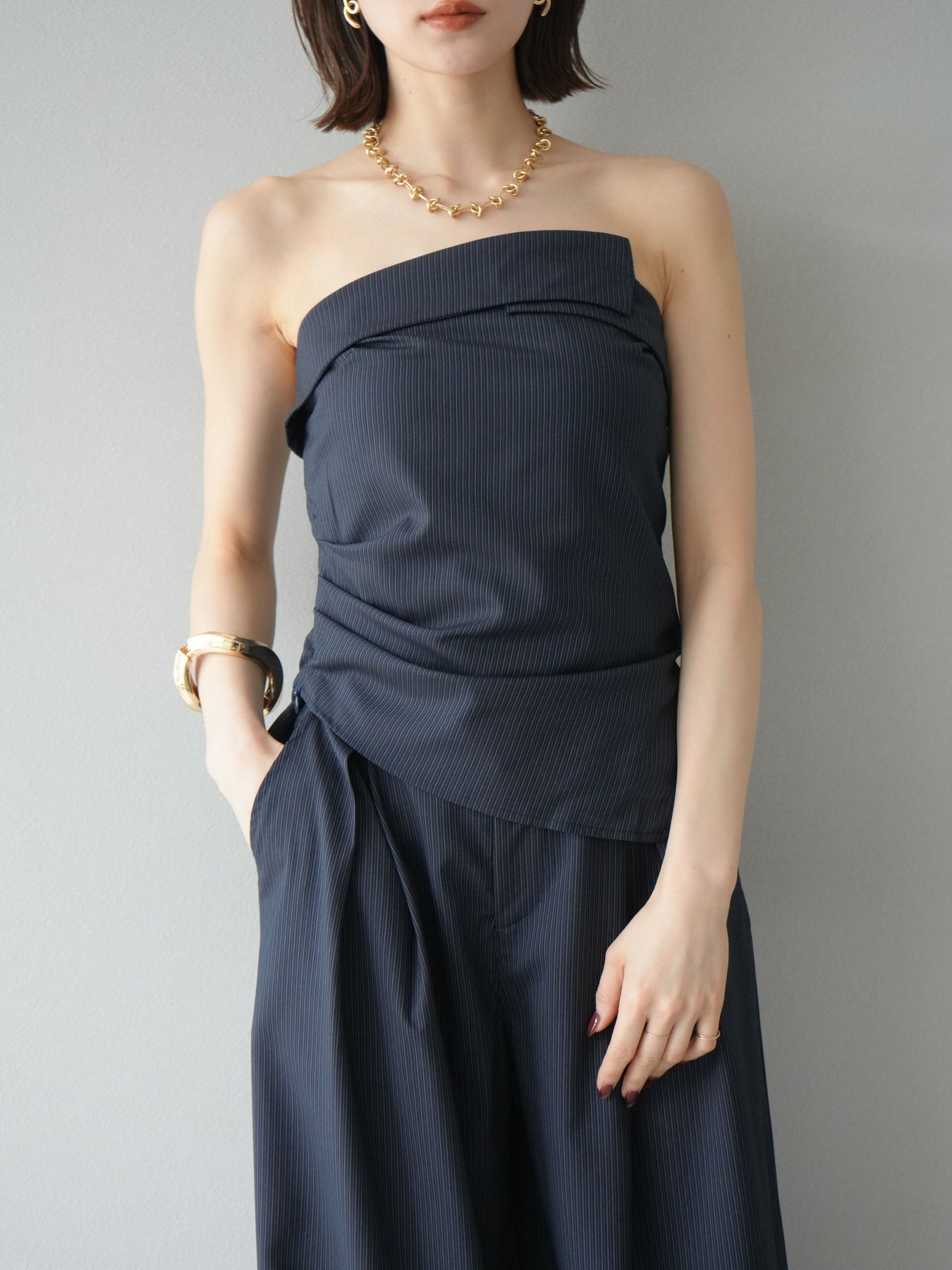 吊帶上衣和細條紋寬褲的套裝,給人一種時尚的感覺。 上衣採用不對稱設計,帶有對角線褶皺,增添了現代感。 它創造了一種貼合身體線條的輪廓,同時使胸部和腰部看起來乾淨利落。 褲子款式寬大,前面有褶襉,設計百搭,既可以作為套裝的一部分穿,也可以單獨穿著。 光滑且富有彈性的布料穿著極為舒適。這款精緻的套裝將與您的夏季成人服裝完美搭配。 ※除下裝、吊帶背心(內衣)以外的商品均不含內衣。