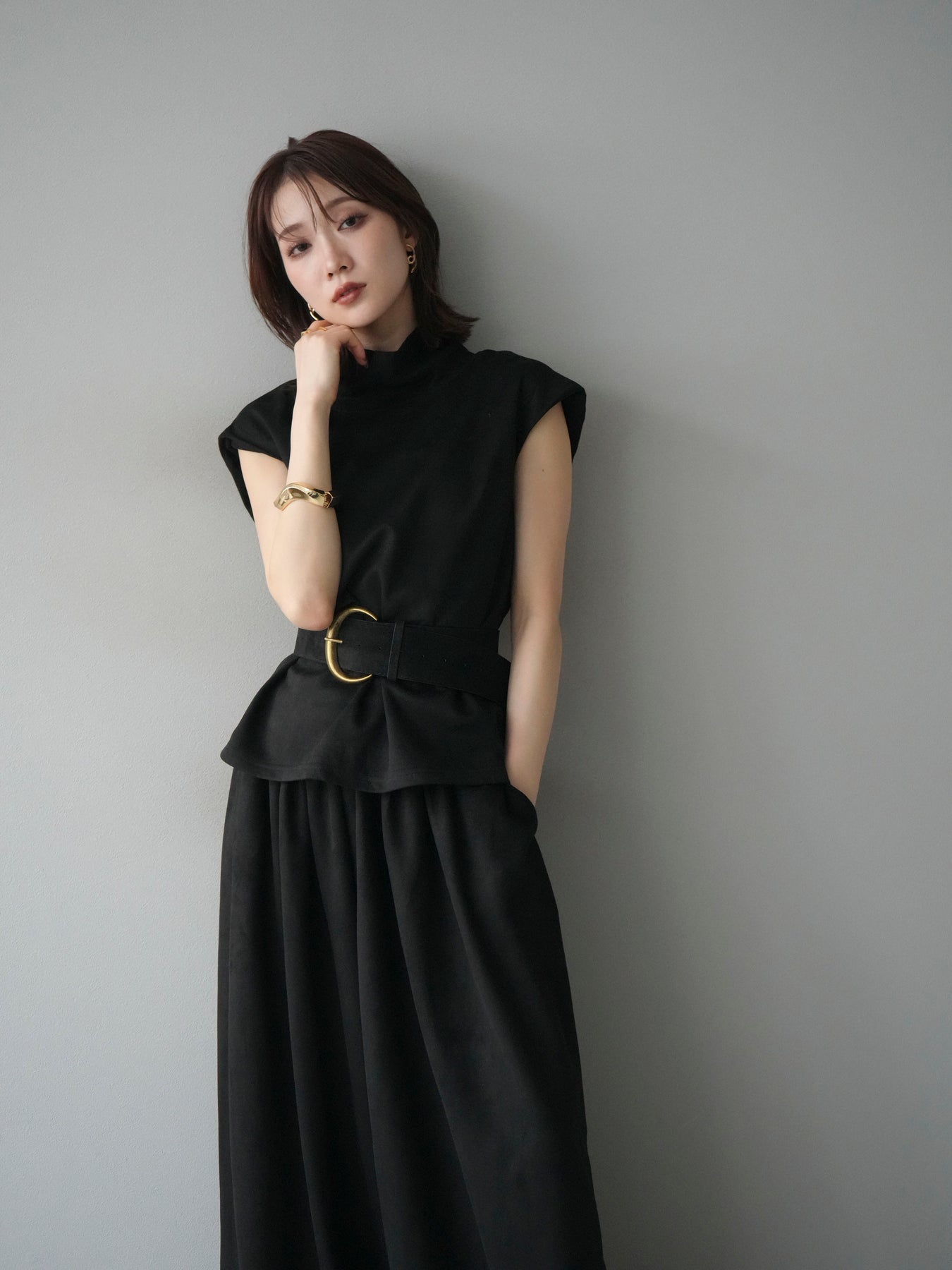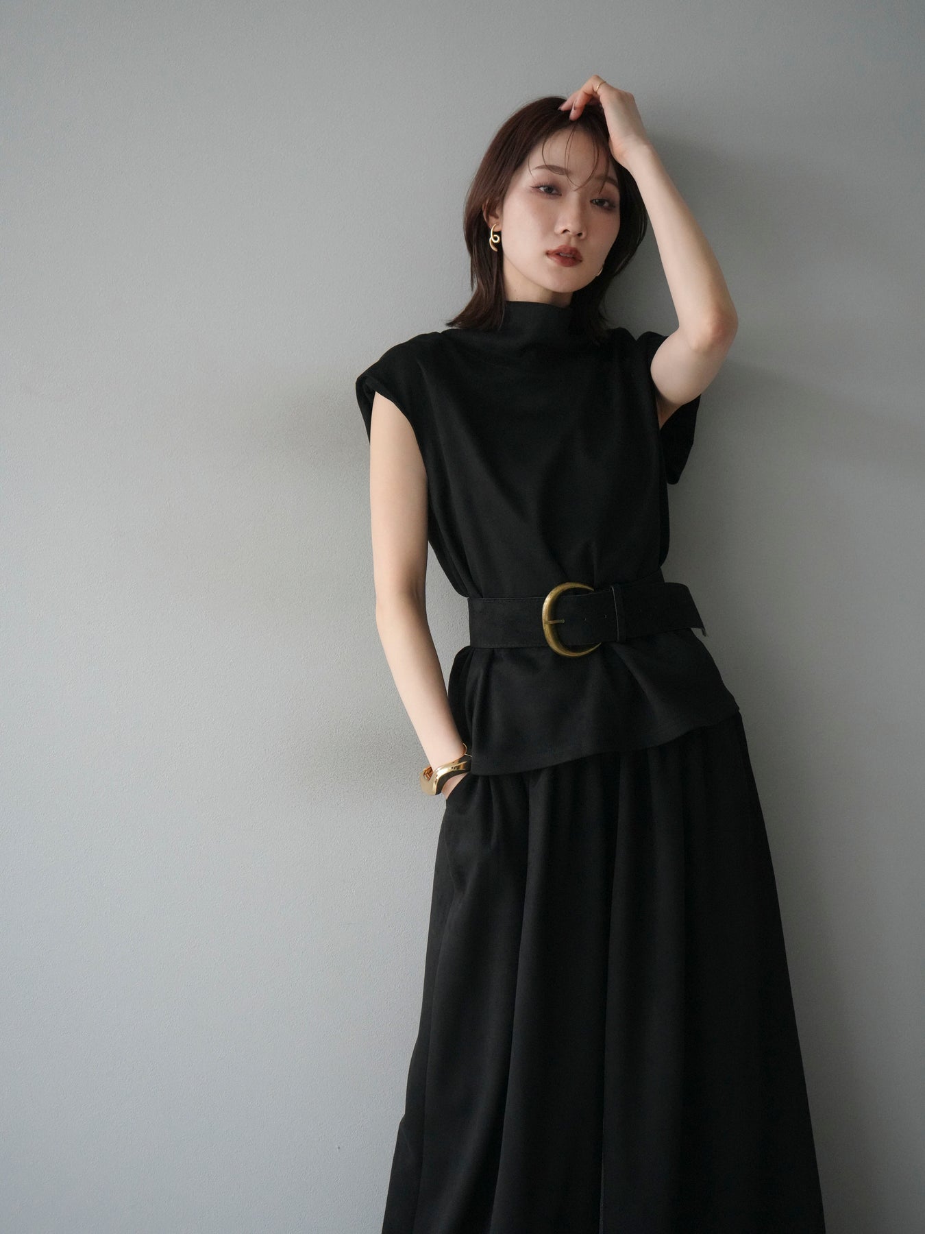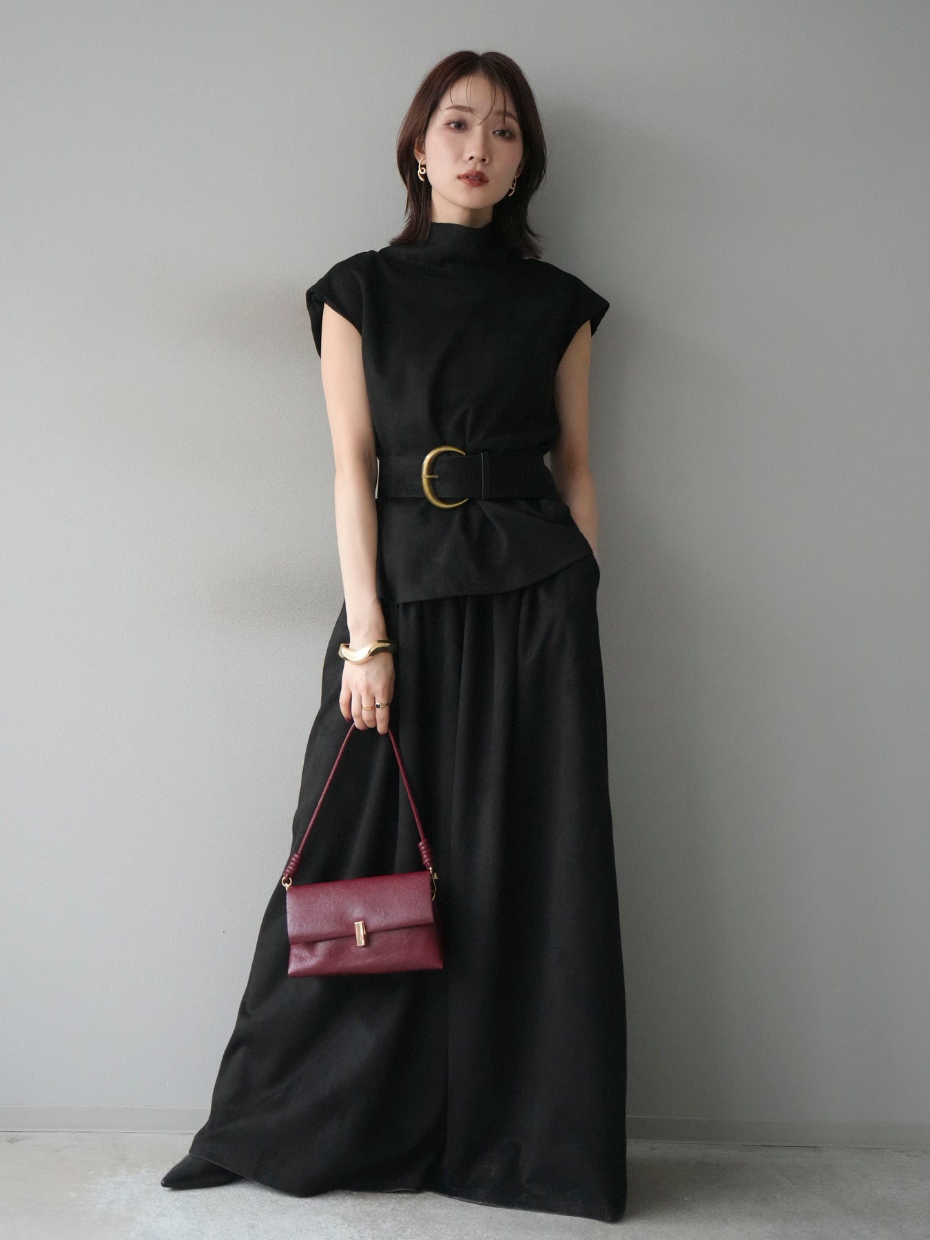 トップスはハイネックデザインに共布ベルトを合わせ、スタイルアップ効果のあるシルエットに。