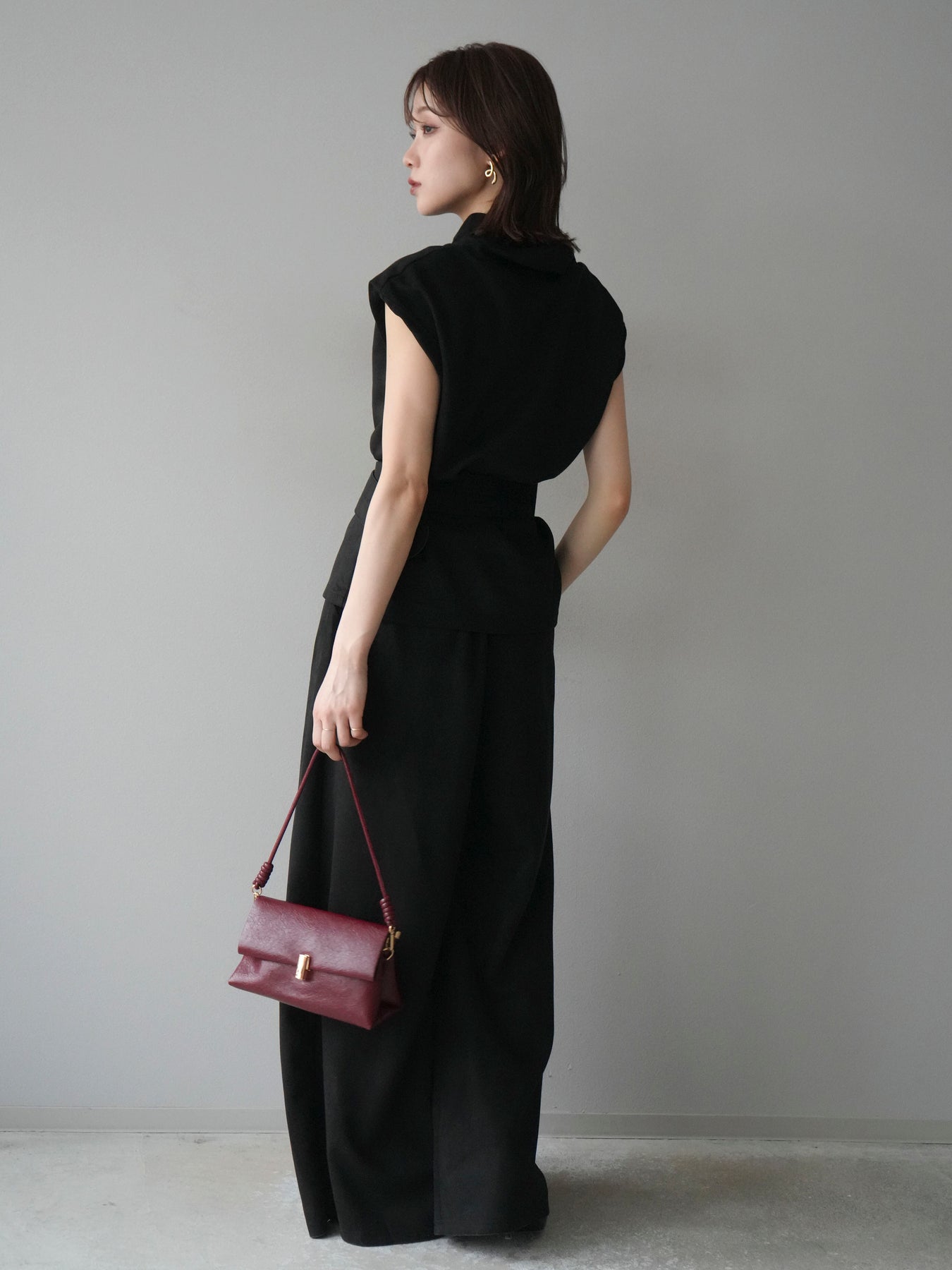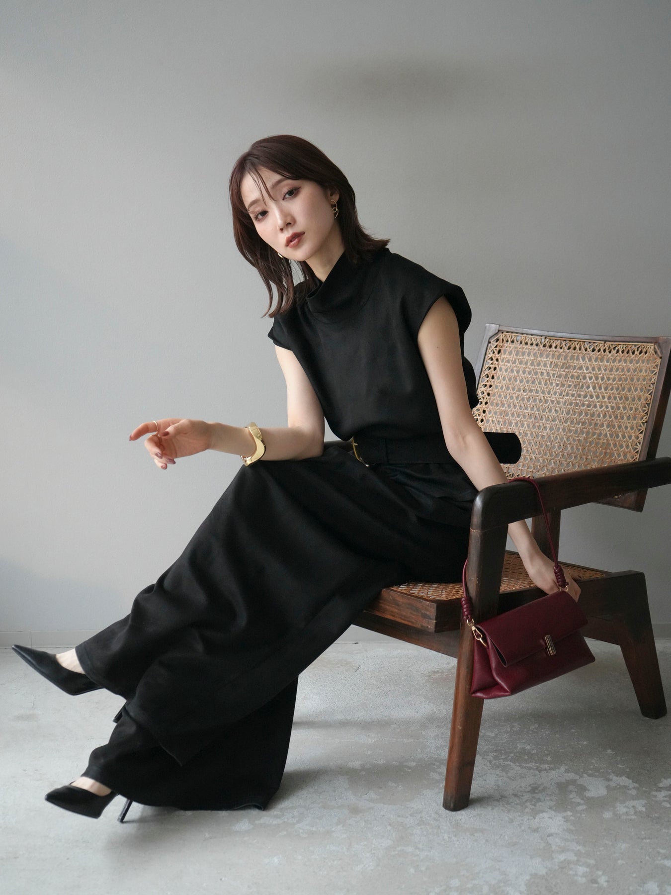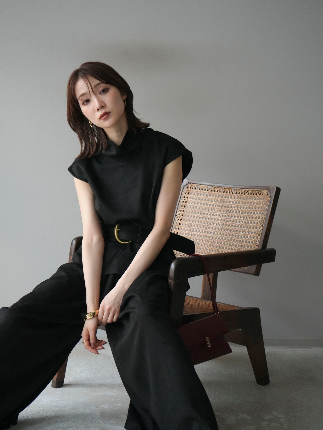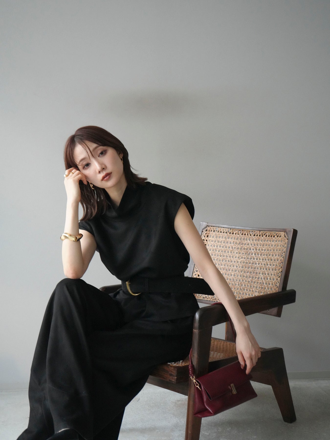 トップスはハイネックデザインに共布ベルトを合わせ、スタイルアップ効果のあるシルエットに。