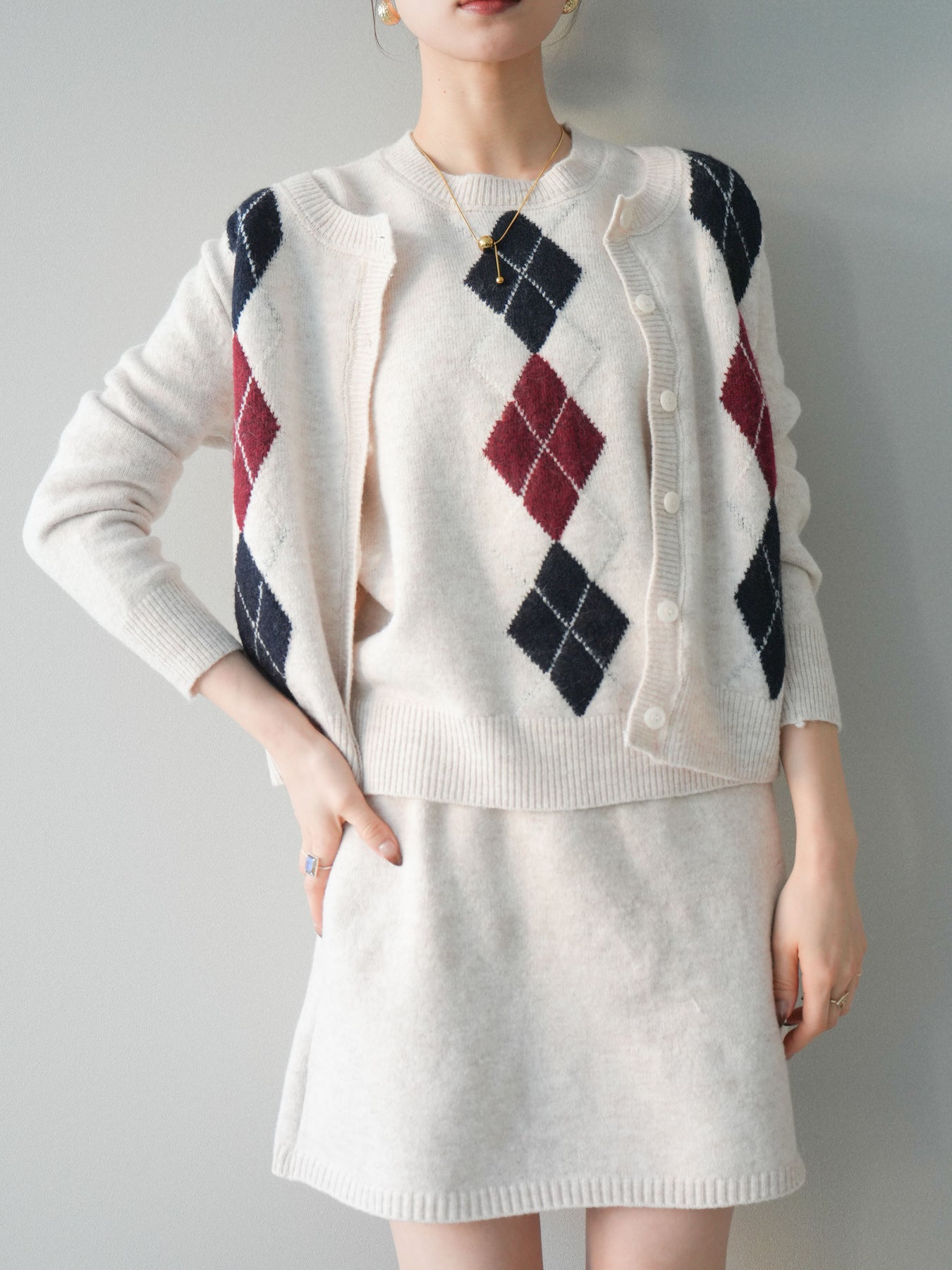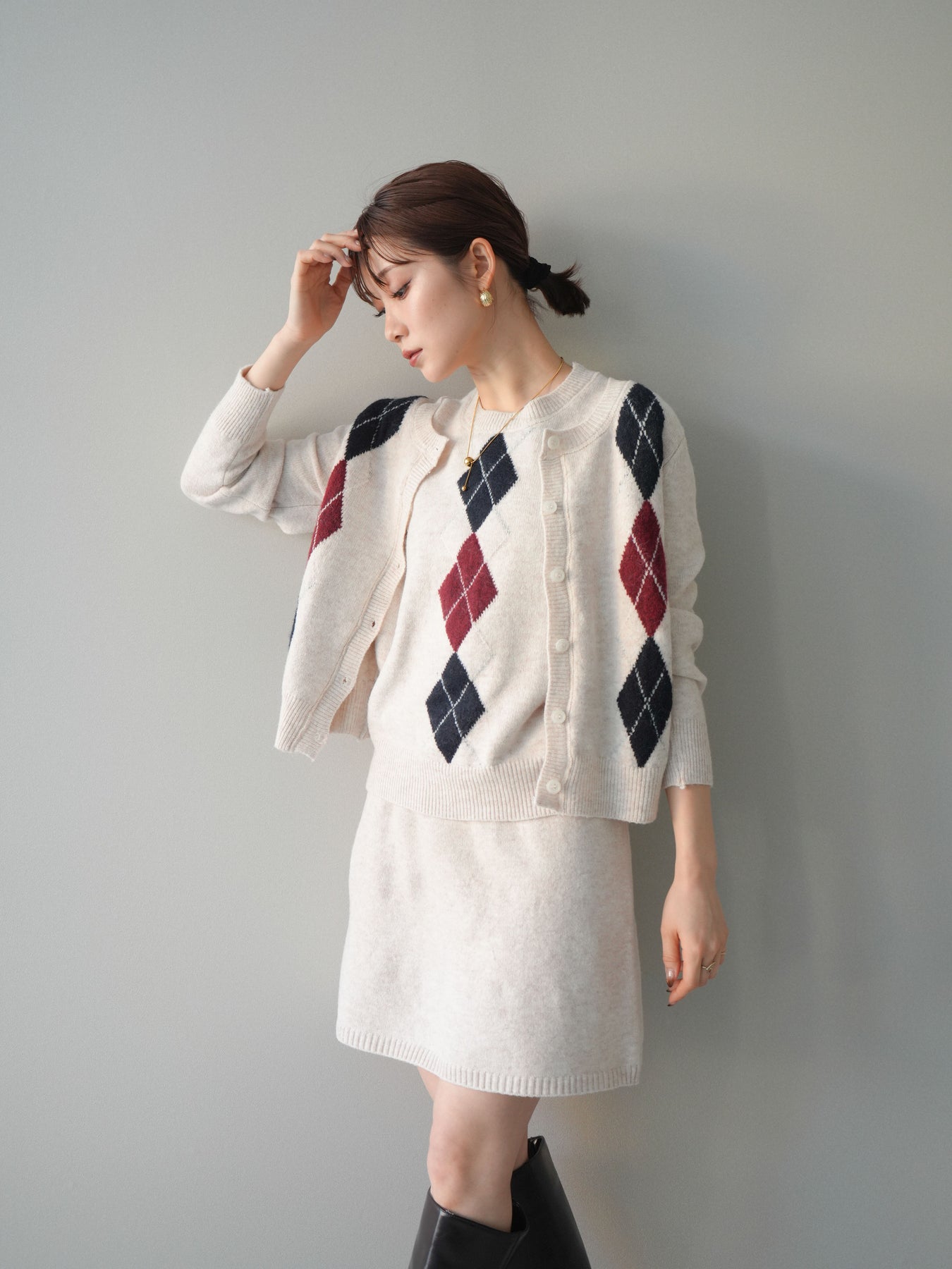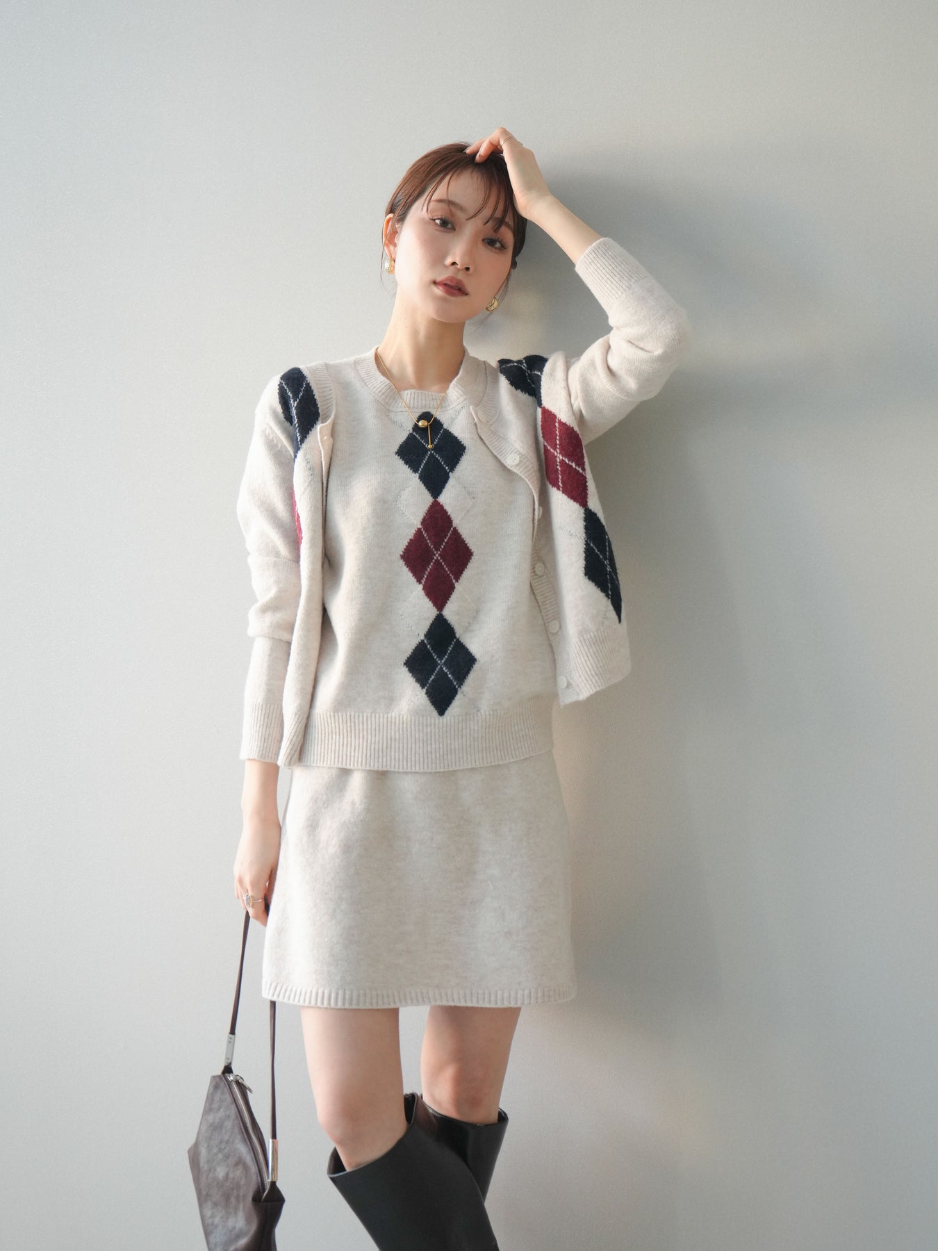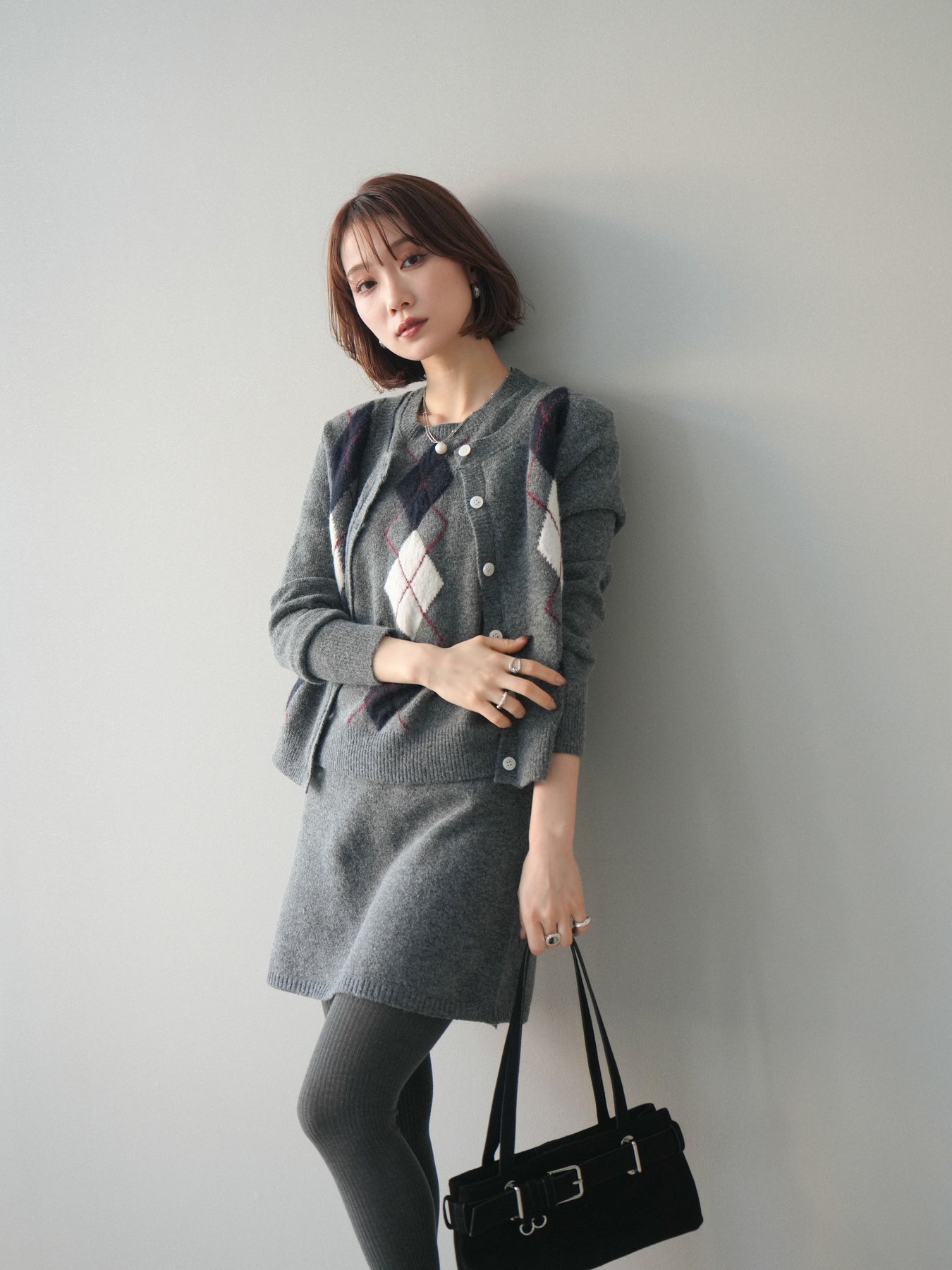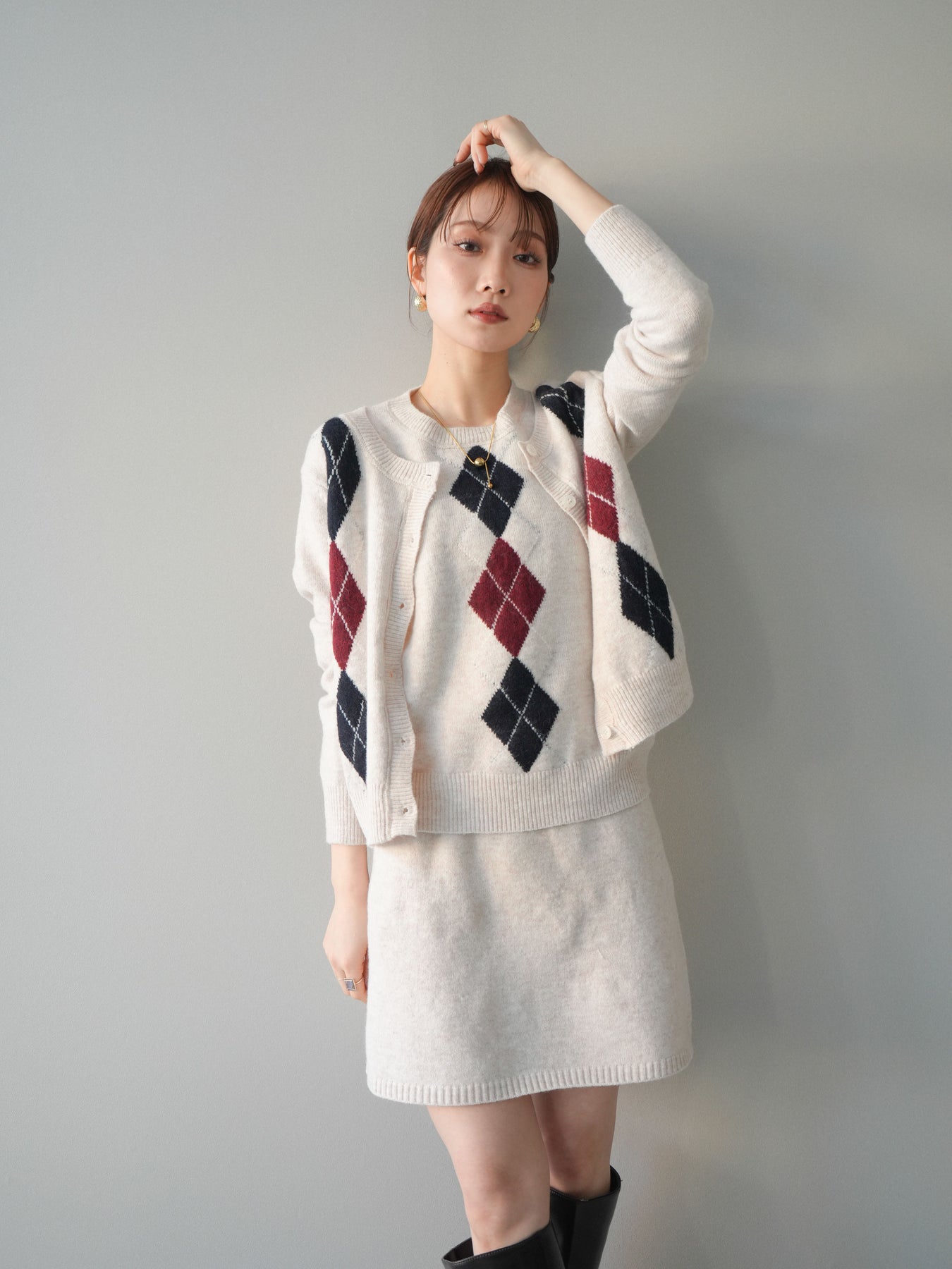 アーガイル柄をポイントにあしらったニットベスト・ニットトップス・ニットパンツの3ピースセット。統一感のあるデザインでセットアップとしてはもちろん、それぞれ単品でも着回しやすい万能アイテムです。ベストはレイヤードしやすい程よいゆとりのシルエットで、トップスは着心地の良い柔らかな風合いが魅力。パンツはリラックス感がありながらもすっきり見えするストレートラインで、デイリーに取り入れやすいバランスに仕上げています。コーディネート全体がまとまりやすく、これ一つで季節感のあるスタイルが完成する便利なセットです。