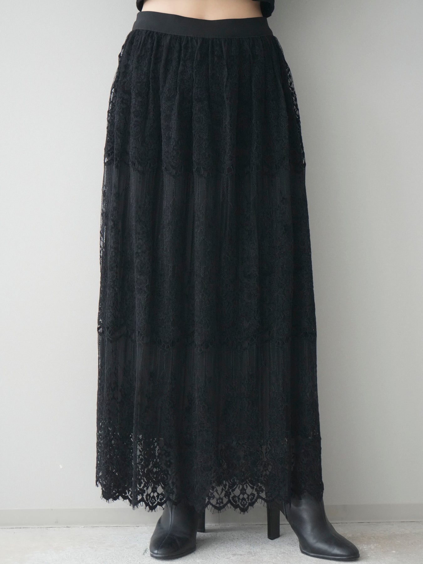 繊細な総レース素材に、内側プリーツを重ねた奥行きのあるロングスカート。歩くたびにさりげなく揺れるシルエットが、上品で女性らしい印象を演出します。レースの透け感とプリーツの立体感が重なり、シンプルなトップスと合わせるだけでも着映えする一着。ウエストはすっきりとしたデザインで、きれいめにもカジュアルにも取り入れやすく、デイリーからお出かけまで幅広いシーンで活躍します。