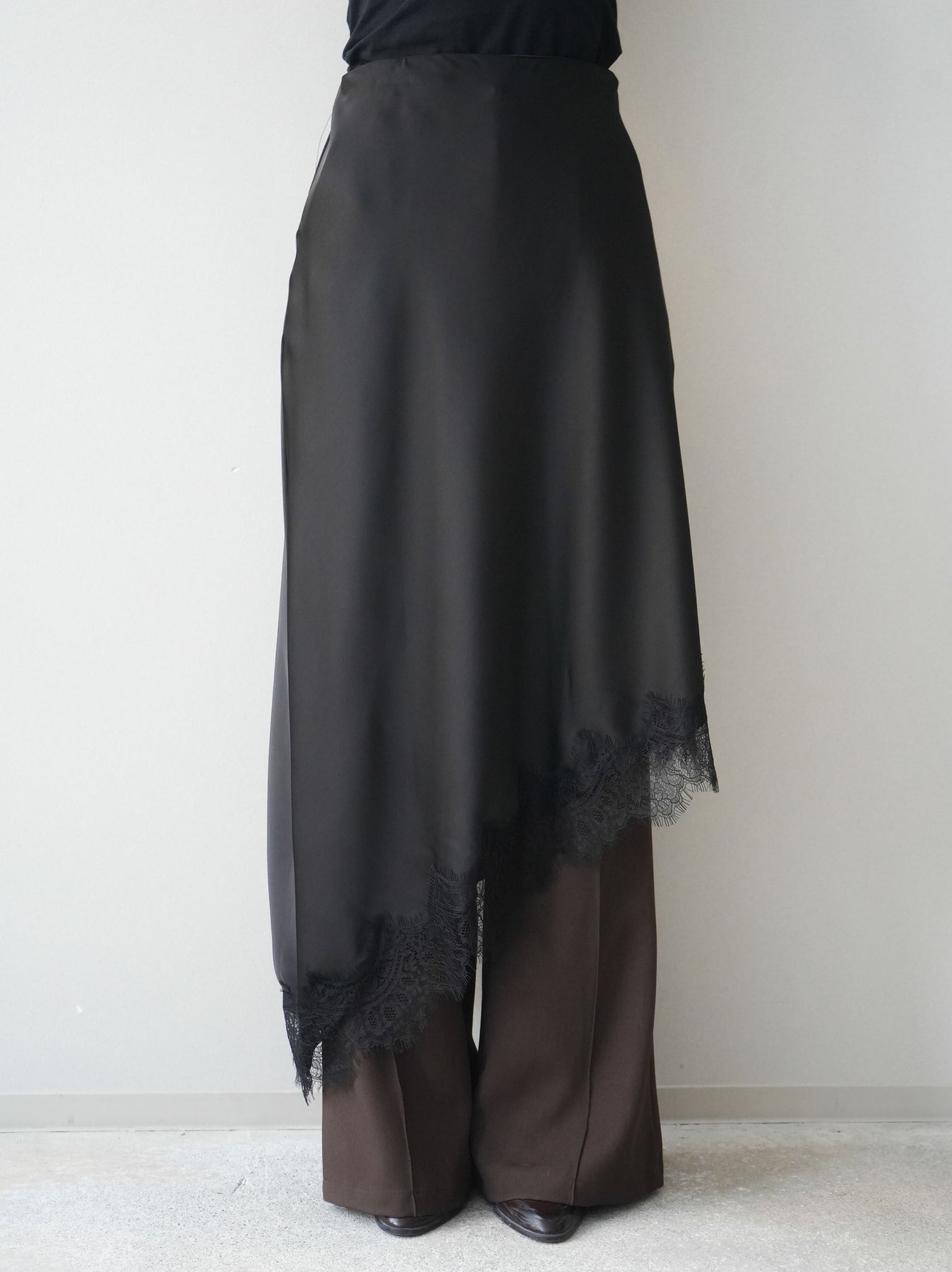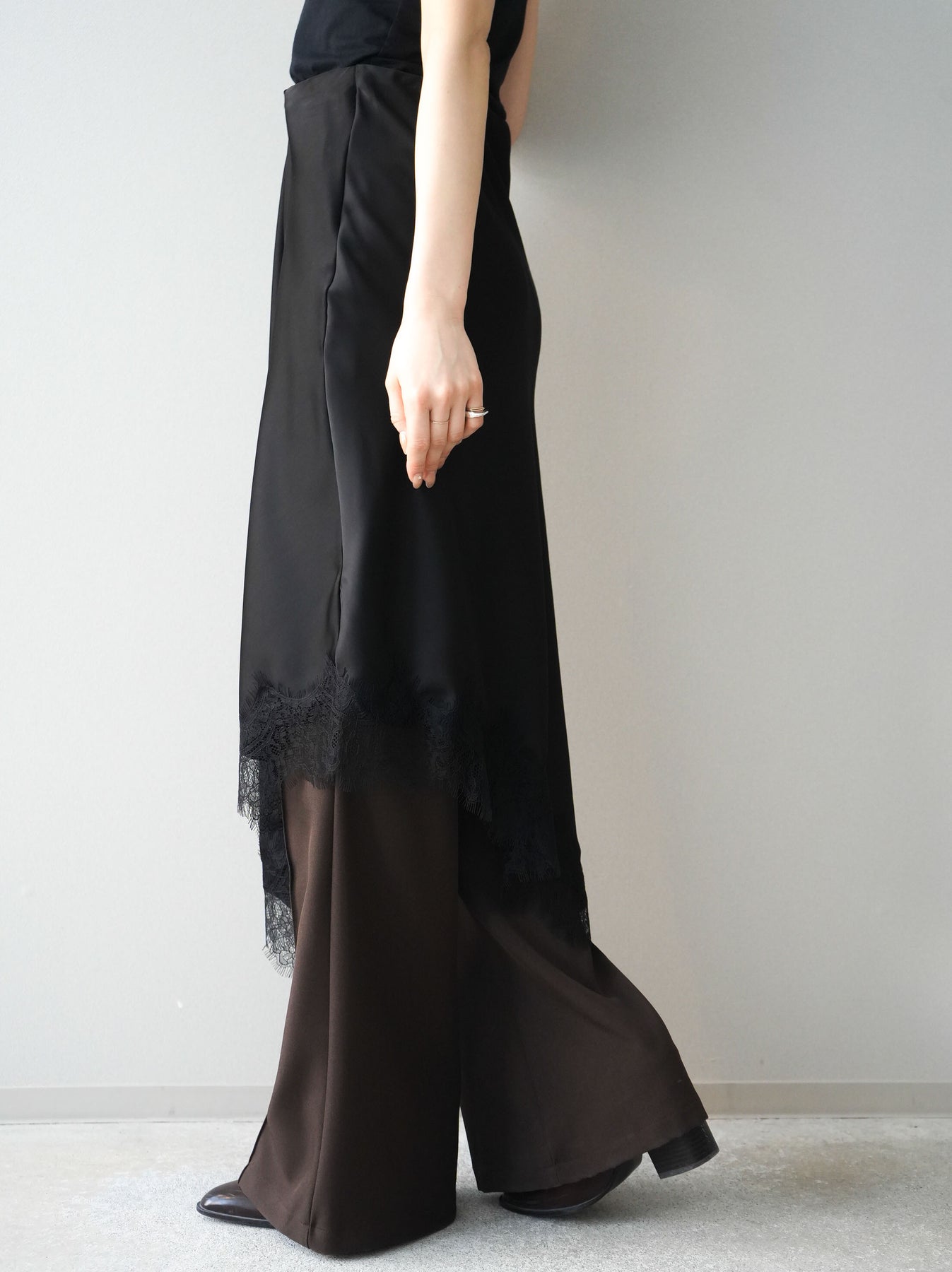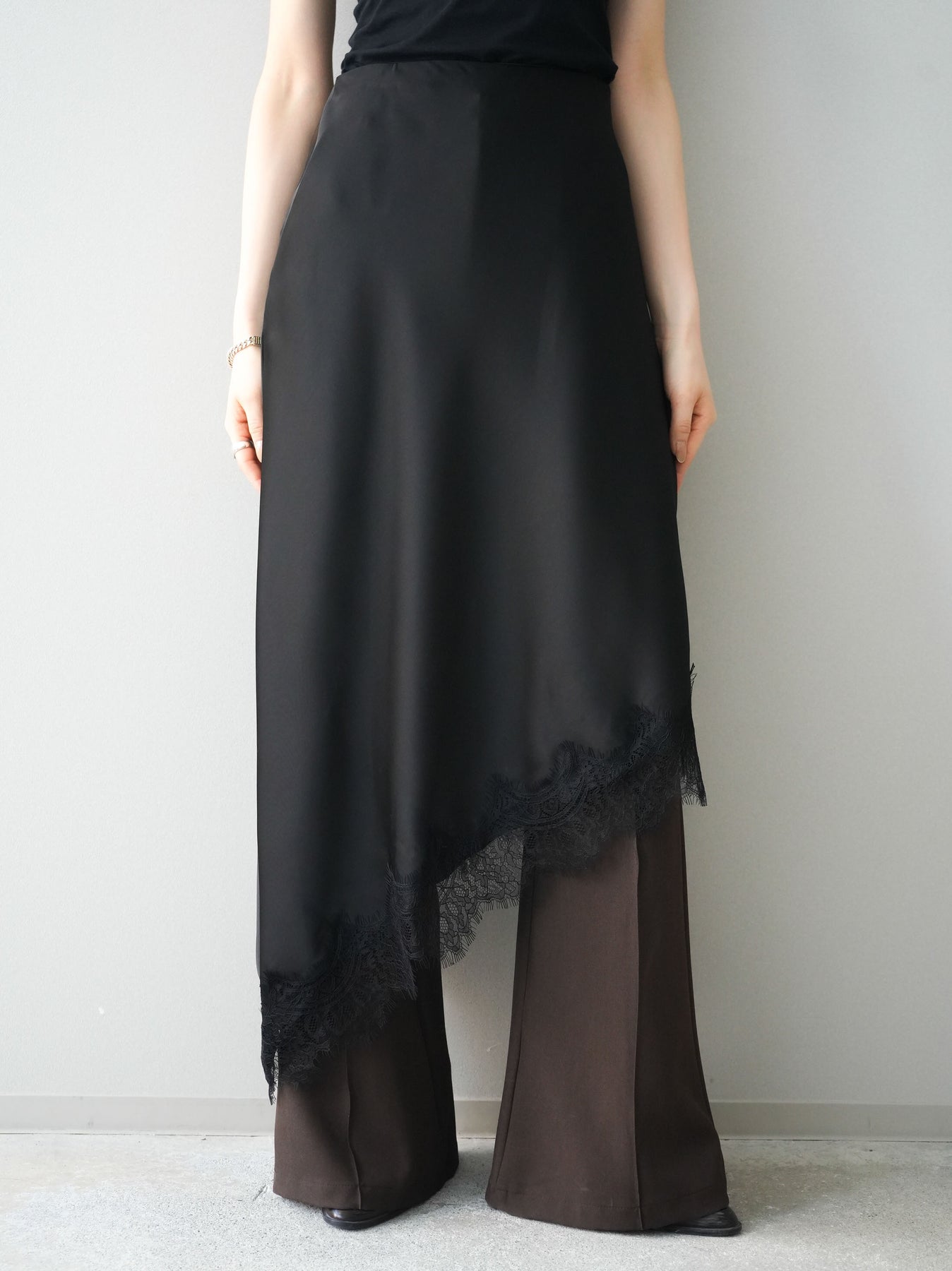 上品な落ち感のある素材に、繊細なレースをレイヤードした華やかなスカート。裾から覗くレースが歩くたびに揺れ、女性らしい抜け感を演出します。すっきりとしたシルエットでトップスを選ばず、コンパクトなニットやシャツと合わせるだけで洗練された印象に。きれいめにもカジュアルにも着回せる、コーディネートの主役になる一枚です。