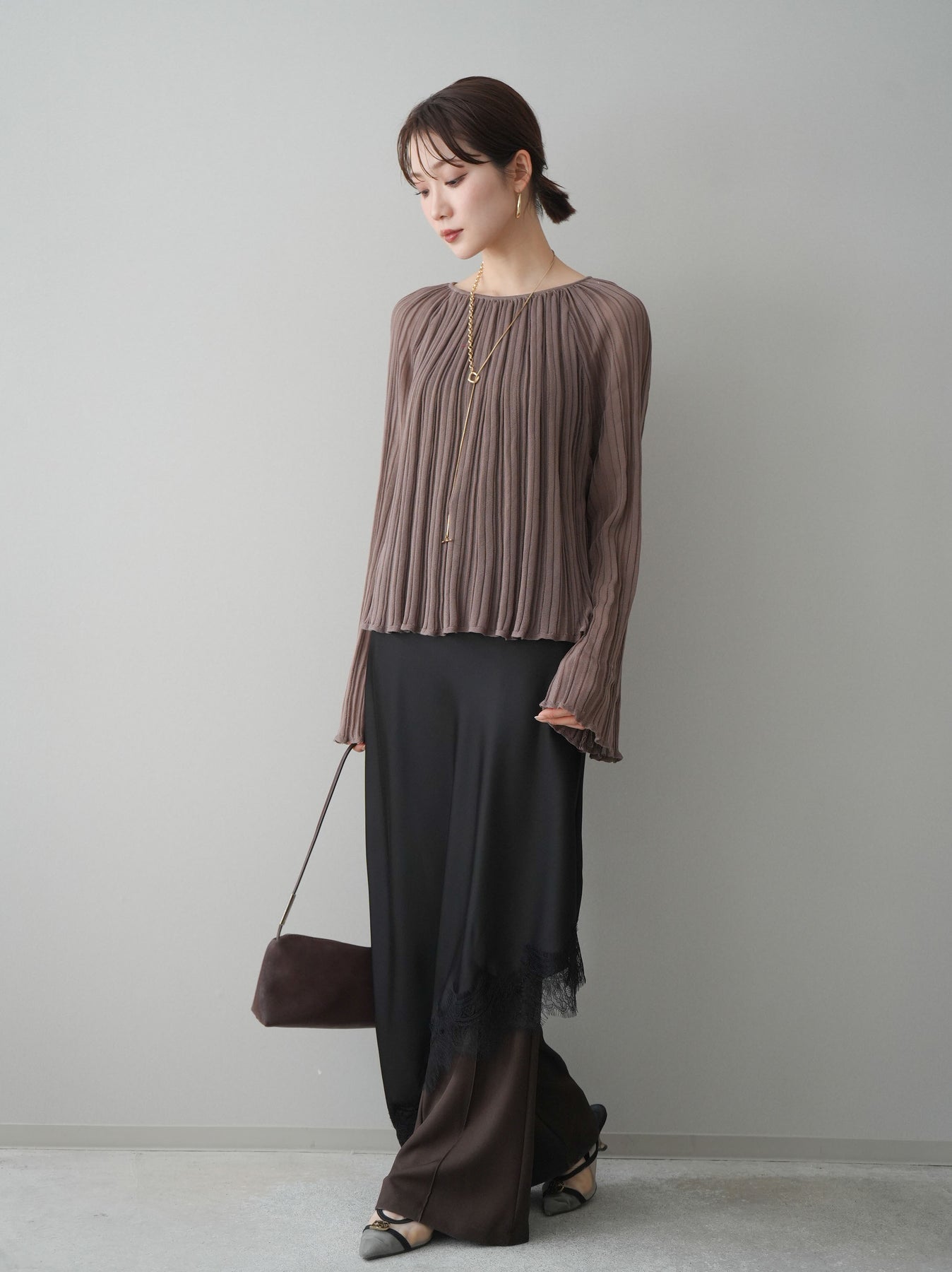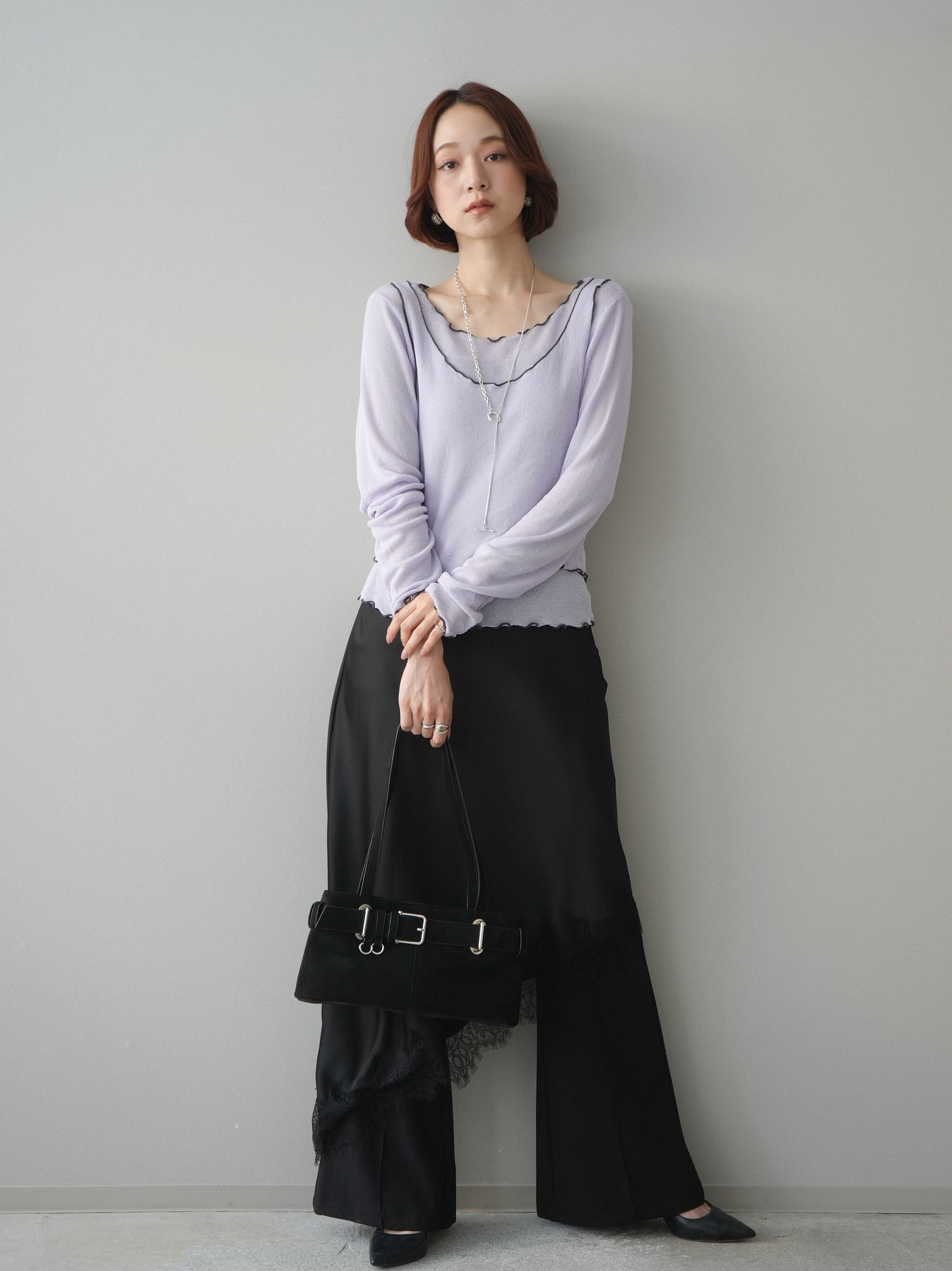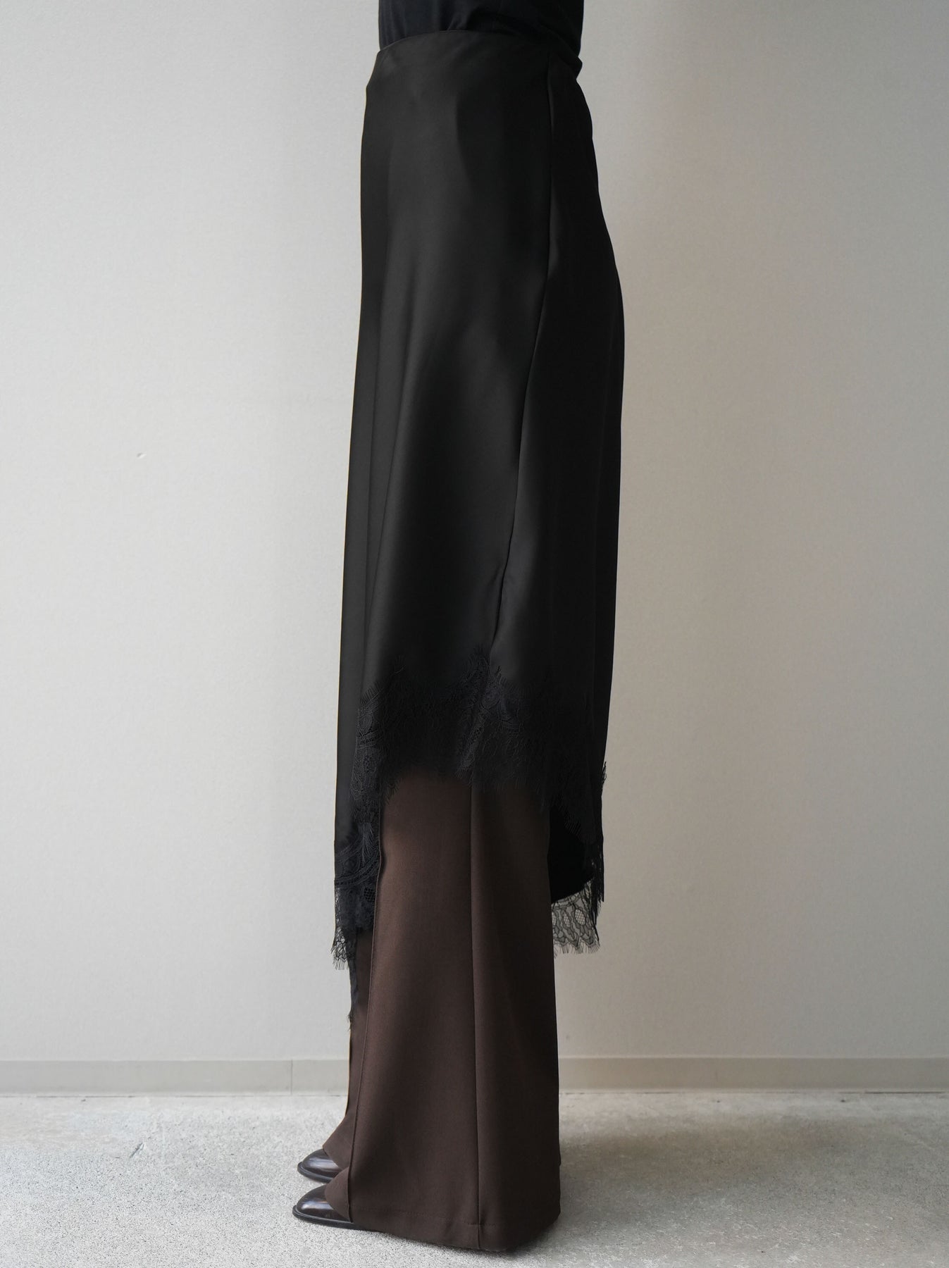 上品な落ち感のある素材に、繊細なレースをレイヤードした華やかなスカート。裾から覗くレースが歩くたびに揺れ、女性らしい抜け感を演出します。すっきりとしたシルエットでトップスを選ばず、コンパクトなニットやシャツと合わせるだけで洗練された印象に。きれいめにもカジュアルにも着回せる、コーディネートの主役になる一枚です。