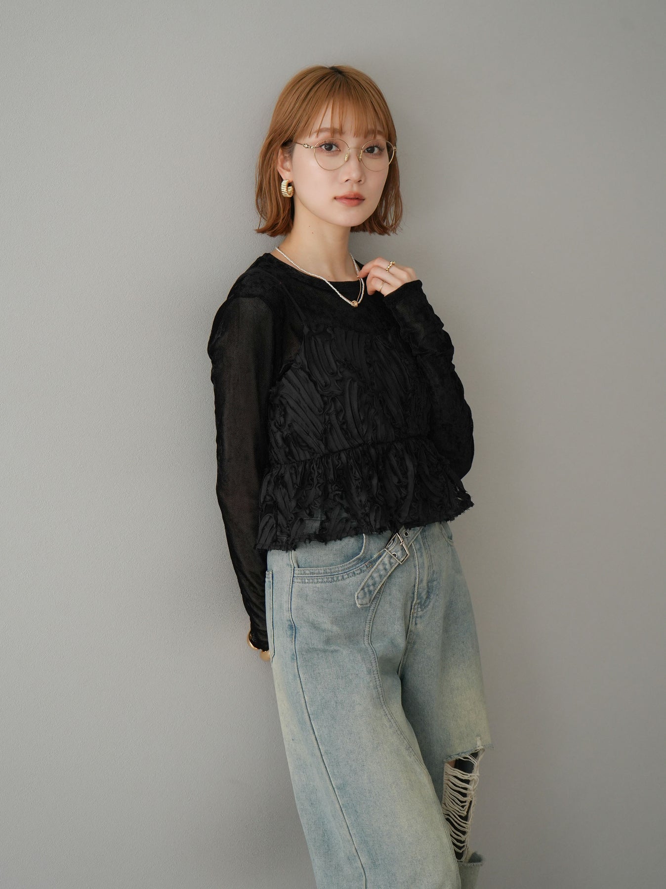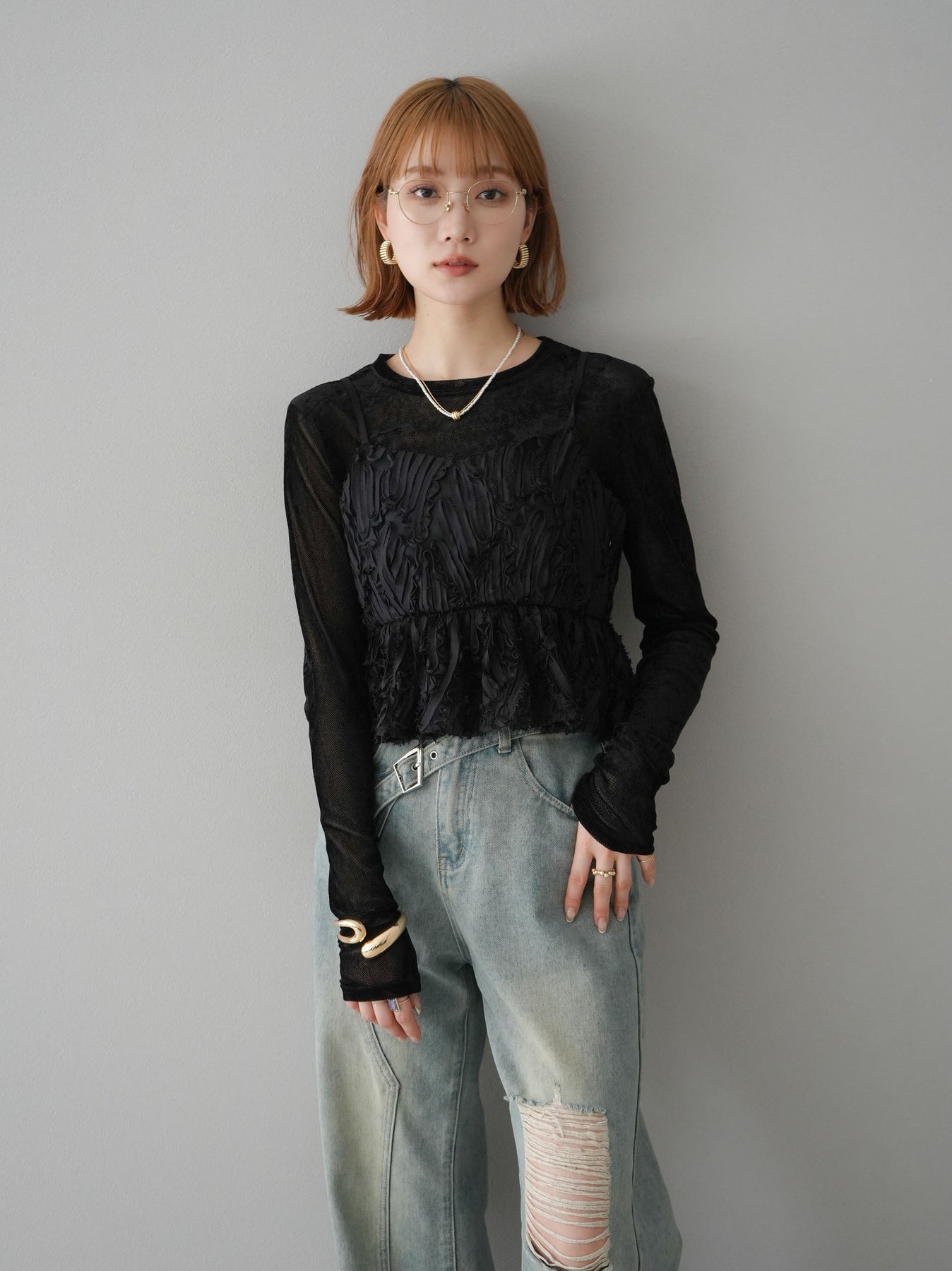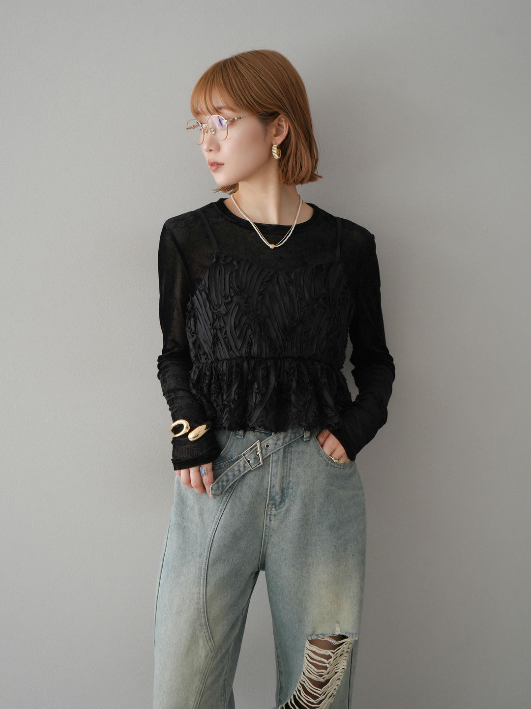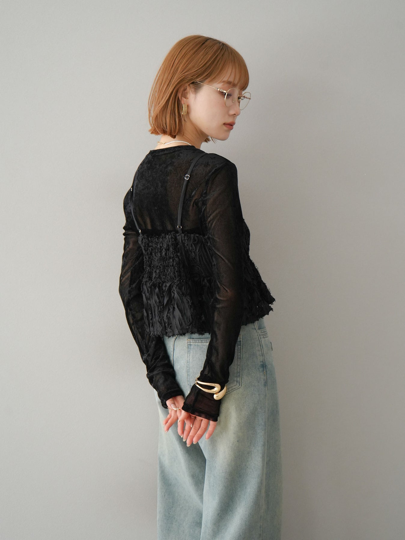 這款剪裁上衣採用時尚的透明面料製成,擁有優雅的天鵝絨質感。適度的透明度彰顯女性氣質,無論疊穿或單穿都格外引人注目。簡潔深邃的設計,適合從日常穿著到外出等各種場合。富有彈性的布料穿著舒適,為你的造型增添一抹休閒氣息,拓展你的穿搭範圍。 *除下裝和吊帶背心(內衣)外,所有商品均不包含內衣。