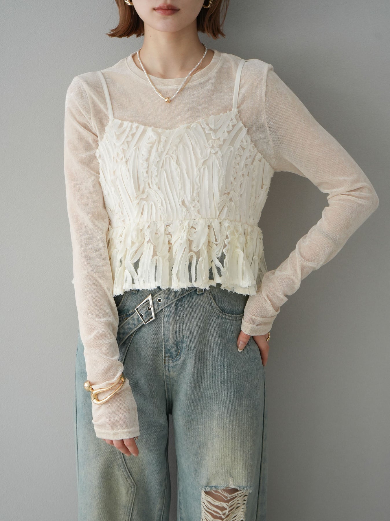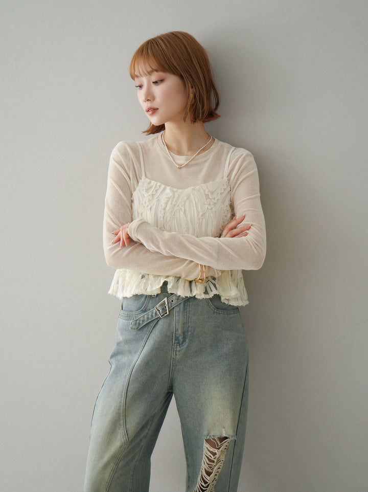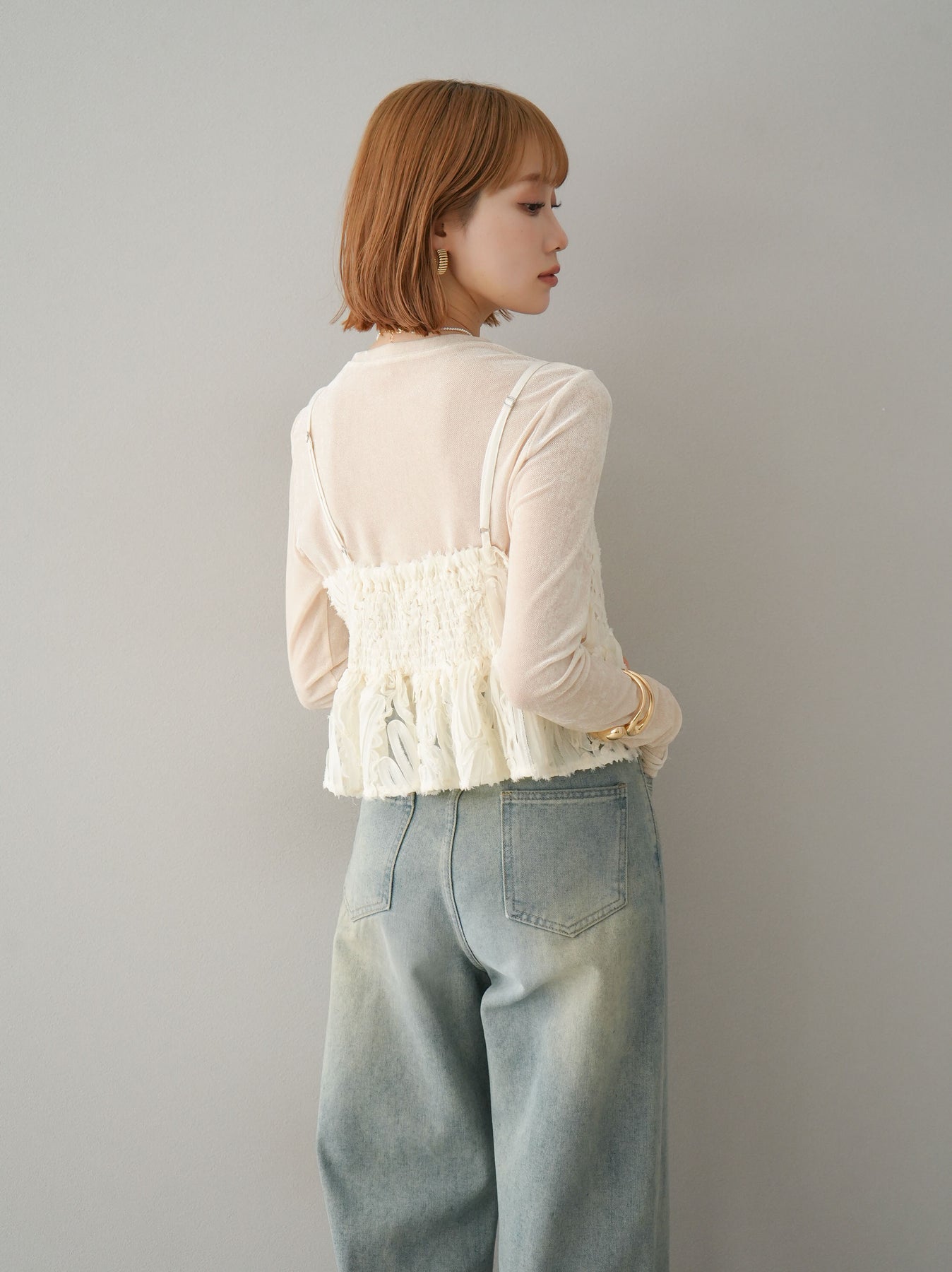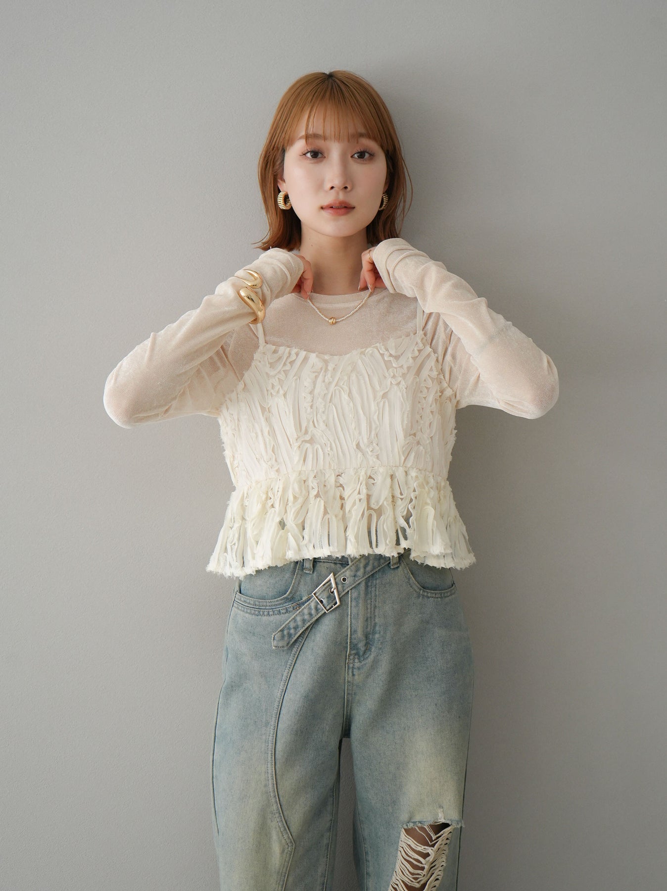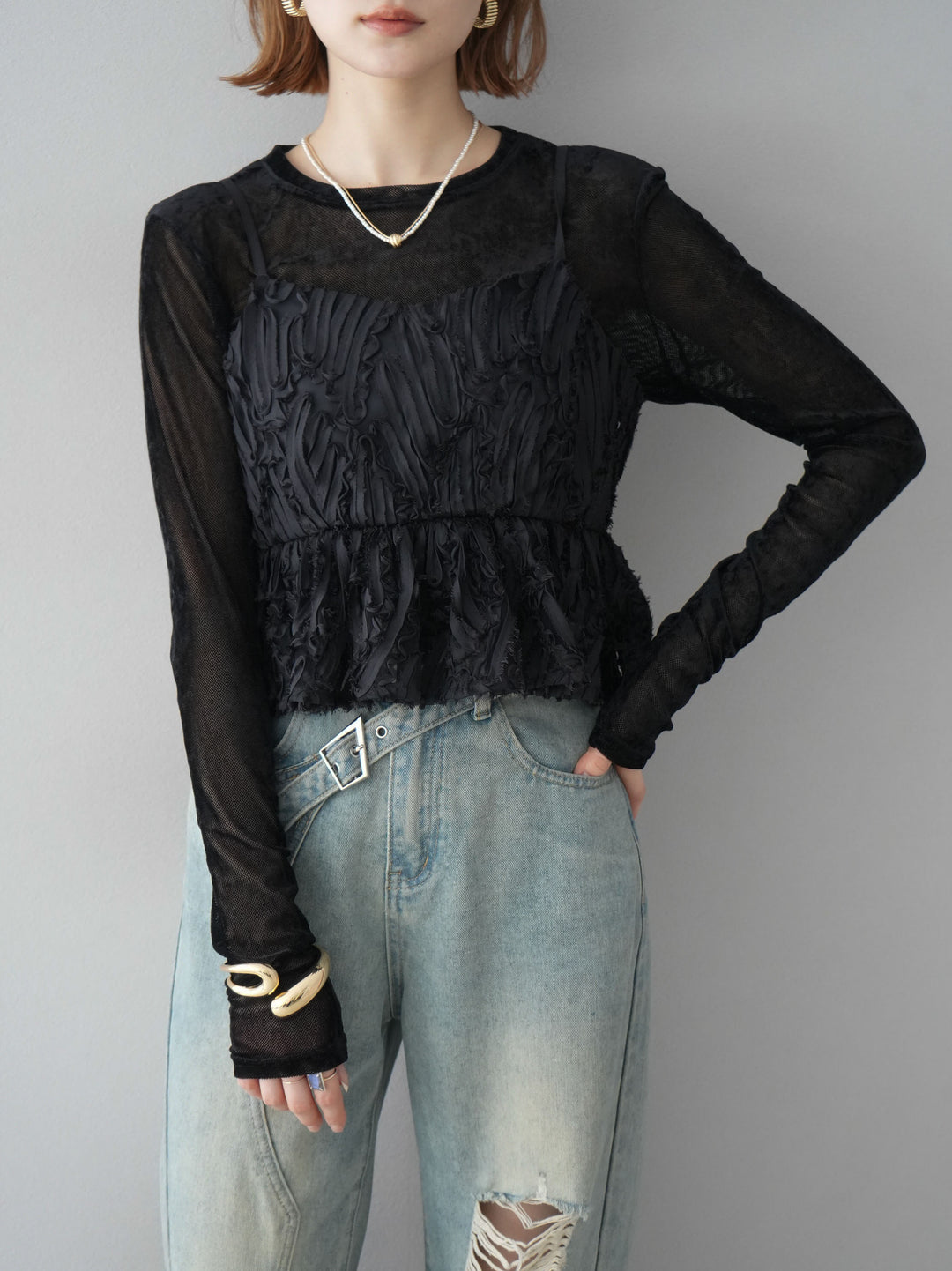 這款剪裁上衣採用時尚的透明面料製成,擁有優雅的天鵝絨質感。適度的透明度彰顯女性氣質,無論疊穿或單穿都格外引人注目。簡潔深邃的設計,適合從日常穿著到外出等各種場合。富有彈性的布料穿著舒適,為你的造型增添一抹休閒氣息,拓展你的穿搭範圍。 *除下裝和吊帶背心(內衣)外,所有商品均不包含內衣。
