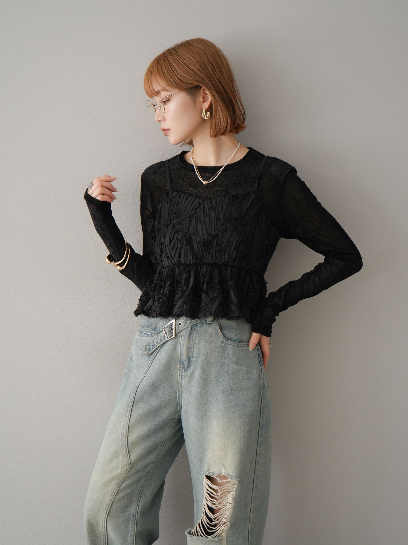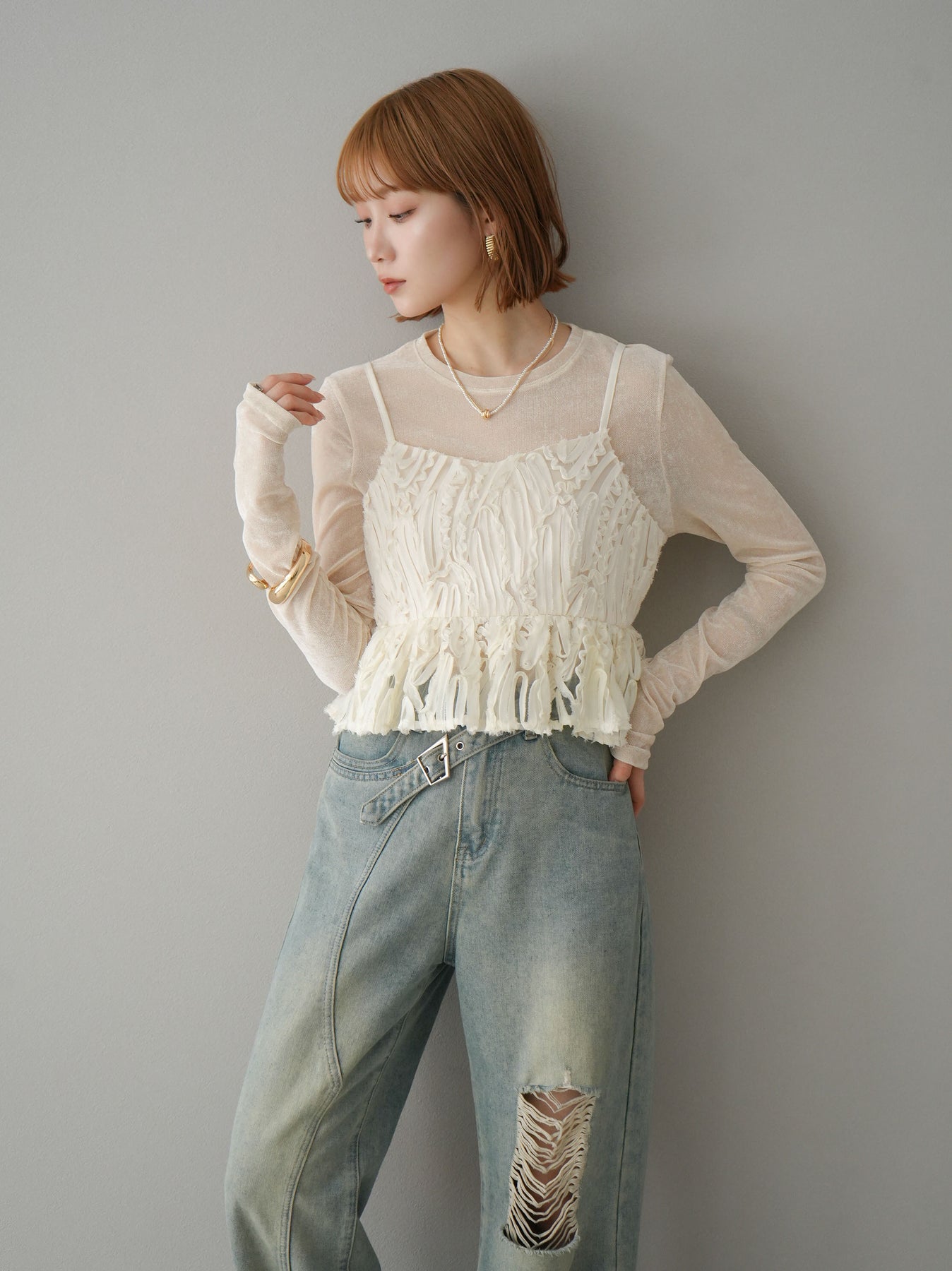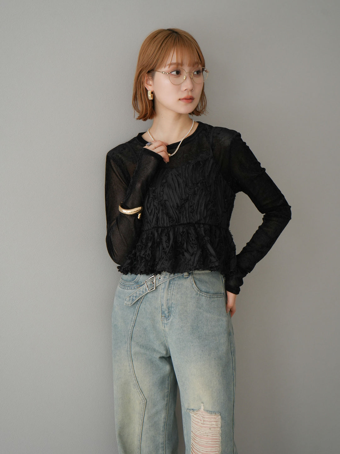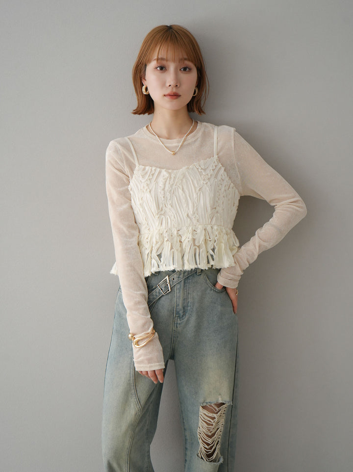 這款剪裁上衣採用時尚的透明面料製成,擁有優雅的天鵝絨質感。適度的透明度彰顯女性氣質,無論疊穿或單穿都格外引人注目。簡潔深邃的設計,適合從日常穿著到外出等各種場合。富有彈性的布料穿著舒適,為你的造型增添一抹休閒氣息,拓展你的穿搭範圍。 *除下裝和吊帶背心(內衣)外,所有商品均不包含內衣。
