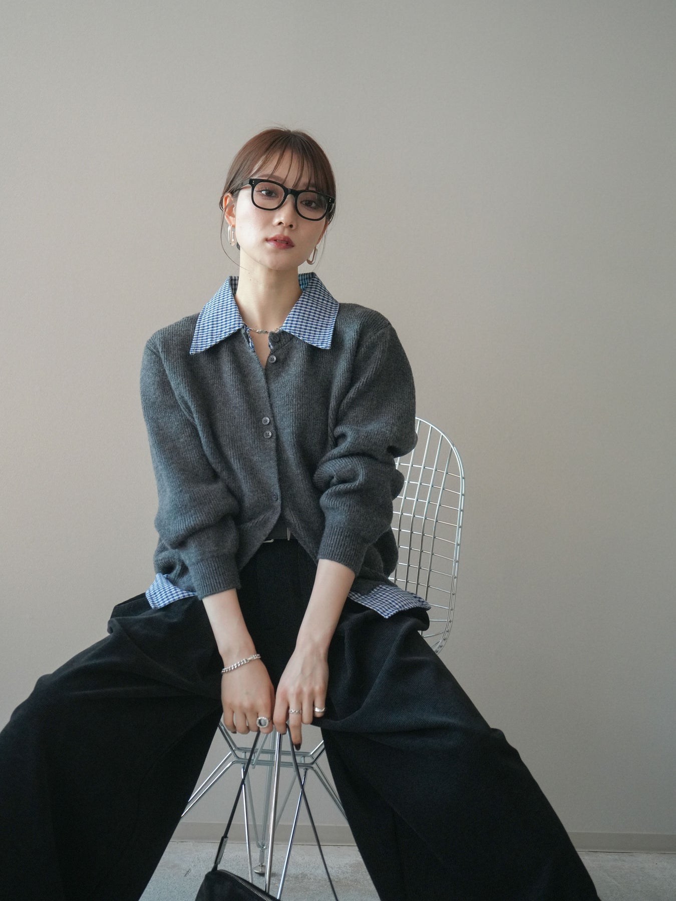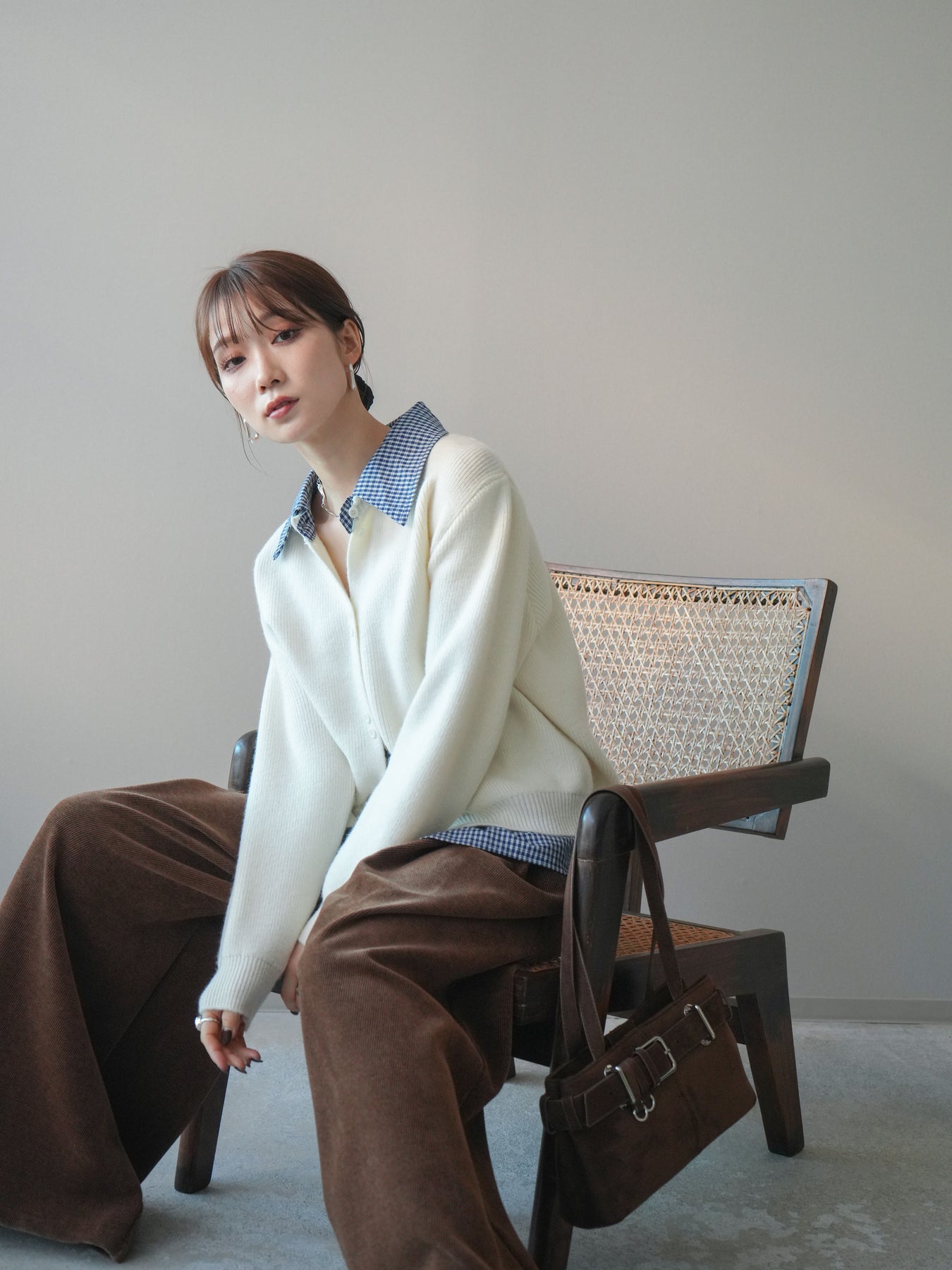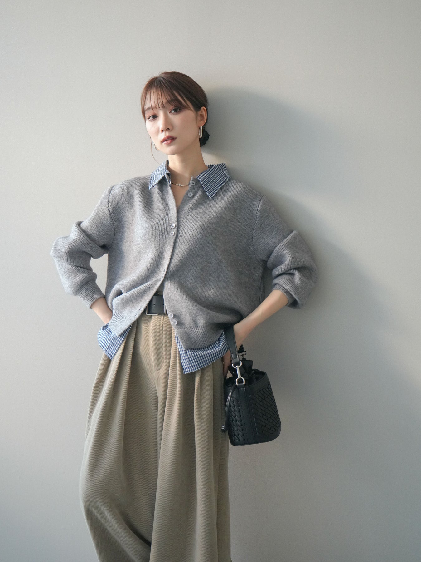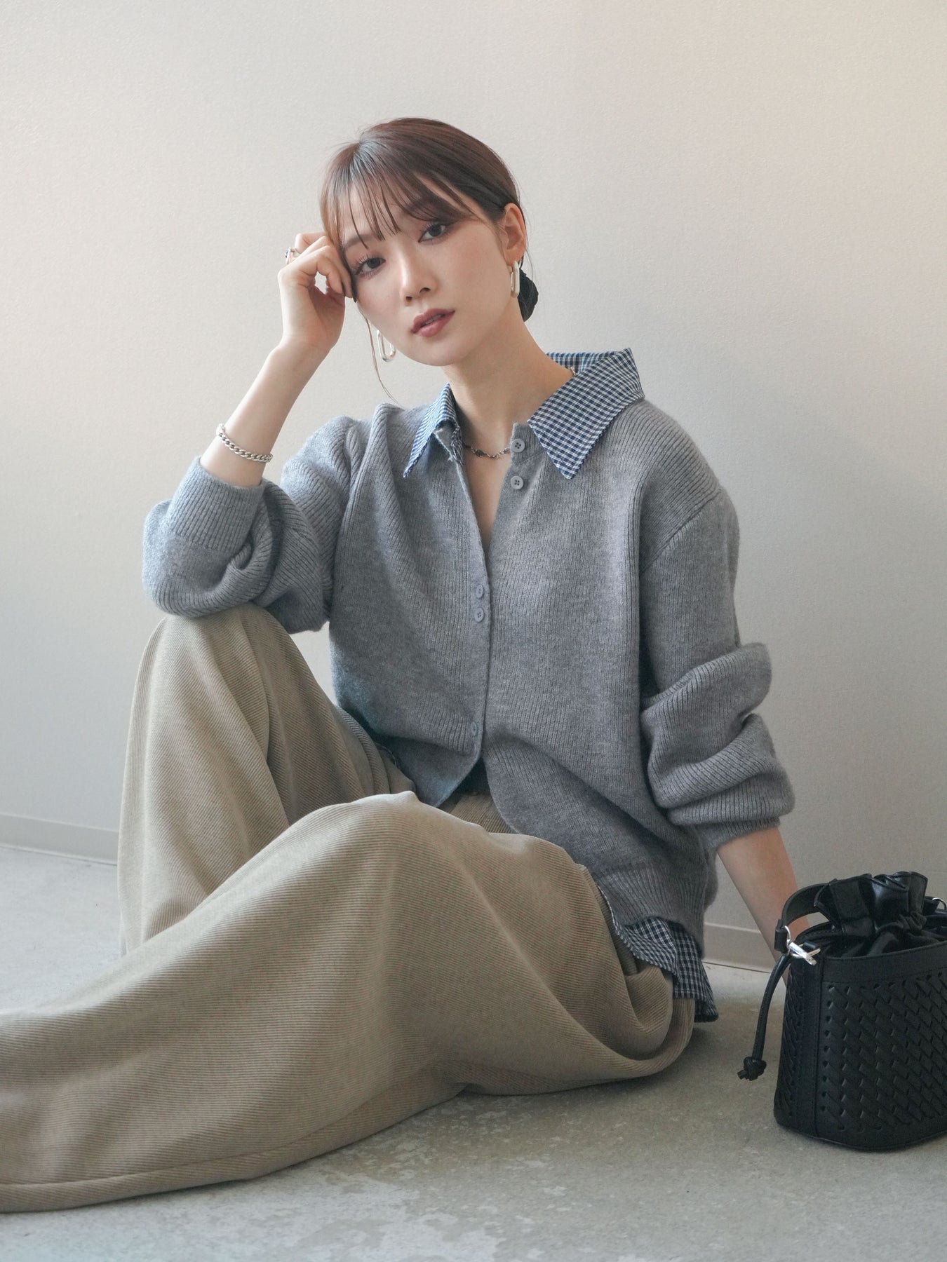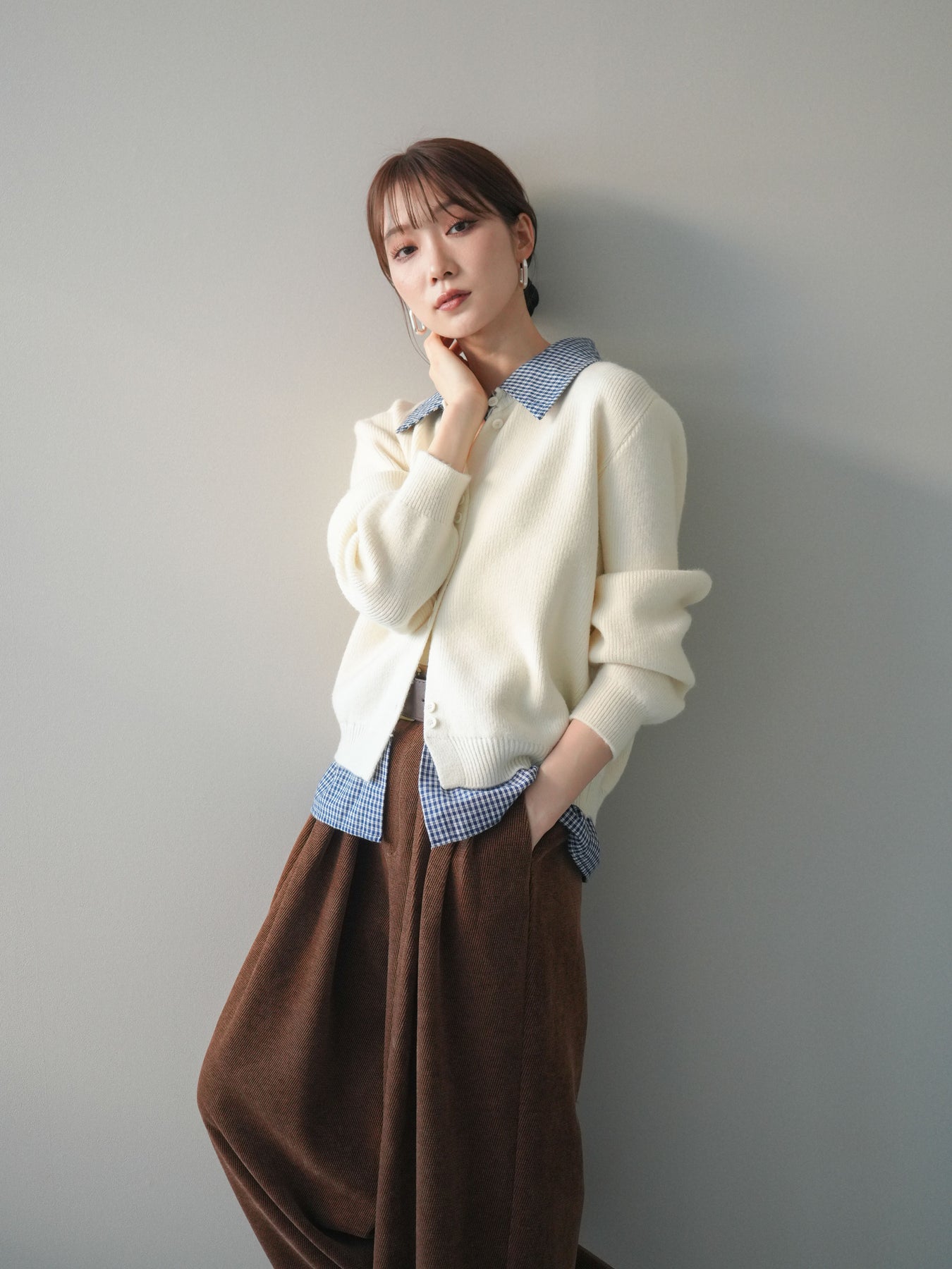 チェック柄のシャツ襟をドッキングしたデザインが目を引くニットカーディガン。襟元と裾から覗くシャツ地がレイヤード風のアクセントとなり、1枚でスタイリングが決まる主役級のアイテムです。ほどよい厚みのニットは柔らかく、ゆったりとしたシルエットが抜け感のある雰囲気に。ボタンを留めてトップス風に着るのはもちろん、羽織りとしても活躍し、デニムからスカートまで幅広いコーディネートと相性良く楽しめます。 ※ボトムス、キャミソール(インナー)以外の商品は一律でインナーは付属していません。