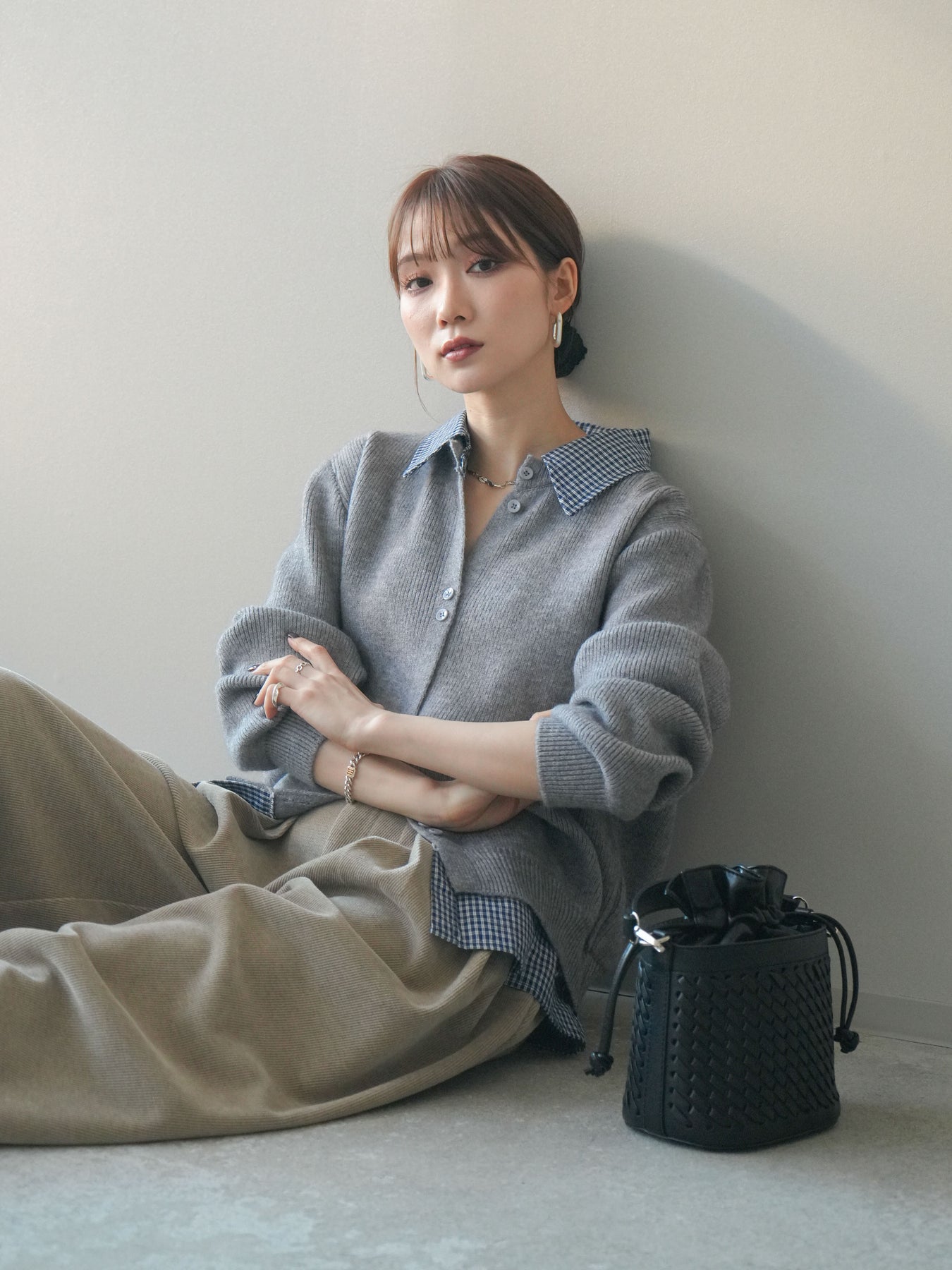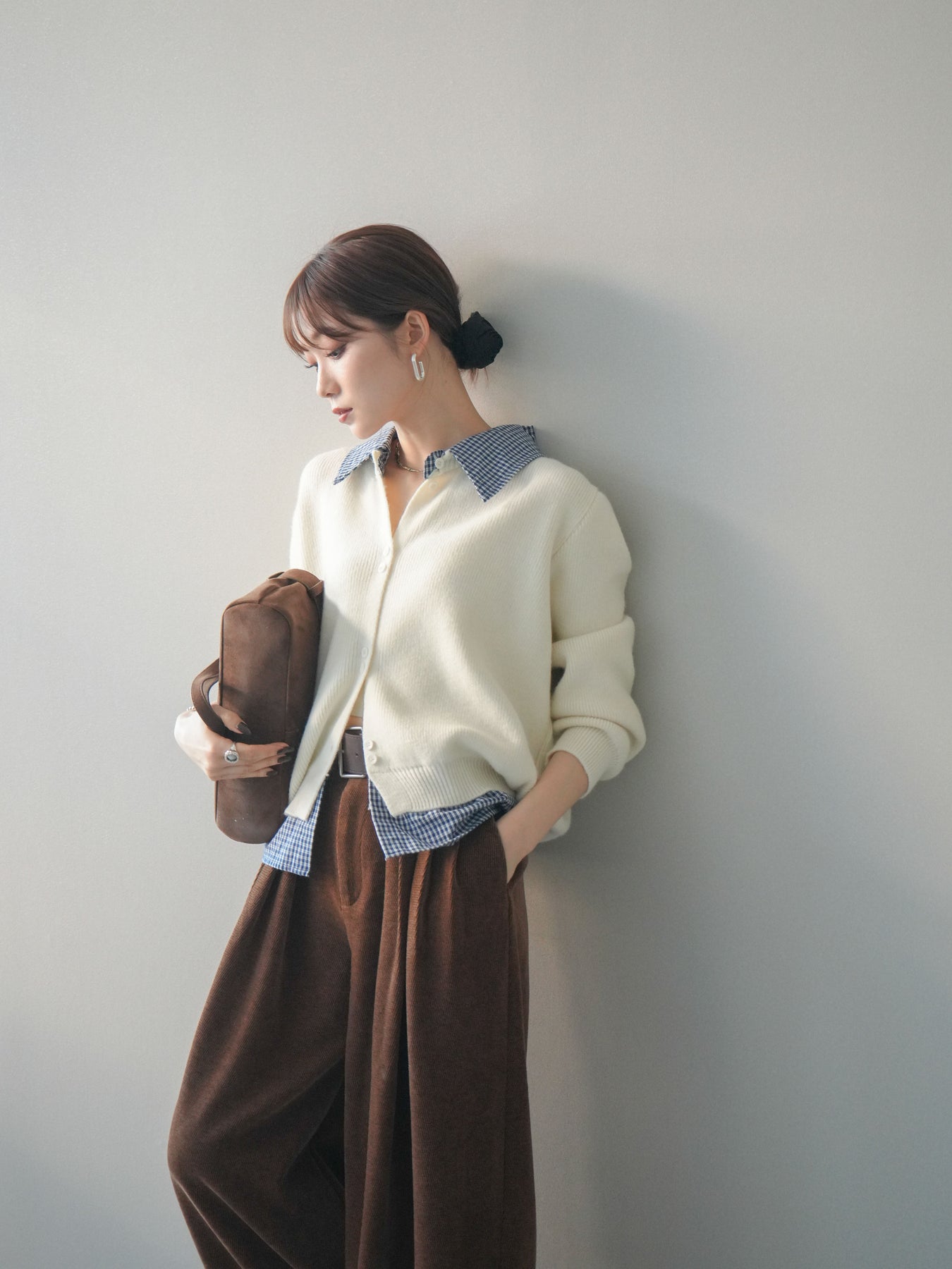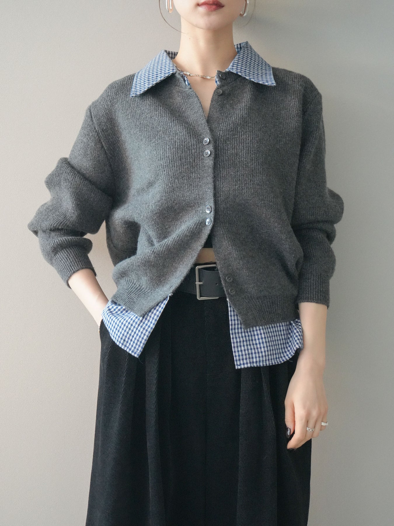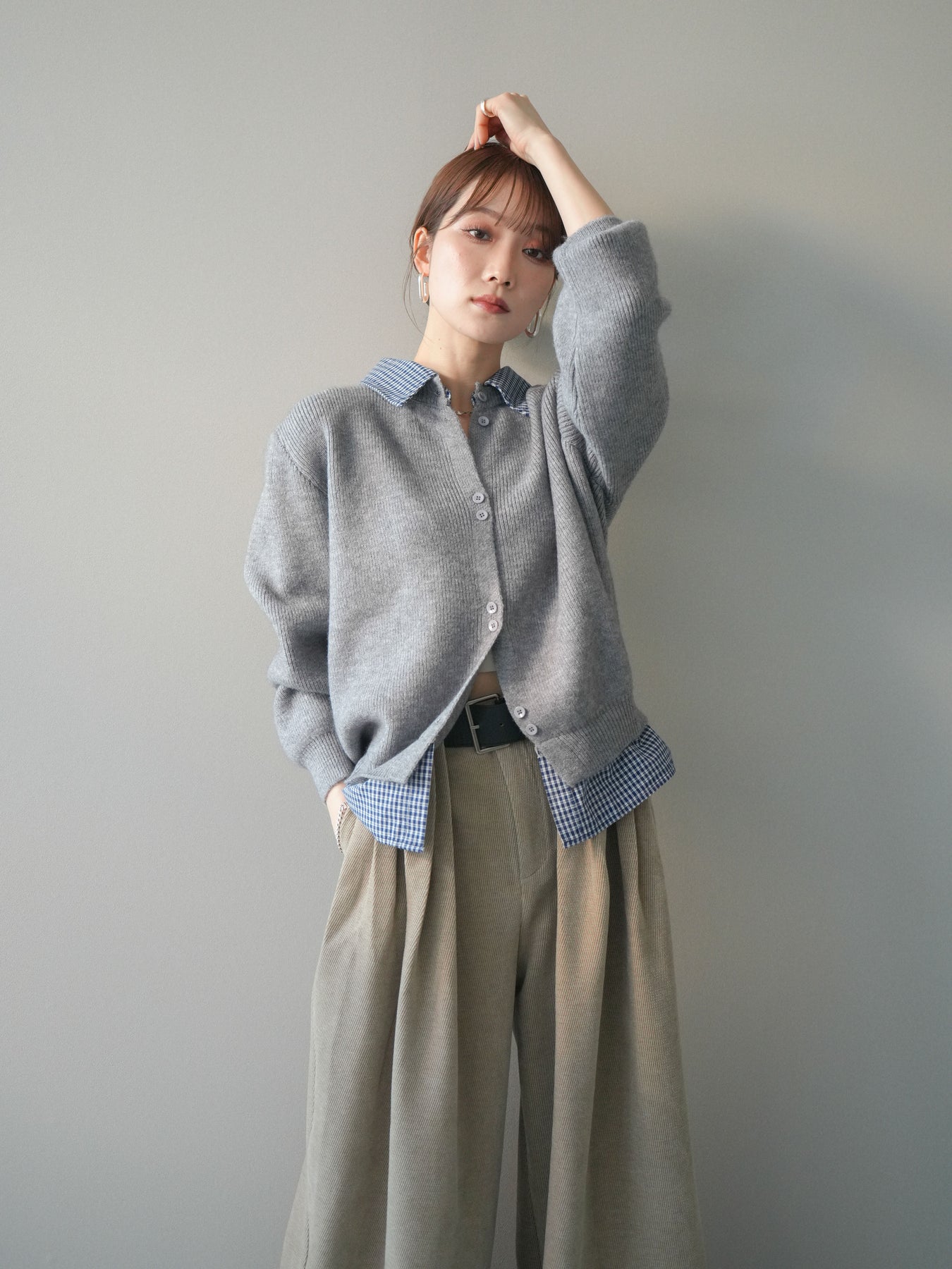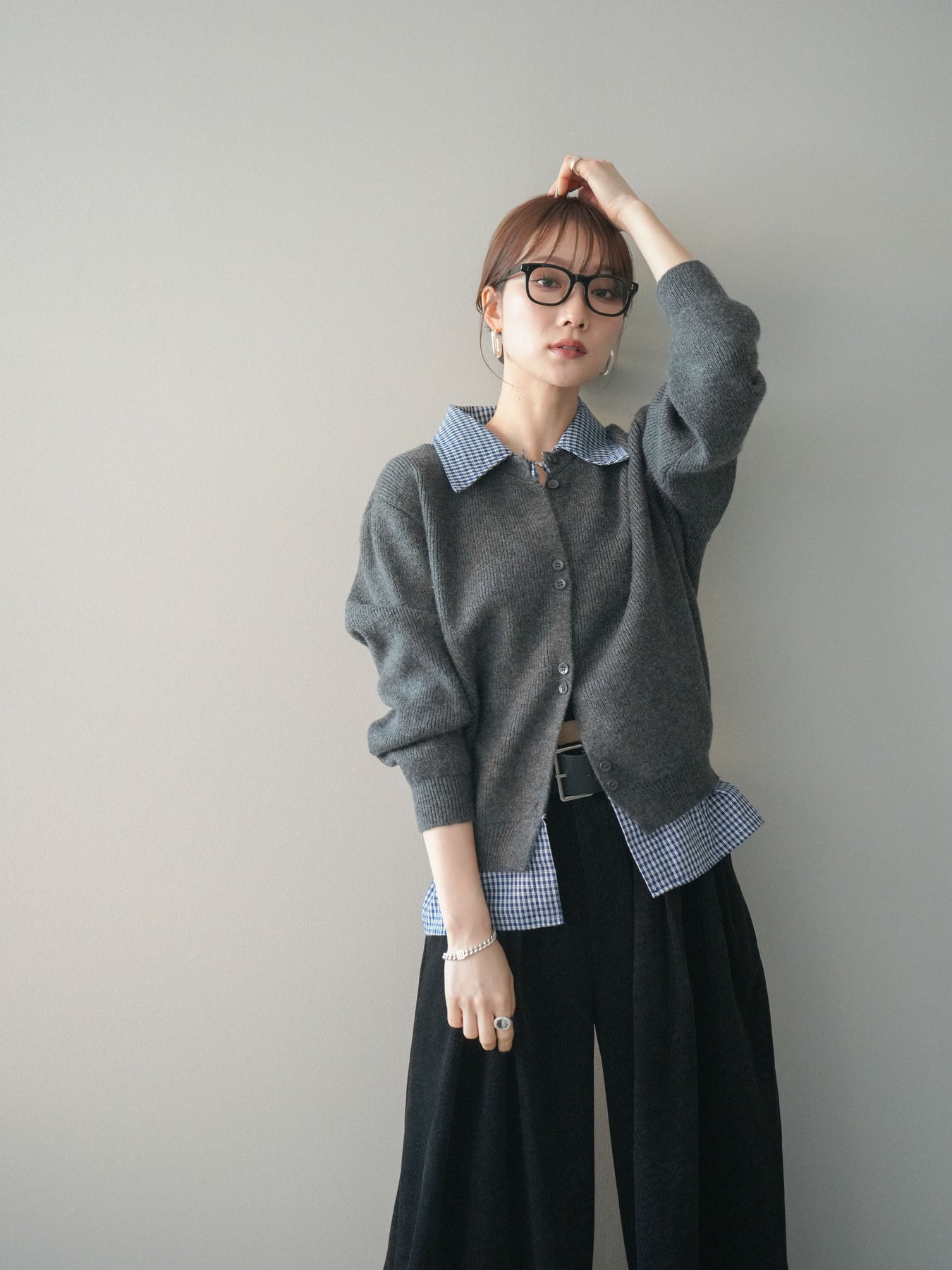 チェック柄のシャツ襟をドッキングしたデザインが目を引くニットカーディガン。襟元と裾から覗くシャツ地がレイヤード風のアクセントとなり、1枚でスタイリングが決まる主役級のアイテムです。ほどよい厚みのニットは柔らかく、ゆったりとしたシルエットが抜け感のある雰囲気に。ボタンを留めてトップス風に着るのはもちろん、羽織りとしても活躍し、デニムからスカートまで幅広いコーディネートと相性良く楽しめます。 ※ボトムス、キャミソール(インナー)以外の商品は一律でインナーは付属していません。