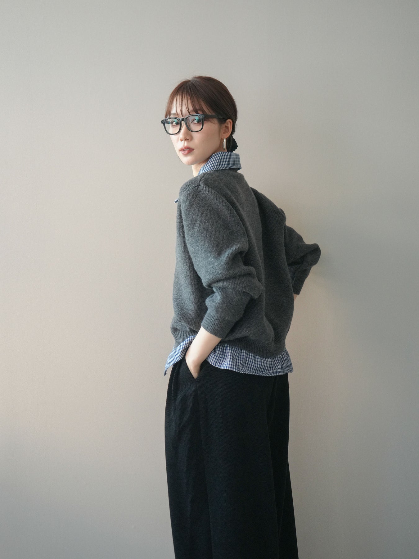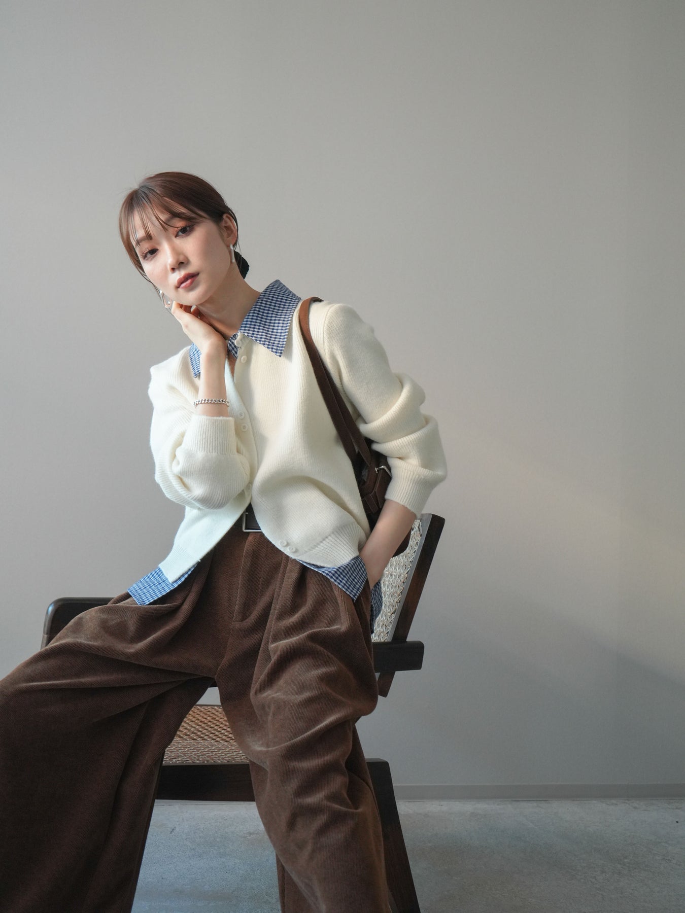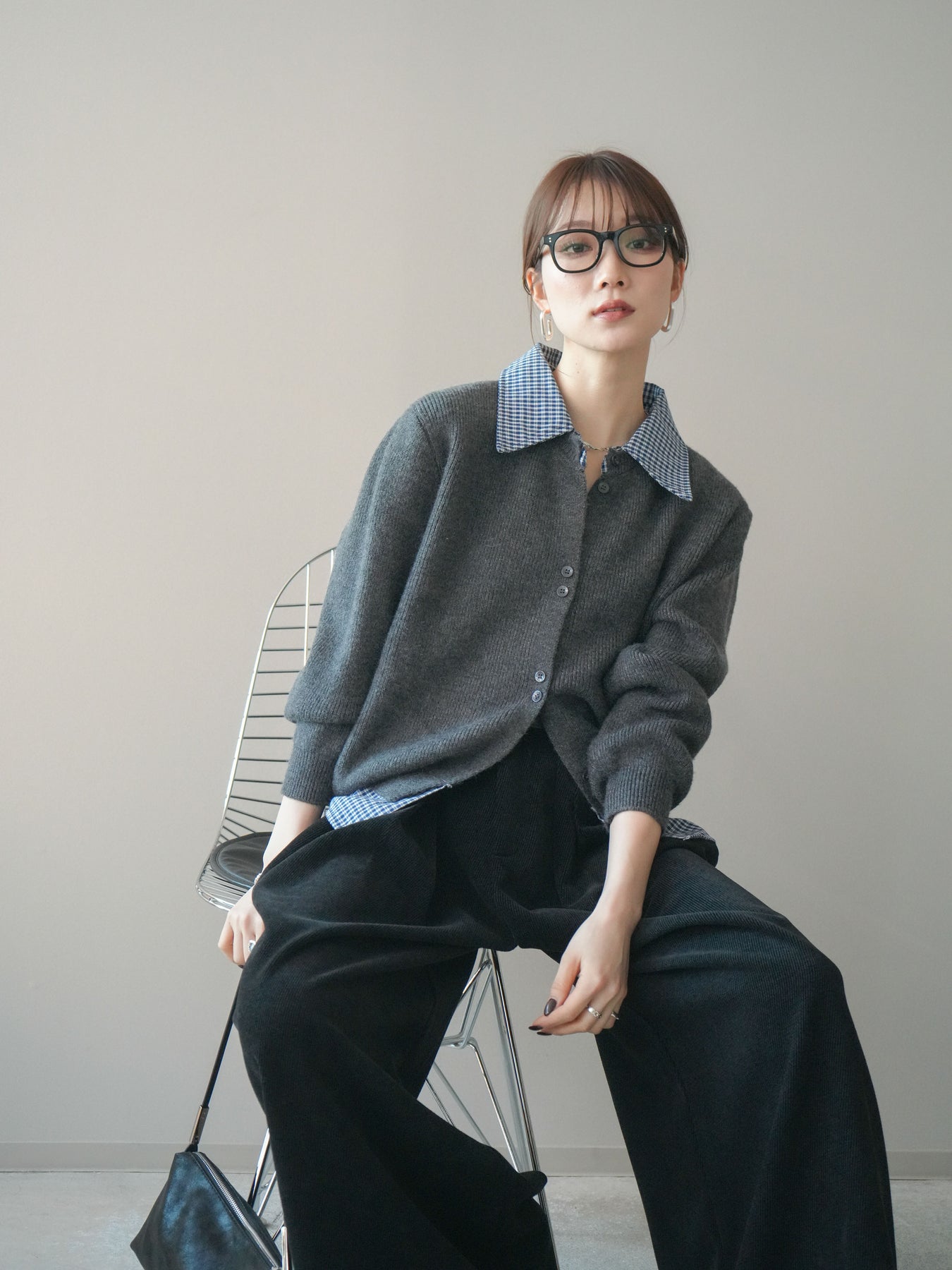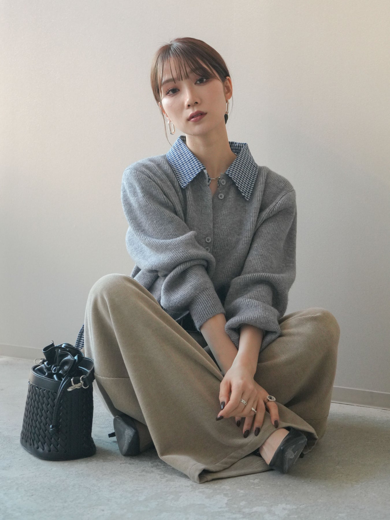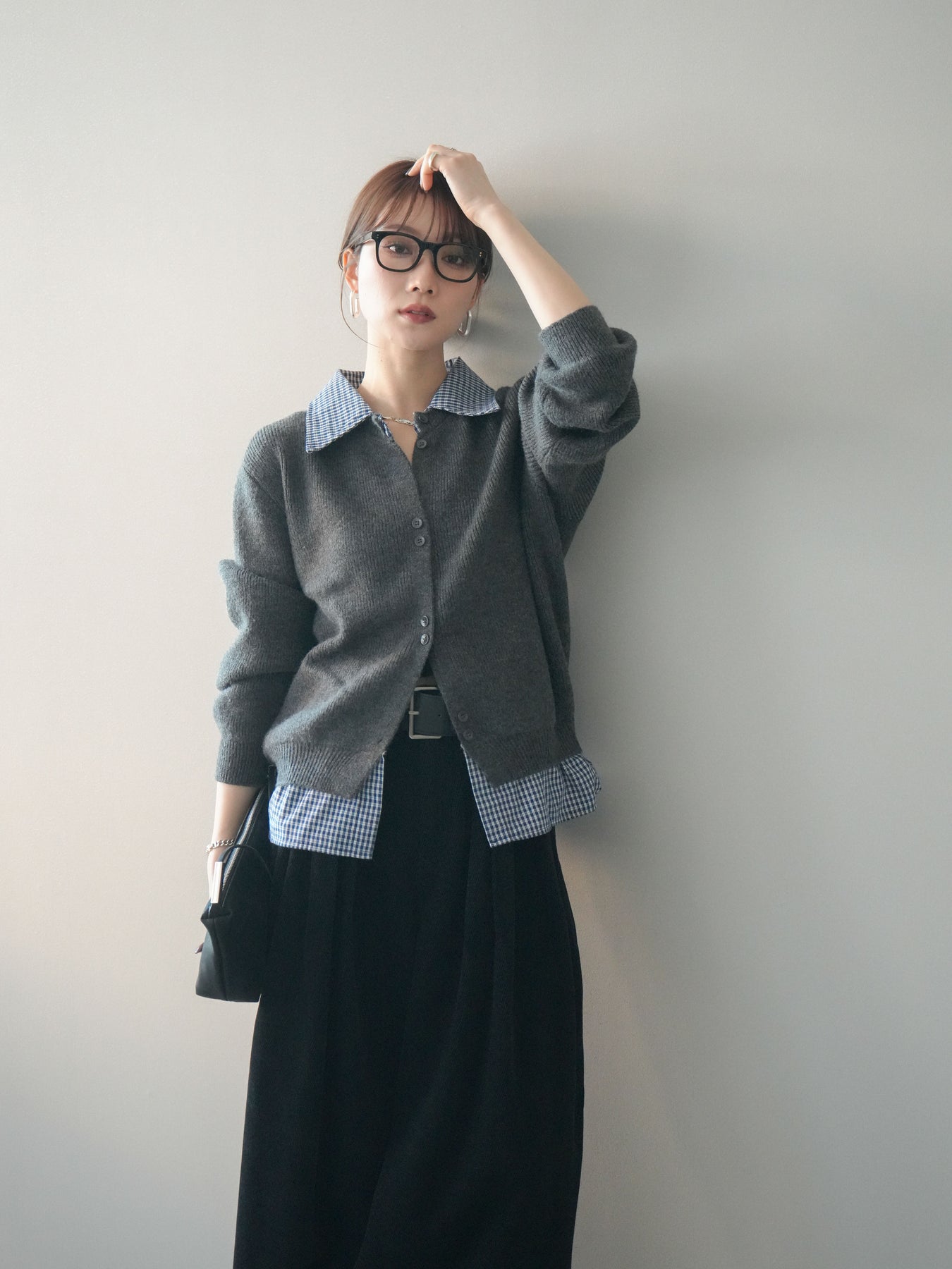 チェック柄のシャツ襟をドッキングしたデザインが目を引くニットカーディガン。襟元と裾から覗くシャツ地がレイヤード風のアクセントとなり、1枚でスタイリングが決まる主役級のアイテムです。ほどよい厚みのニットは柔らかく、ゆったりとしたシルエットが抜け感のある雰囲気に。ボタンを留めてトップス風に着るのはもちろん、羽織りとしても活躍し、デニムからスカートまで幅広いコーディネートと相性良く楽しめます。 ※ボトムス、キャミソール(インナー)以外の商品は一律でインナーは付属していません。