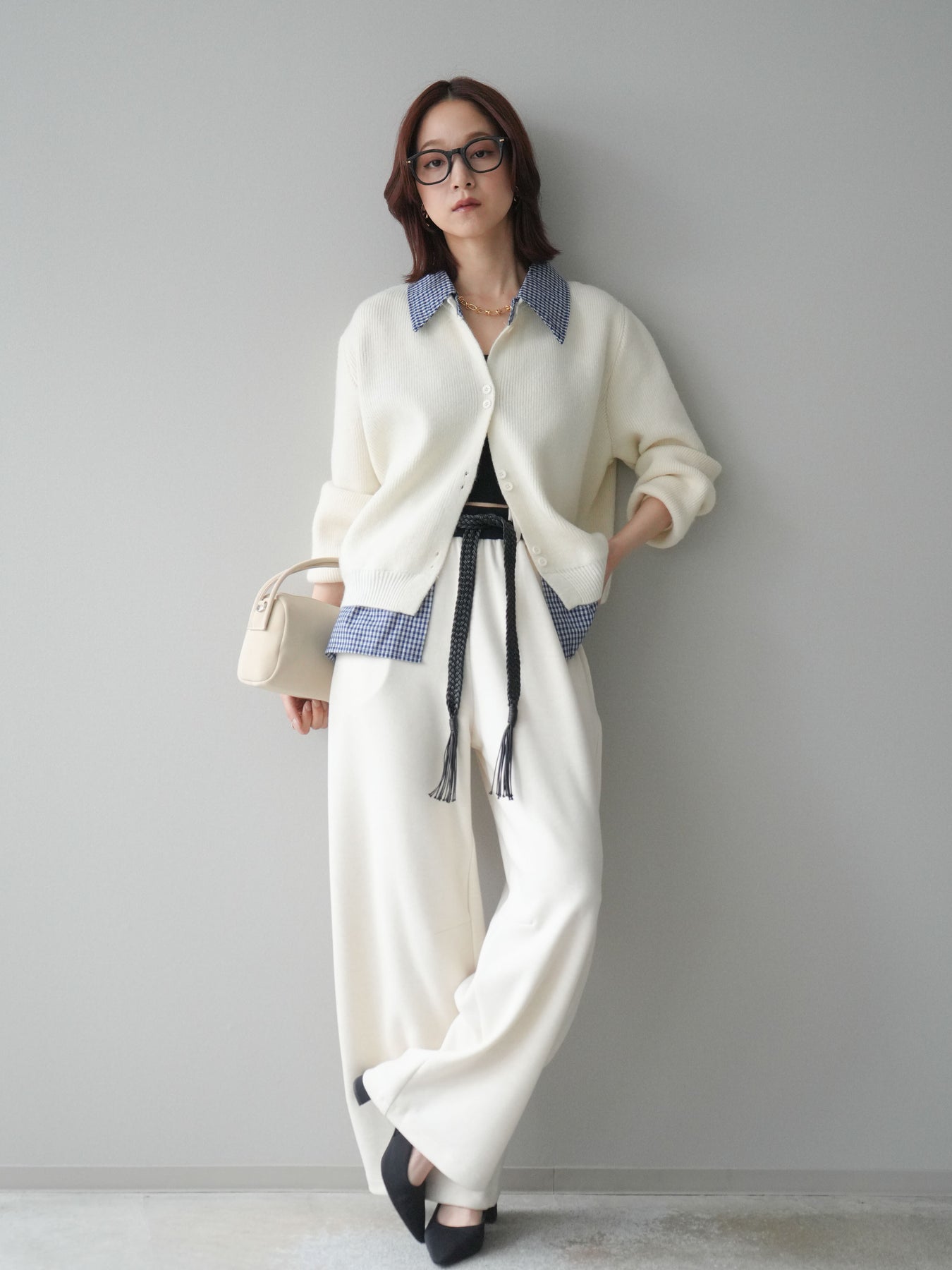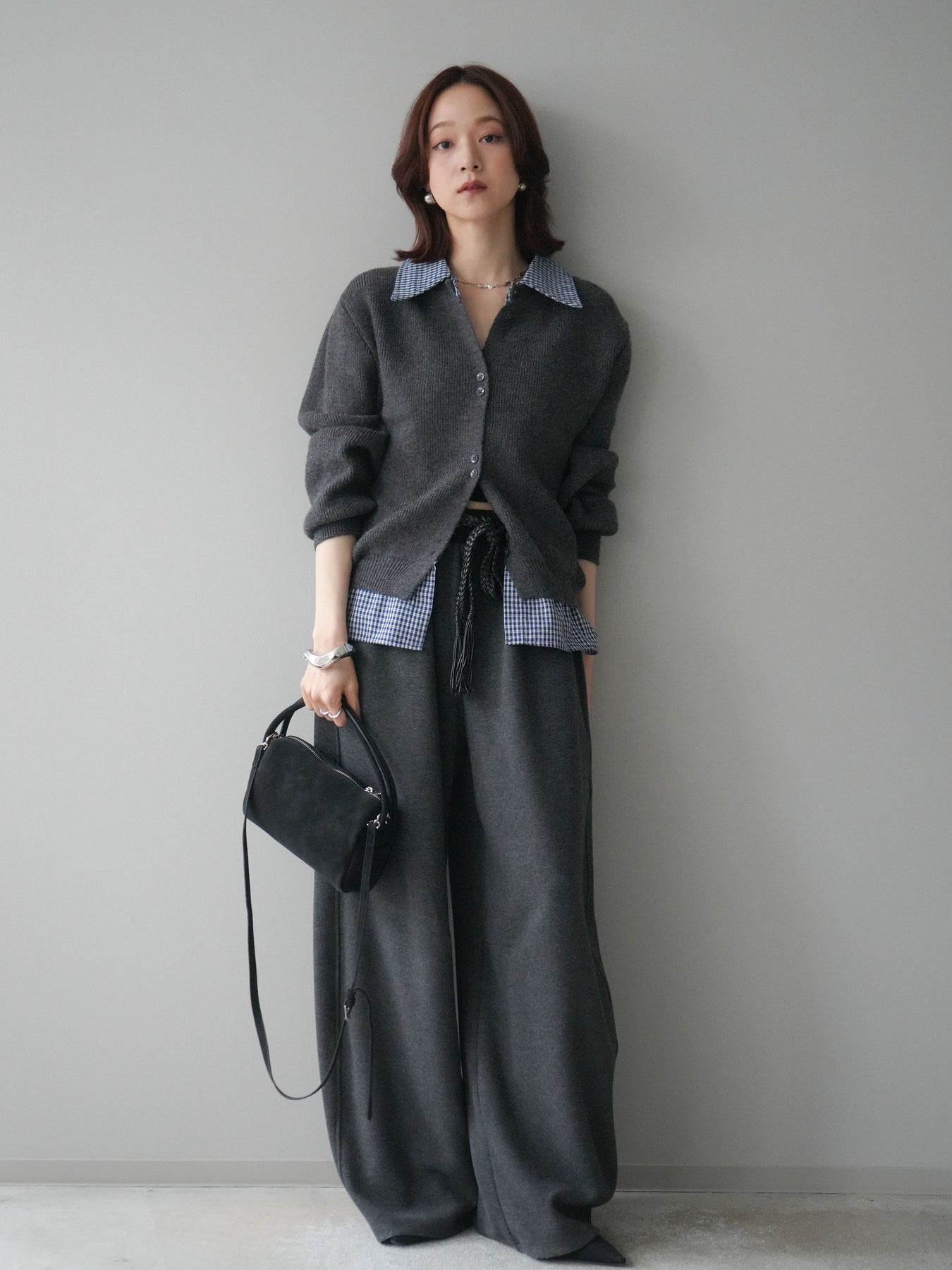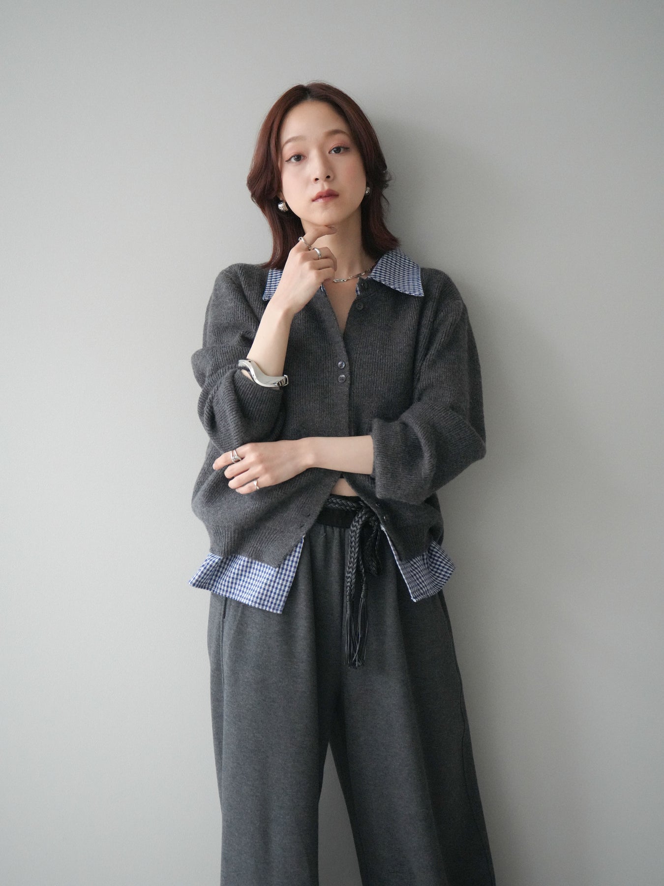 [SET]チェックシャツ襟ニットカーディガン+編み込みベルト付きウエスト配色スエットパンツ(2set)