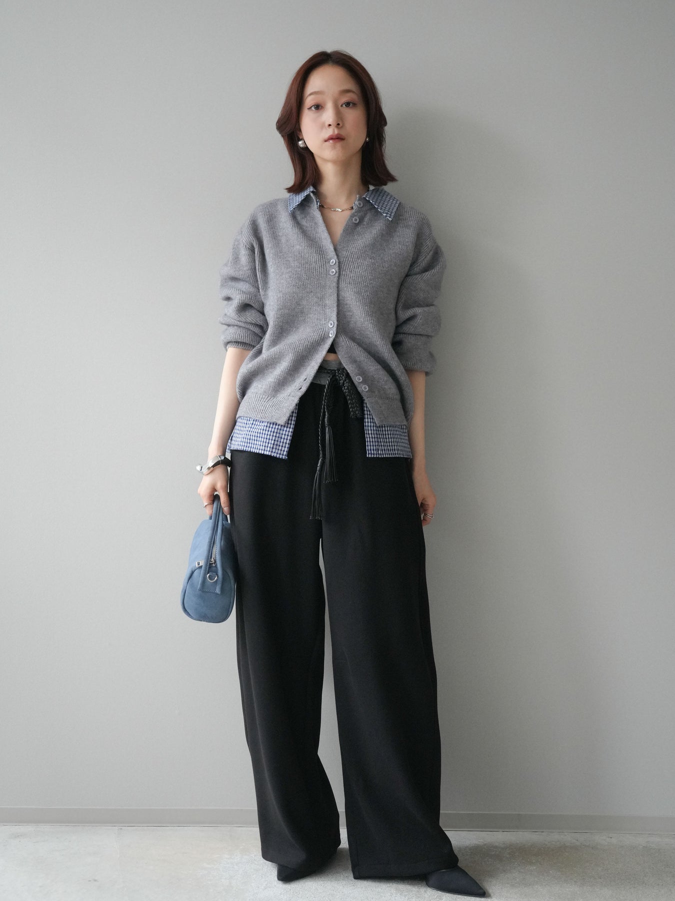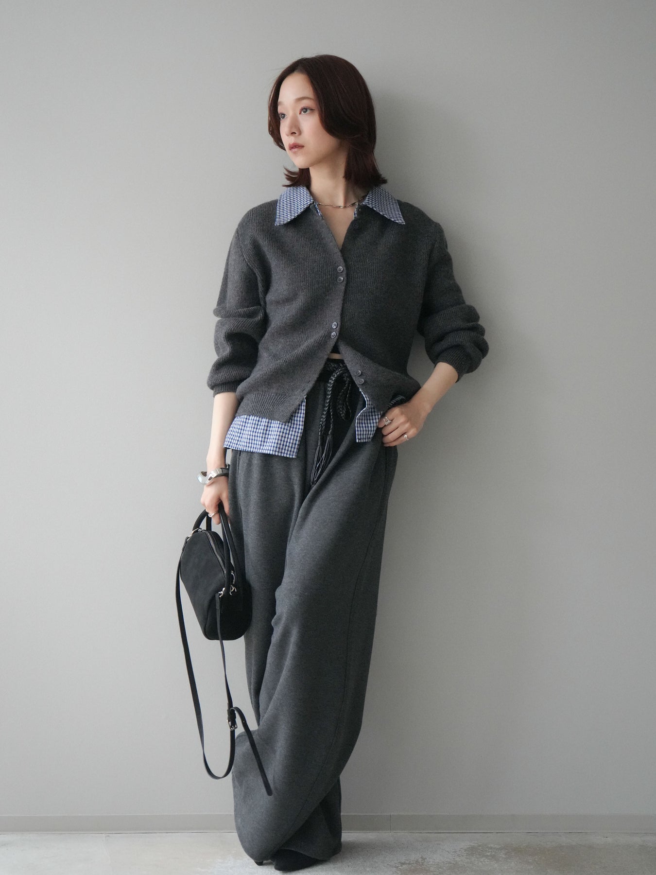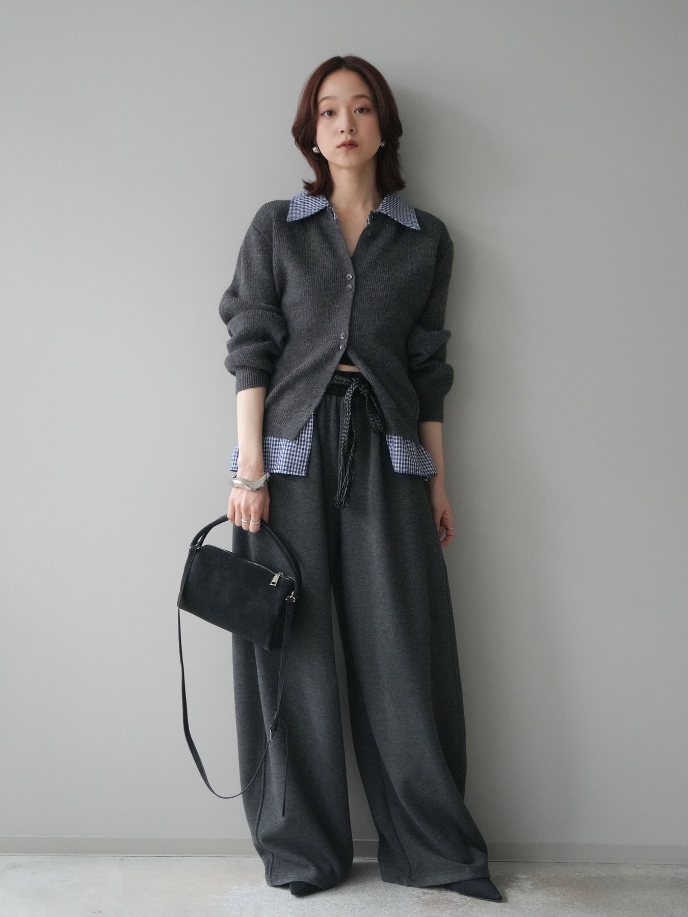 [SET]チェックシャツ襟ニットカーディガン+編み込みベルト付きウエスト配色スエットパンツ(2set)