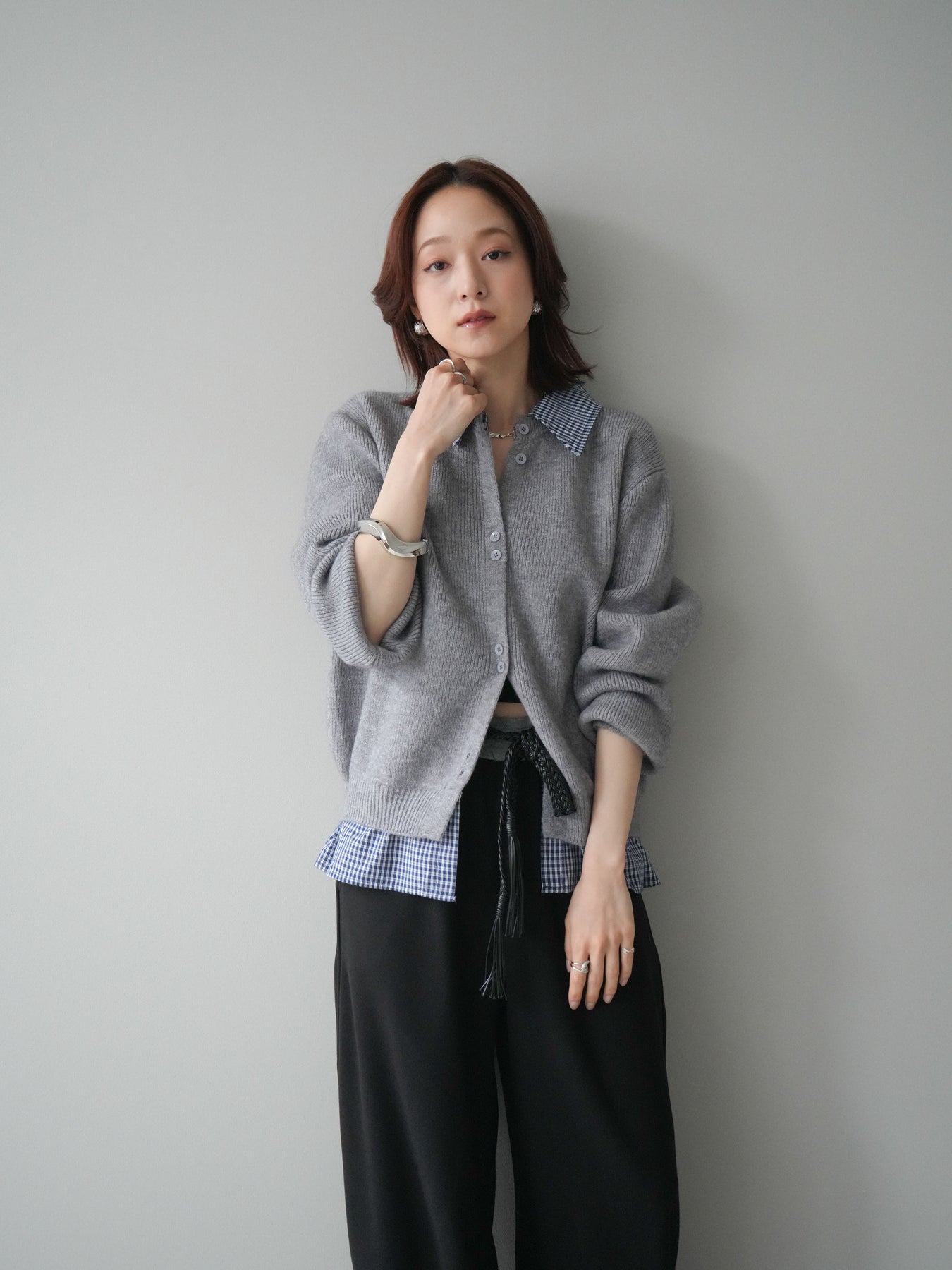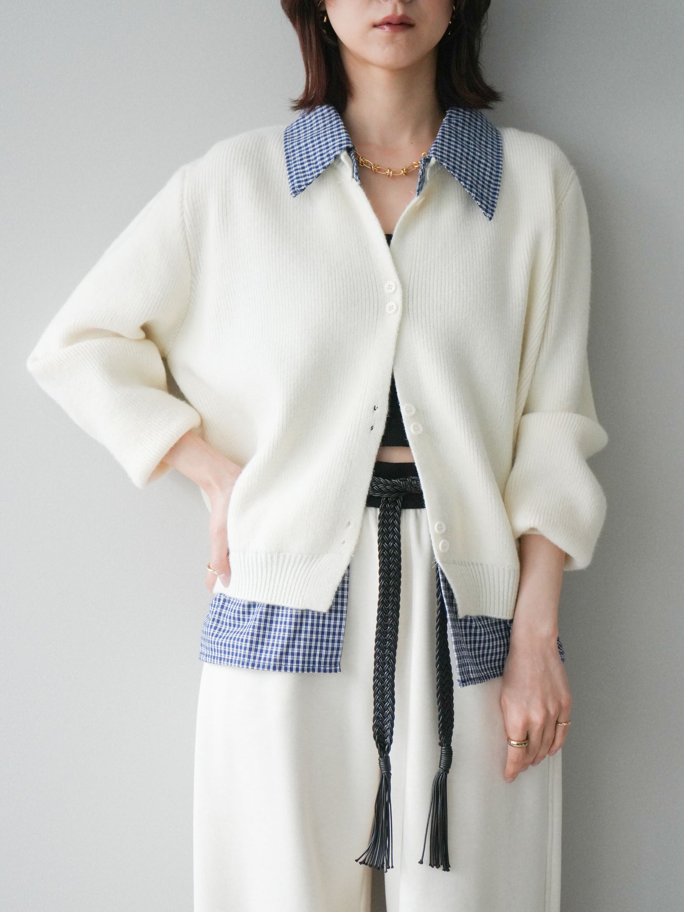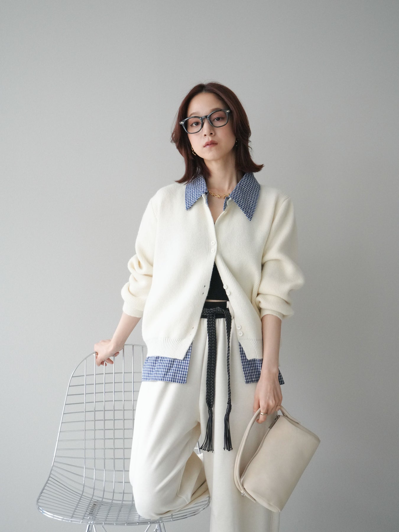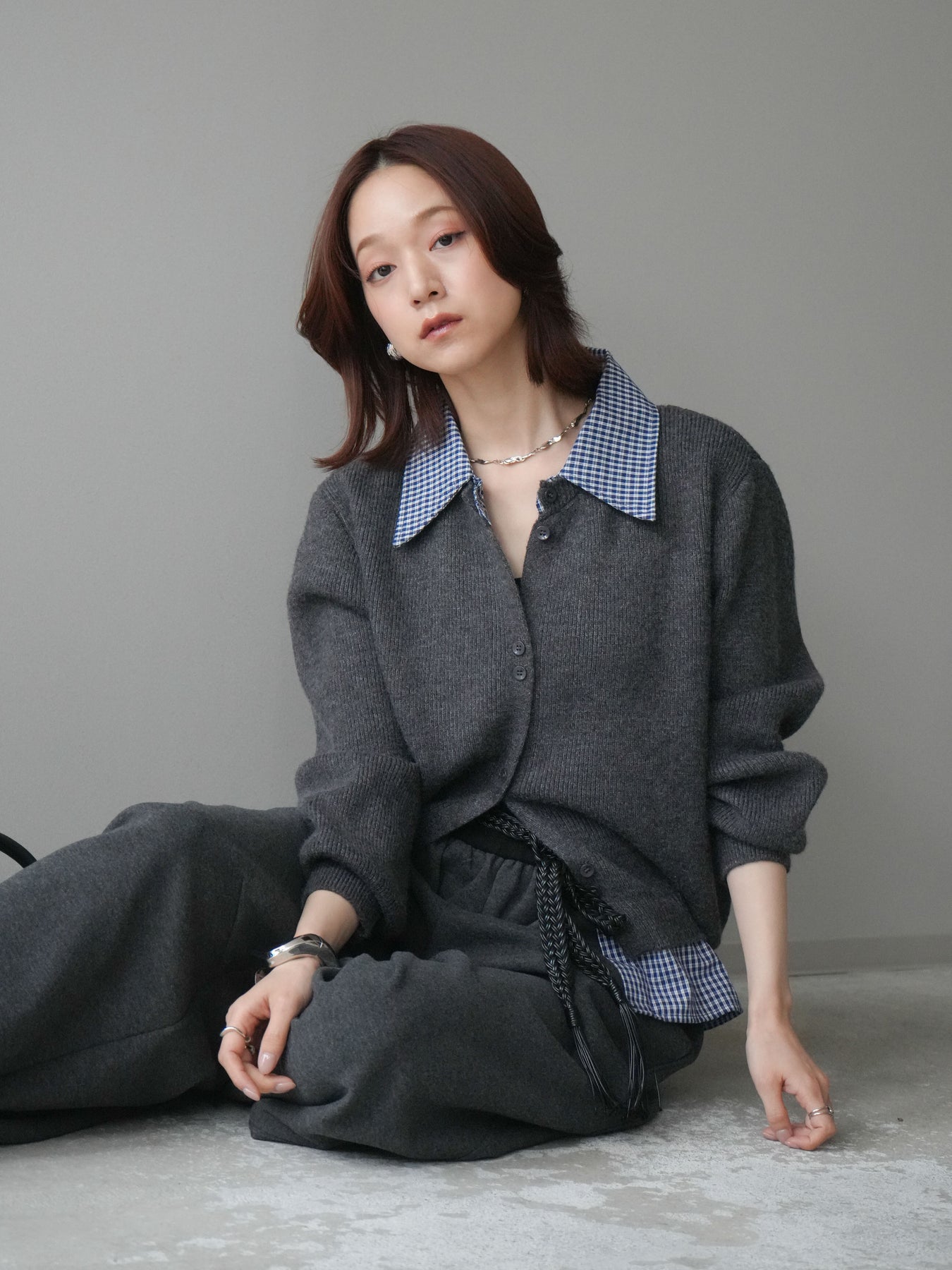 チェック柄のシャツ襟をドッキングしたデザインが目を引くニットカーディガン。襟元と裾から覗くシャツ地がレイヤード風のアクセントとなり、1枚でスタイリングが決まる主役級のアイテムです。ほどよい厚みのニットは柔らかく、ゆったりとしたシルエットが抜け感のある雰囲気に。ボタンを留めてトップス風に着るのはもちろん、羽織りとしても活躍し、デニムからスカートまで幅広いコーディネートと相性良く楽しめます。 ※ボトムス、キャミソール(インナー)以外の商品は一律でインナーは付属していません。