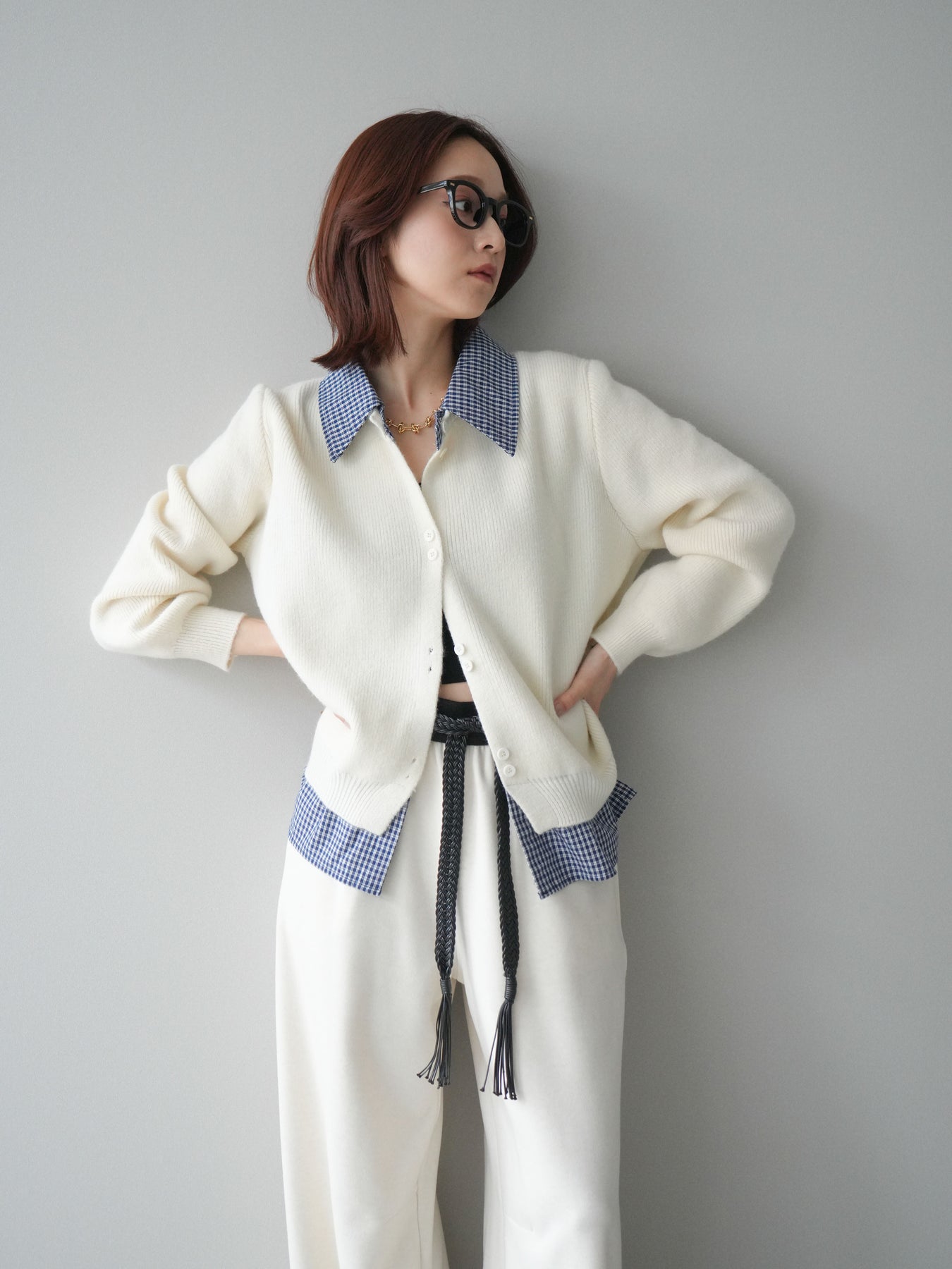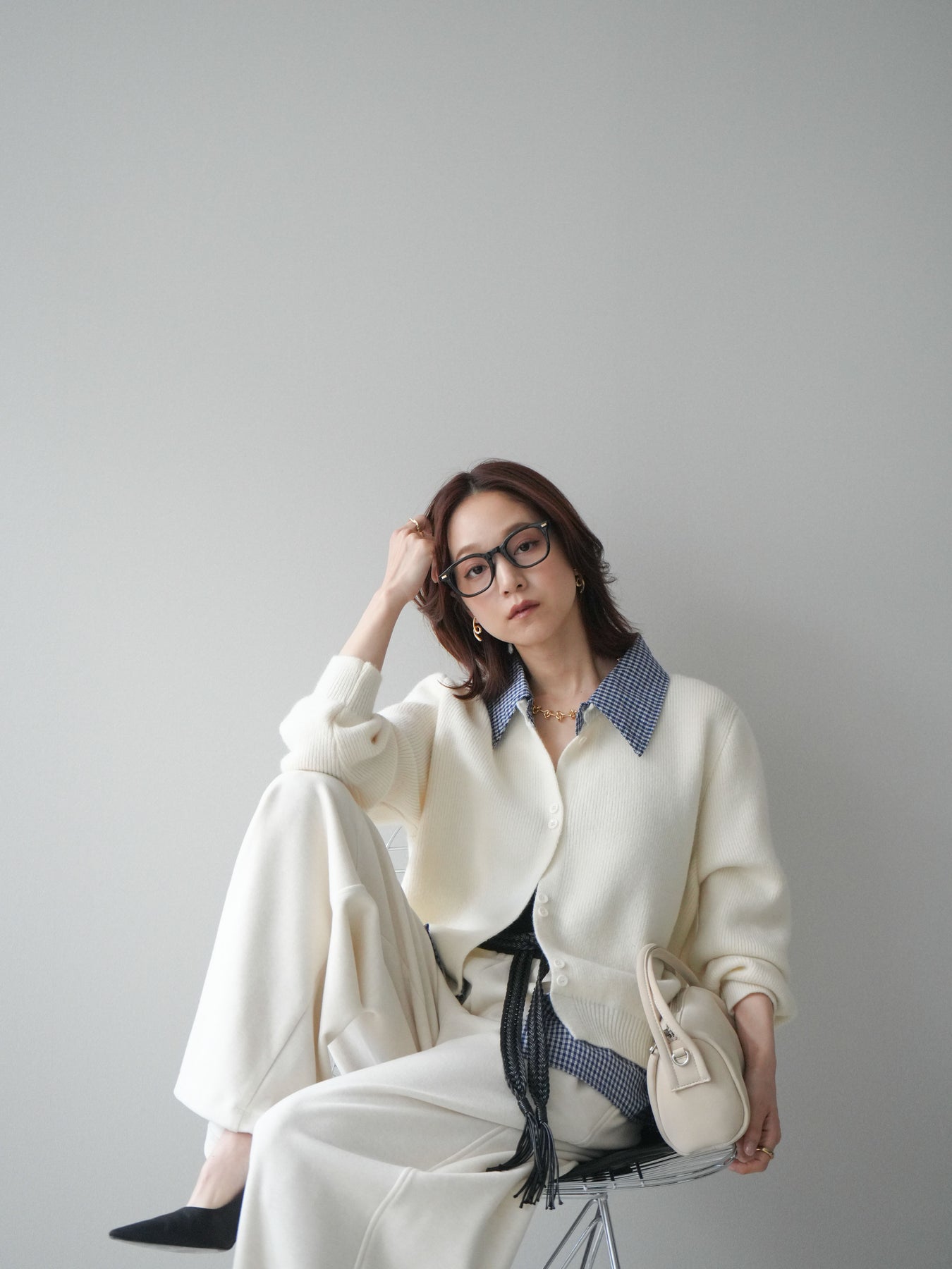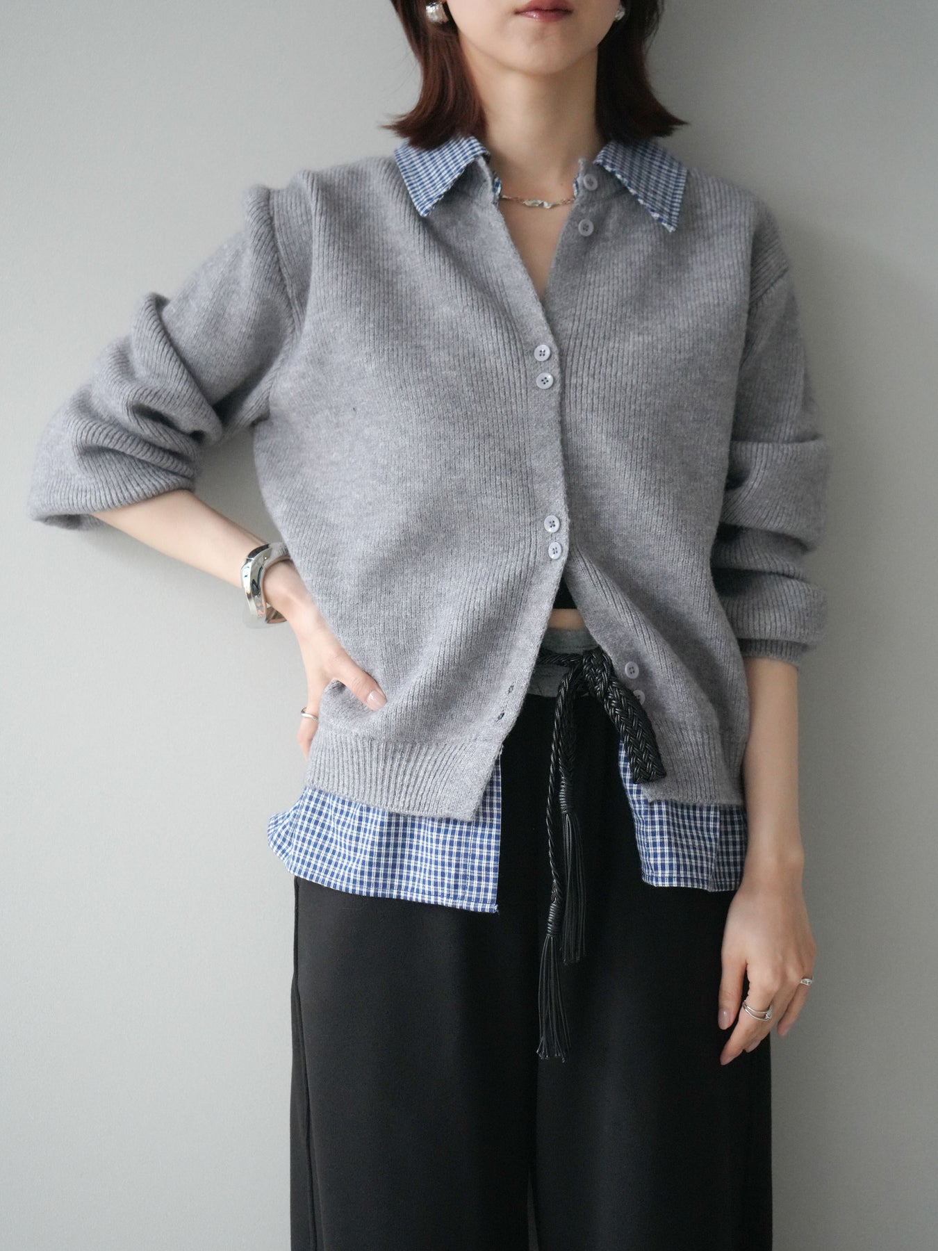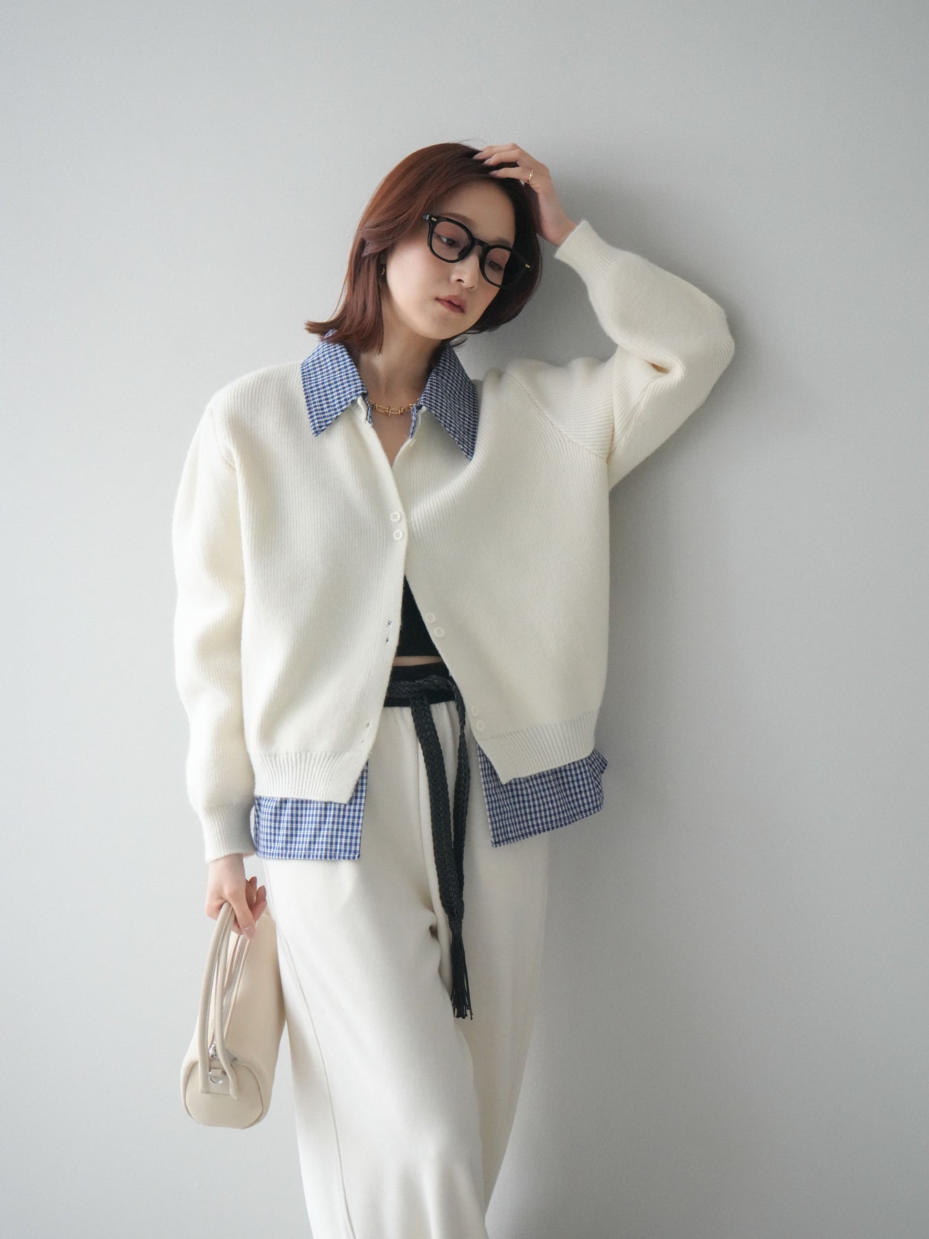 チェック柄のシャツ襟をドッキングしたデザインが目を引くニットカーディガン。襟元と裾から覗くシャツ地がレイヤード風のアクセントとなり、1枚でスタイリングが決まる主役級のアイテムです。ほどよい厚みのニットは柔らかく、ゆったりとしたシルエットが抜け感のある雰囲気に。ボタンを留めてトップス風に着るのはもちろん、羽織りとしても活躍し、デニムからスカートまで幅広いコーディネートと相性良く楽しめます。 ※ボトムス、キャミソール(インナー)以外の商品は一律でインナーは付属していません。