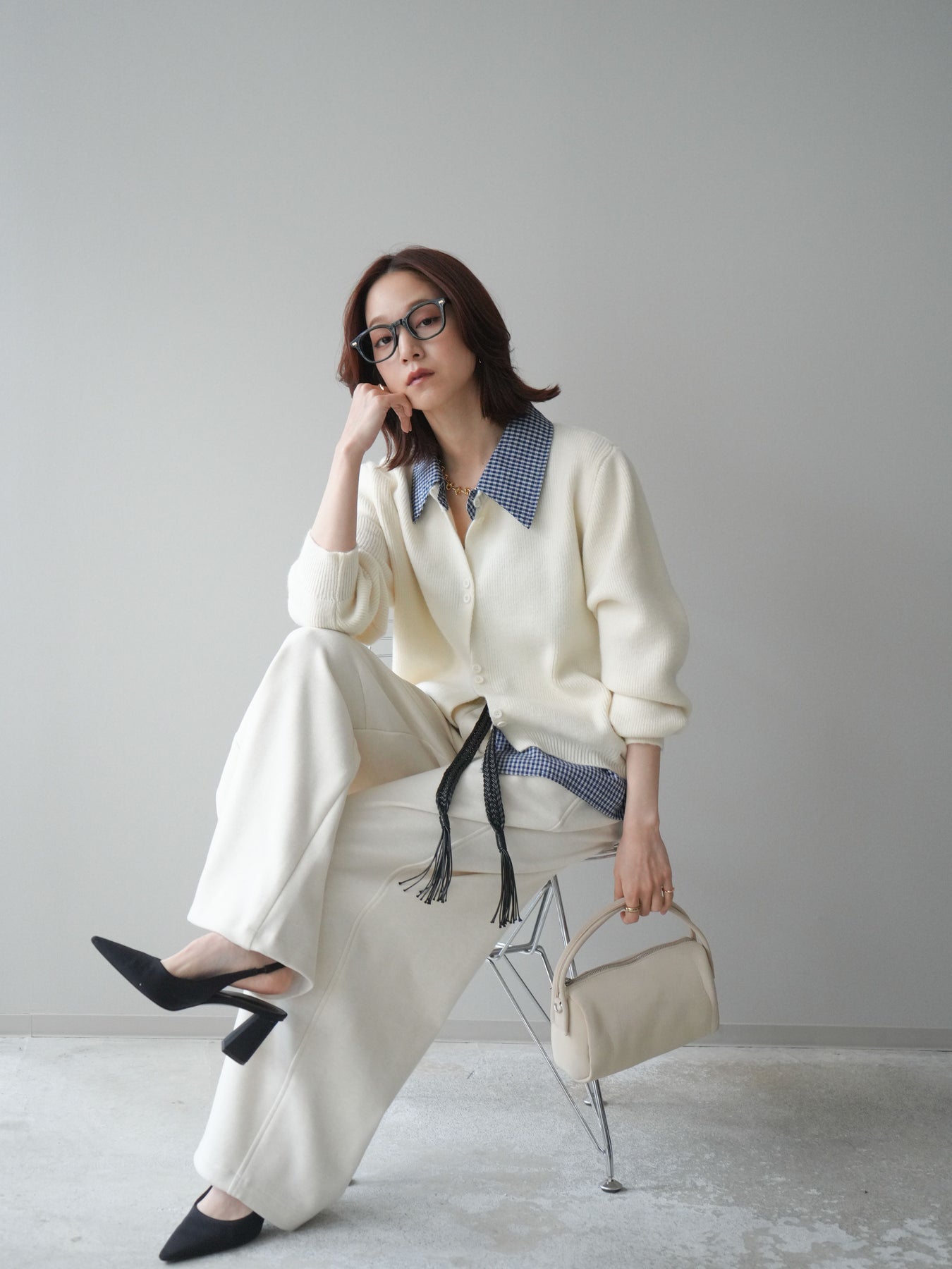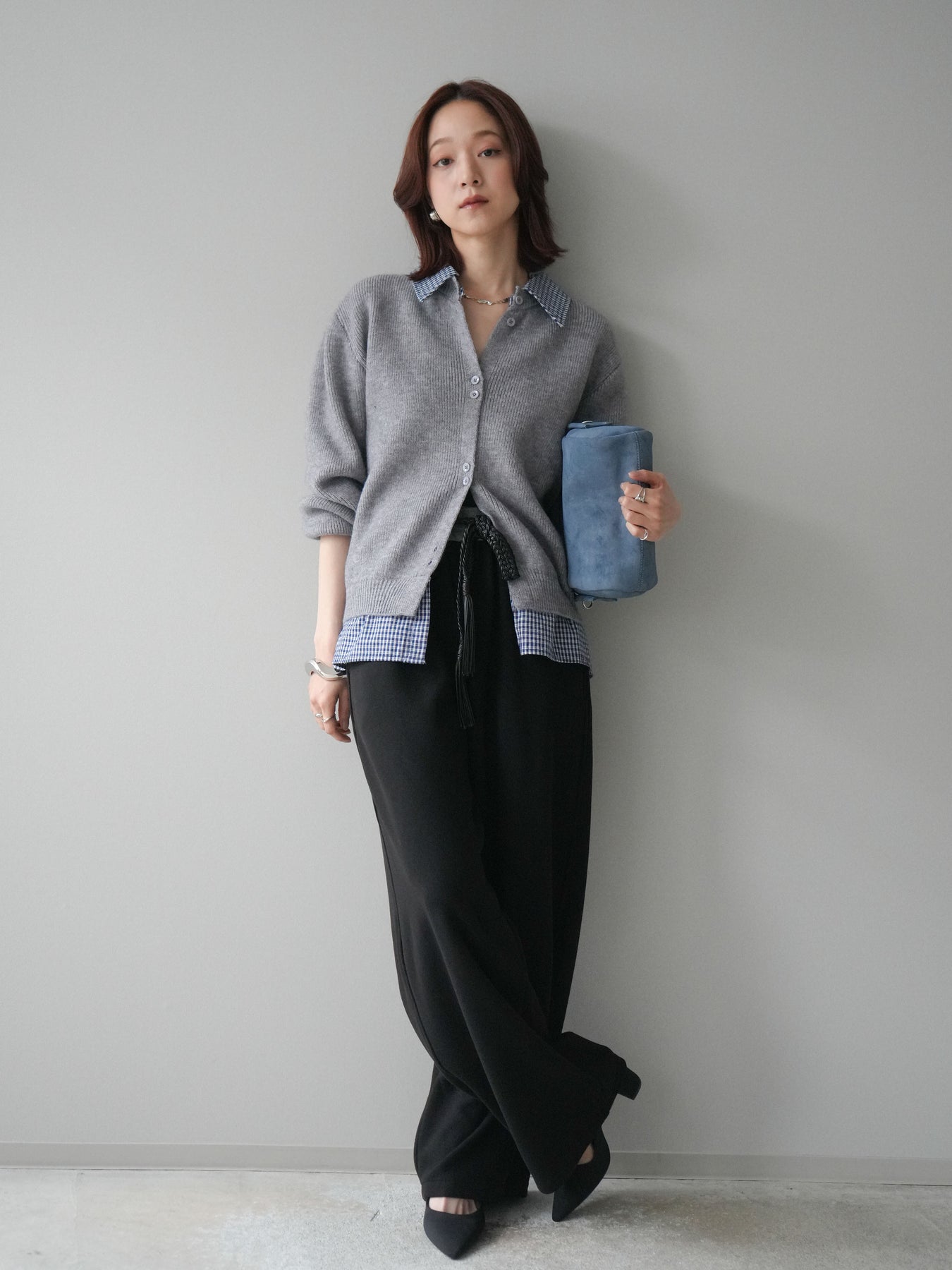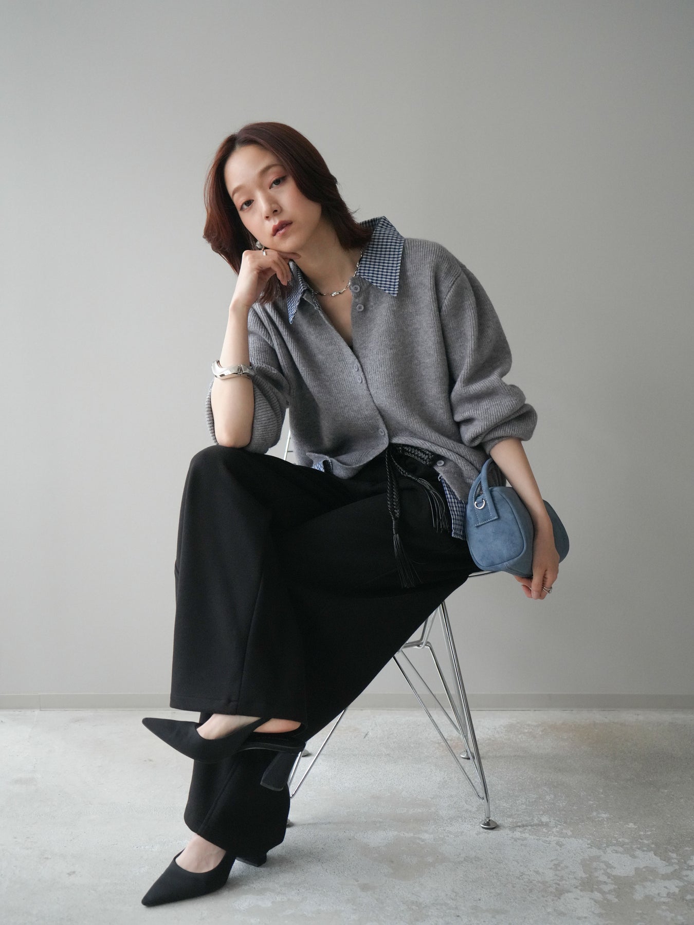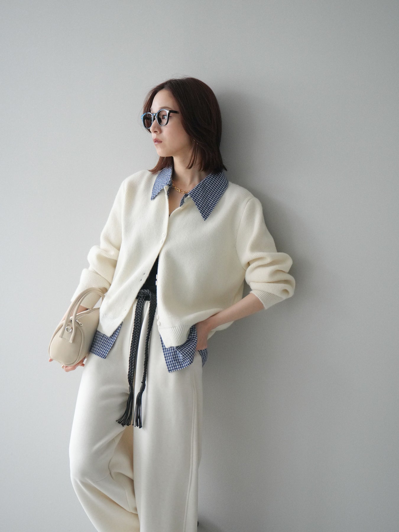 チェック柄のシャツ襟をドッキングしたデザインが目を引くニットカーディガン。襟元と裾から覗くシャツ地がレイヤード風のアクセントとなり、1枚でスタイリングが決まる主役級のアイテムです。ほどよい厚みのニットは柔らかく、ゆったりとしたシルエットが抜け感のある雰囲気に。ボタンを留めてトップス風に着るのはもちろん、羽織りとしても活躍し、デニムからスカートまで幅広いコーディネートと相性良く楽しめます。 ※ボトムス、キャミソール(インナー)以外の商品は一律でインナーは付属していません。