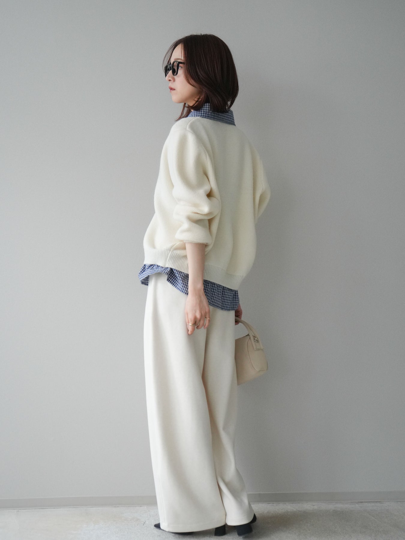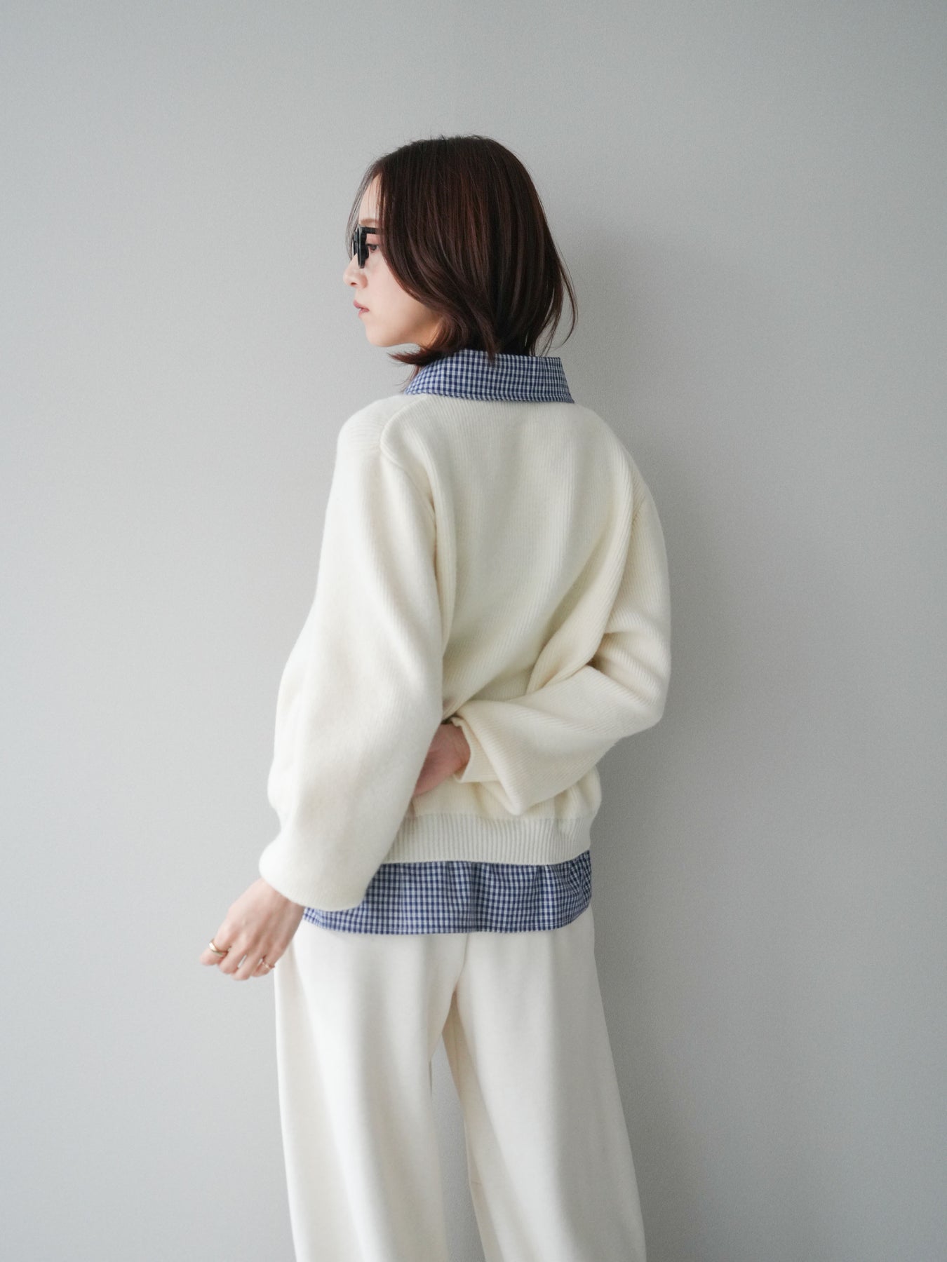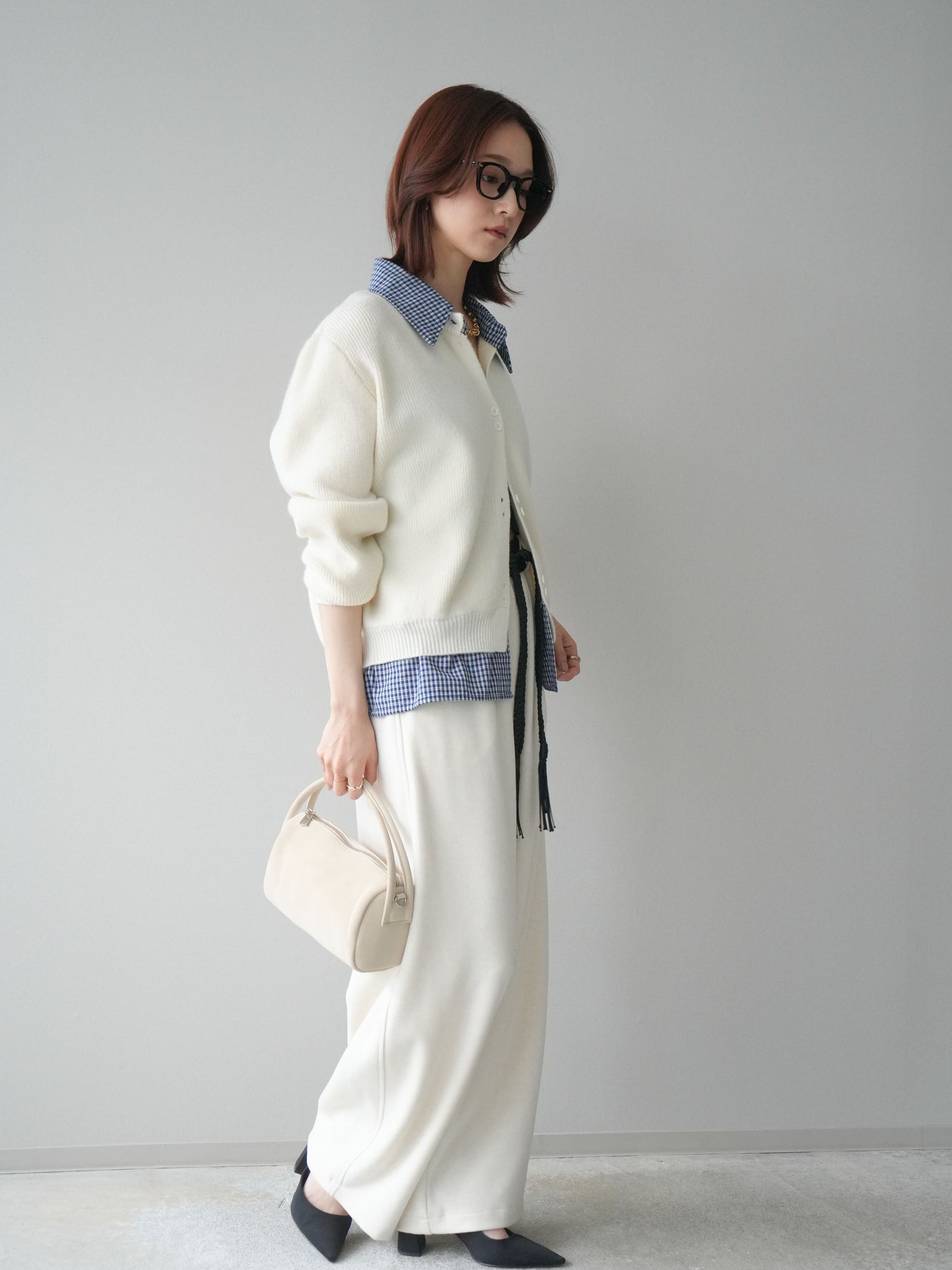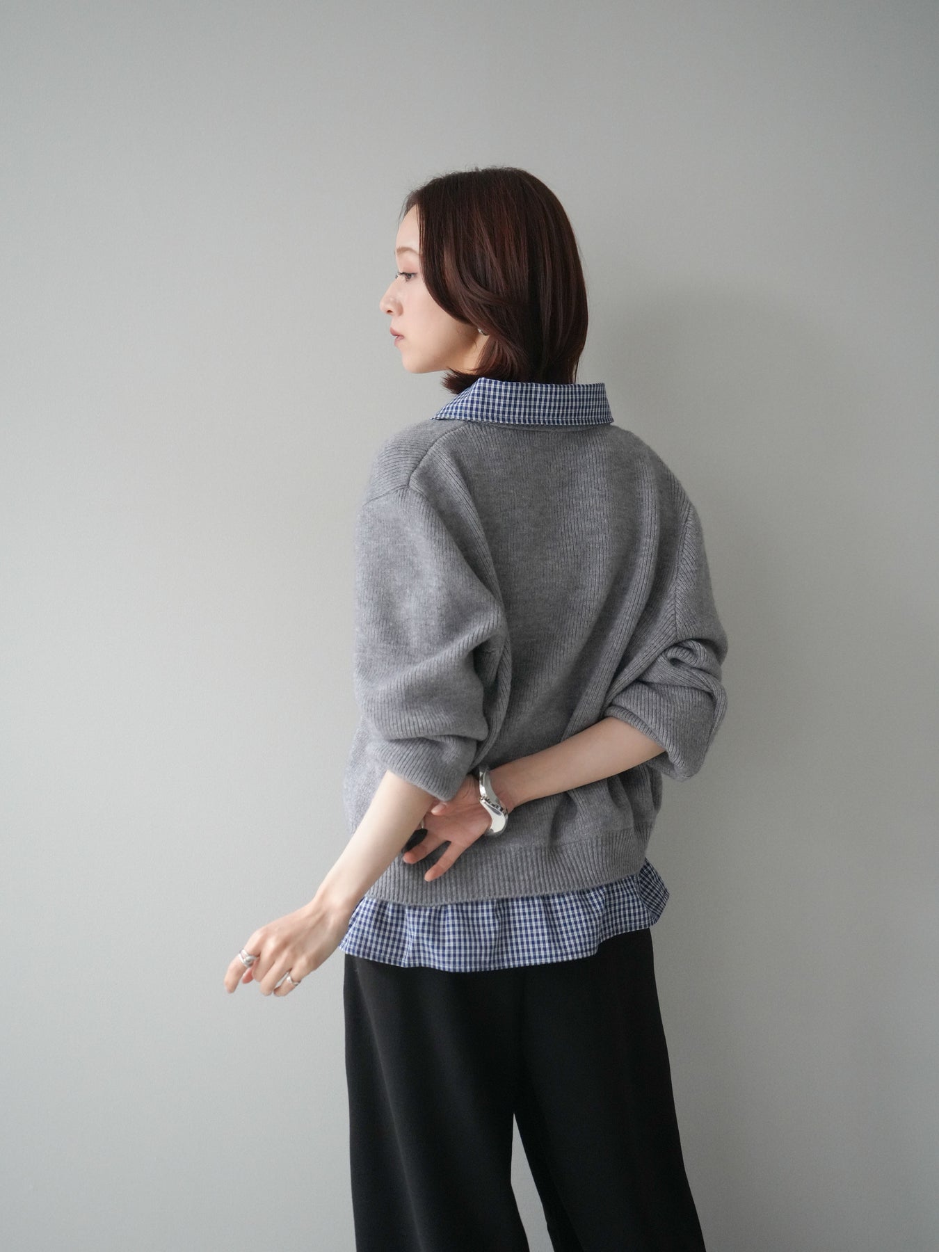 チェック柄のシャツ襟をドッキングしたデザインが目を引くニットカーディガン。襟元と裾から覗くシャツ地がレイヤード風のアクセントとなり、1枚でスタイリングが決まる主役級のアイテムです。ほどよい厚みのニットは柔らかく、ゆったりとしたシルエットが抜け感のある雰囲気に。ボタンを留めてトップス風に着るのはもちろん、羽織りとしても活躍し、デニムからスカートまで幅広いコーディネートと相性良く楽しめます。 ※ボトムス、キャミソール(インナー)以外の商品は一律でインナーは付属していません。