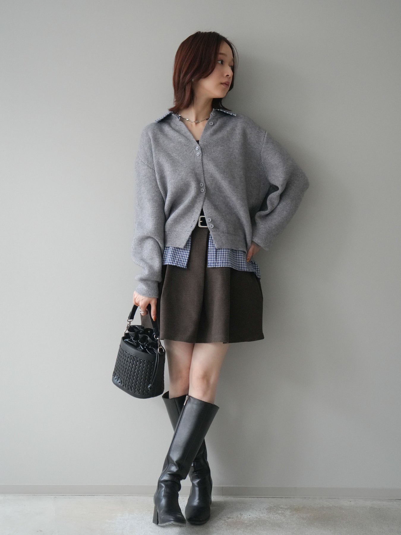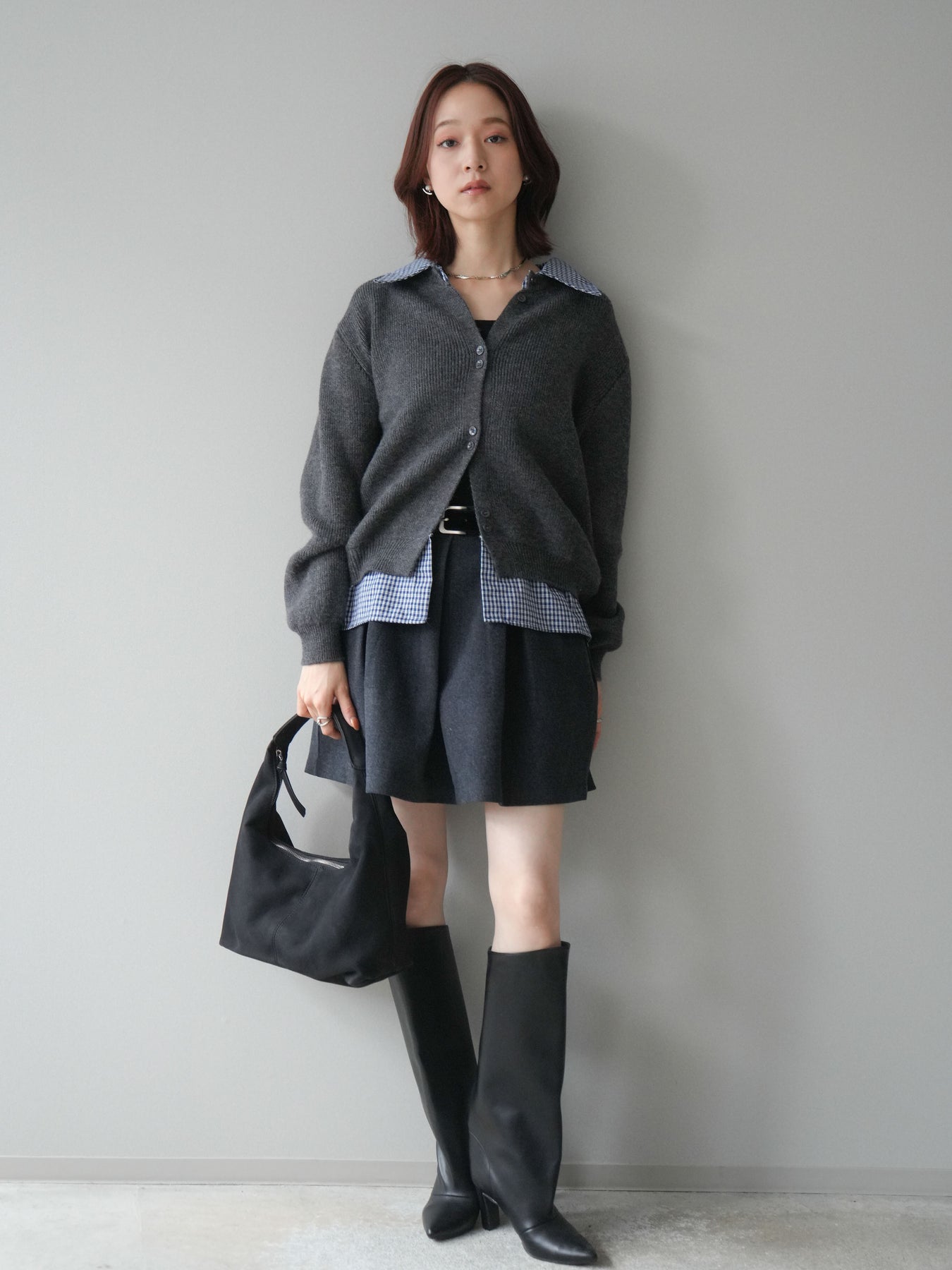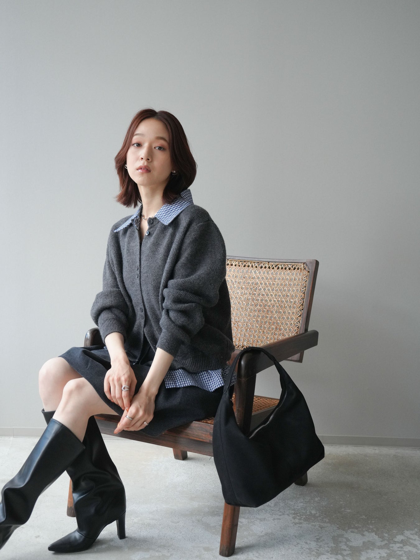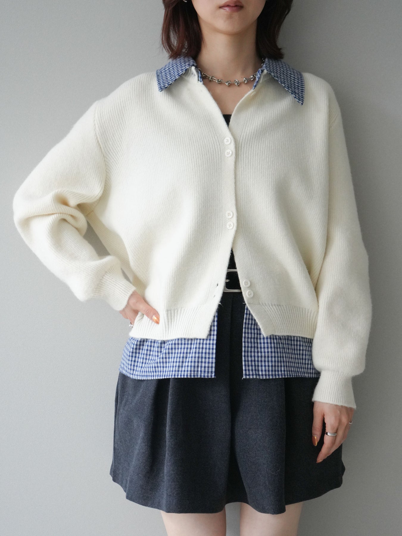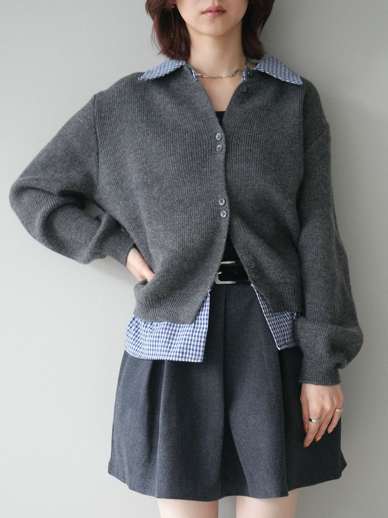 チェック柄のシャツ襟をドッキングしたデザインが目を引くニットカーディガン。襟元と裾から覗くシャツ地がレイヤード風のアクセントとなり、1枚でスタイリングが決まる主役級のアイテムです。ほどよい厚みのニットは柔らかく、ゆったりとしたシルエットが抜け感のある雰囲気に。ボタンを留めてトップス風に着るのはもちろん、羽織りとしても活躍し、デニムからスカートまで幅広いコーディネートと相性良く楽しめます。 ※ボトムス、キャミソール(インナー)以外の商品は一律でインナーは付属していません。
