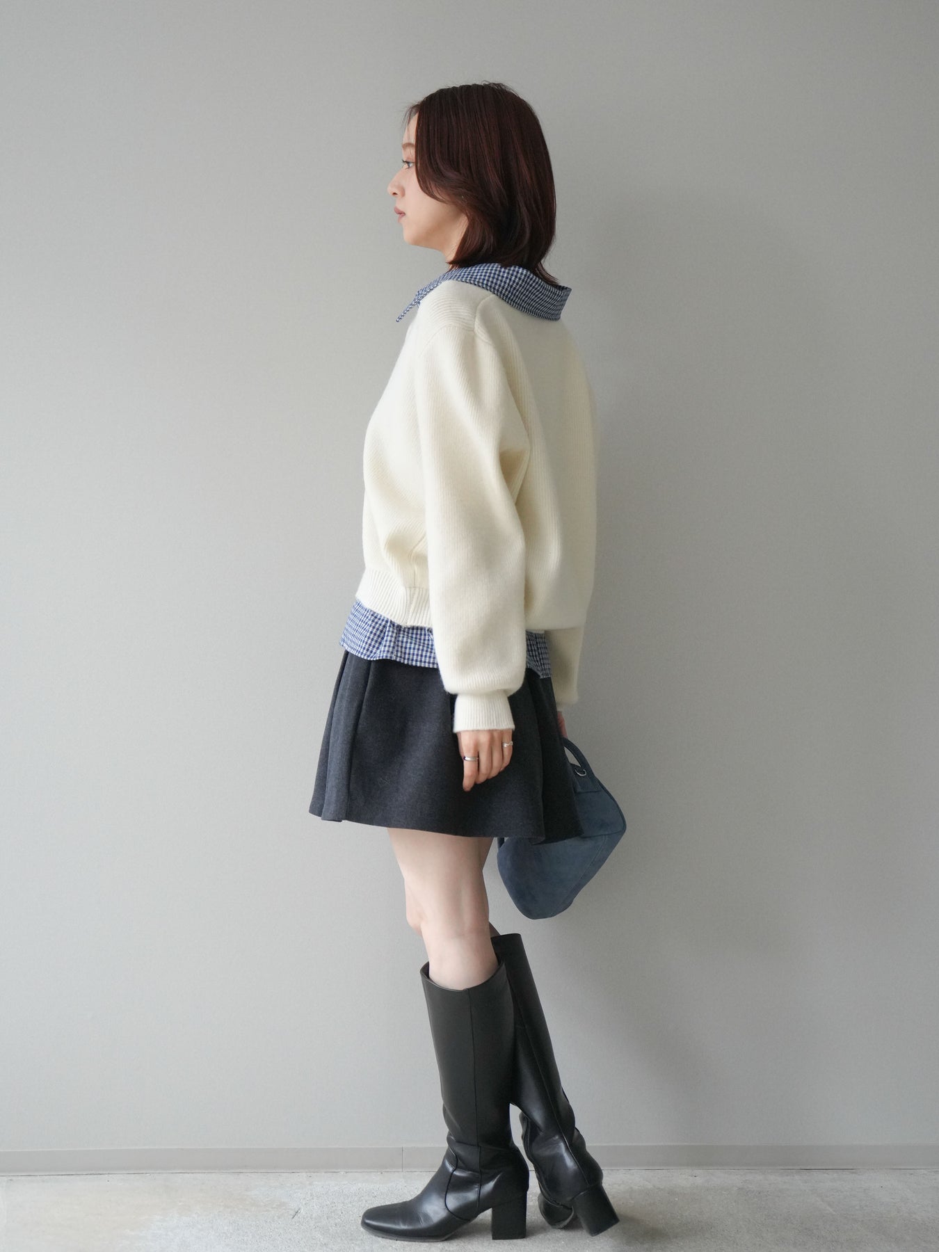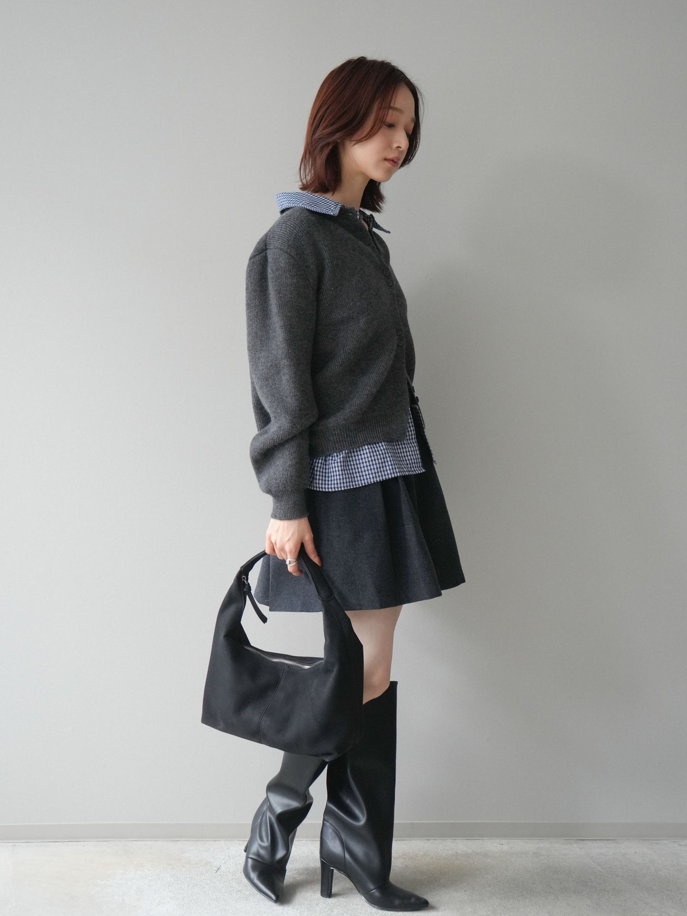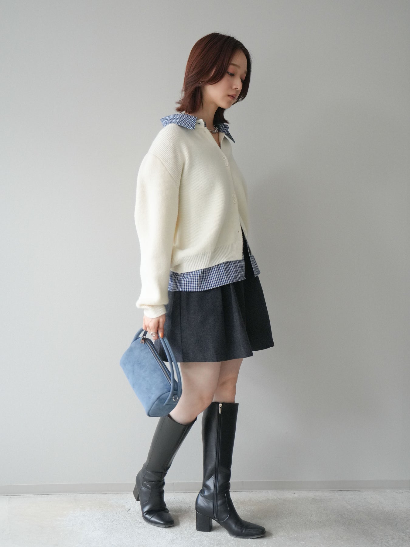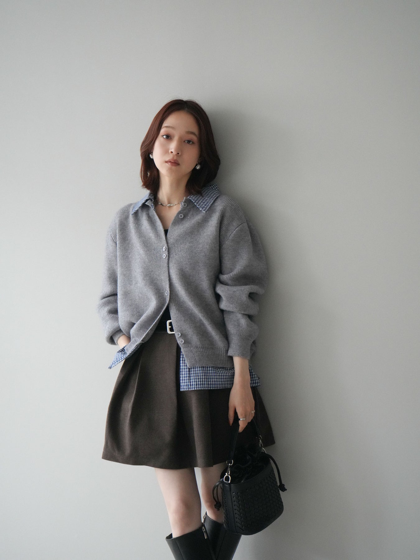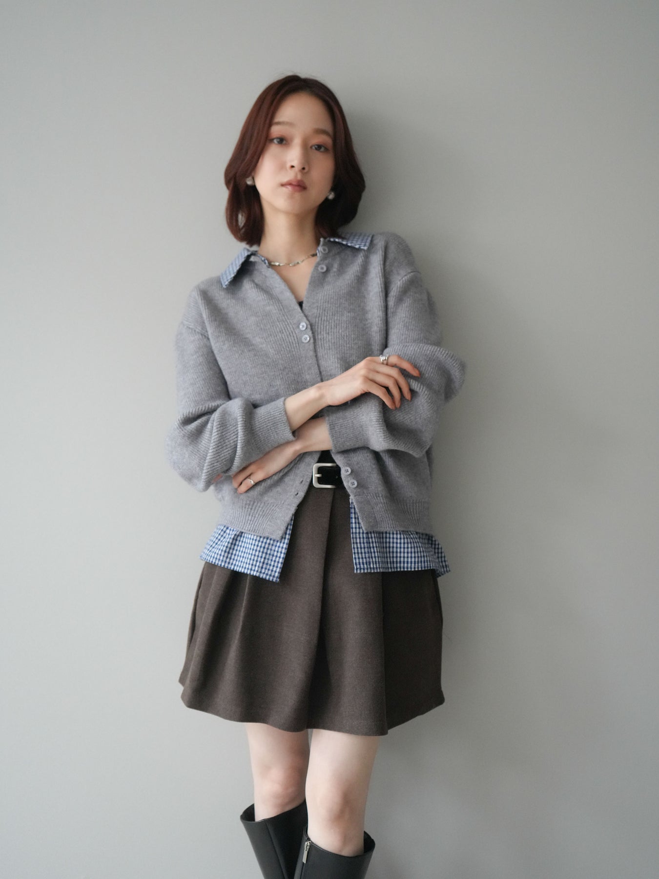 [SET]チェックシャツ襟ニットカーディガン+ベルト付きタックミニスカート(2set)
