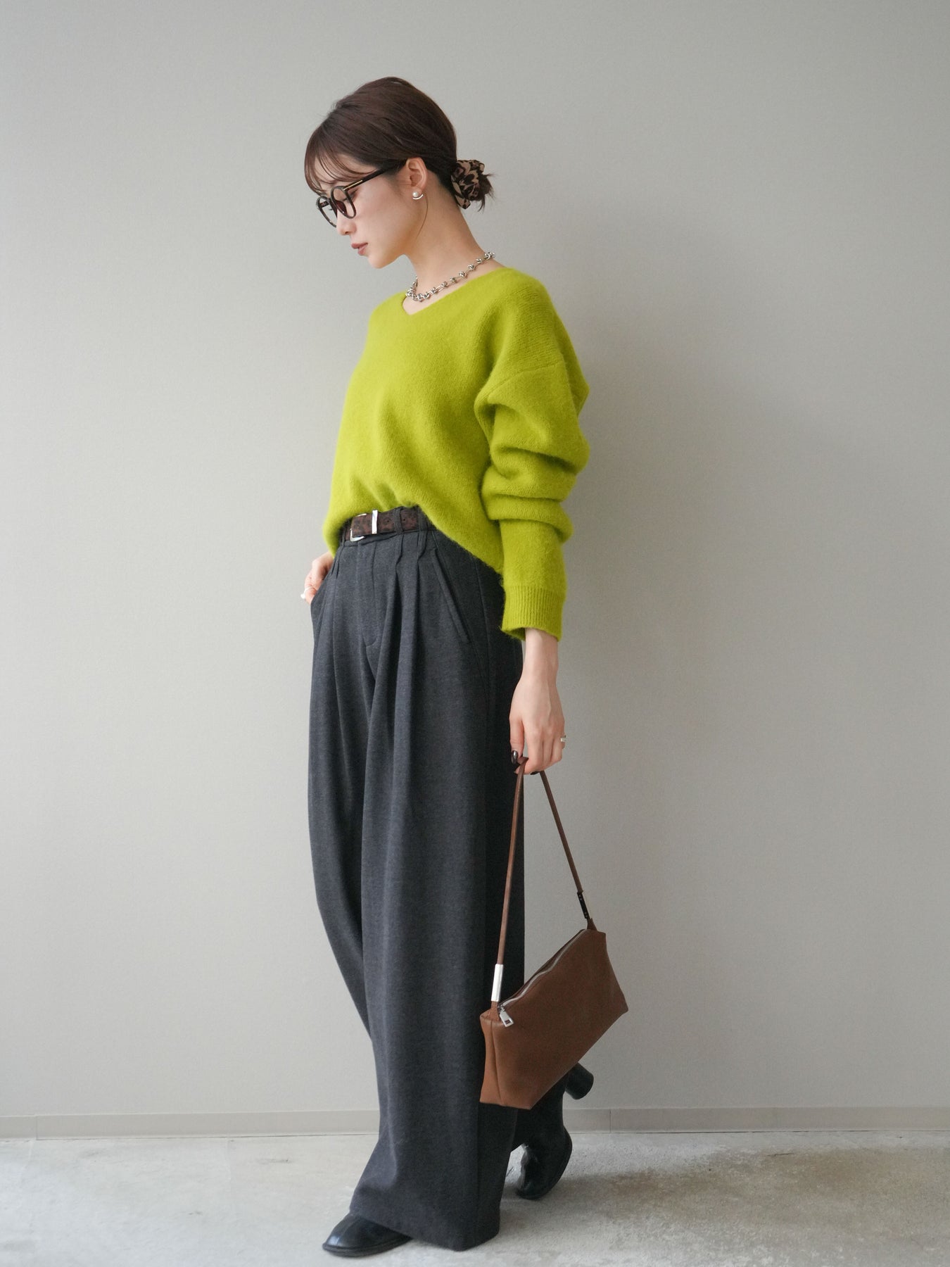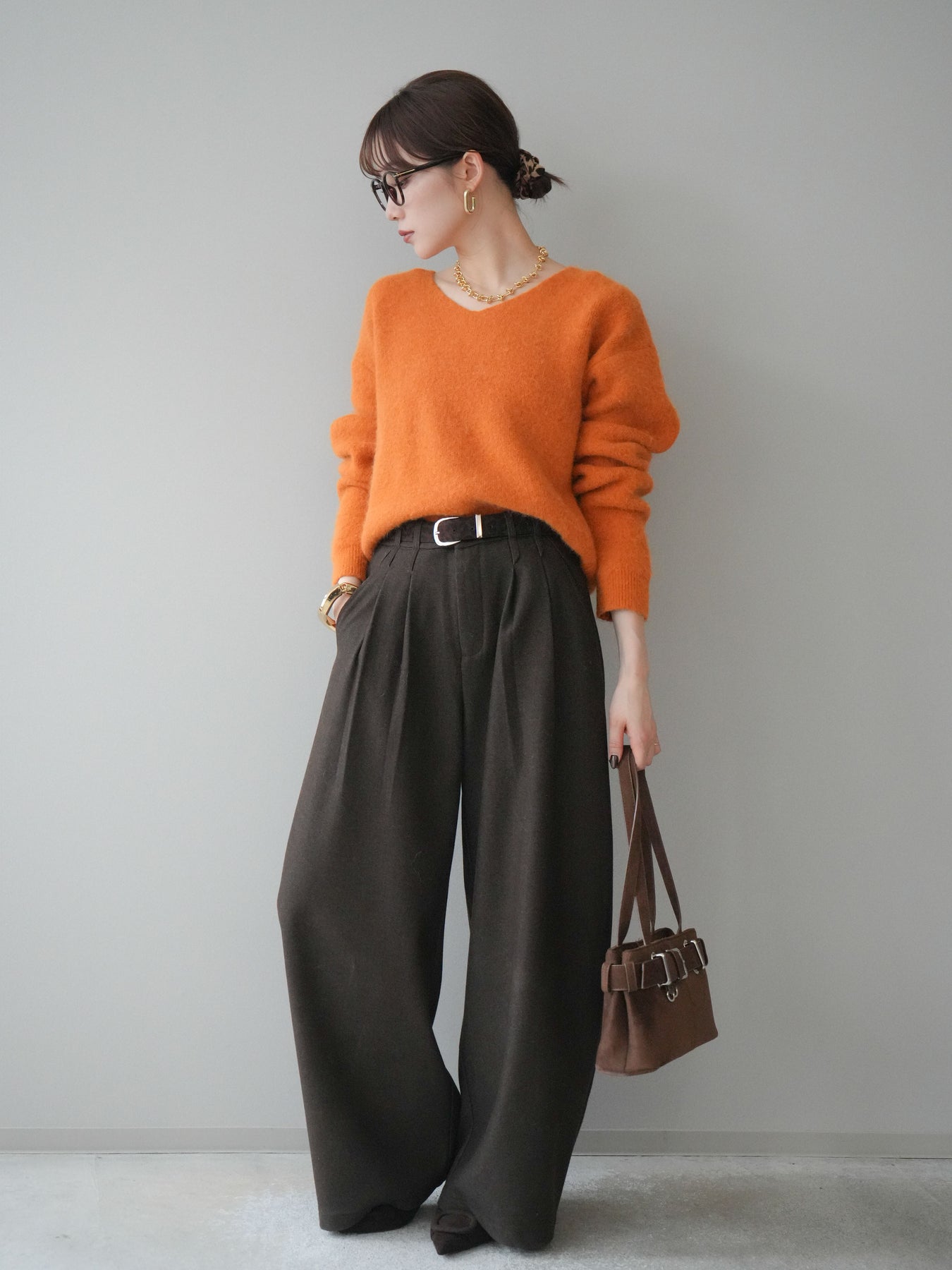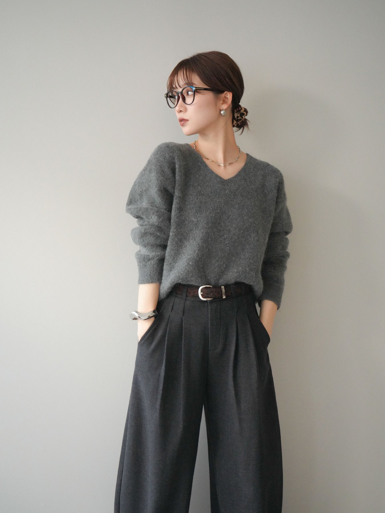 ふんわりとしたアンゴラタッチの素材で仕立てた、やわらかな雰囲気が魅力のVネックニットプルオーバー。毛足のある風合いが季節感を引き立てつつ、Vネックの開きがデコルテをきれいに見せ、女性らしい抜け感を演出します。手元のアクセントとして使えるシュシュがセットになっており、その日のスタイリングに合わせてアレンジできるのも嬉しいポイント。シンプルながら存在感のある一枚で、デイリーコーデを上品にまとめてくれます。 ※ボトムス、キャミソール(インナー)以外の商品は一律でインナーは付属していません。