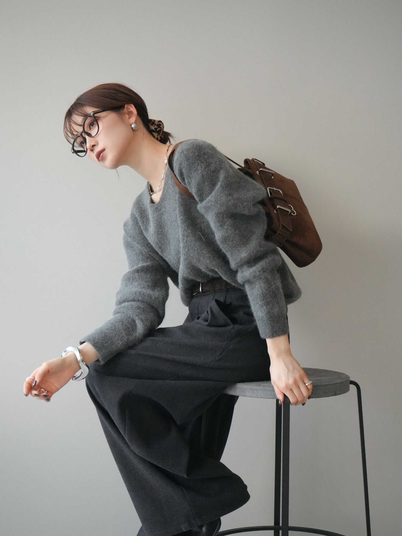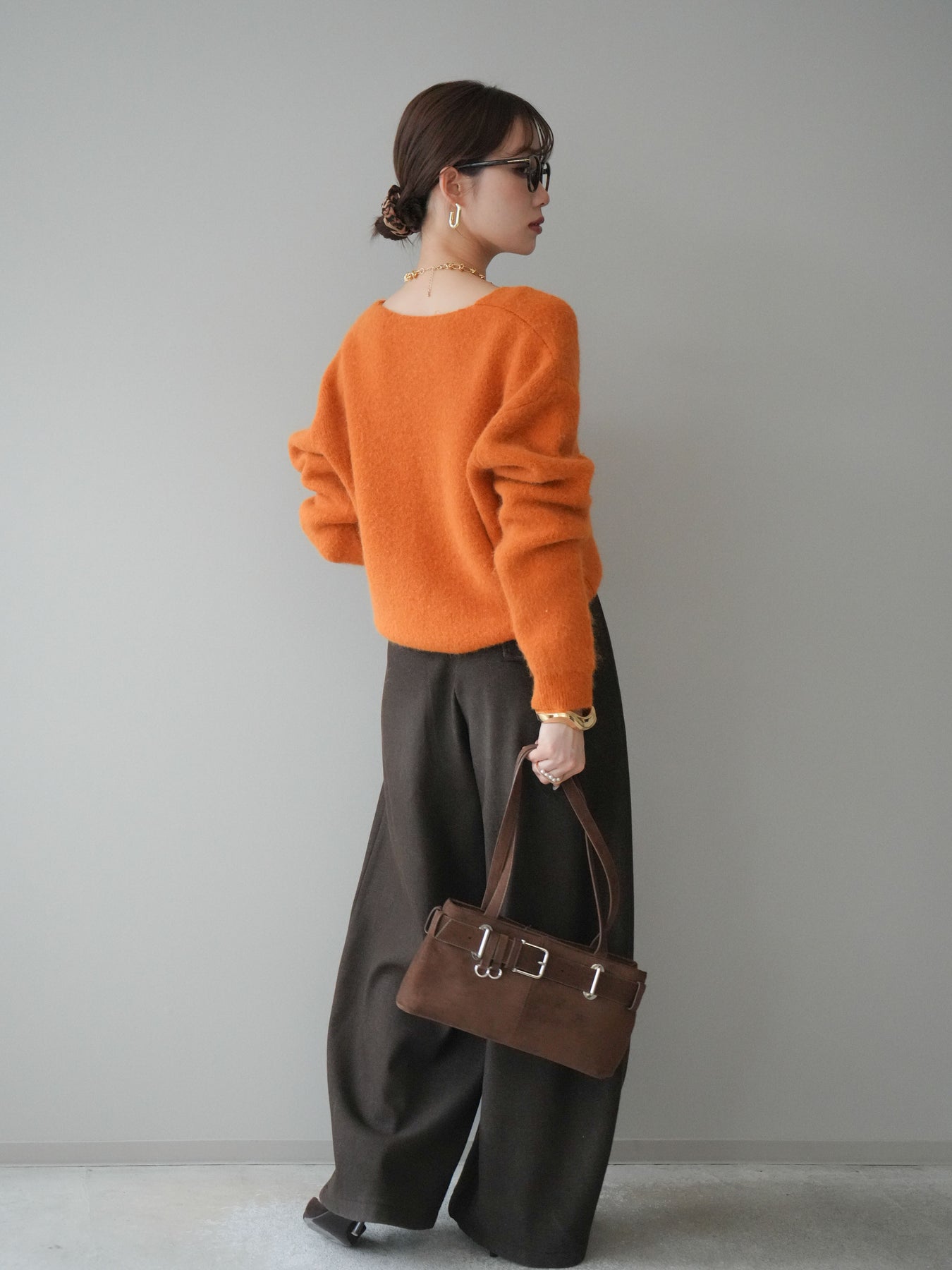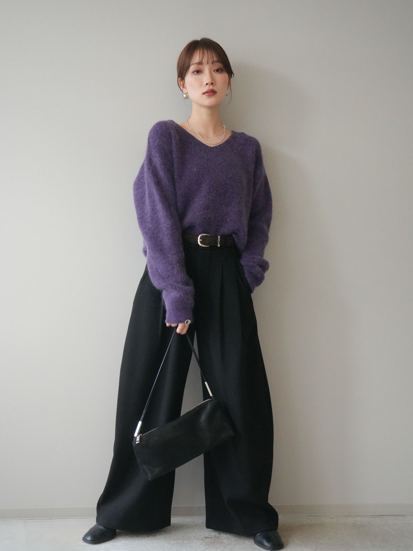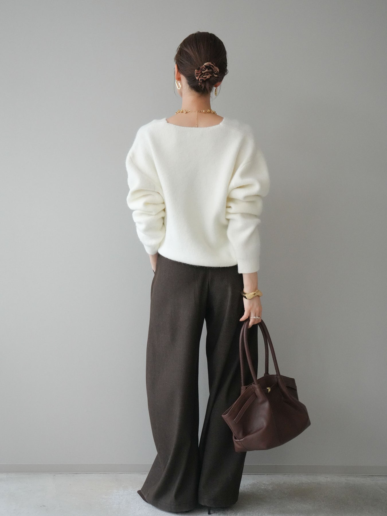 ふんわりとしたアンゴラタッチの素材で仕立てた、やわらかな雰囲気が魅力のVネックニットプルオーバー。毛足のある風合いが季節感を引き立てつつ、Vネックの開きがデコルテをきれいに見せ、女性らしい抜け感を演出します。手元のアクセントとして使えるシュシュがセットになっており、その日のスタイリングに合わせてアレンジできるのも嬉しいポイント。シンプルながら存在感のある一枚で、デイリーコーデを上品にまとめてくれます。 ※ボトムス、キャミソール(インナー)以外の商品は一律でインナーは付属していません。