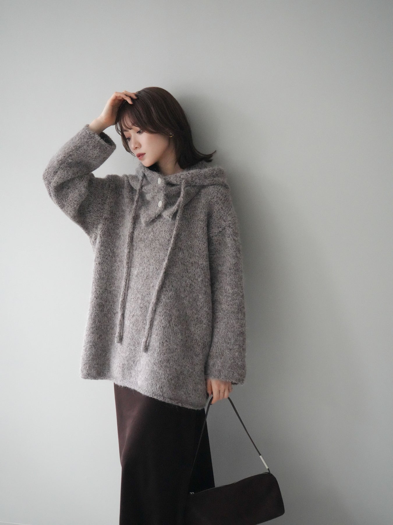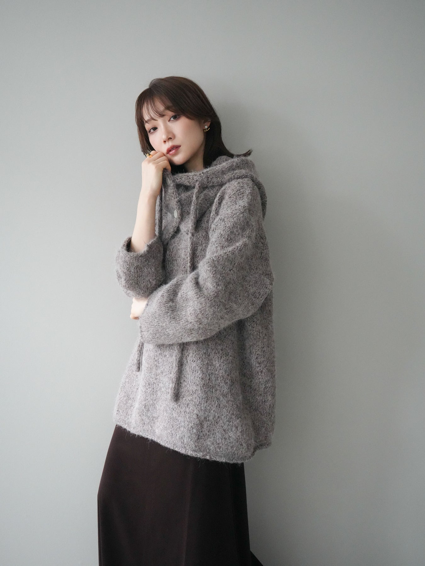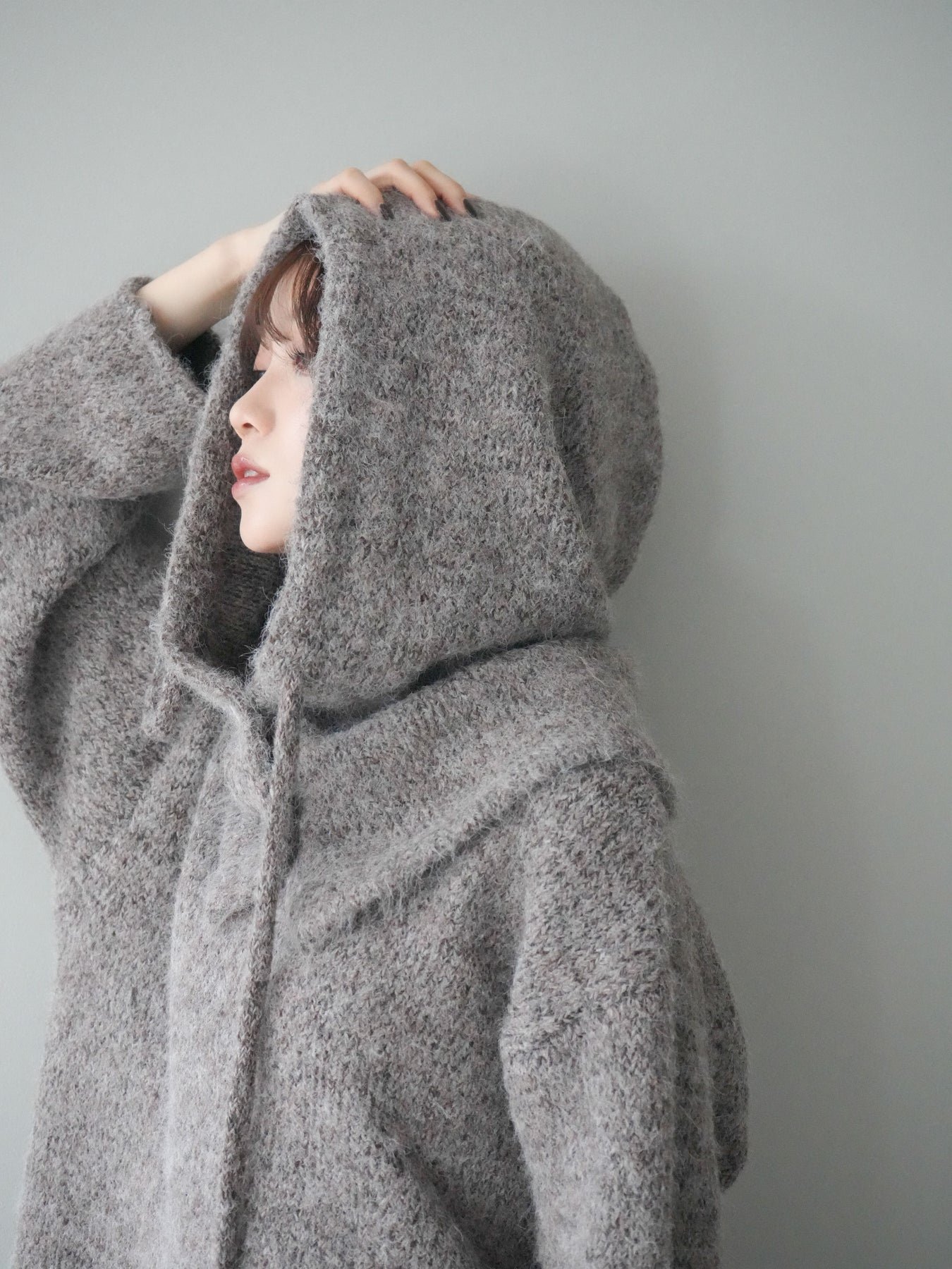 【ニット】肩幅55cm バスト120cm アームホール50cm 袖丈50cm 袖口32cm 着丈70cm 【フード部分】幅42cm フード高さ55cm 紐長さ54cm 透け感なし 伸縮性あり