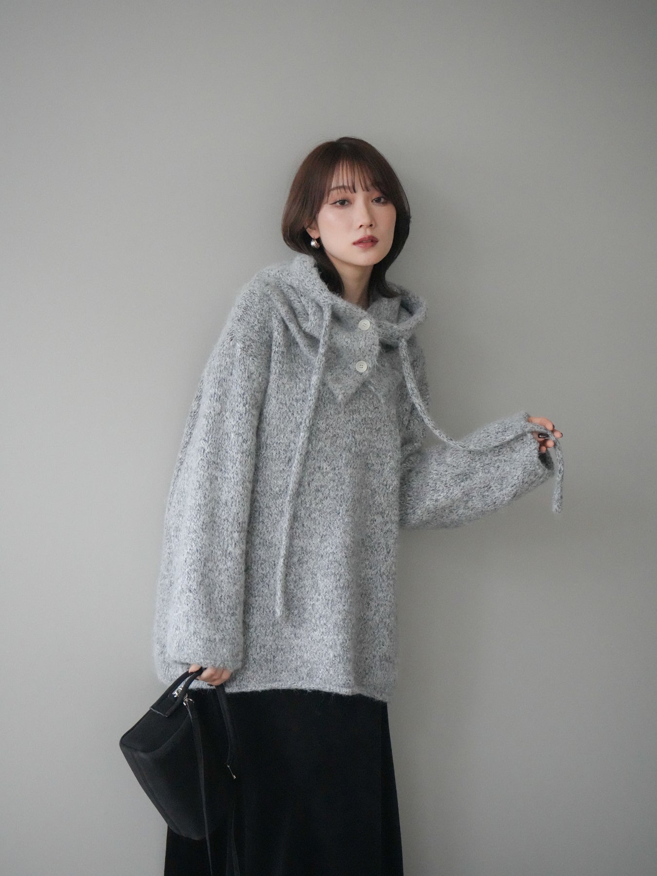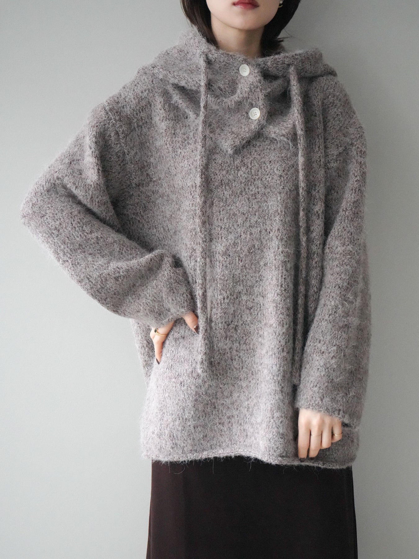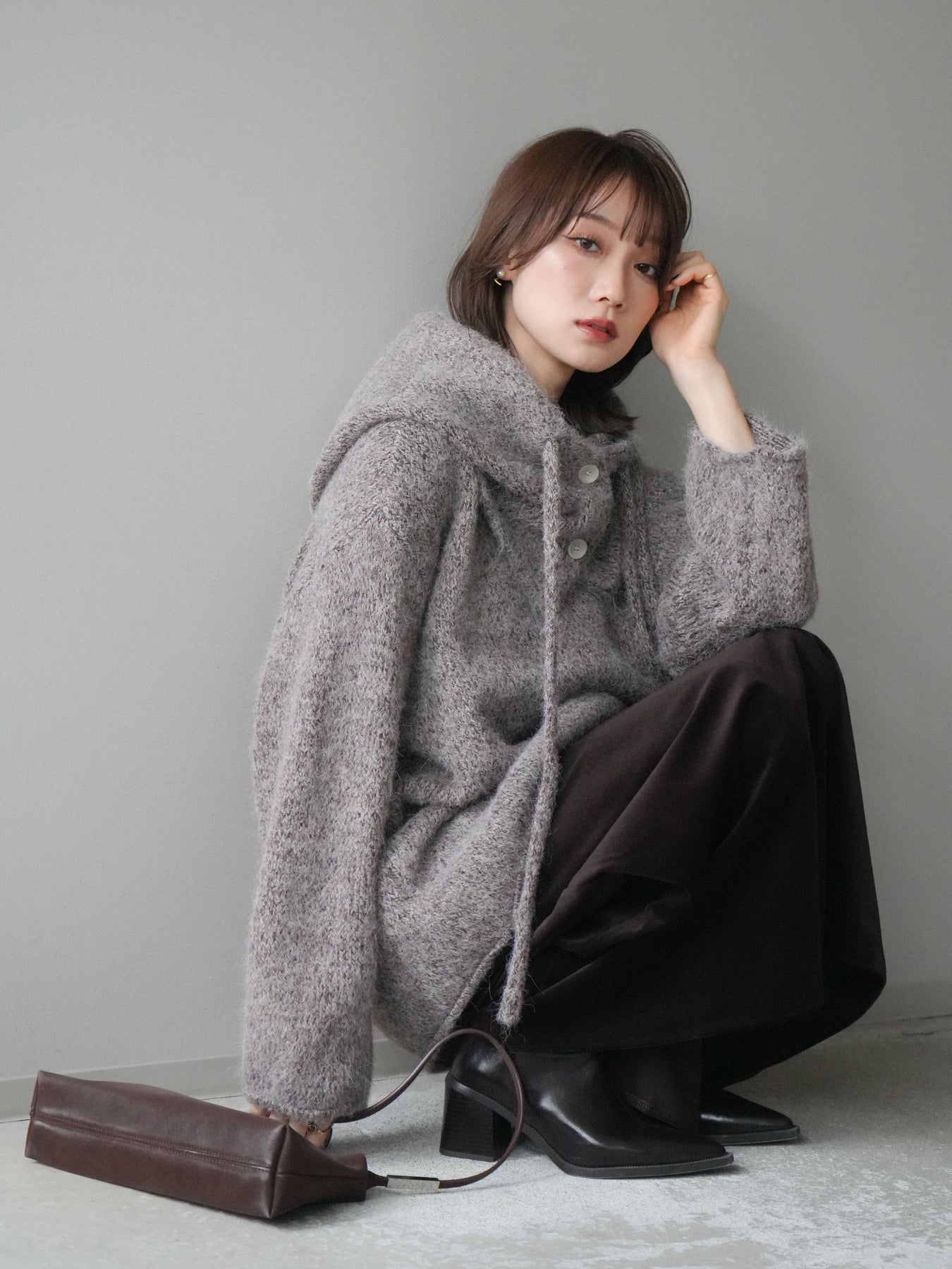 【ニット】肩幅55cm バスト120cm アームホール50cm 袖丈50cm 袖口32cm 着丈70cm 【フード部分】幅42cm フード高さ55cm 紐長さ54cm 透け感なし 伸縮性あり