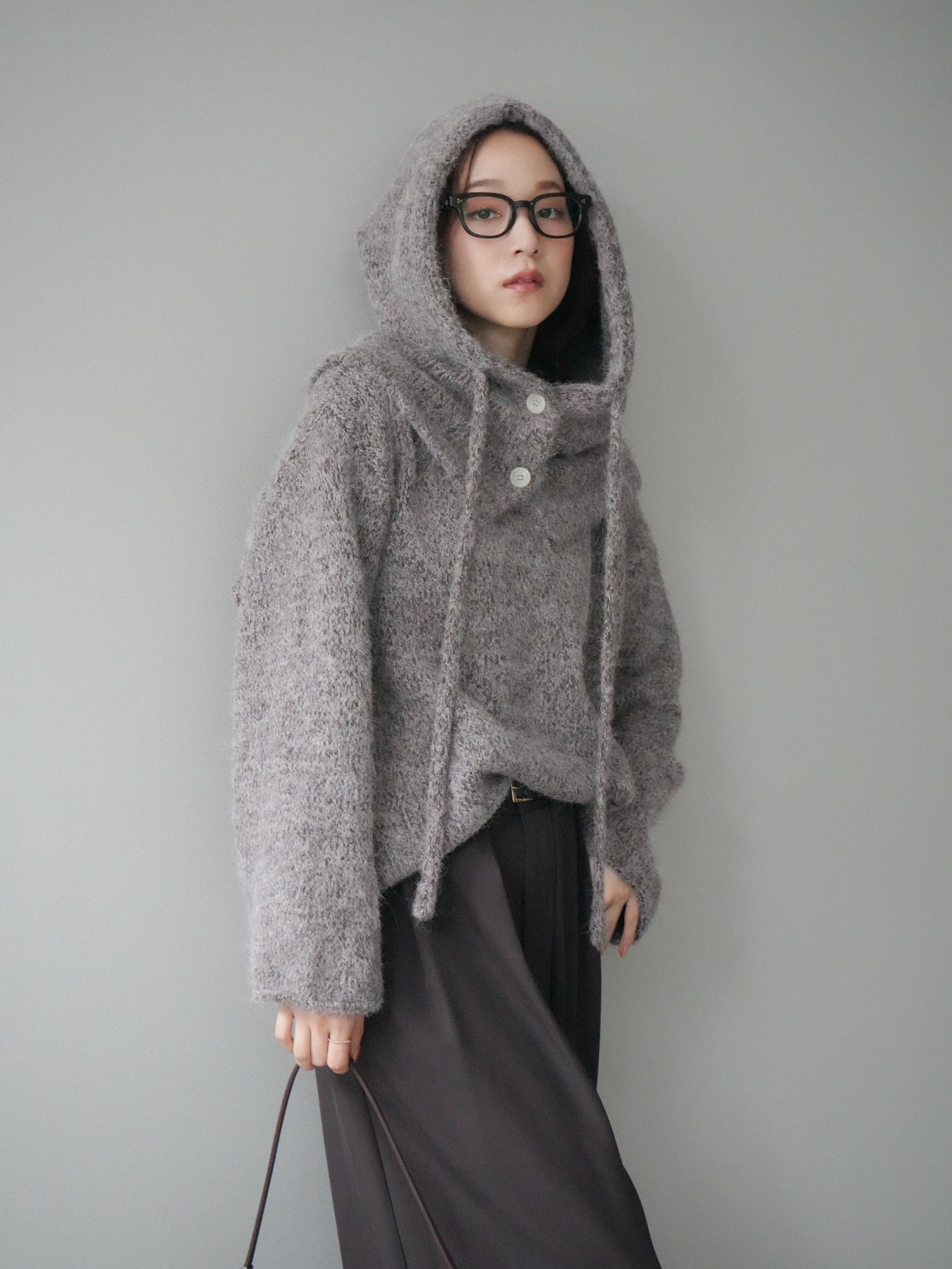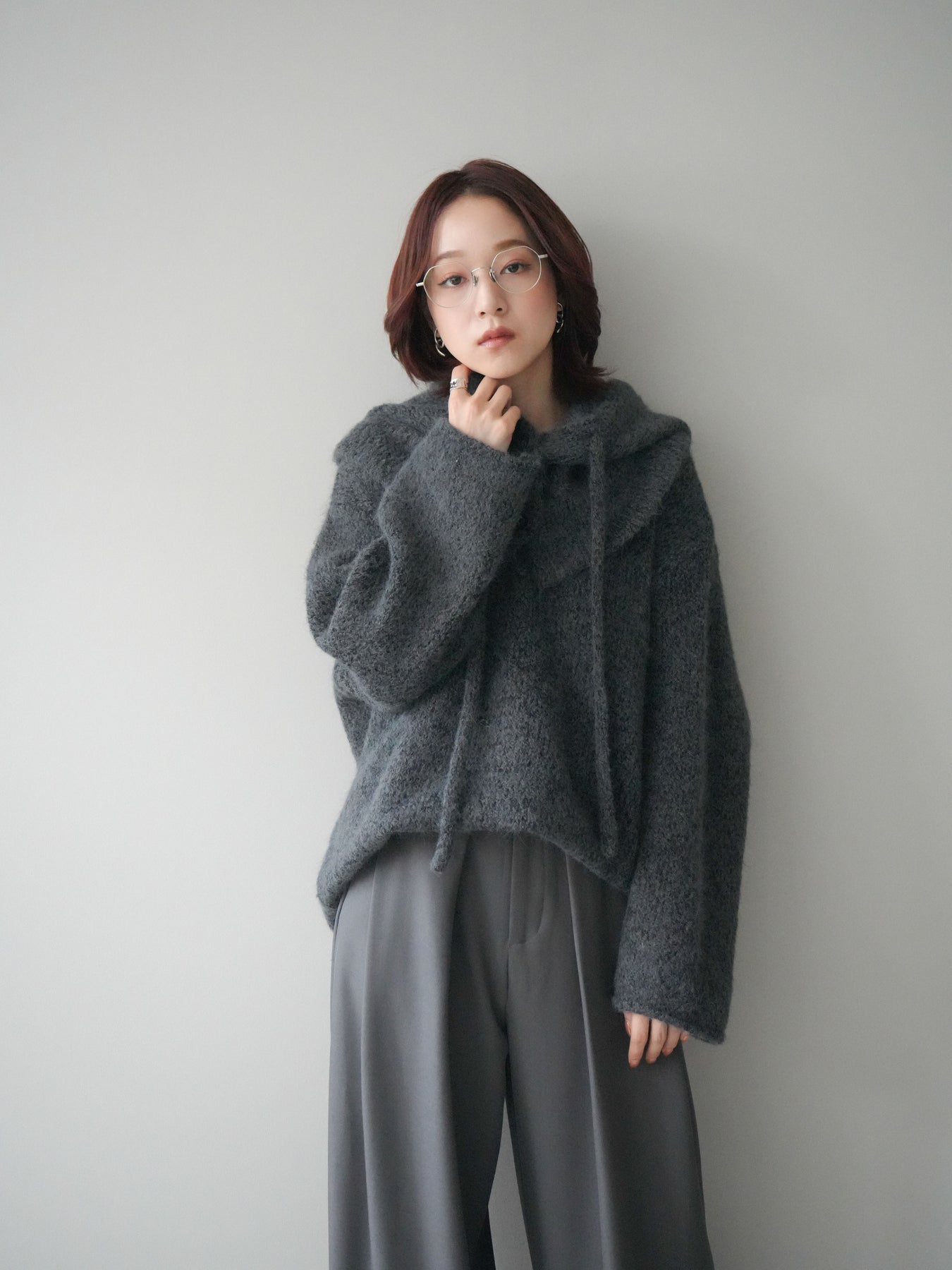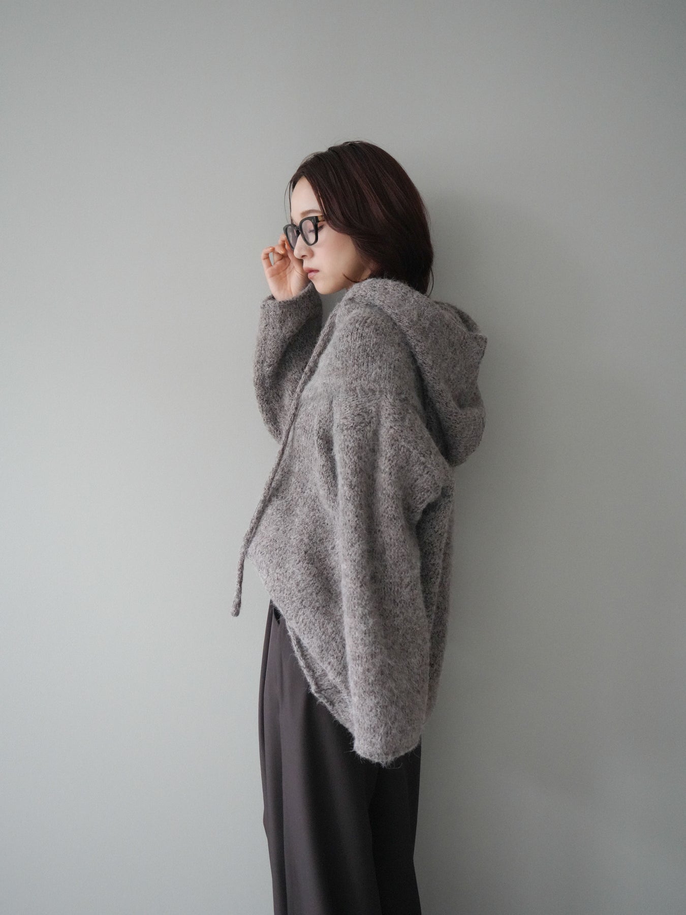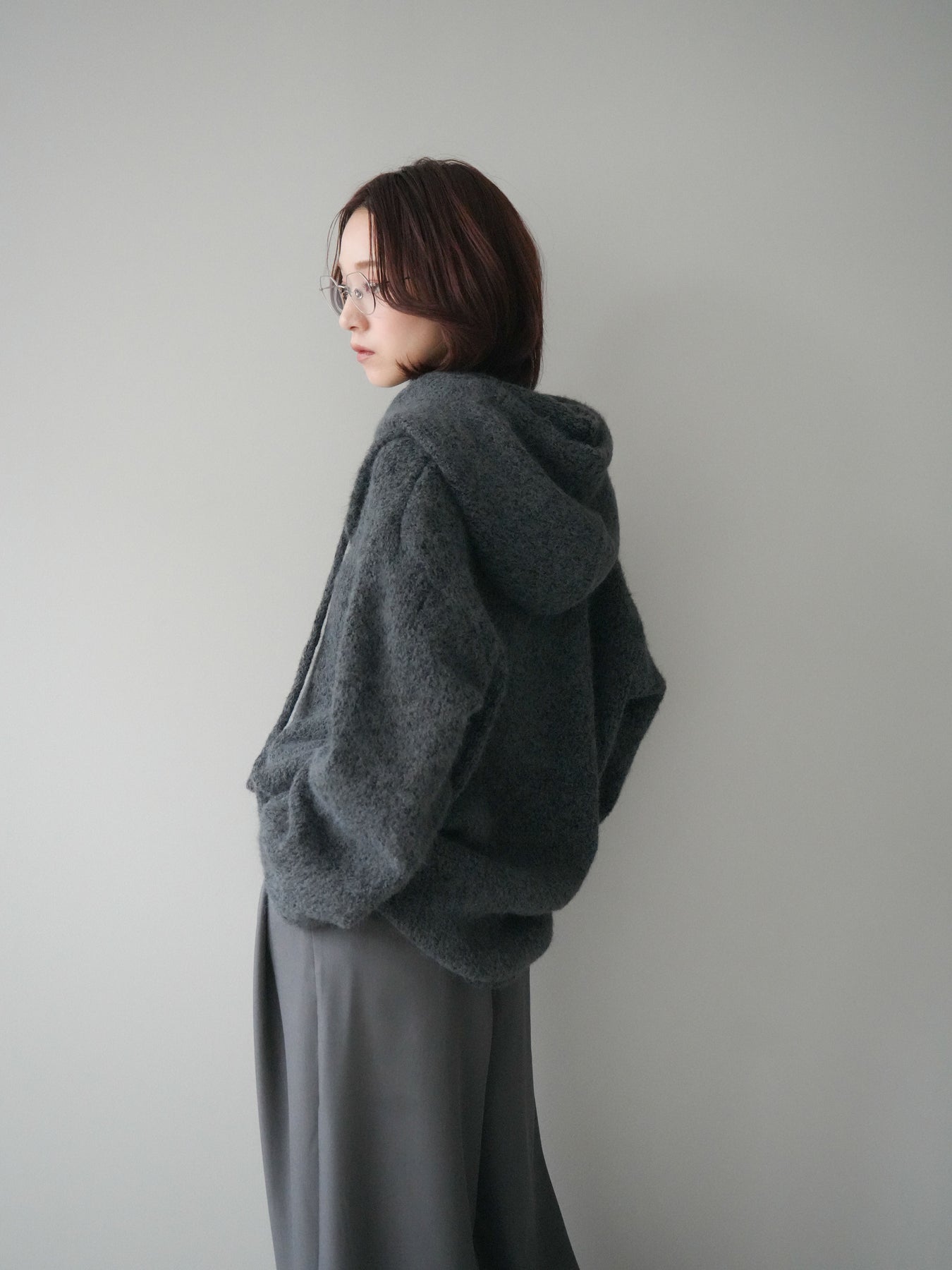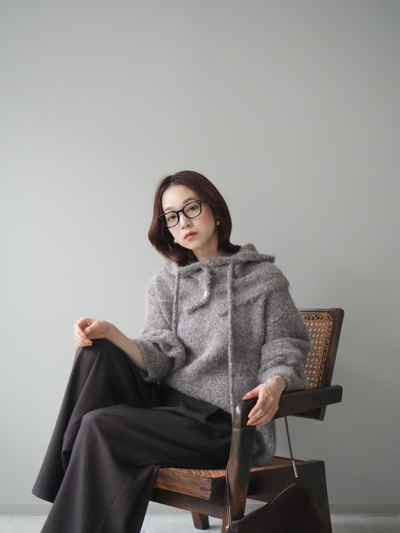 【ニット】肩幅55cm バスト120cm アームホール50cm 袖丈50cm 袖口32cm 着丈70cm 【フード部分】幅42cm フード高さ55cm 紐長さ54cm 透け感なし 伸縮性あり