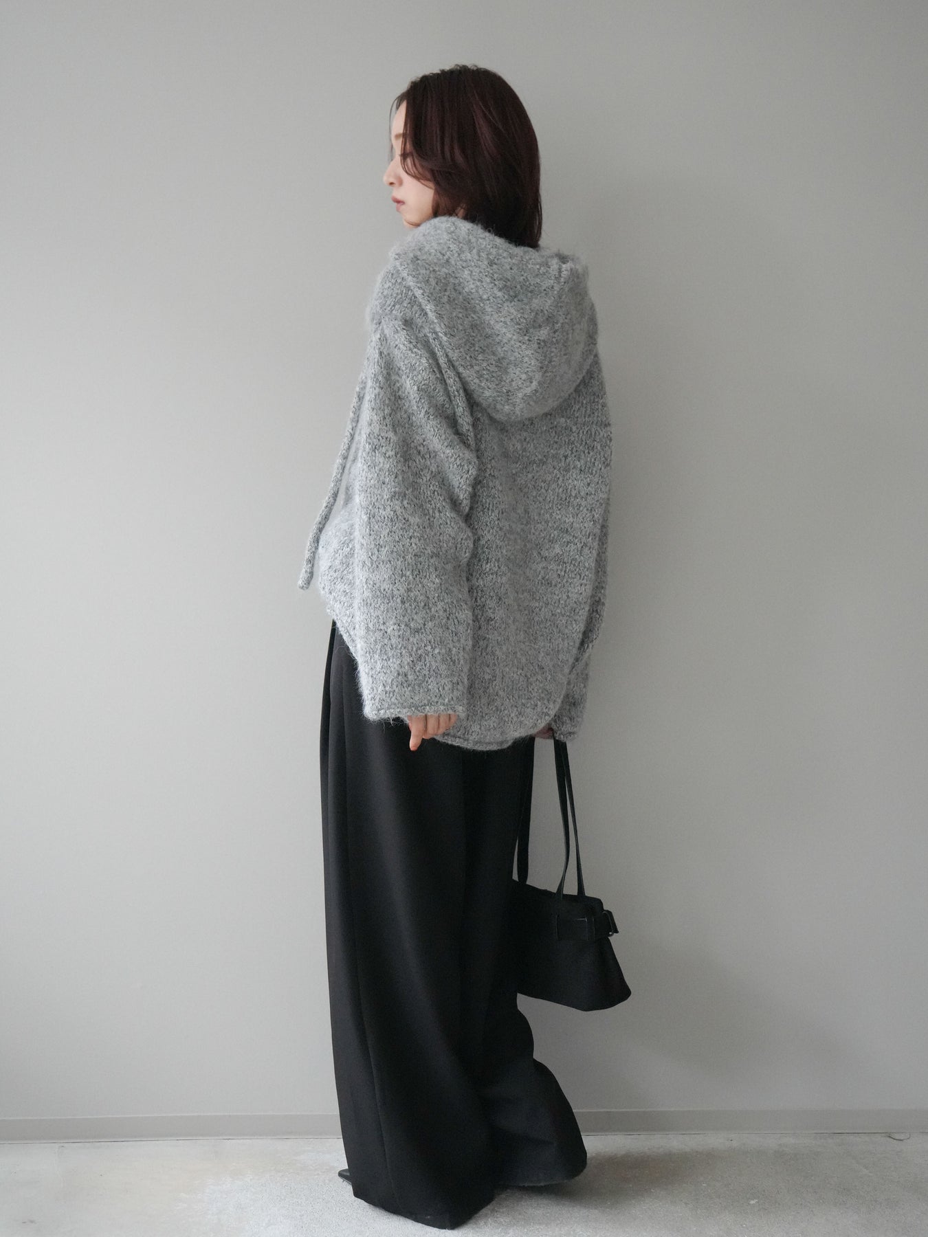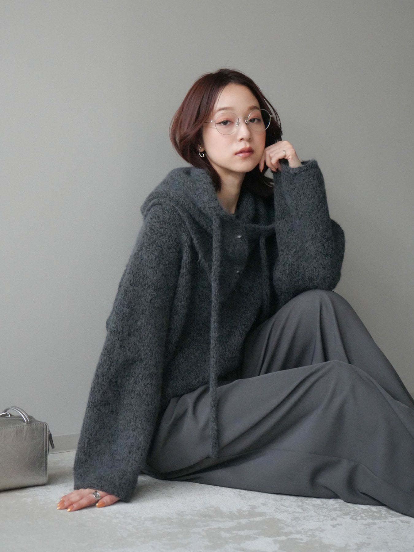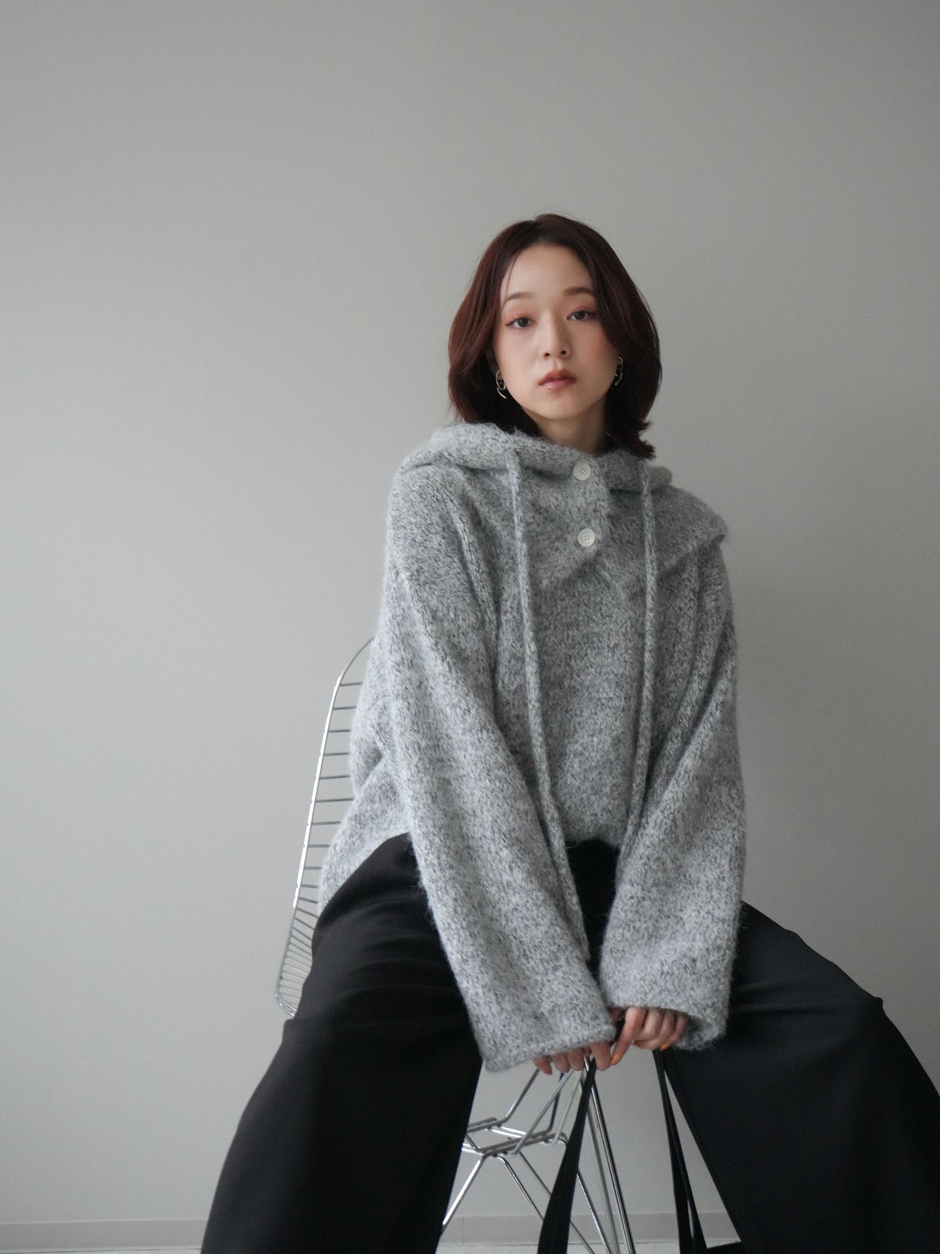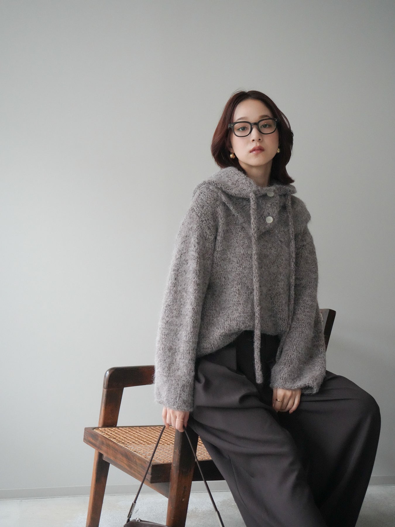 【ニット】肩幅55cm バスト120cm アームホール50cm 袖丈50cm 袖口32cm 着丈70cm 【フード部分】幅42cm フード高さ55cm 紐長さ54cm 透け感なし 伸縮性あり