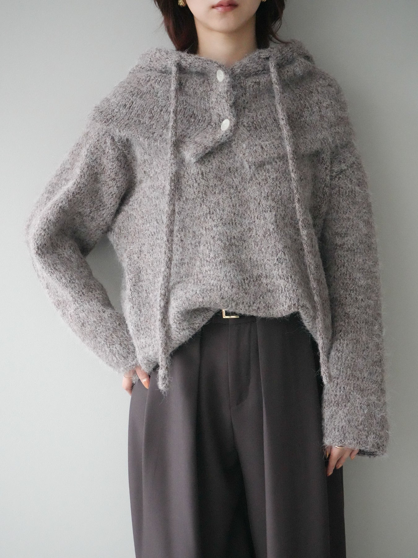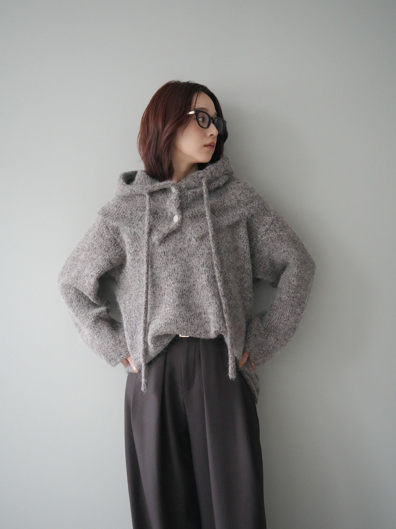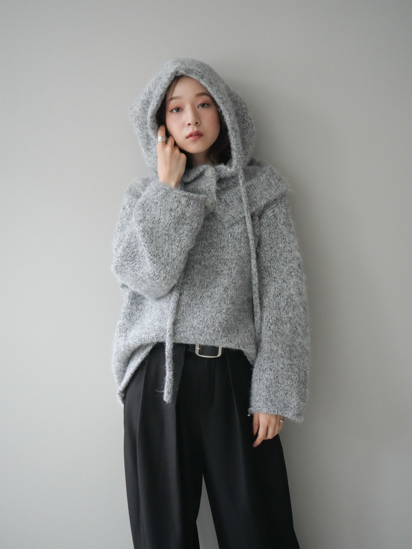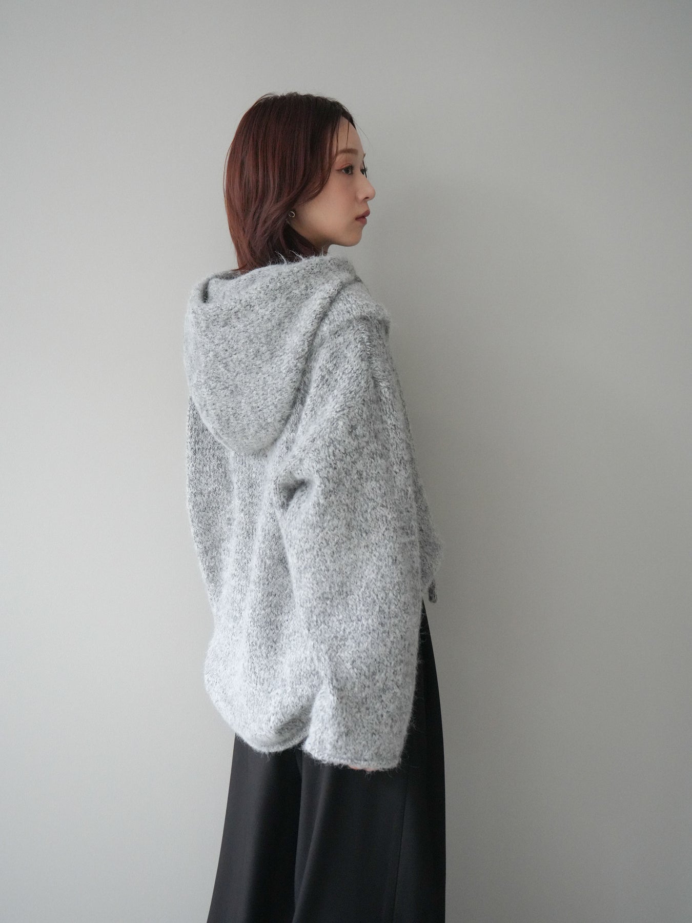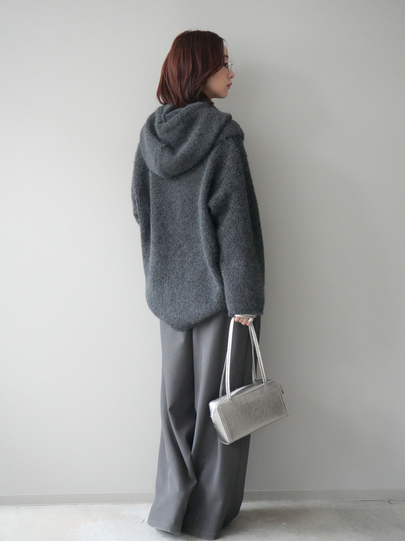 【ニット】肩幅55cm バスト120cm アームホール50cm 袖丈50cm 袖口32cm 着丈70cm 【フード部分】幅42cm フード高さ55cm 紐長さ54cm 透け感なし 伸縮性あり