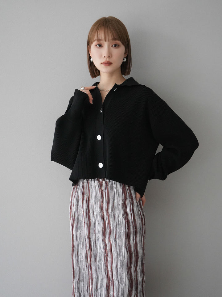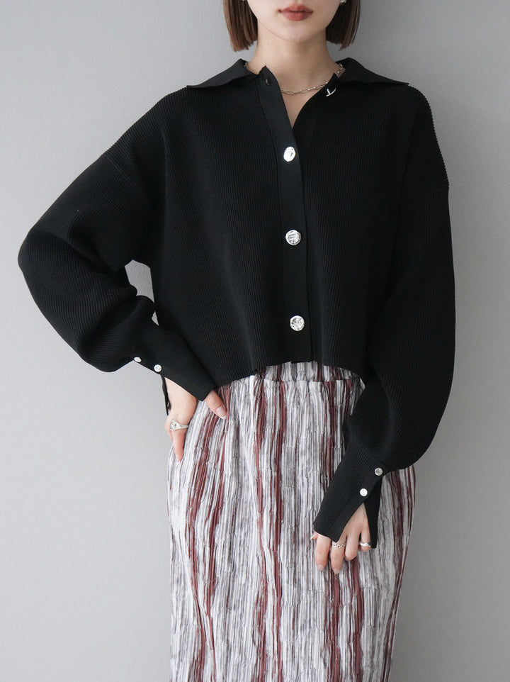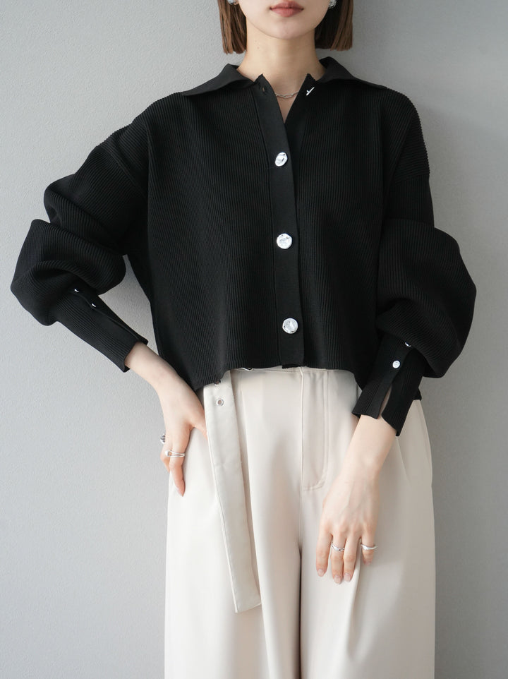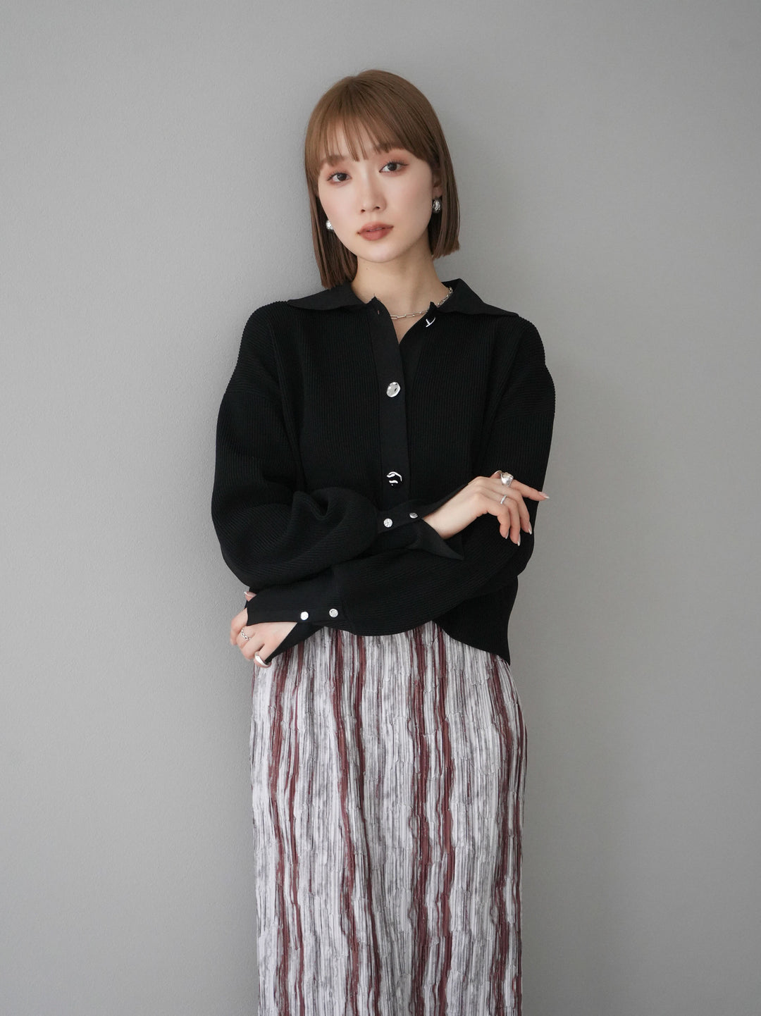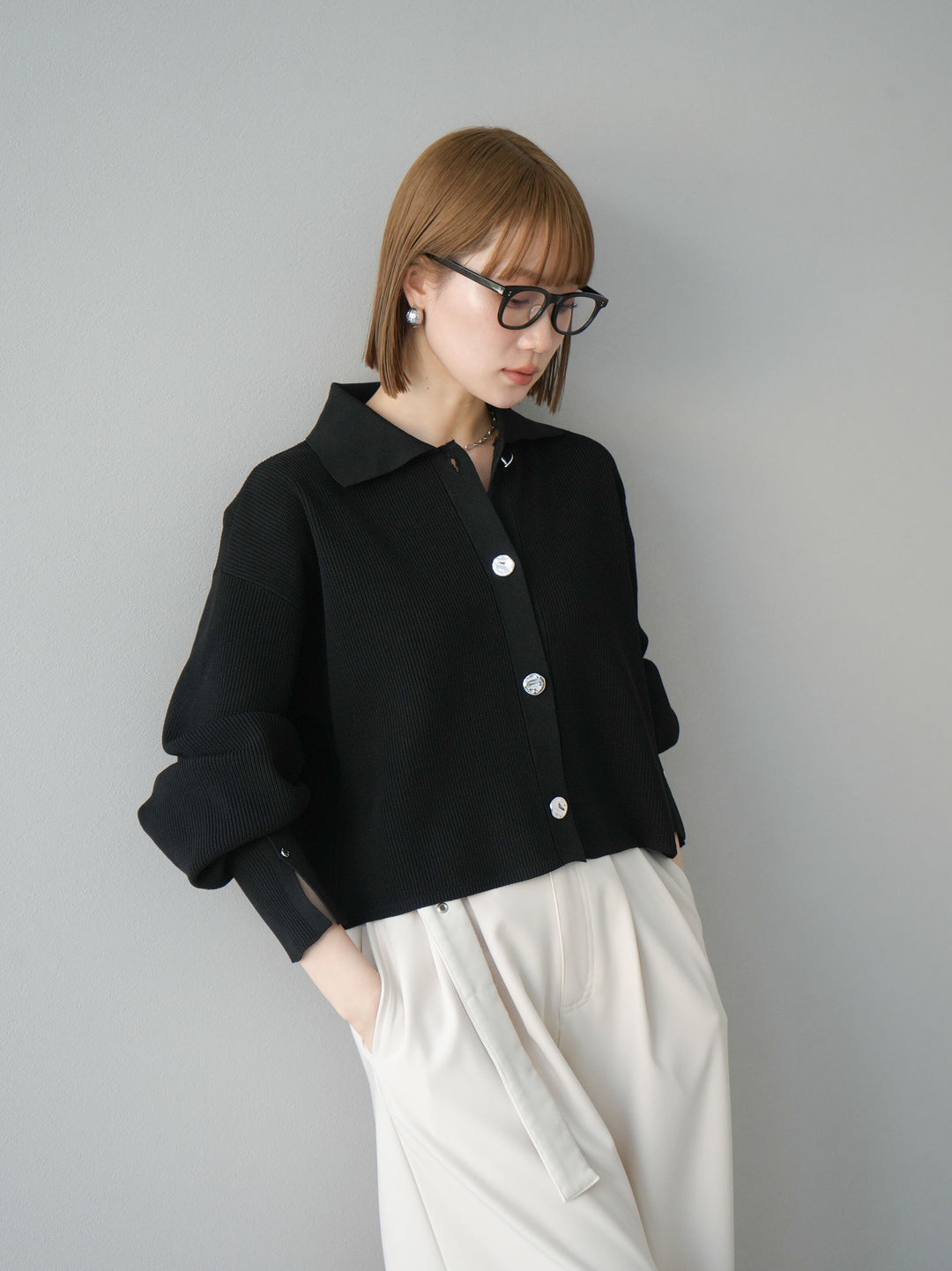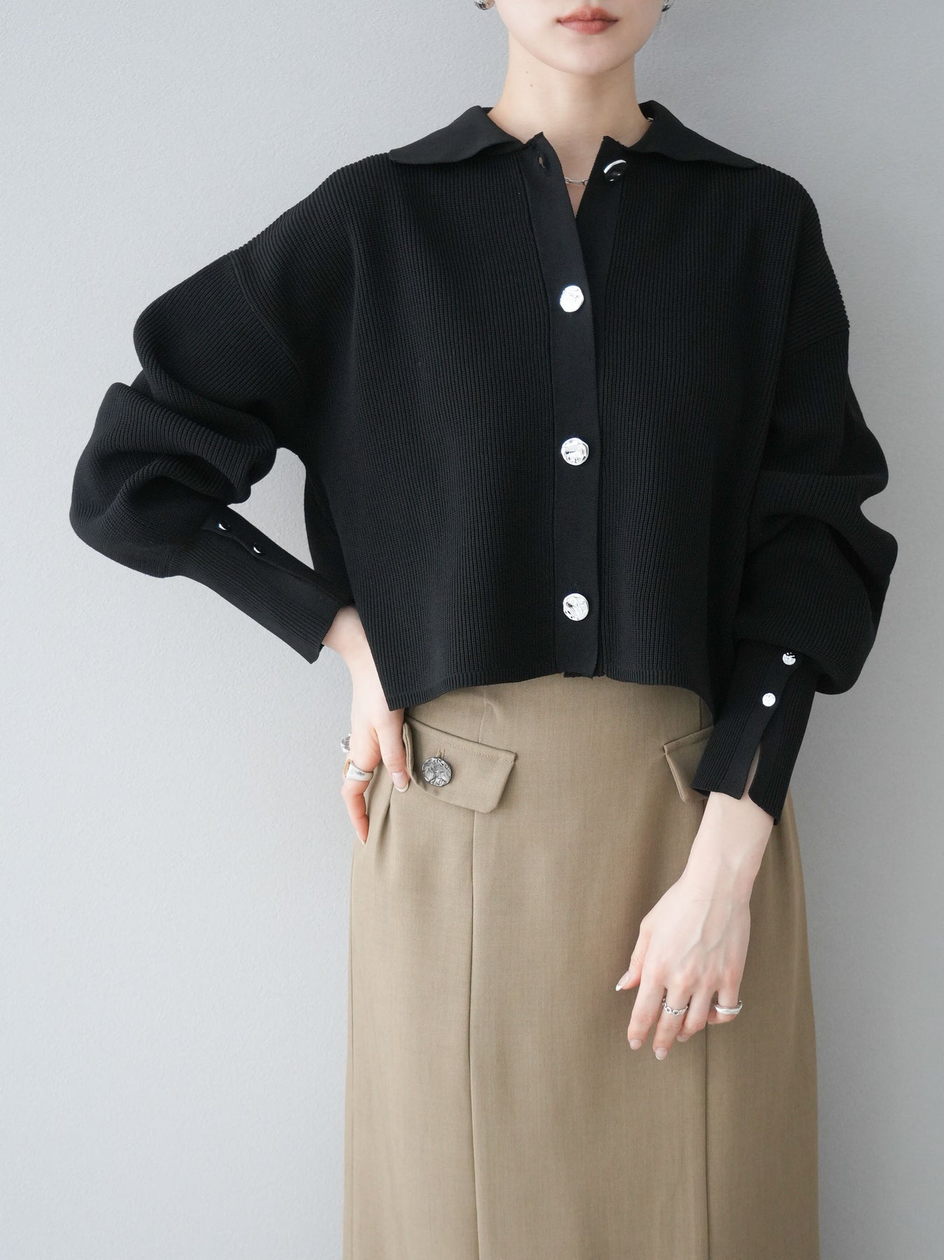 [預訂] 寬袖 Polo 針織開襟衫/黑色