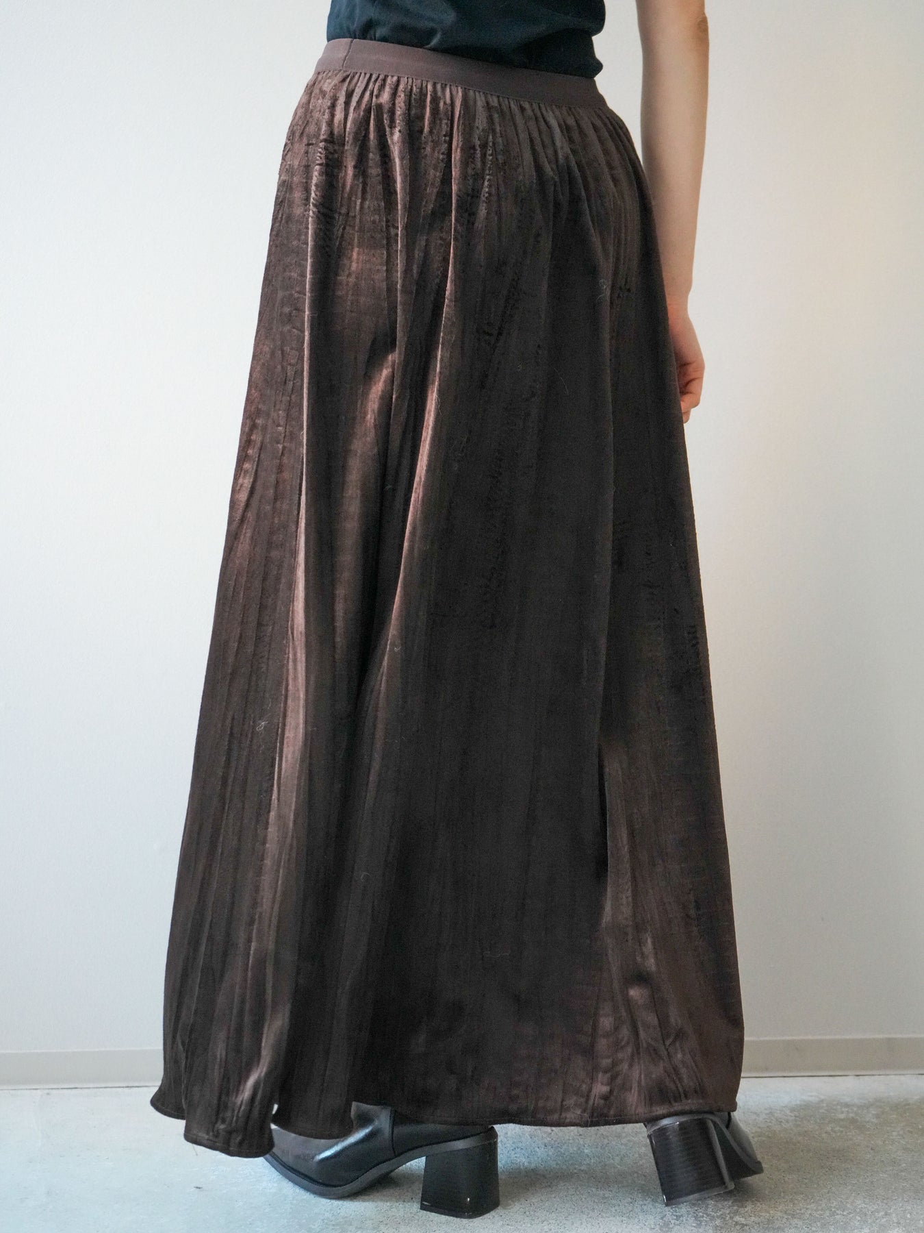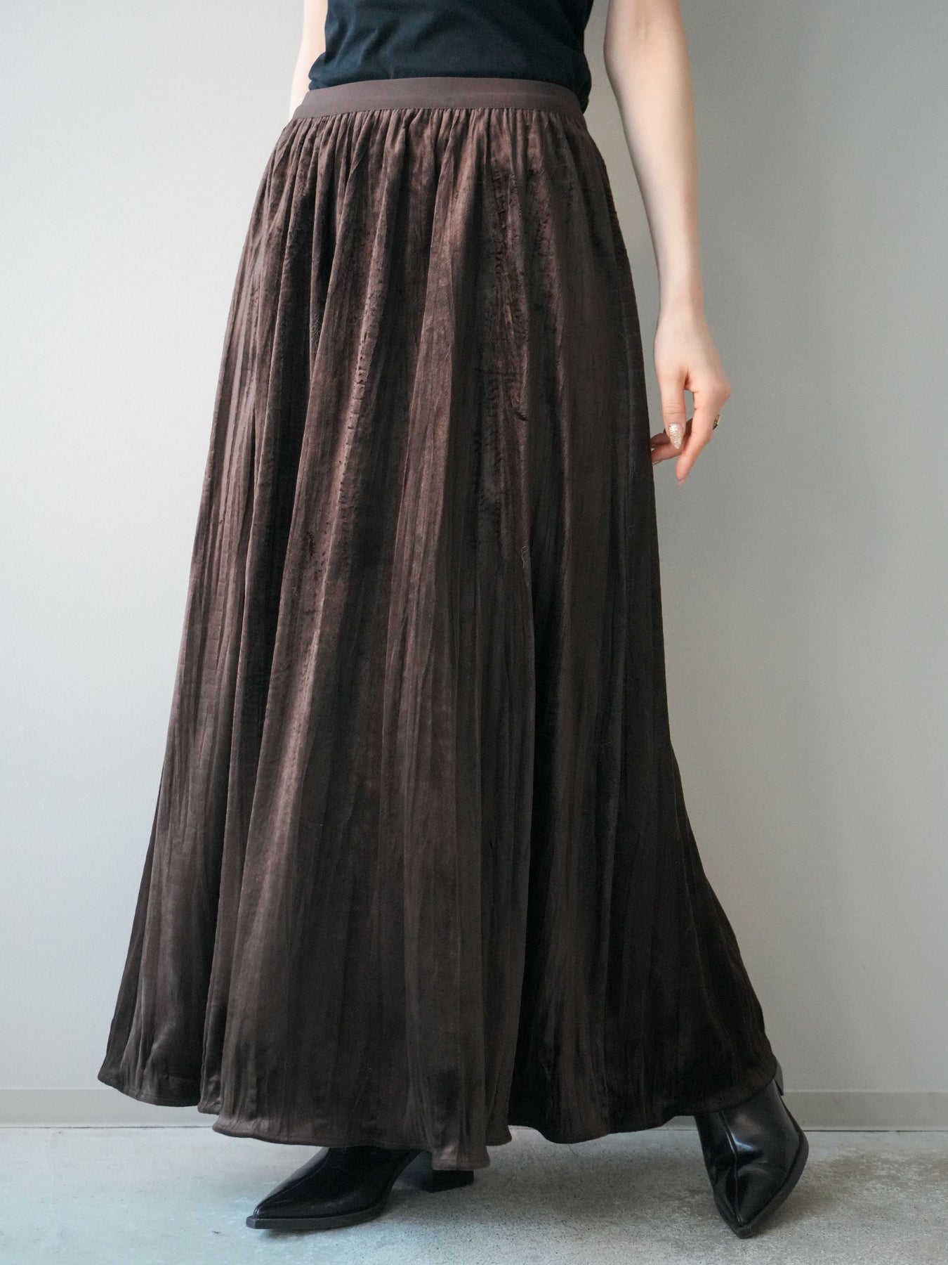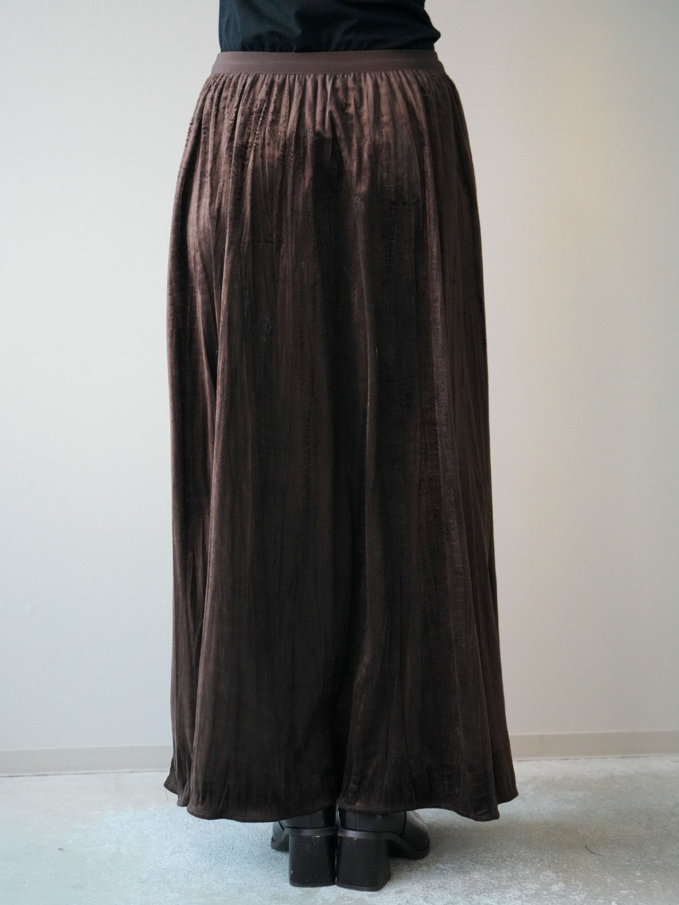表情豊かなワッシャー加工を施したベロア素材が、上品な光沢とニュアンスのある揺れを生み出すプリーツスカート。歩くたびに柔らかく揺れ動くシルエットが女性らしさを引き立て、コーディネートに華やぎを添えます。ウエストはゴム仕様で快適な穿き心地ながら、すっきり見えるバランスに仕上げており、デイリーにも特別なシーンにも対応できる万能アイテム。シンプルなトップスを合わせるだけで存在感のあるスタイルが完成する一枚です。
