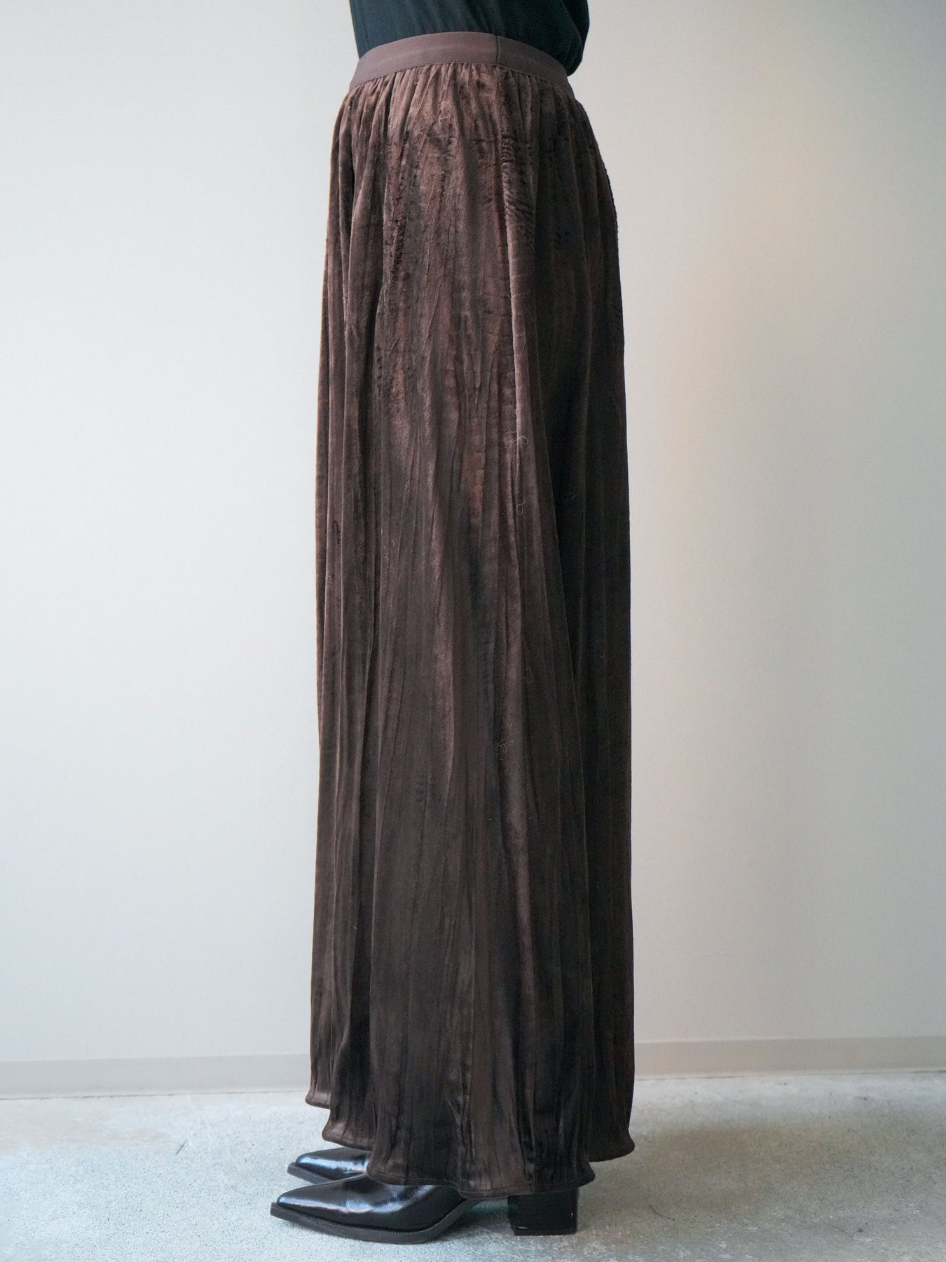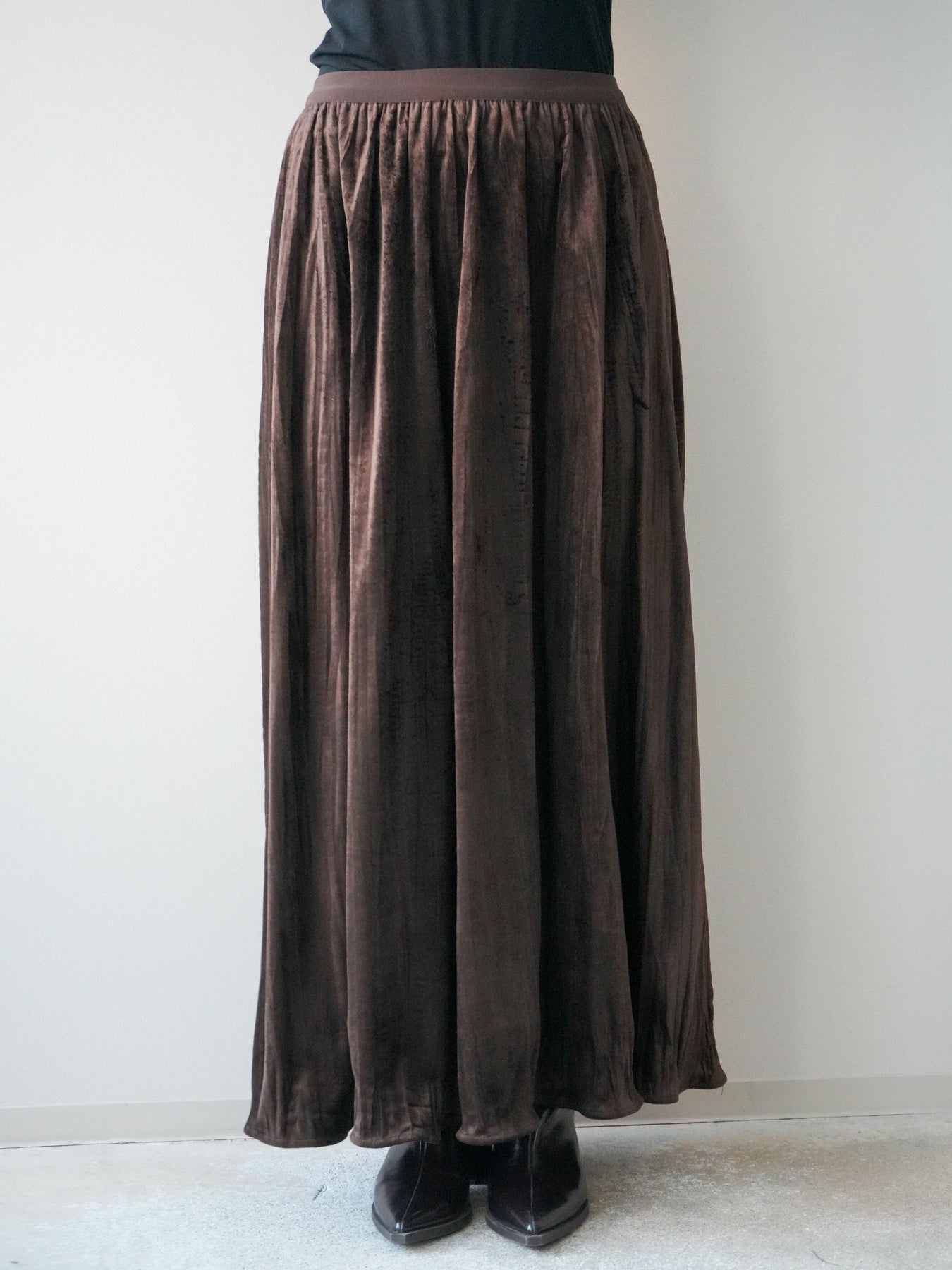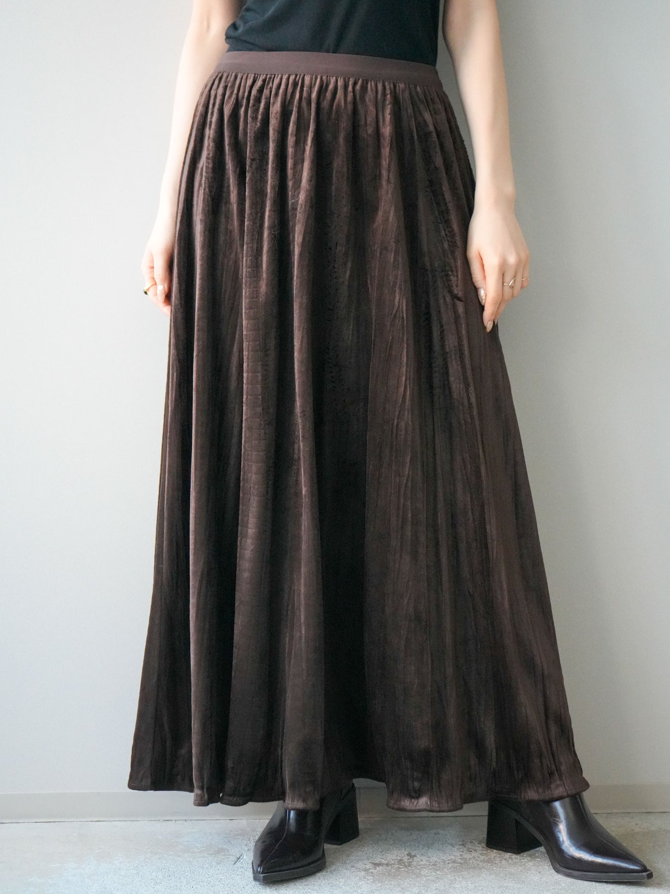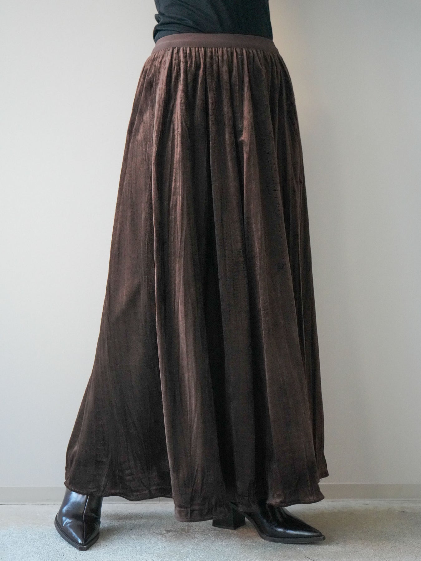 表情豊かなワッシャー加工を施したベロア素材が、上品な光沢とニュアンスのある揺れを生み出すプリーツスカート。歩くたびに柔らかく揺れ動くシルエットが女性らしさを引き立て、コーディネートに華やぎを添えます。ウエストはゴム仕様で快適な穿き心地ながら、すっきり見えるバランスに仕上げており、デイリーにも特別なシーンにも対応できる万能アイテム。シンプルなトップスを合わせるだけで存在感のあるスタイルが完成する一枚です。