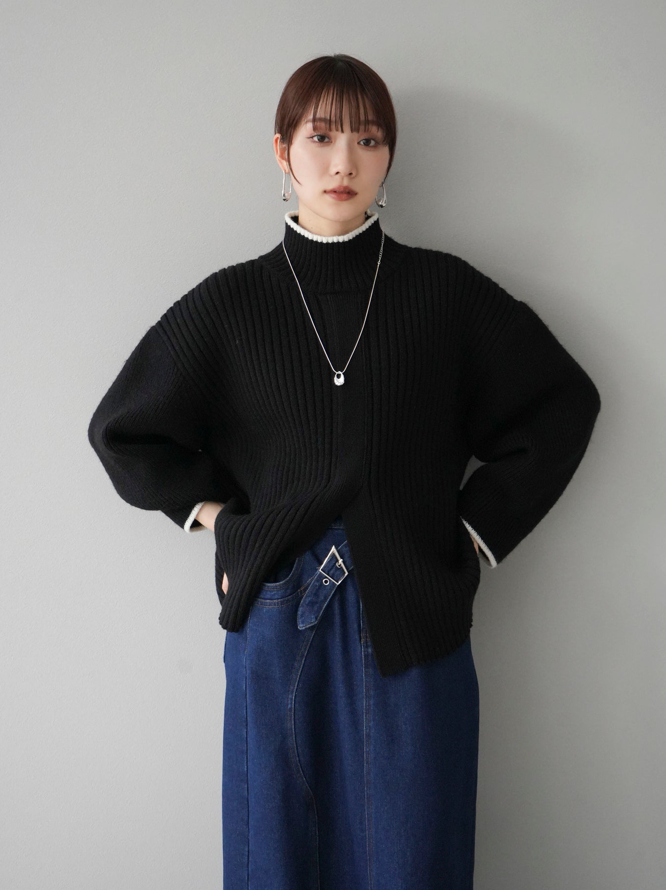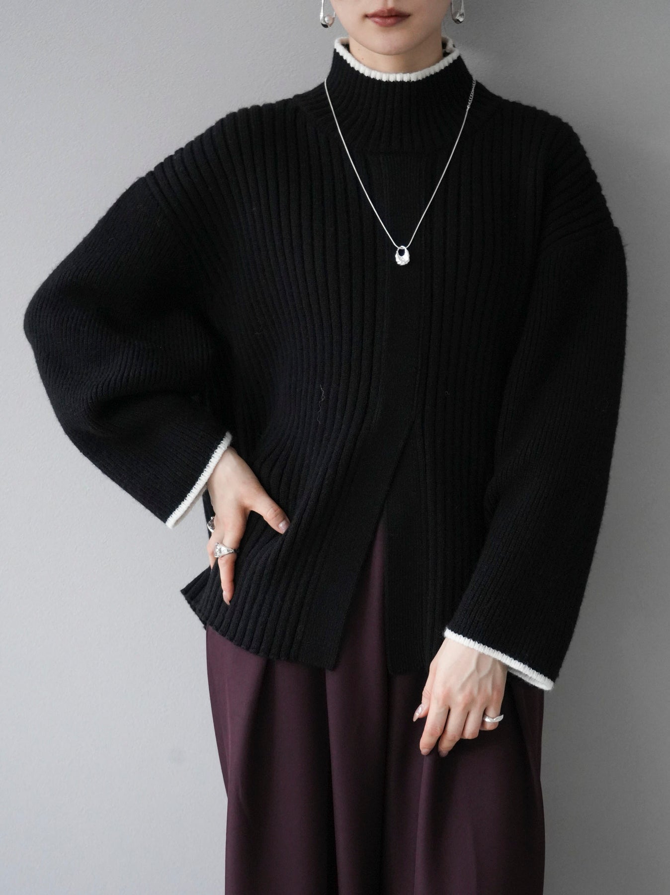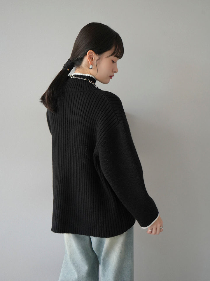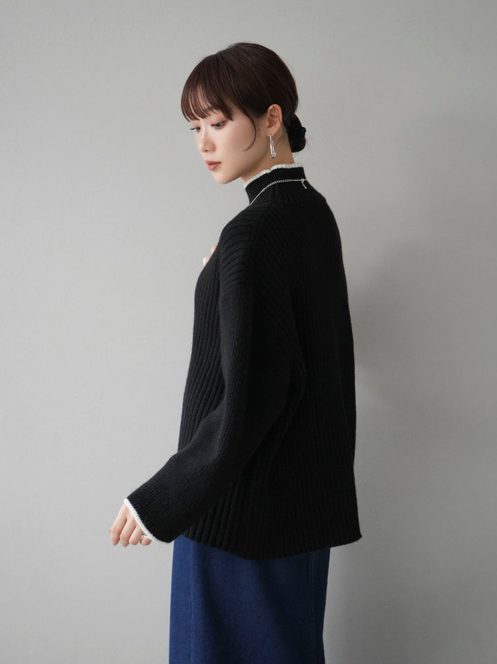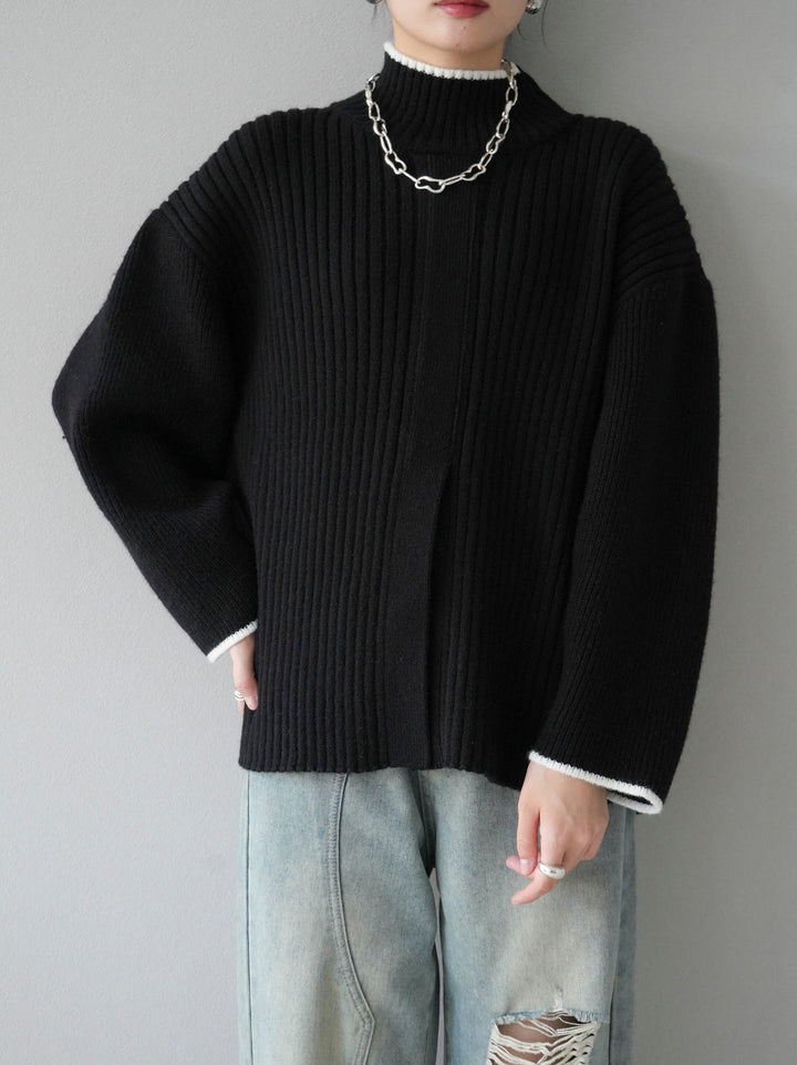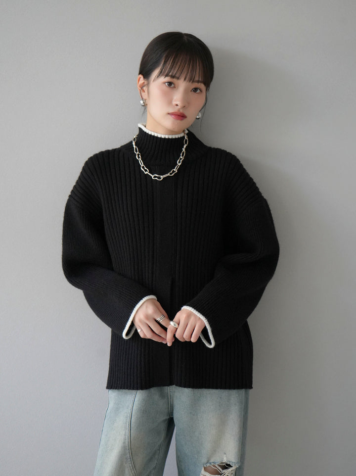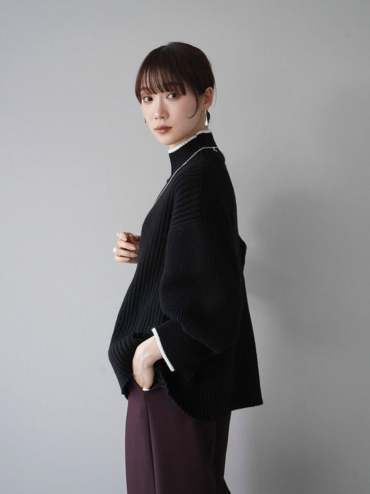 高領針織衫,前開衩,雙色配色引人注目。這件簡單但注重細節的服裝只要穿上它就會成為您服裝的焦點。寬鬆的廓形,前後長度不一,可享受輕鬆的風格。這是一個非常時尚的多功能物品。 ※除下裝、吊帶背心(內衣)以外的所有商品均不包含內衣。